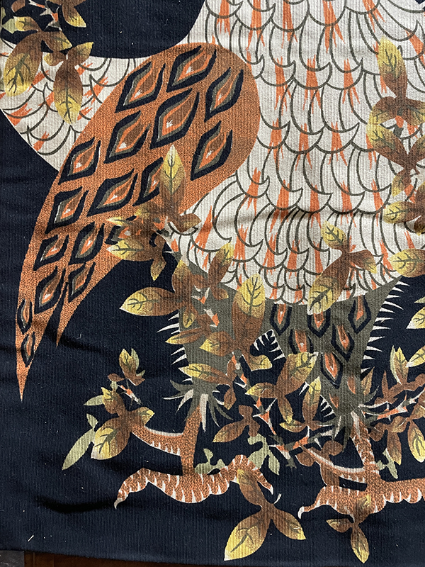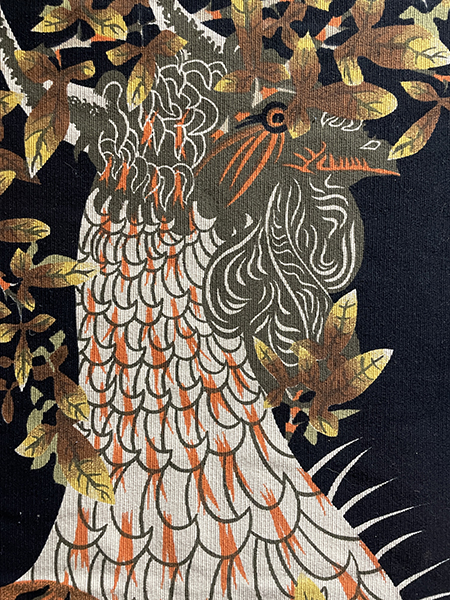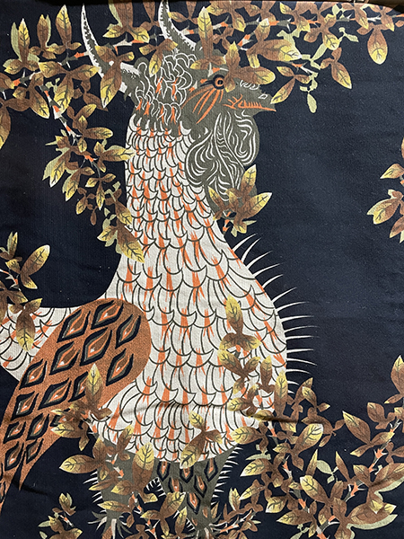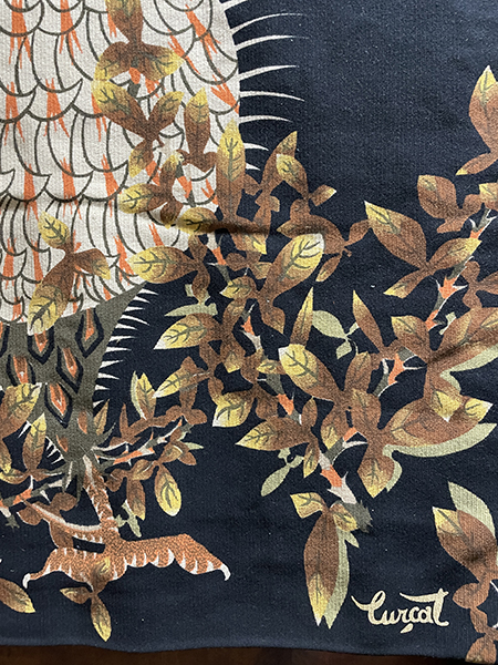 Mid-20th C Jean Lurcat (French 1892-1966) silkscreen tapestry of a rooster, predominately orange and olive green on black background surrounded by vegetation in gold and brown.