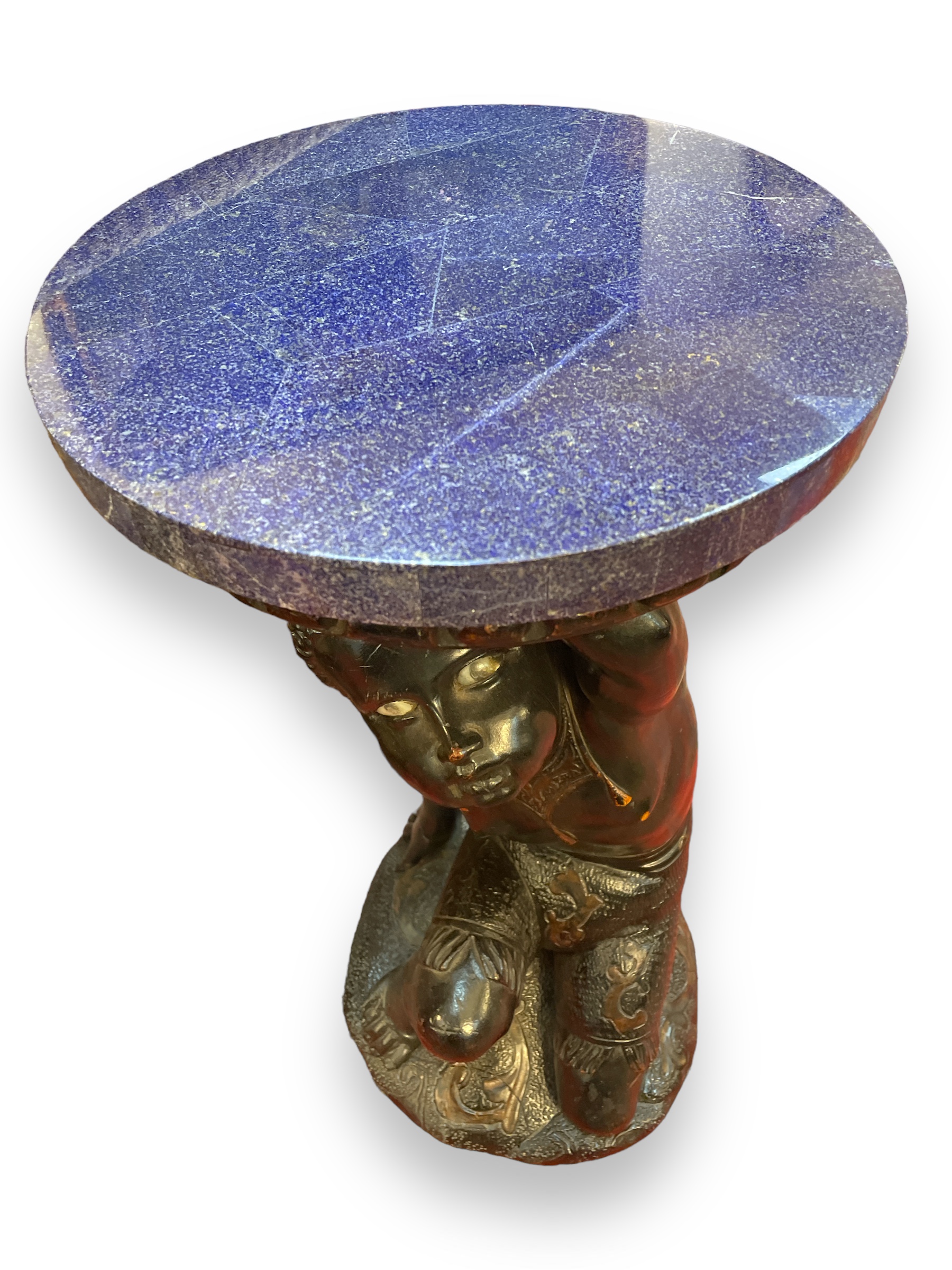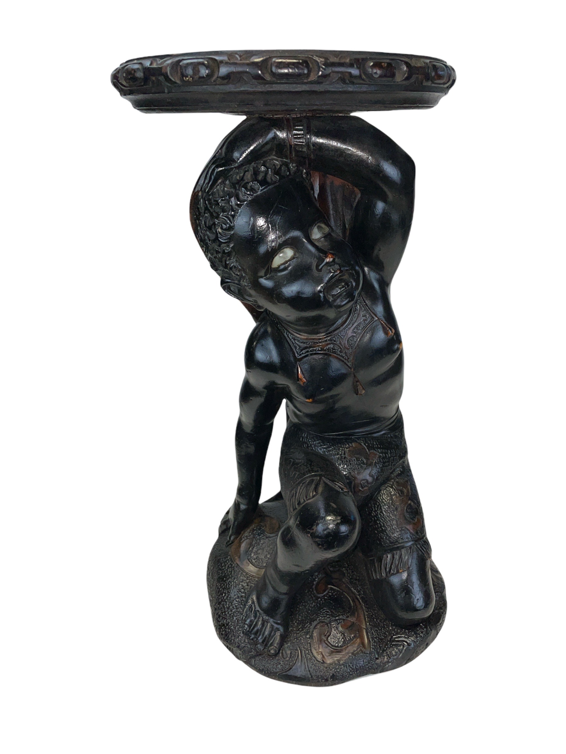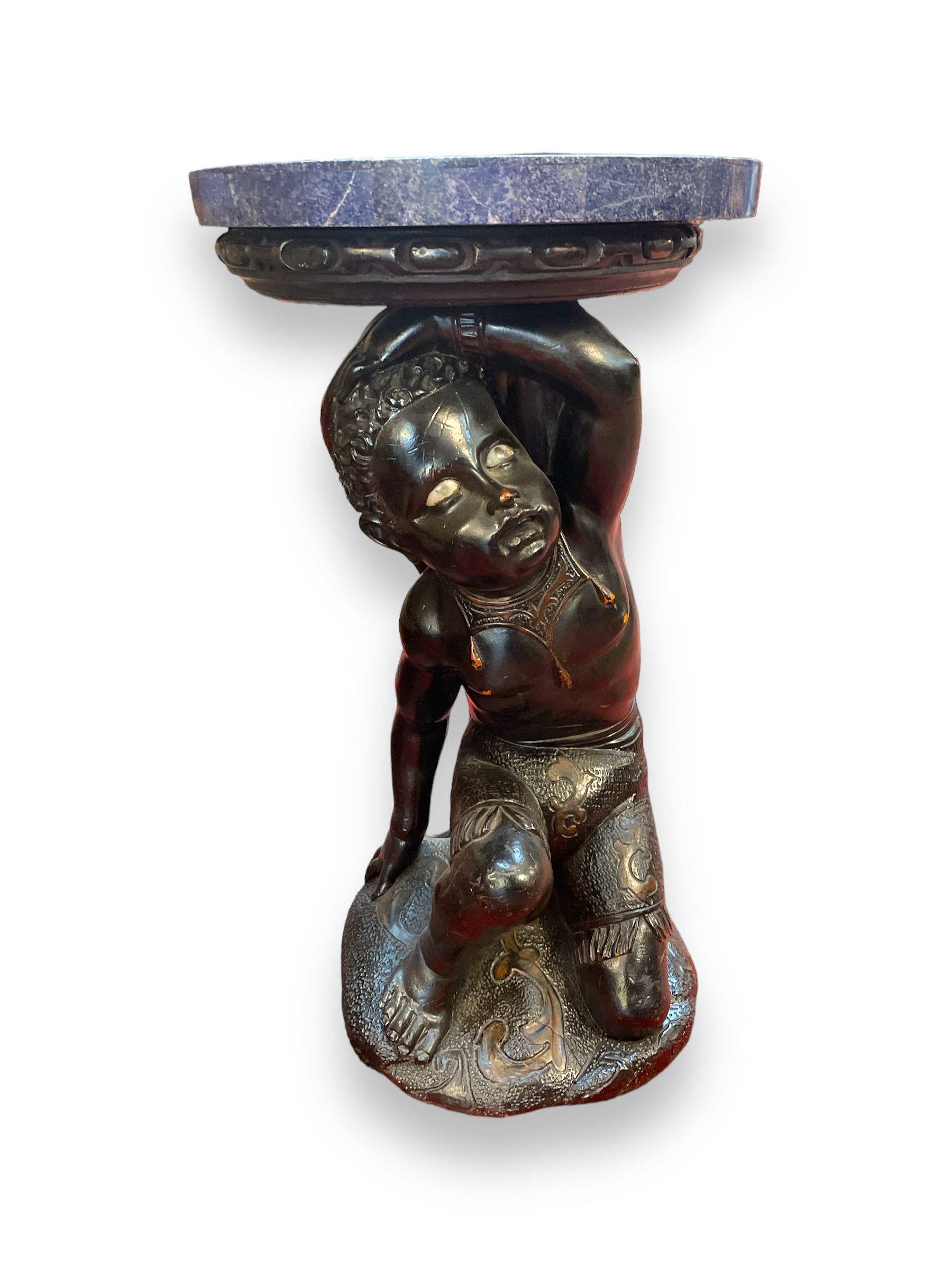19th C carved wooden ebonized figural stand with lapis lazuli veneered top; figure has glass eyes.