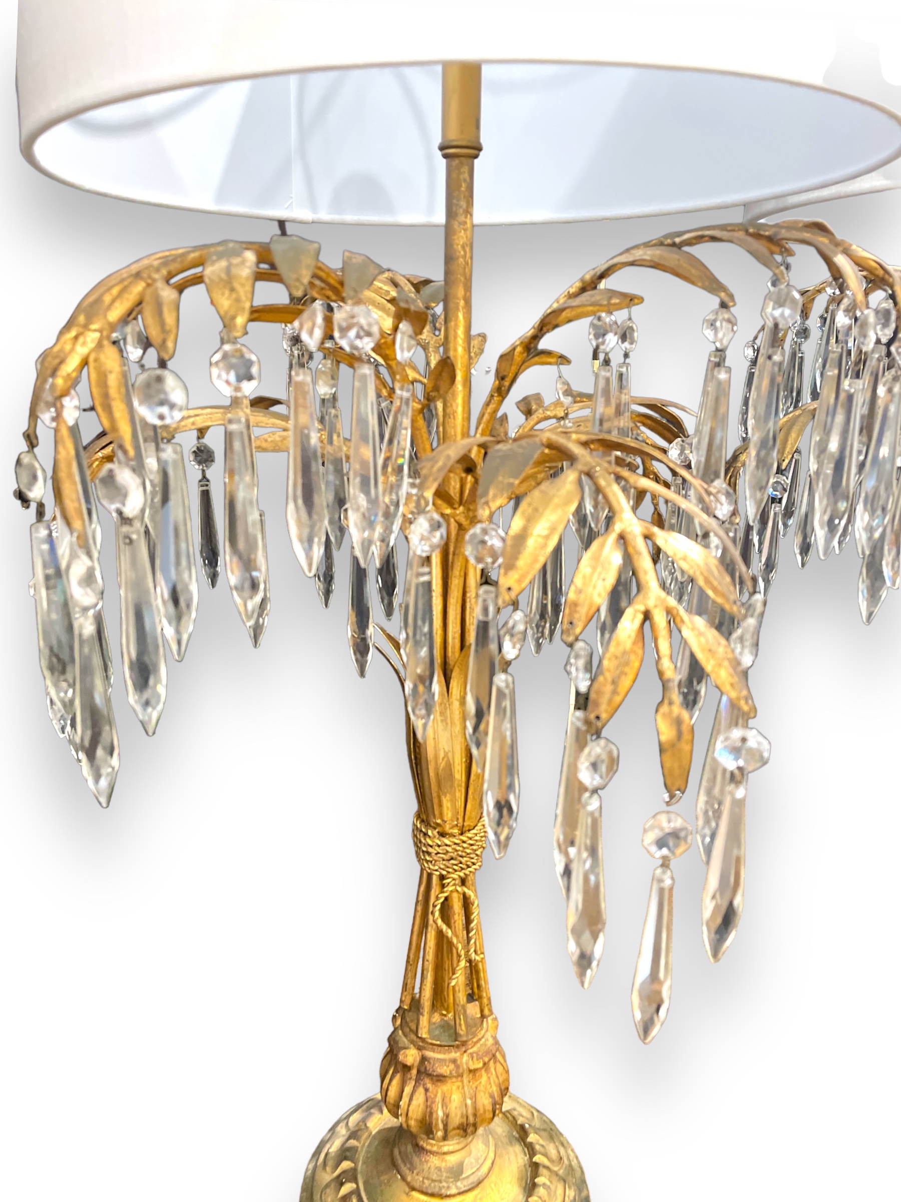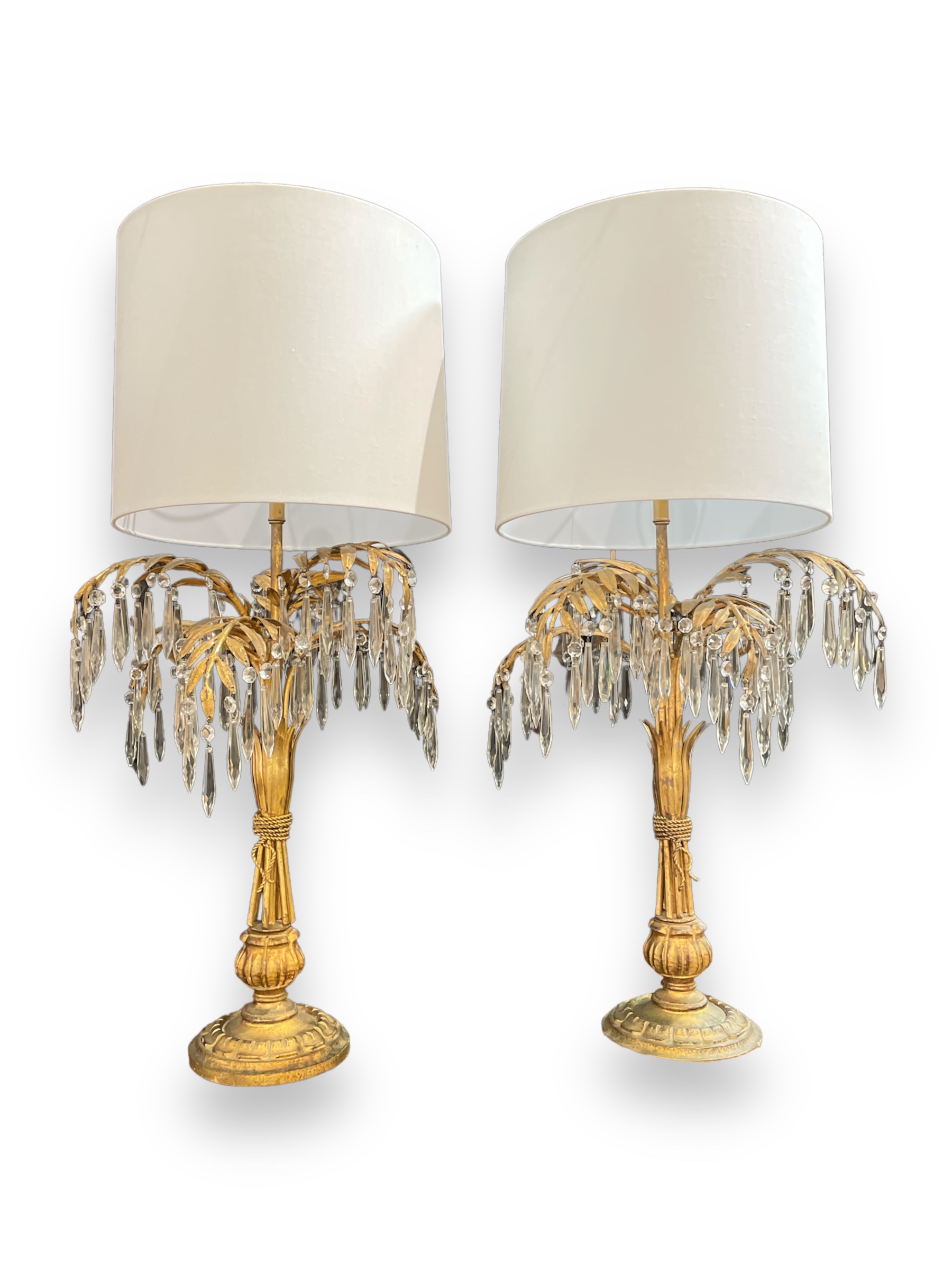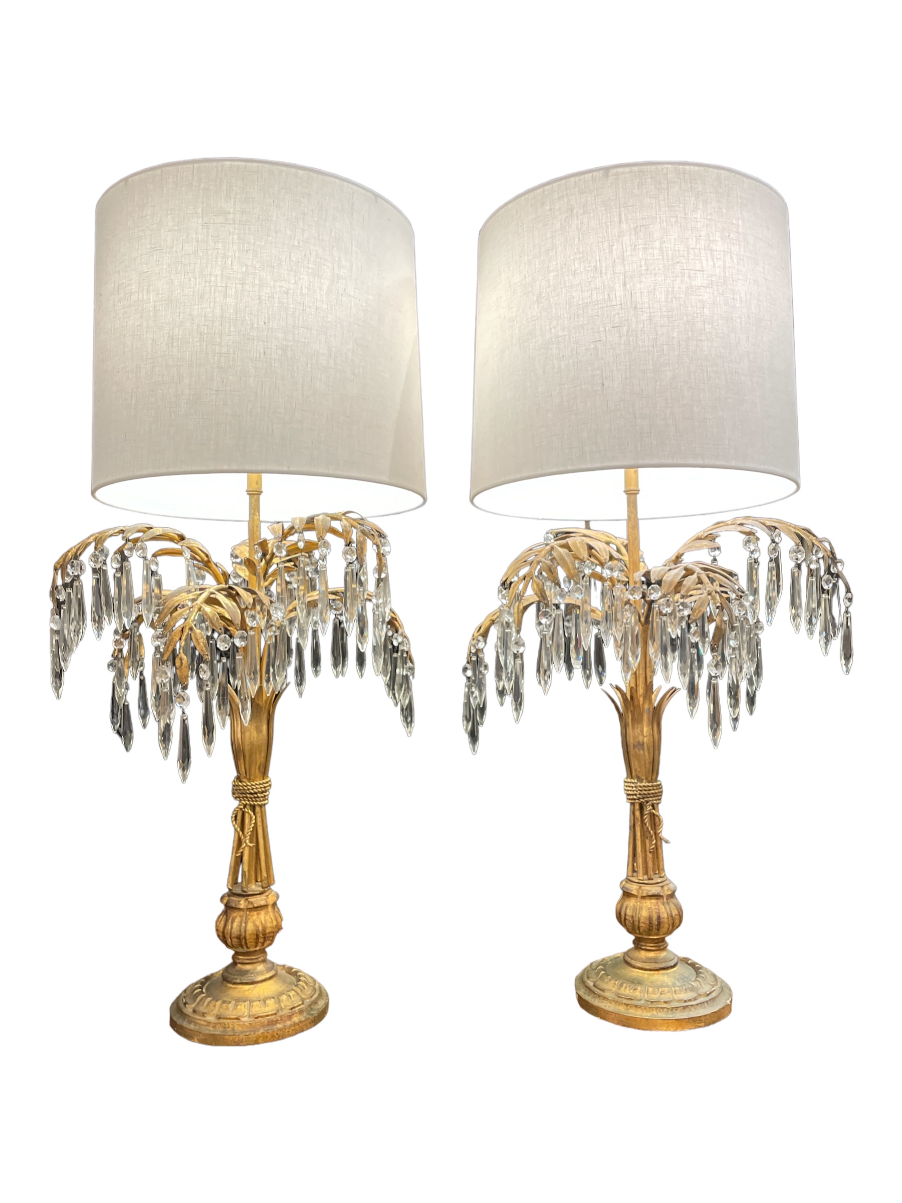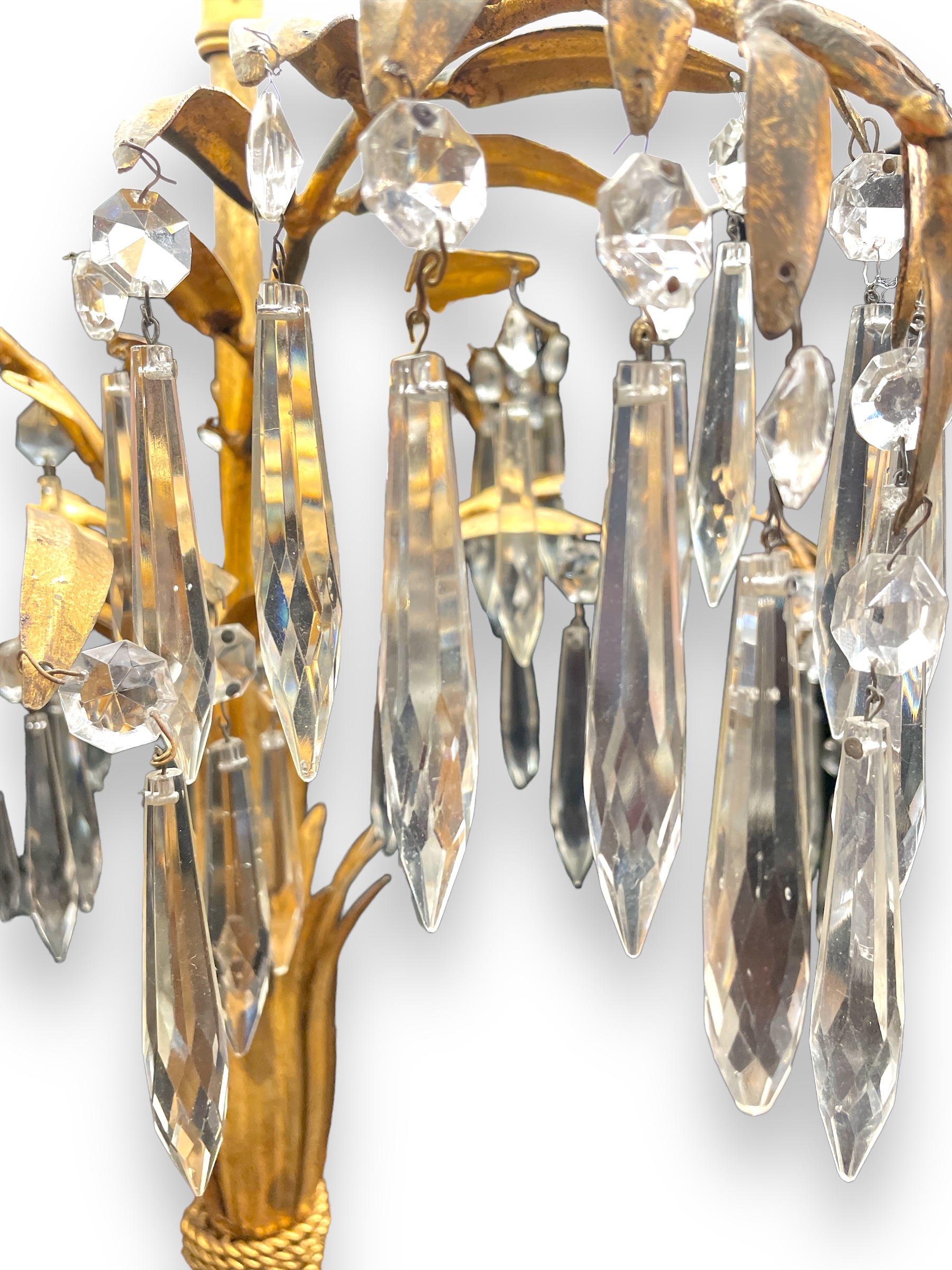 Mid-century pair of gilt metal & gilt wood sheaf of wheat lamps hung w/ faceted prisms.