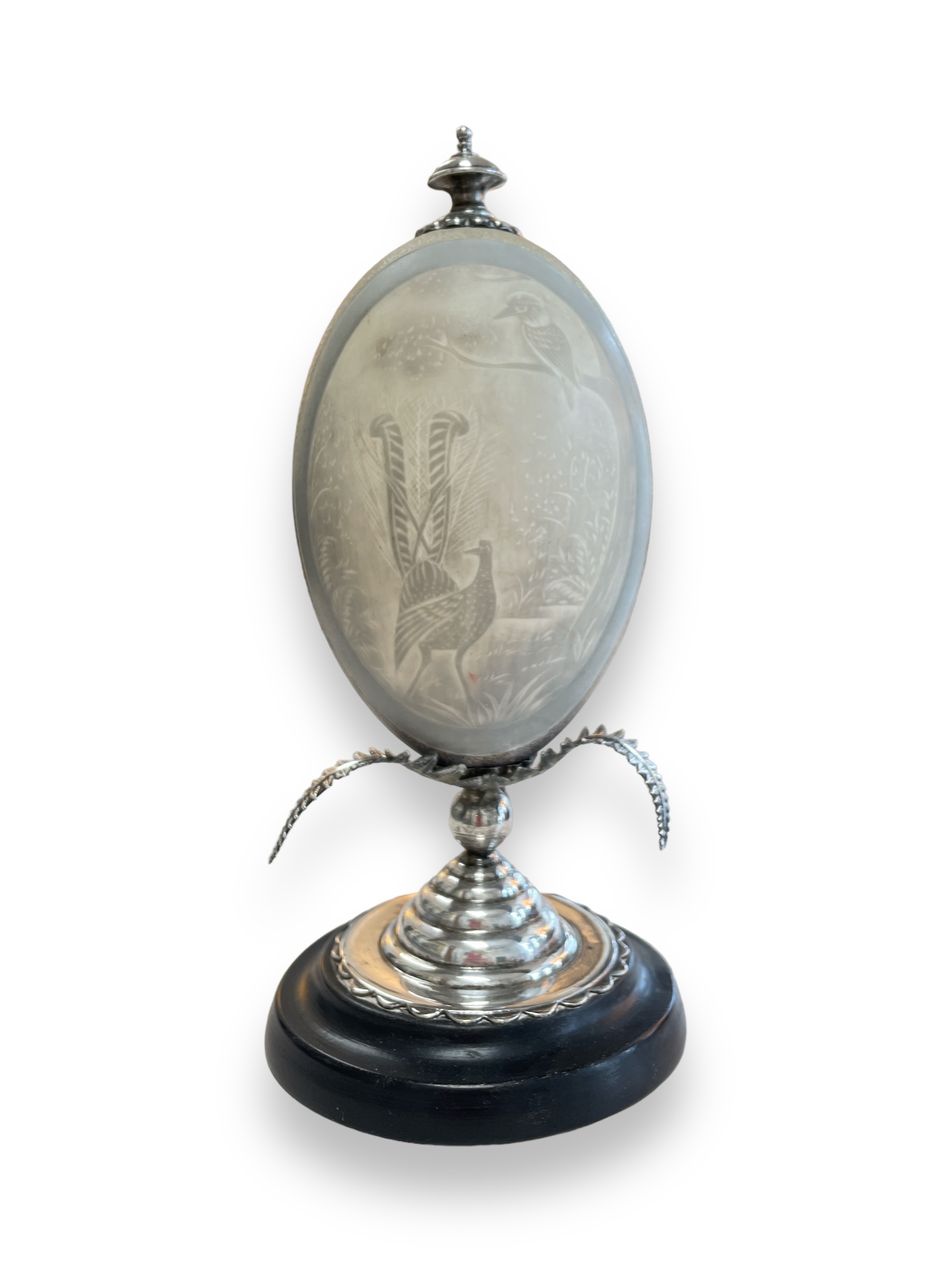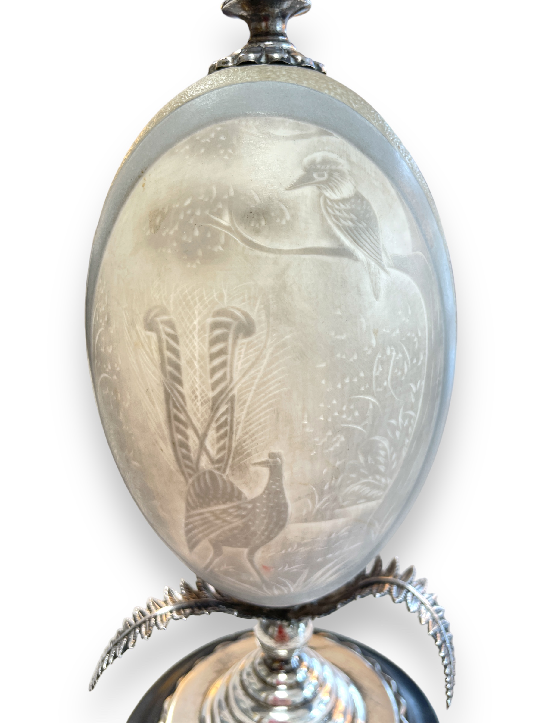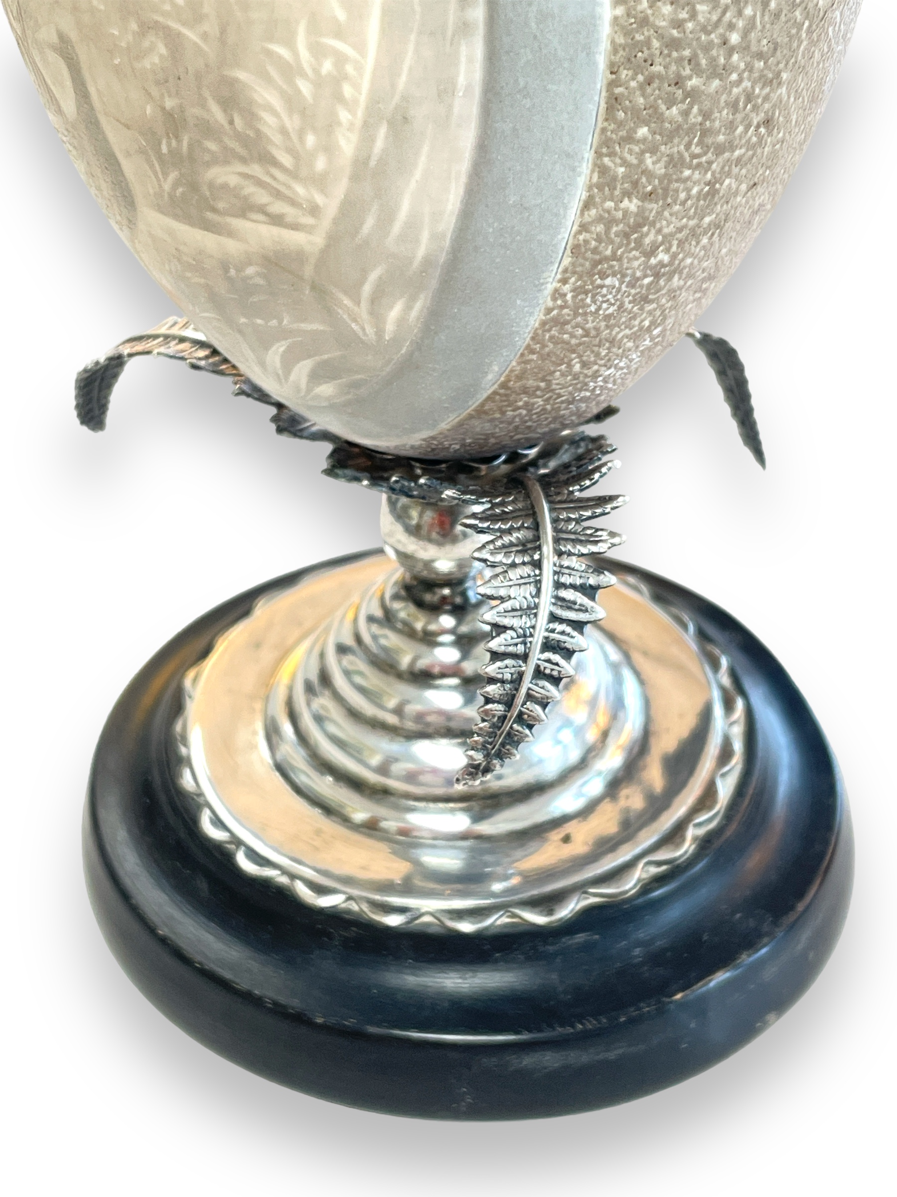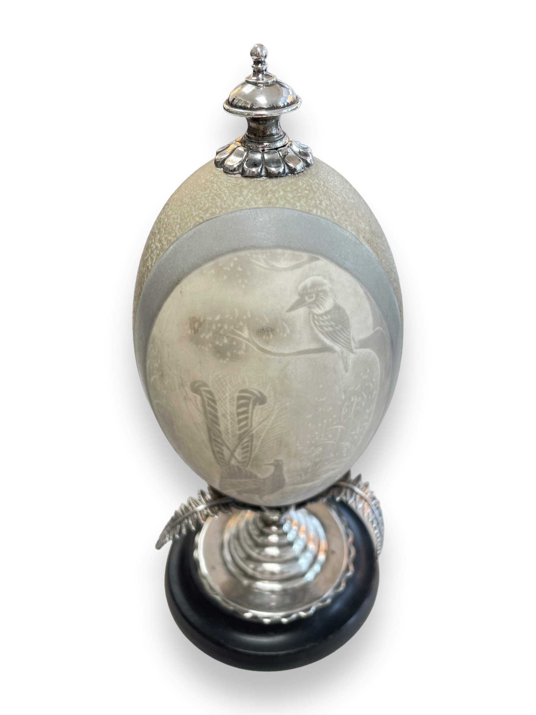 Carved emu egg mounted w/ sterling silver fixtures. Provenance: Estate of Charile Birdsong.