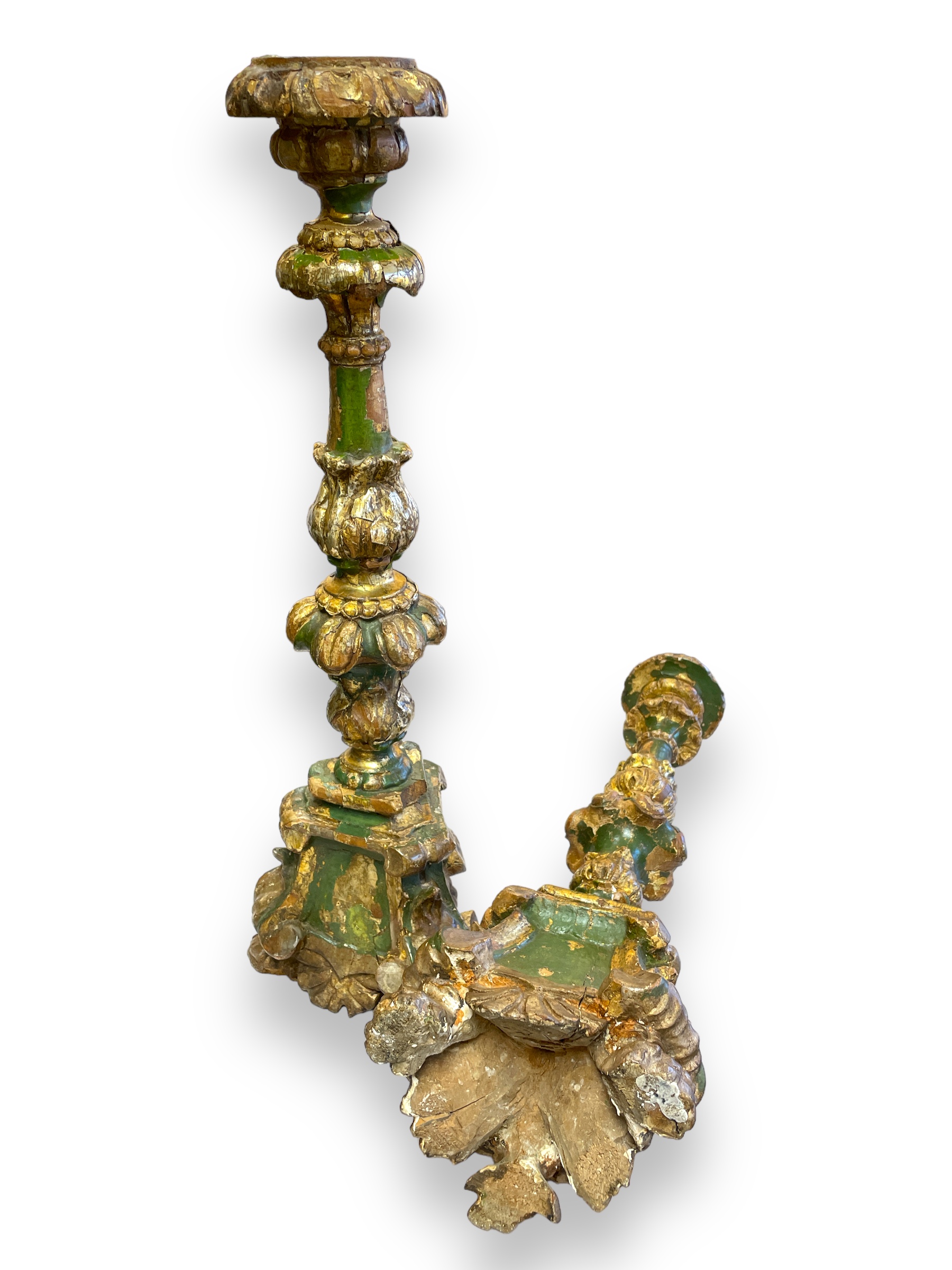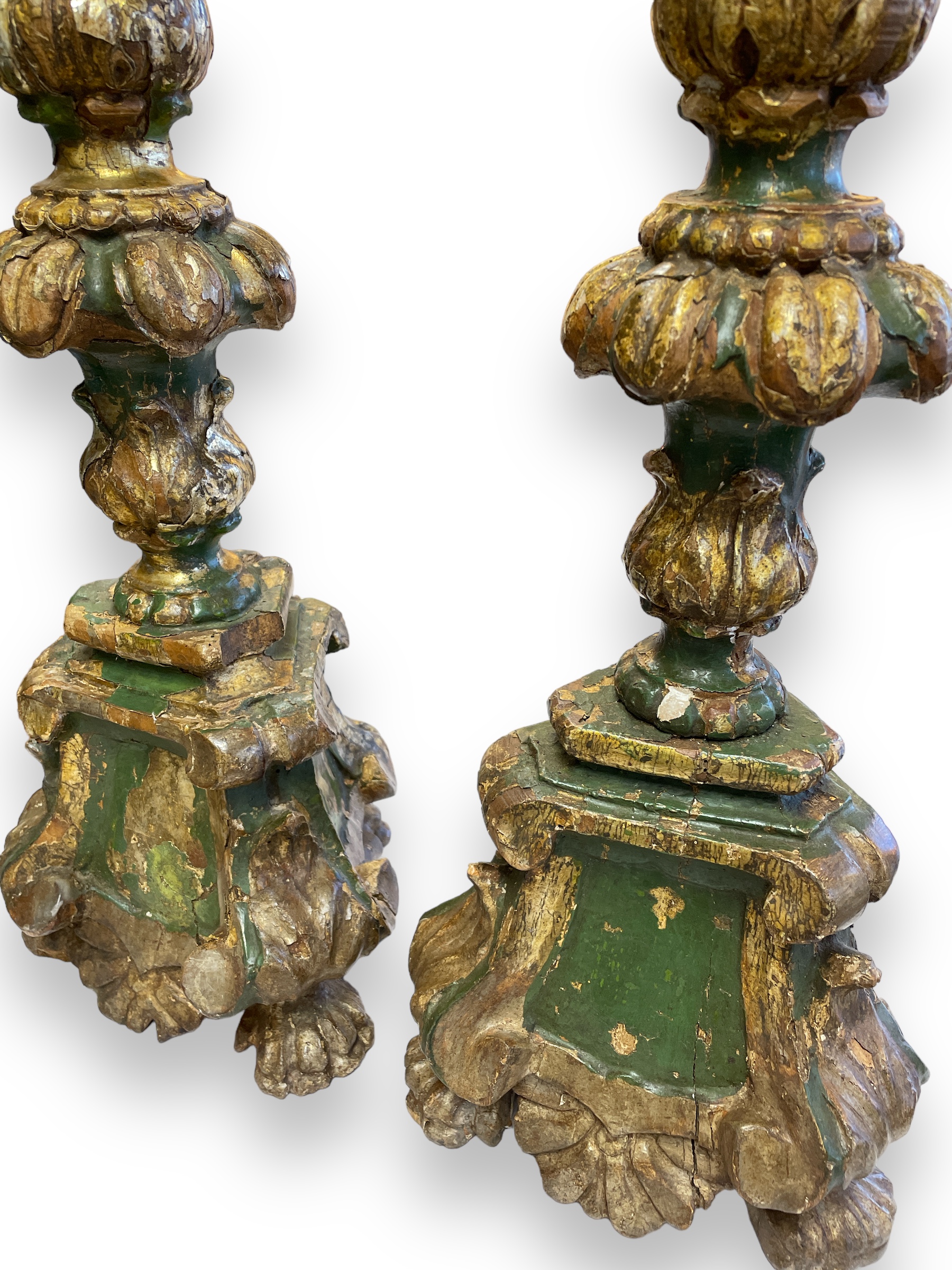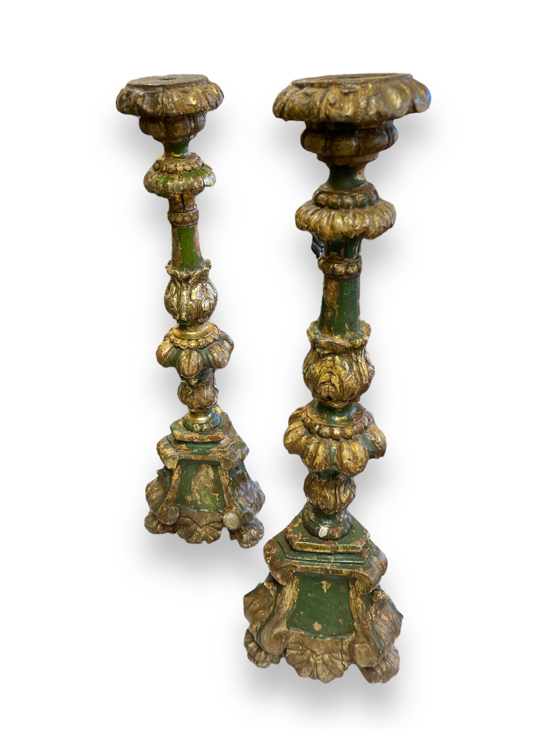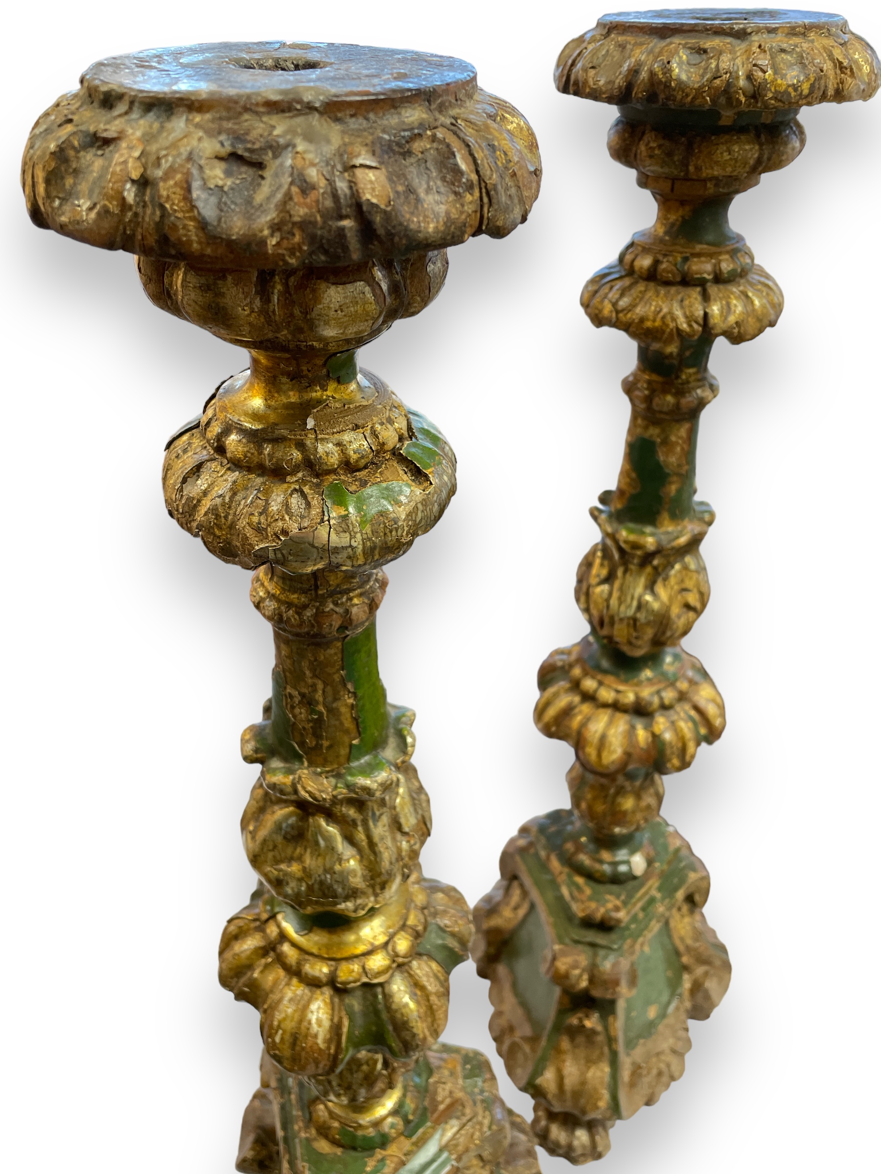 Pair of 19th C Italian/Spanish polychrome and gold gilt pricket sticks (w/ chippy paint).