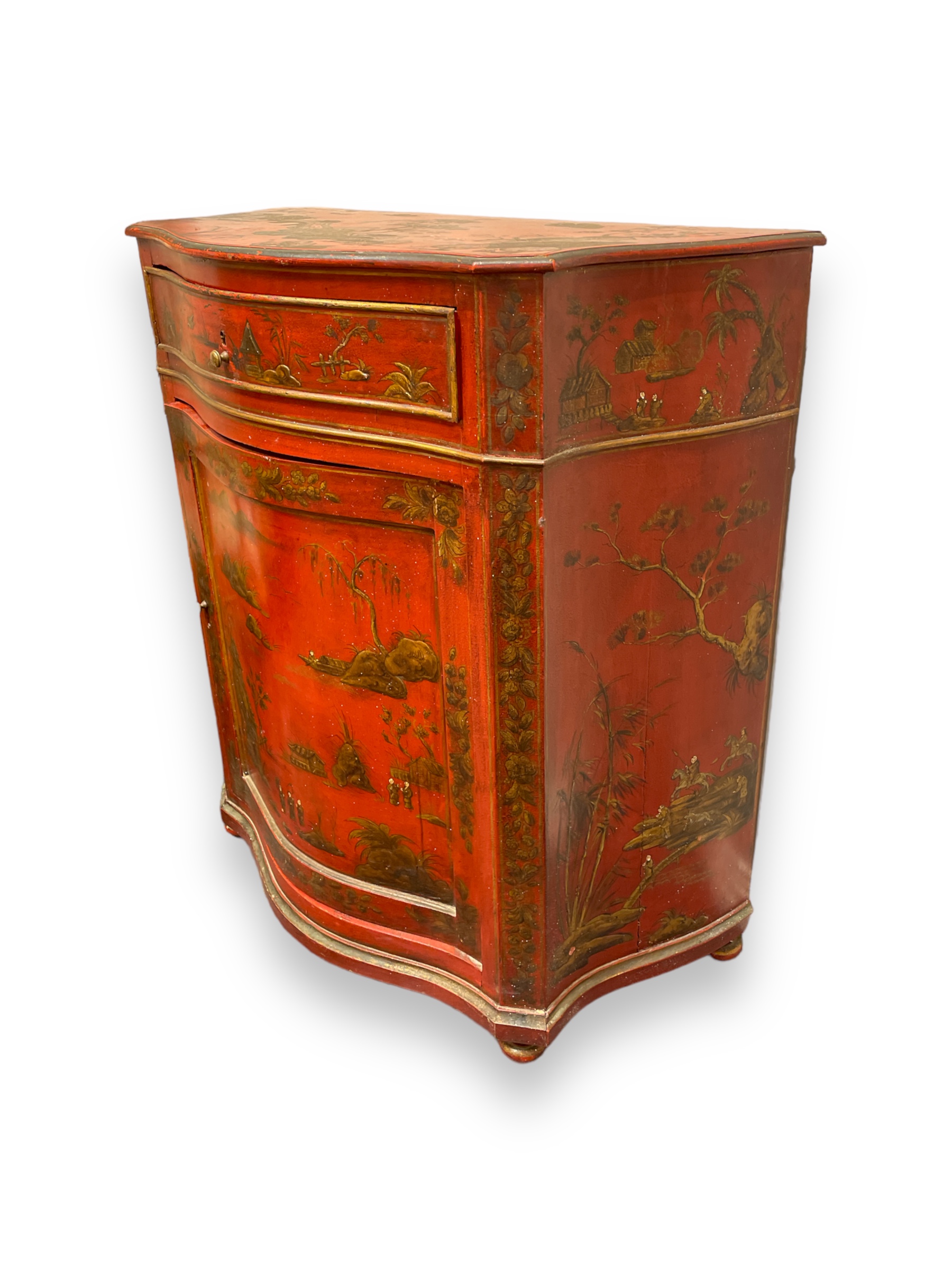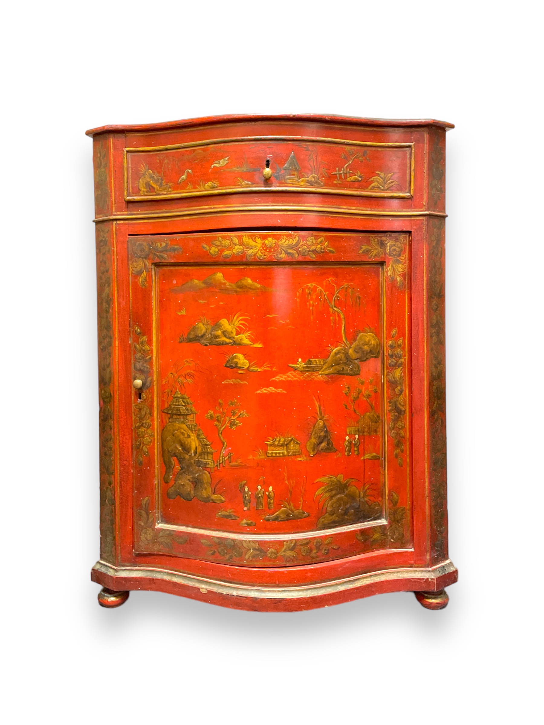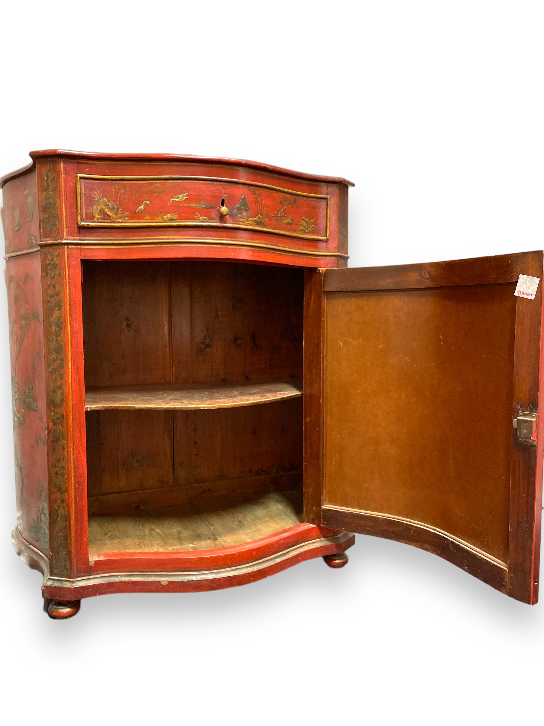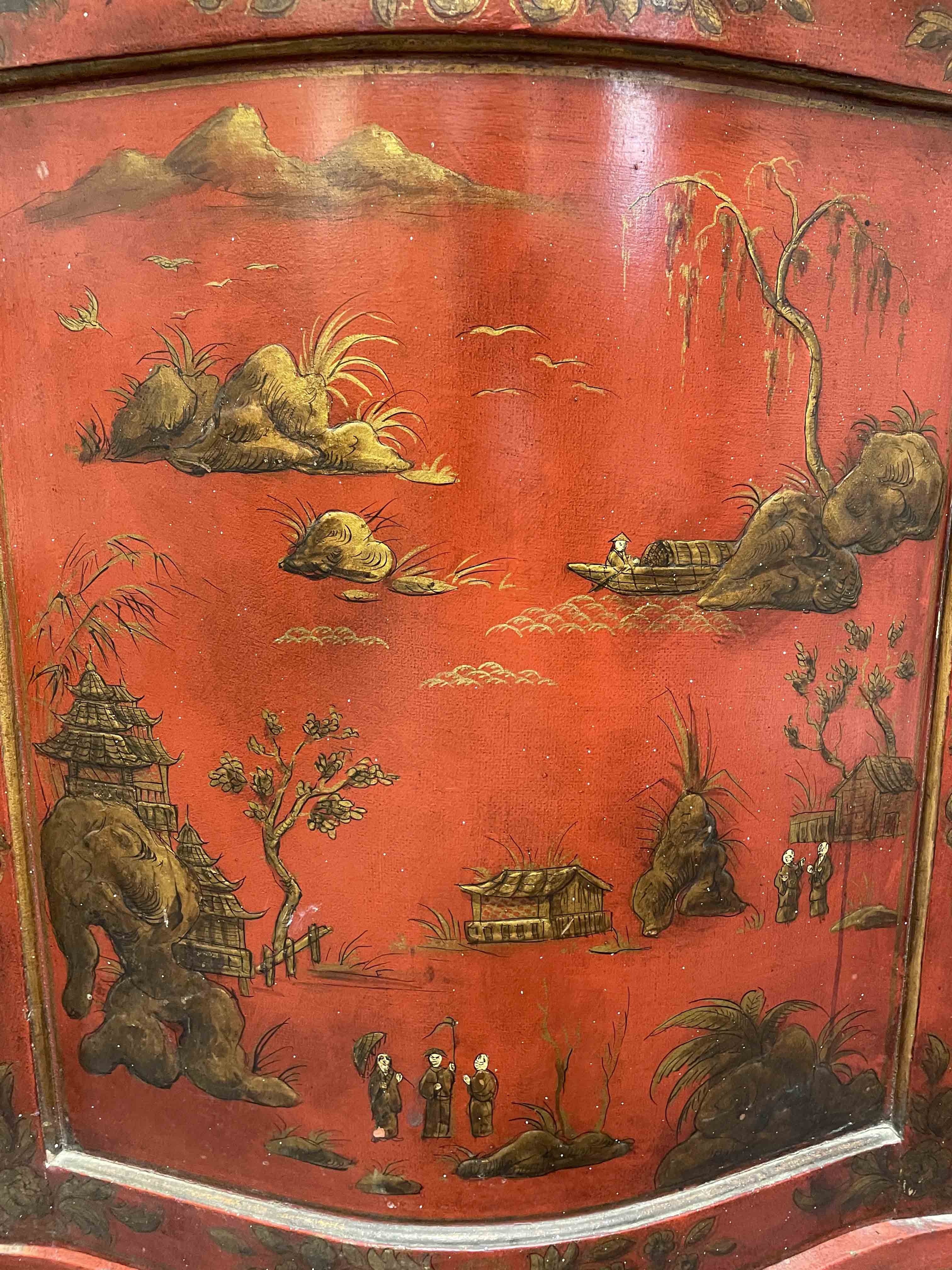 19th C English red chinoiserie decorated cabinet.