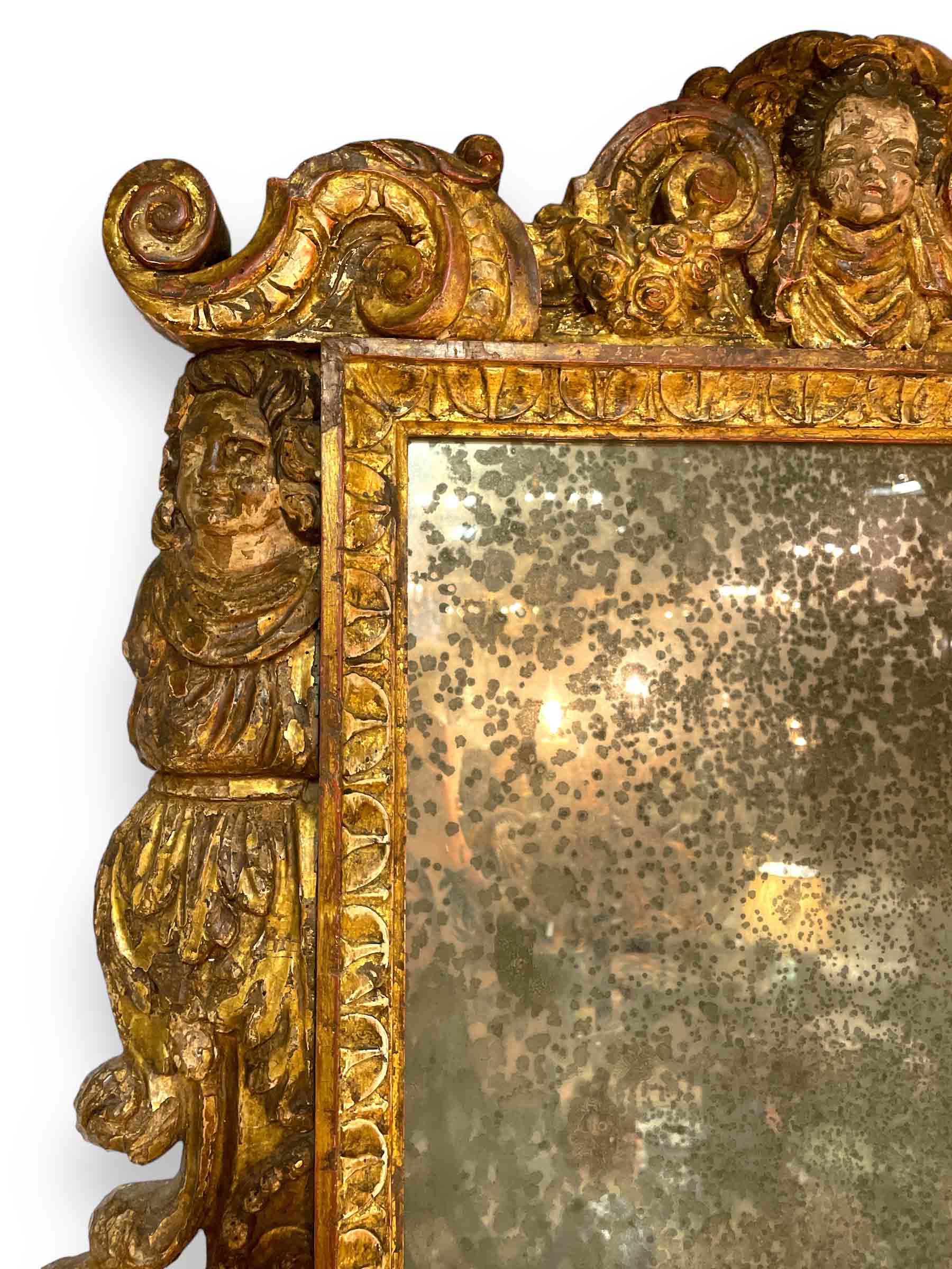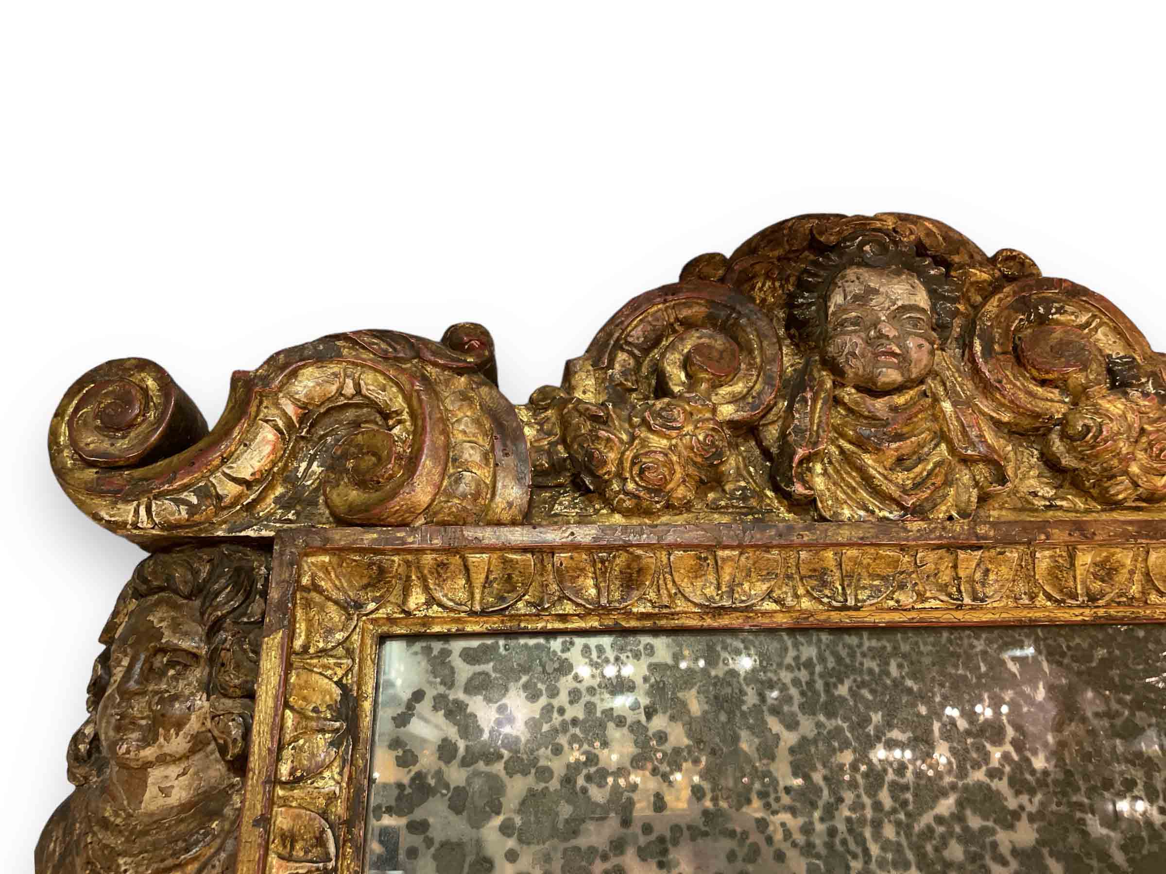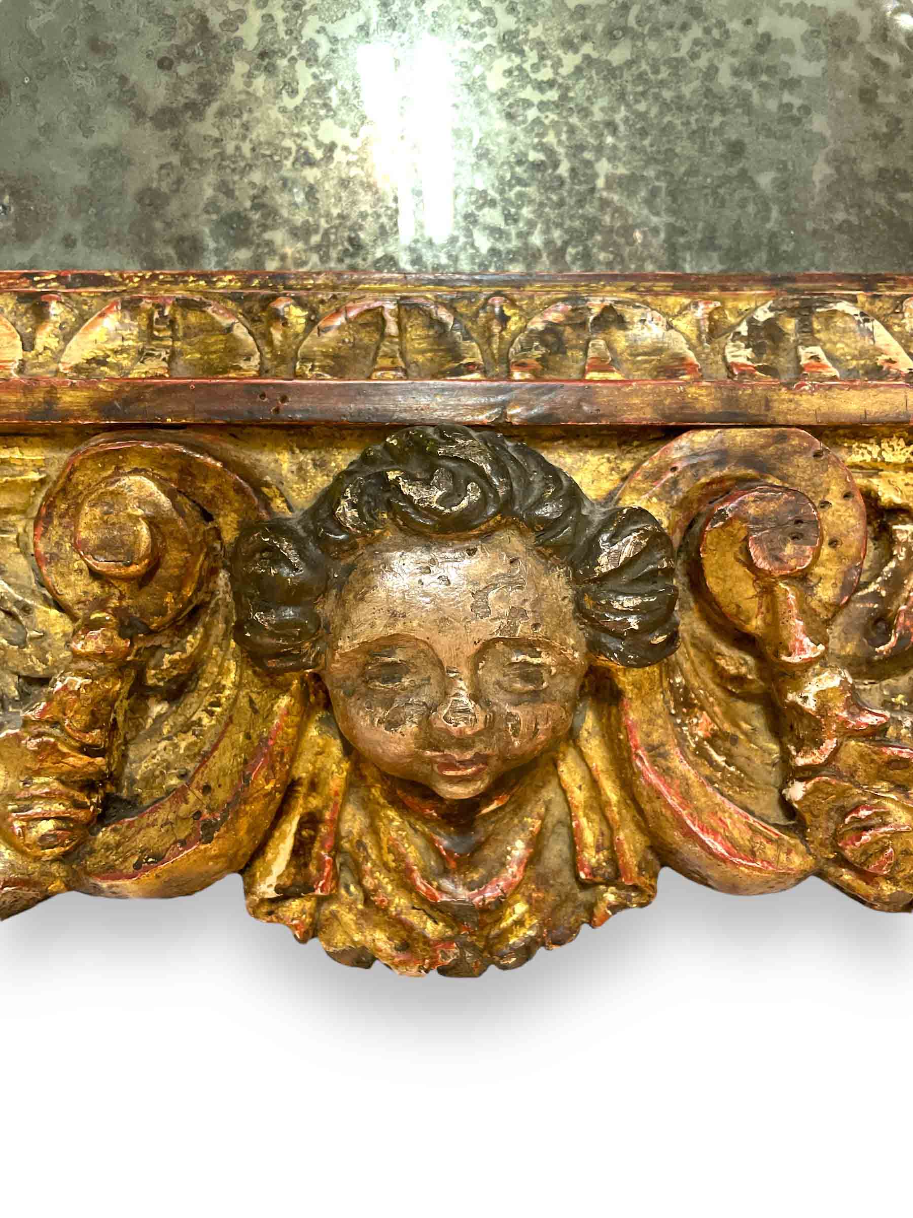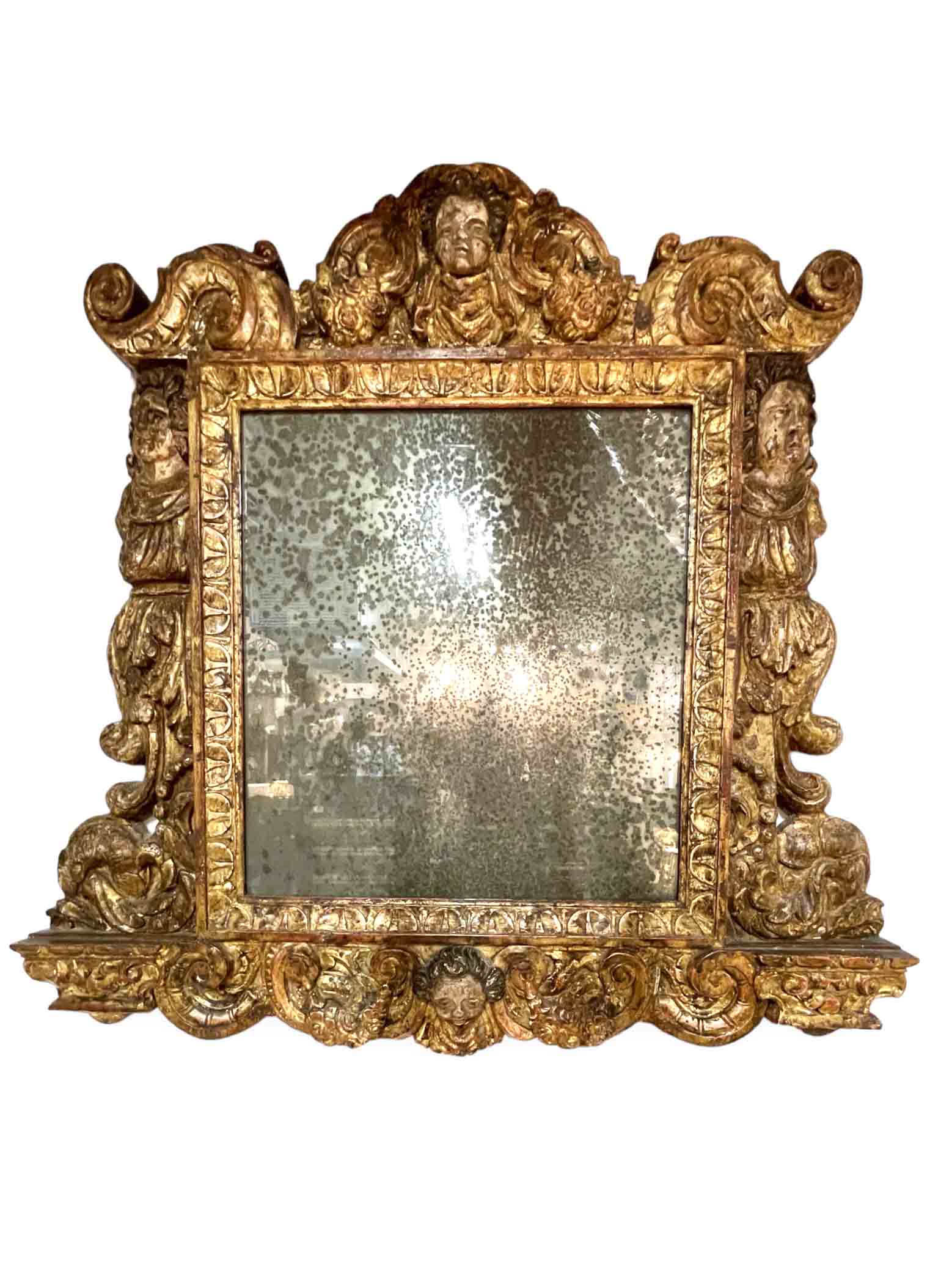 Italian gold gilt rectangular mirror w/ putti heads in center, top, and bottom made from 18th C elements. Plate is later.