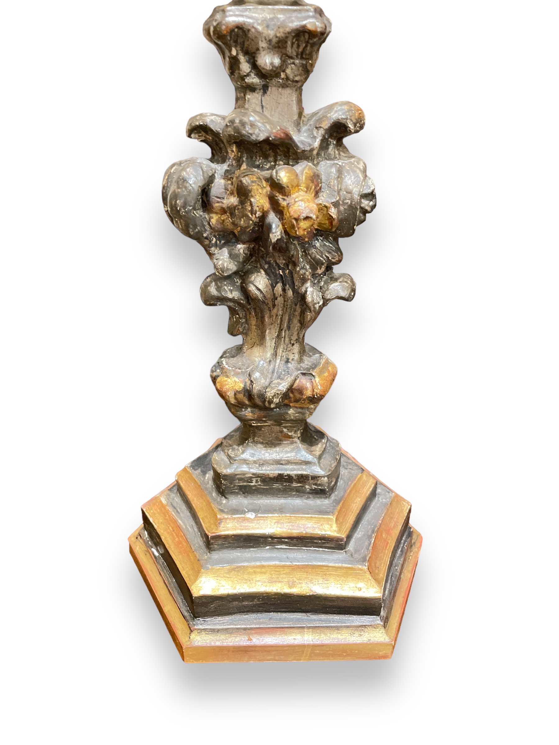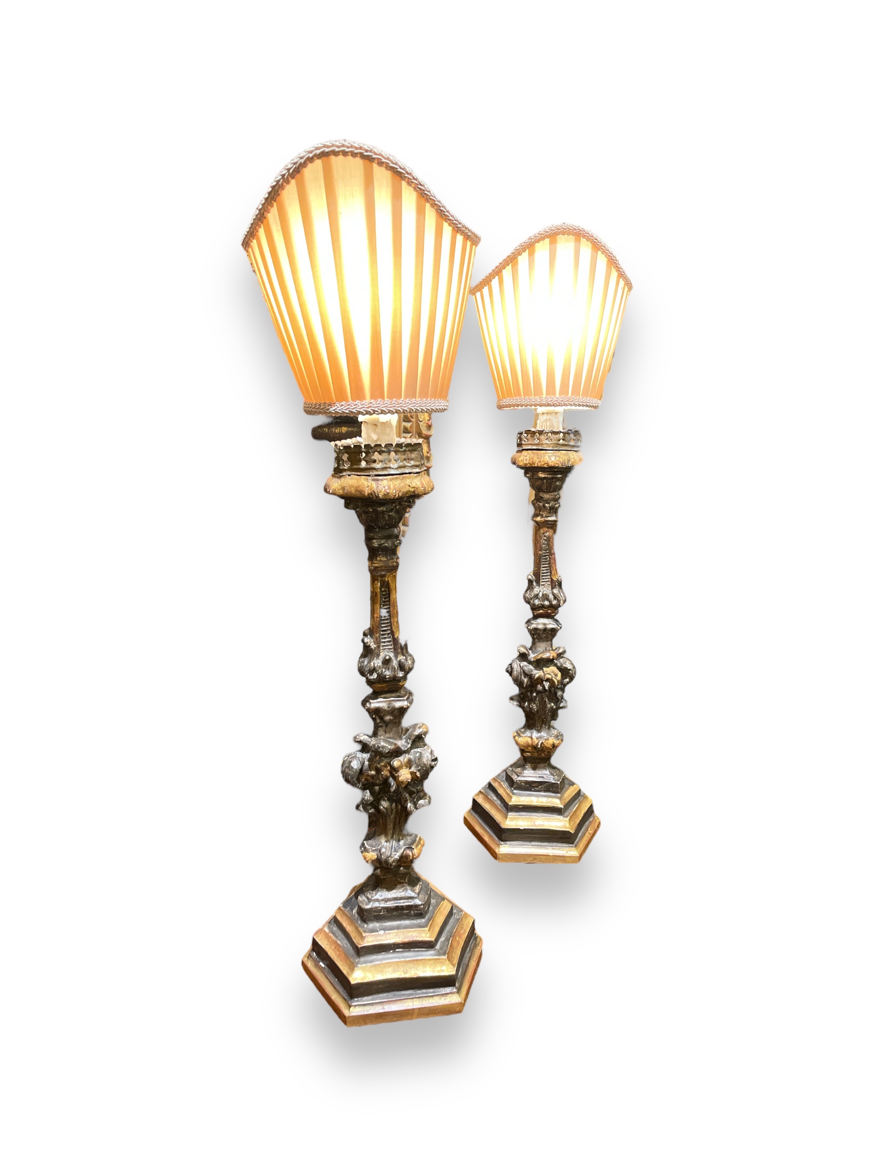 Pair of 18th C Italian polychrome pricket sticks, now custom lamps w/ shield- shaped shades.
