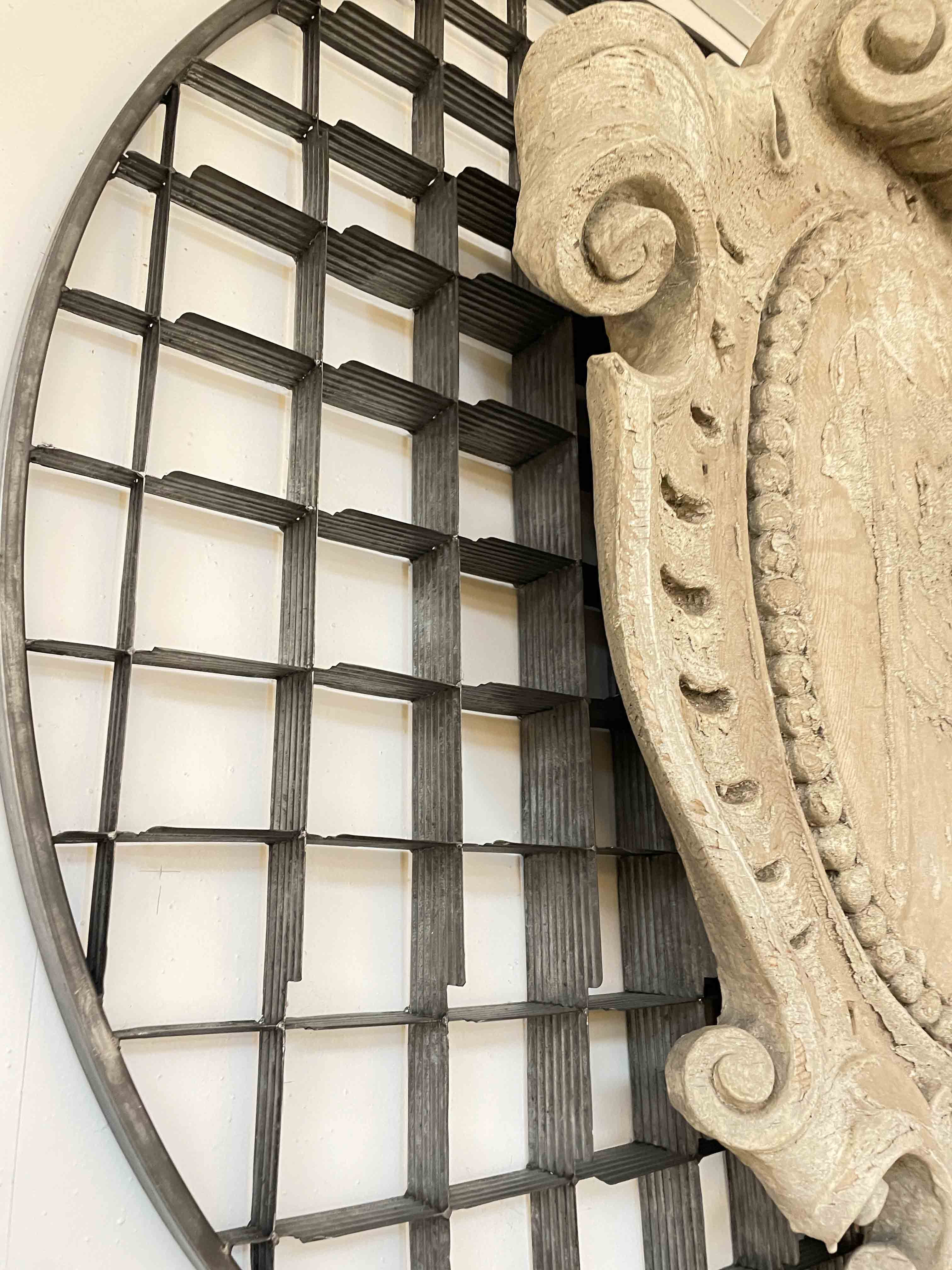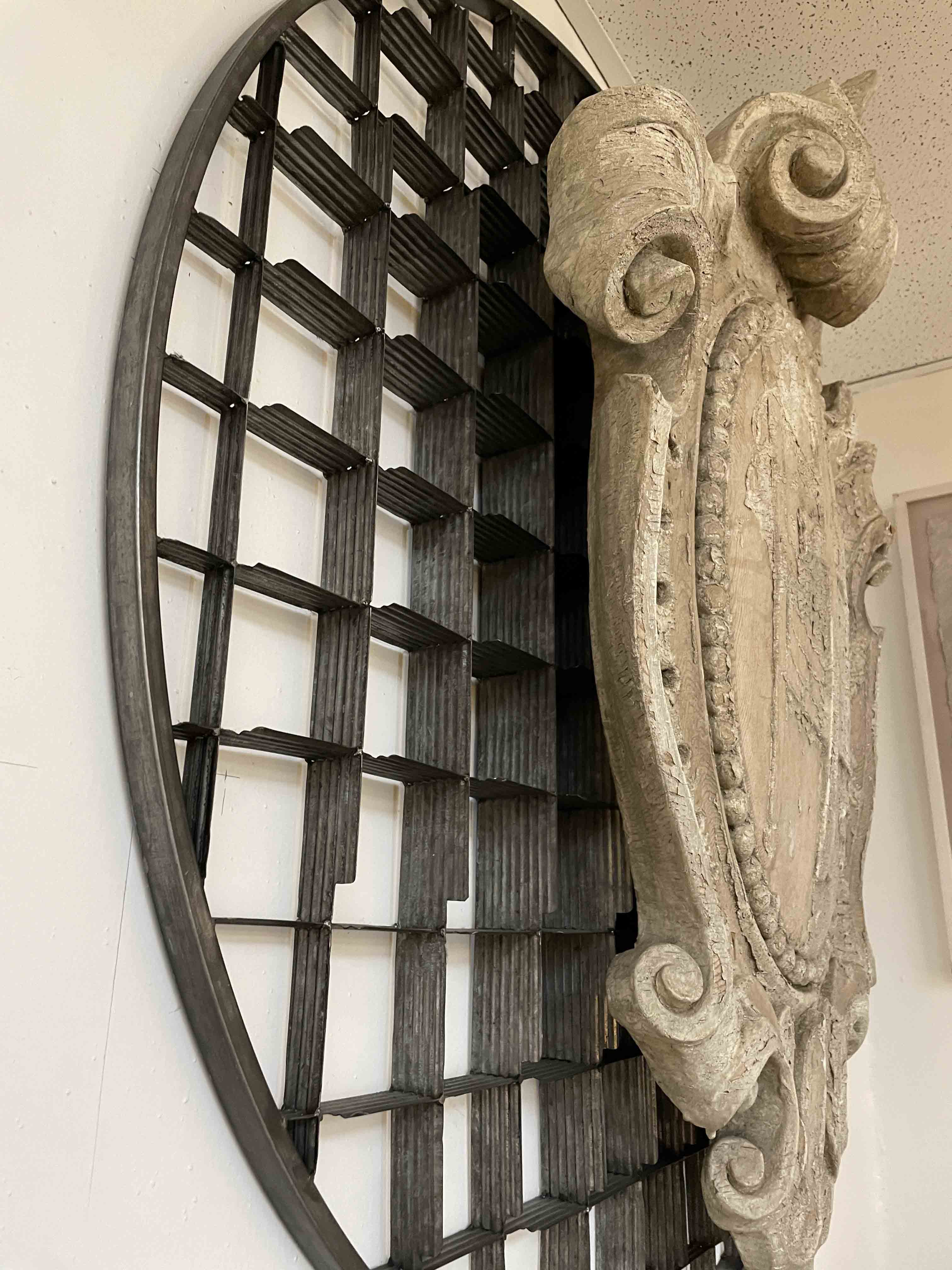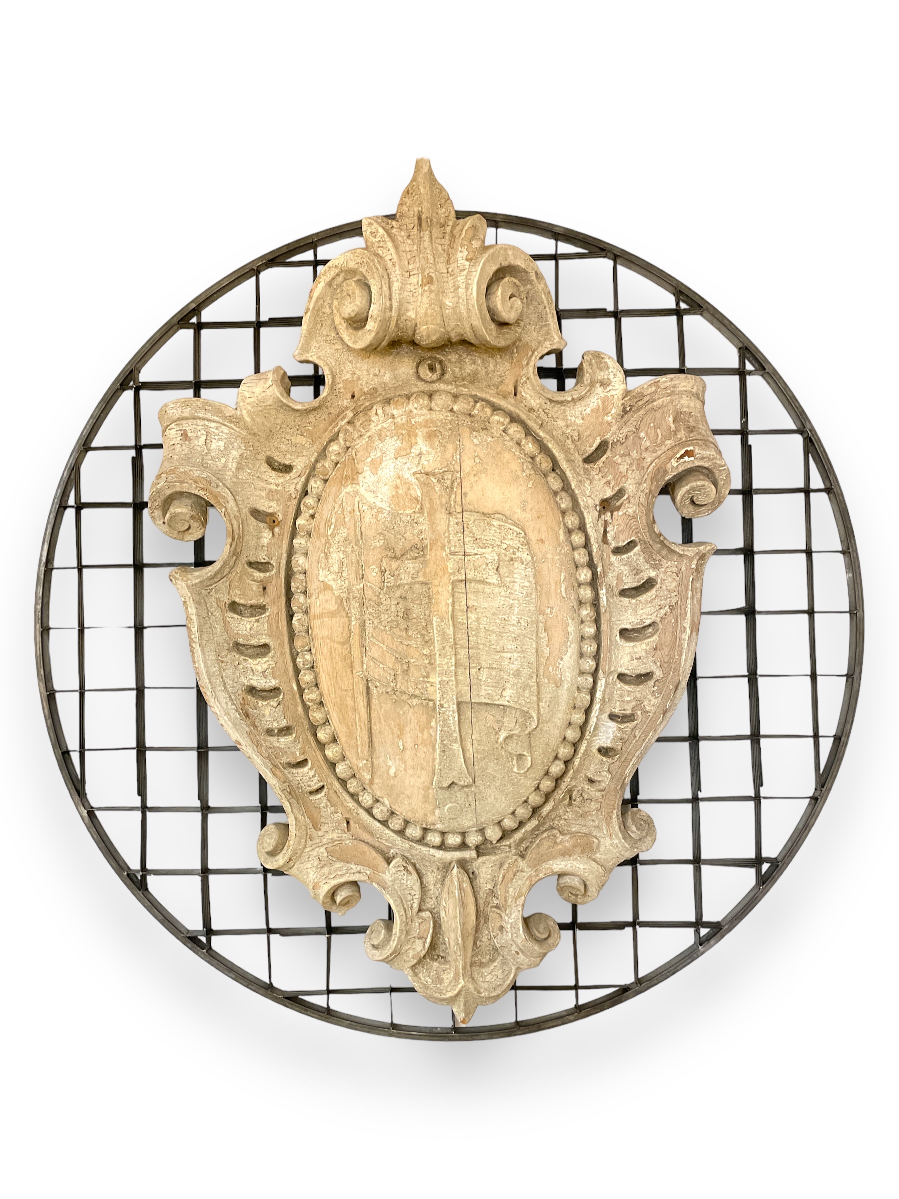 Iron circular waffle shaped wall hanging w/ carved wooden shield, decorated with a crest on top.