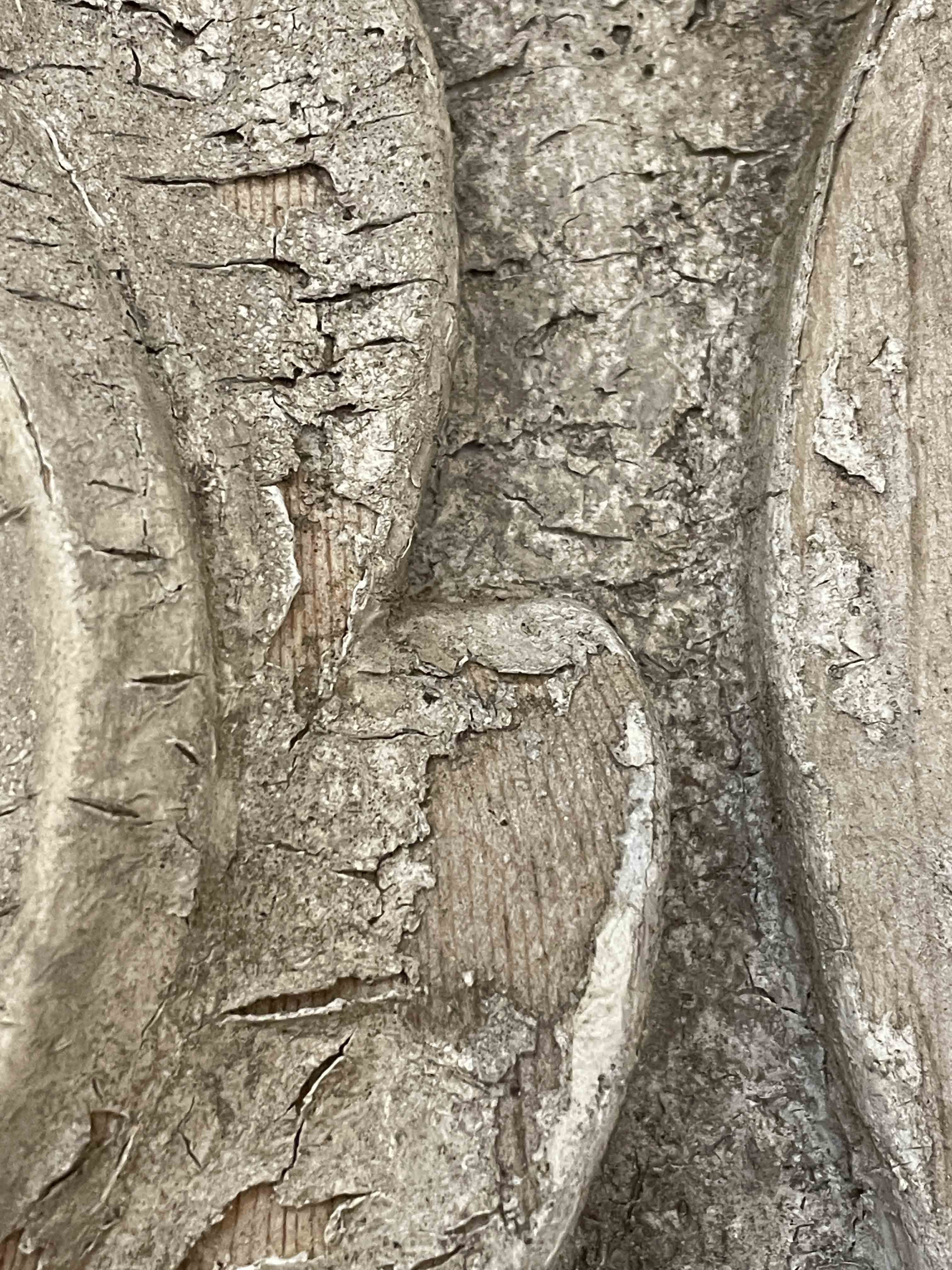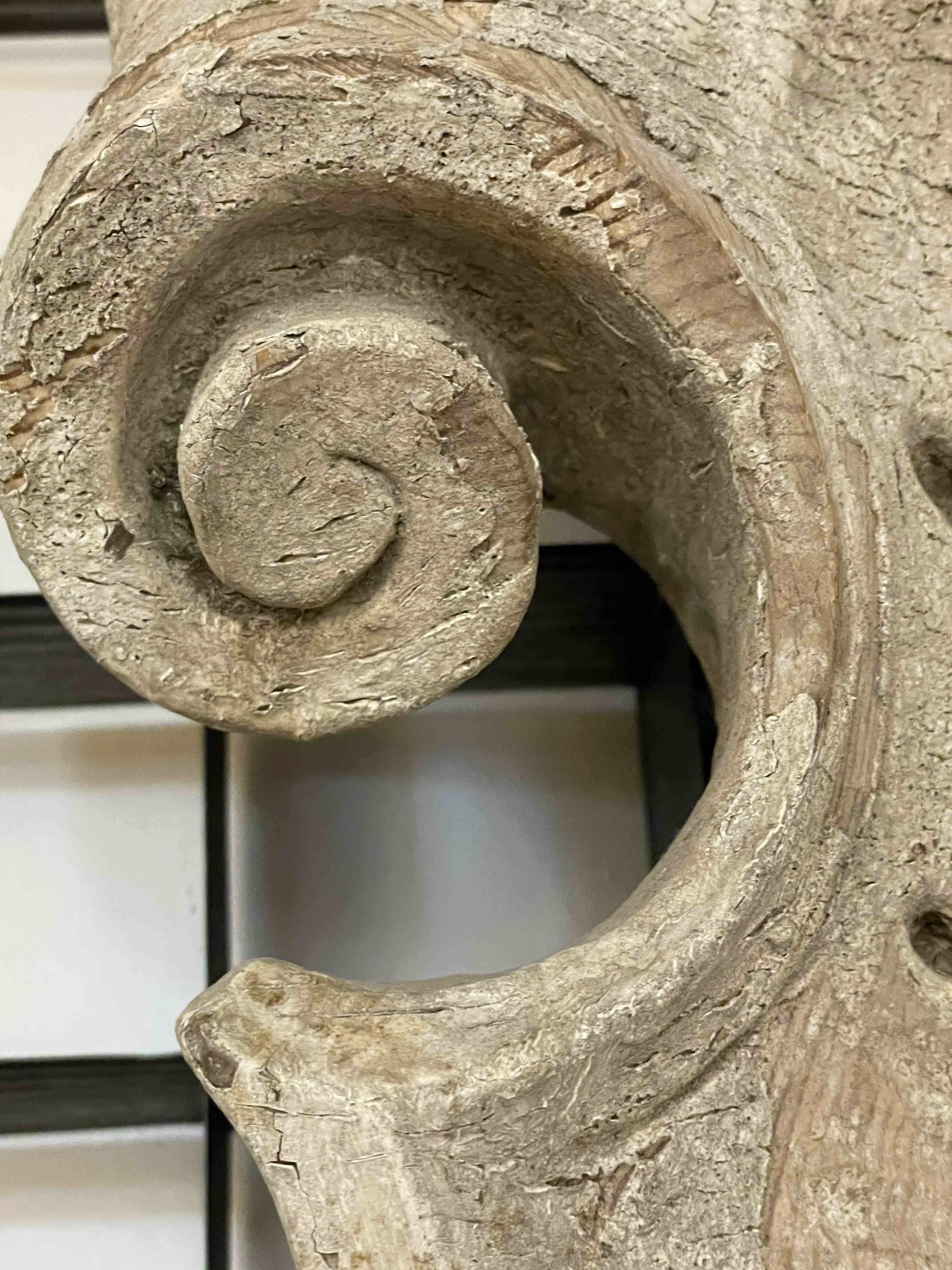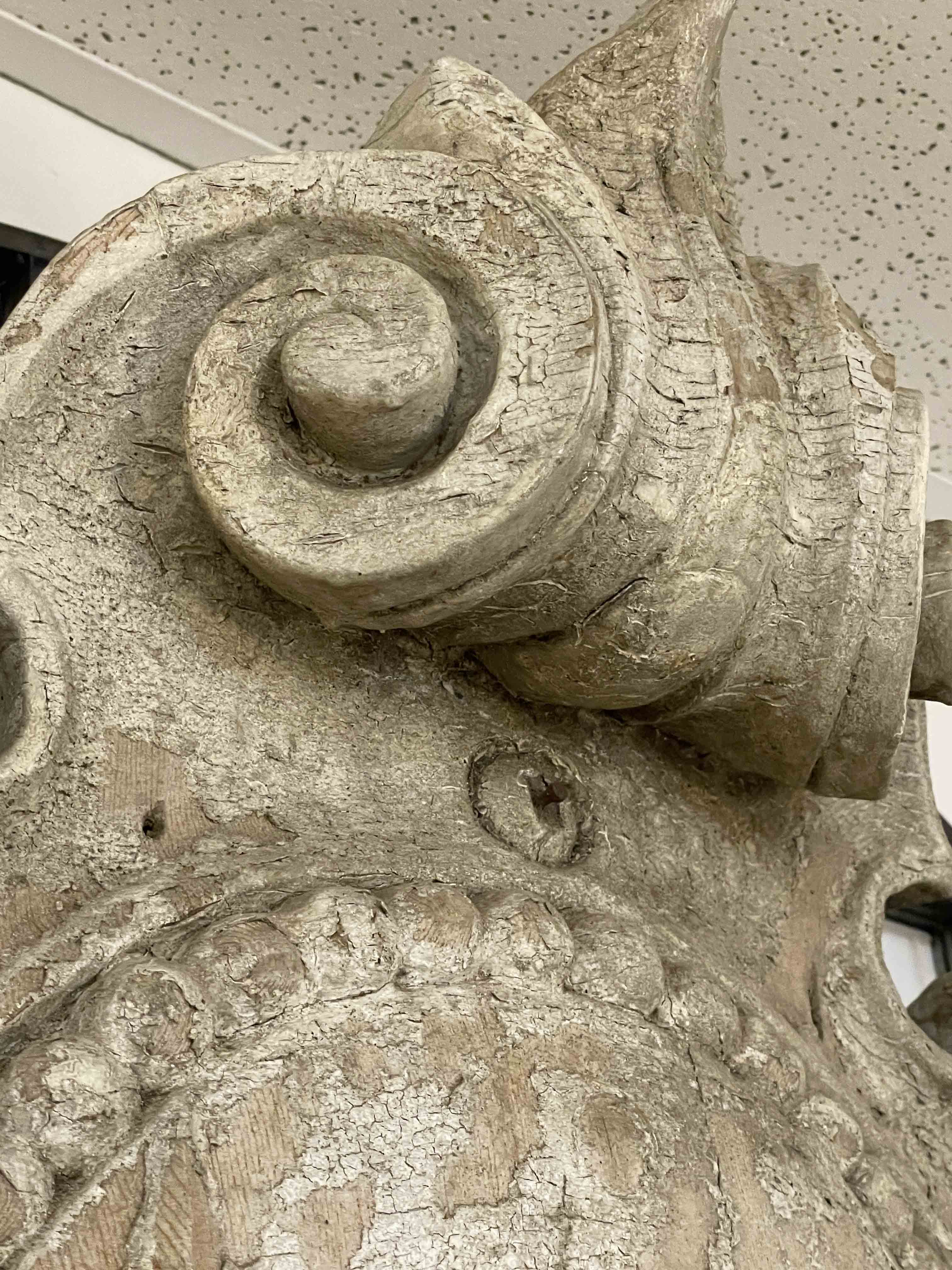 Iron circular waffle shaped wall hanging w/ carved wooden shield, decorated with a crest on top.