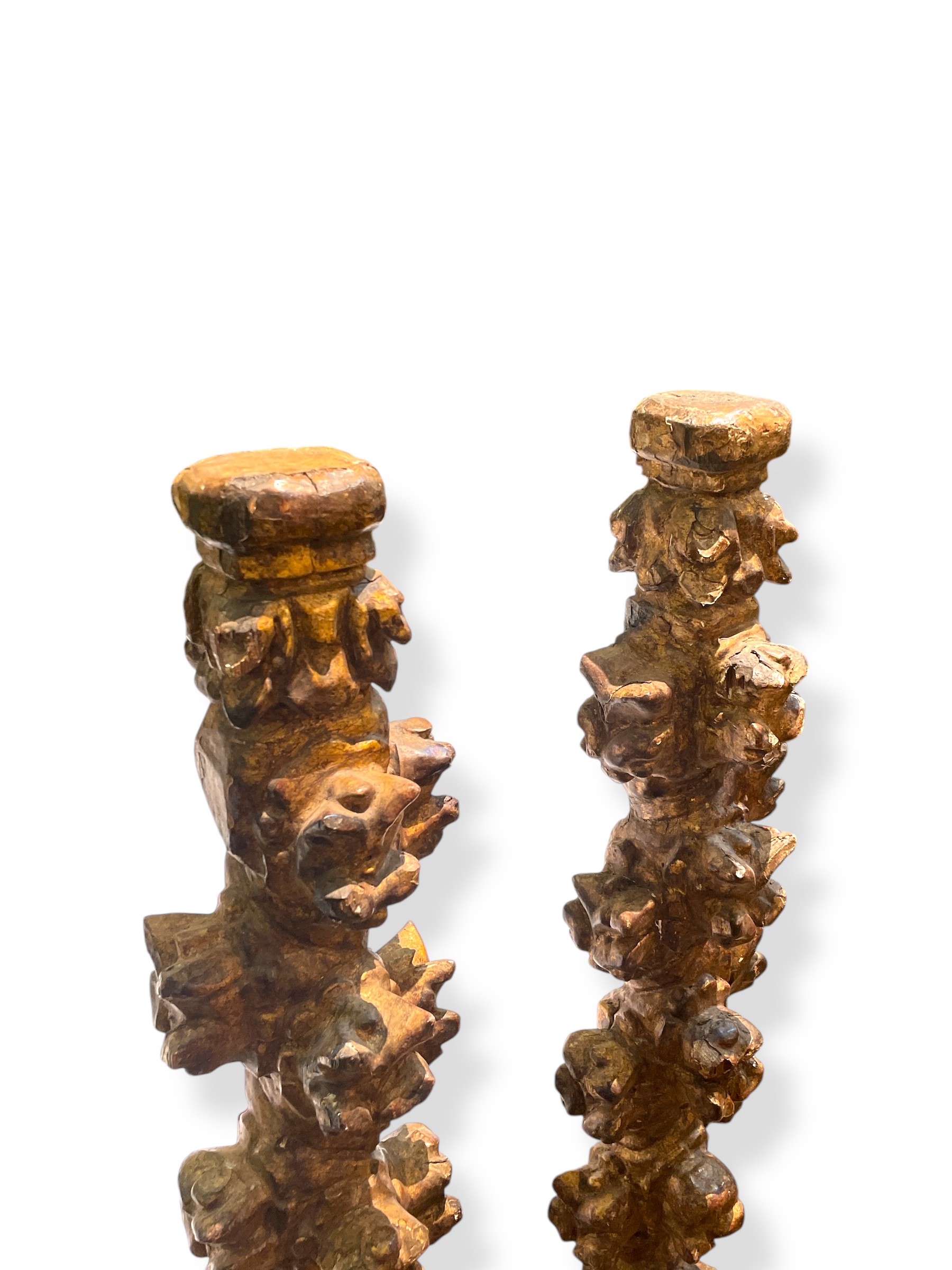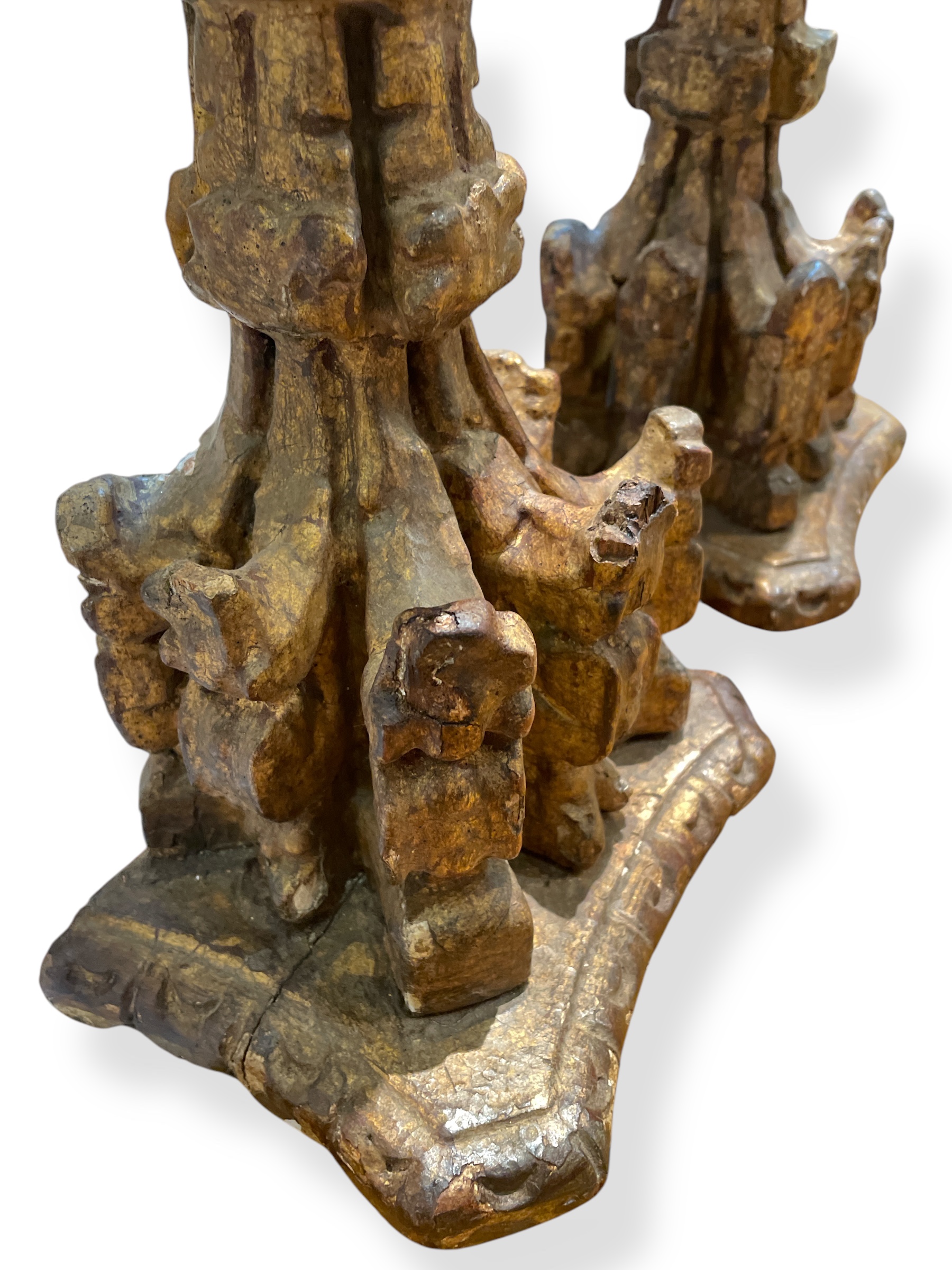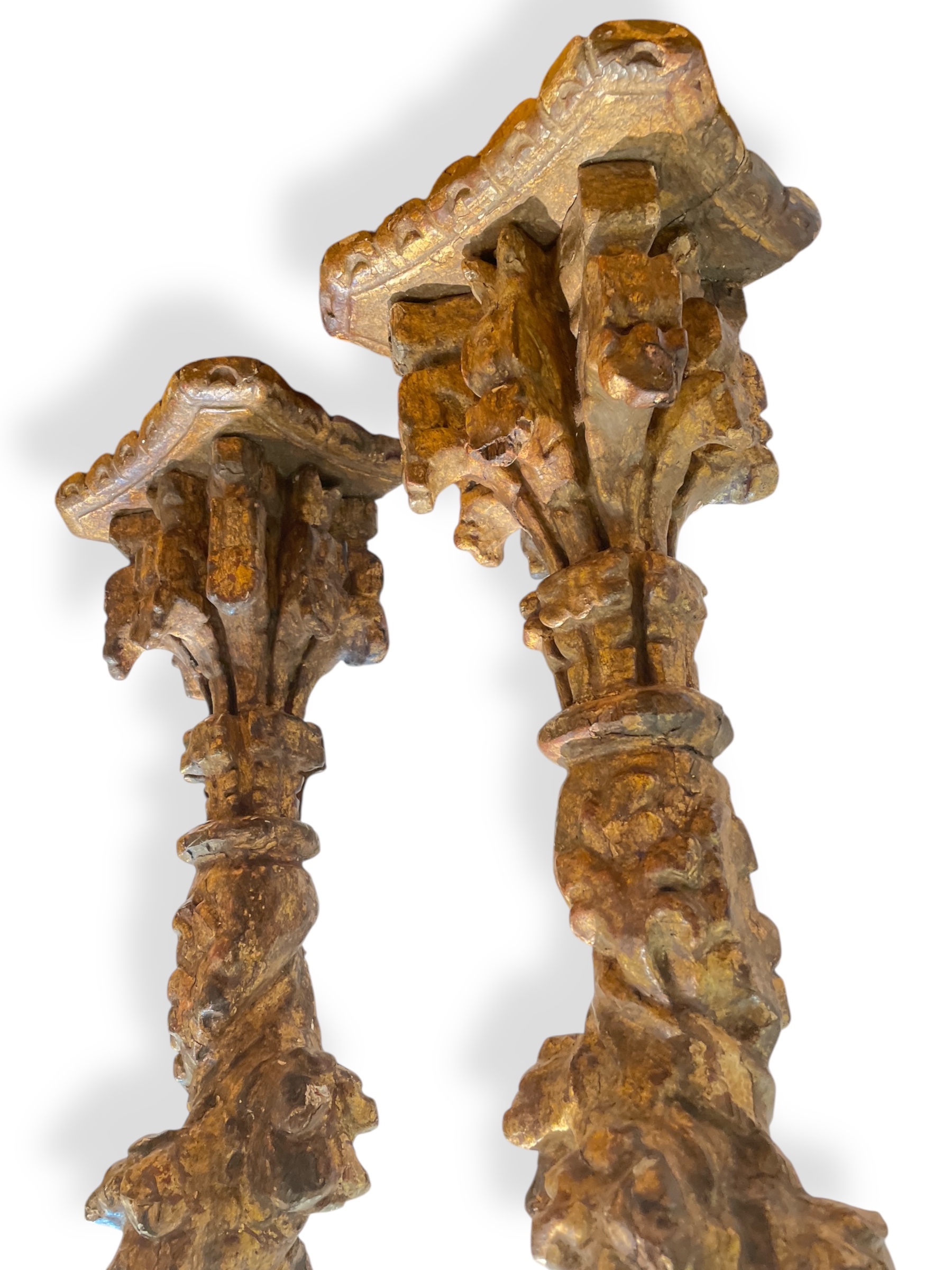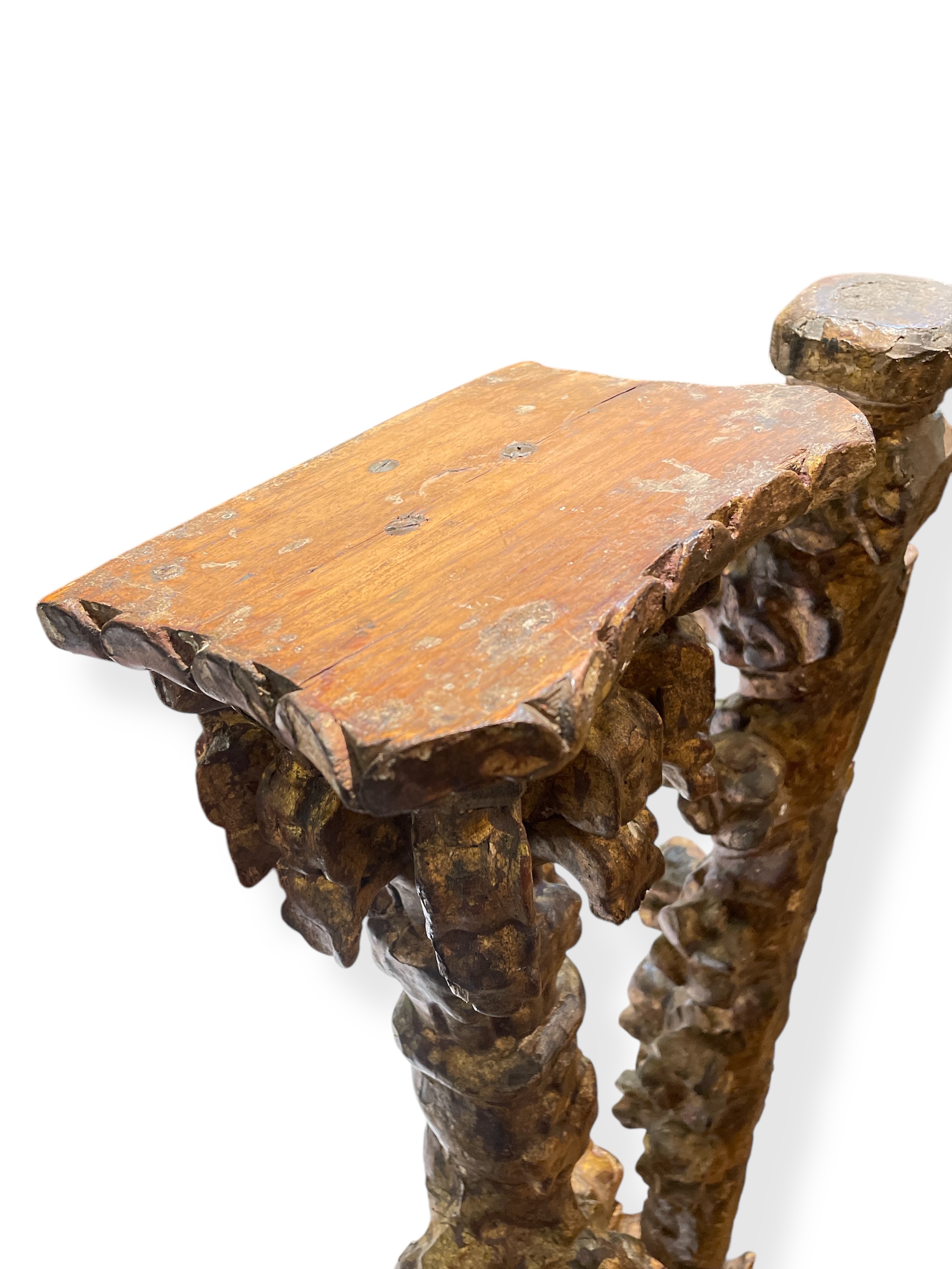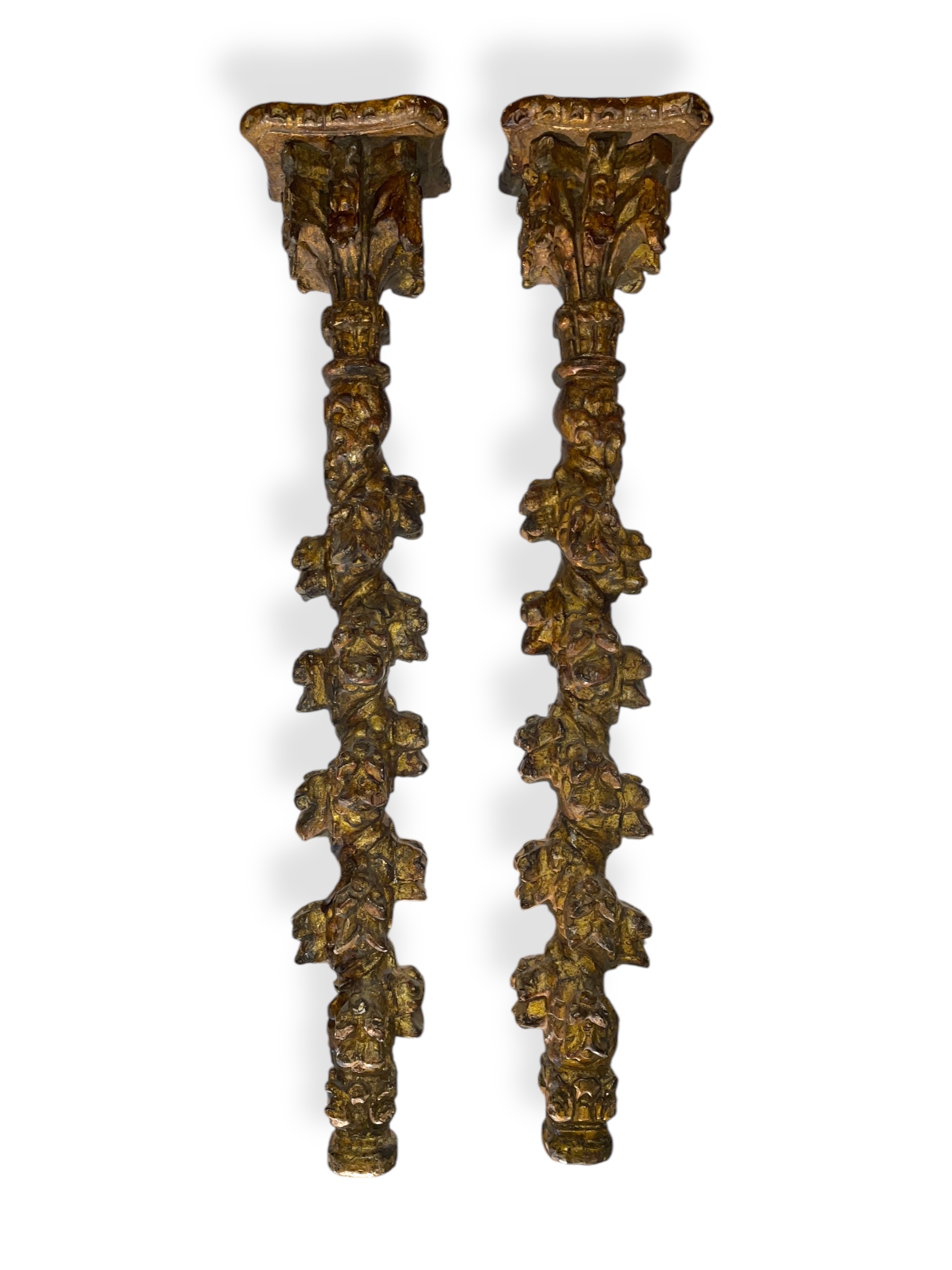 Pair of carved late 17th C wall brackets w/ long carved "tails". (Top shelf is from a later date and probably a replacement.)