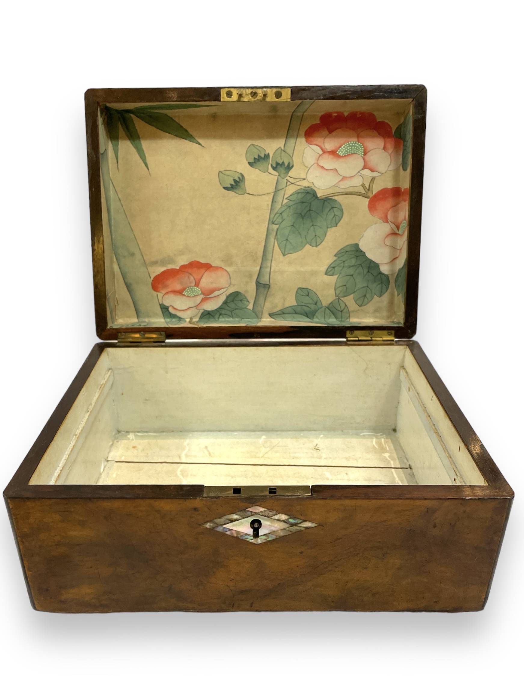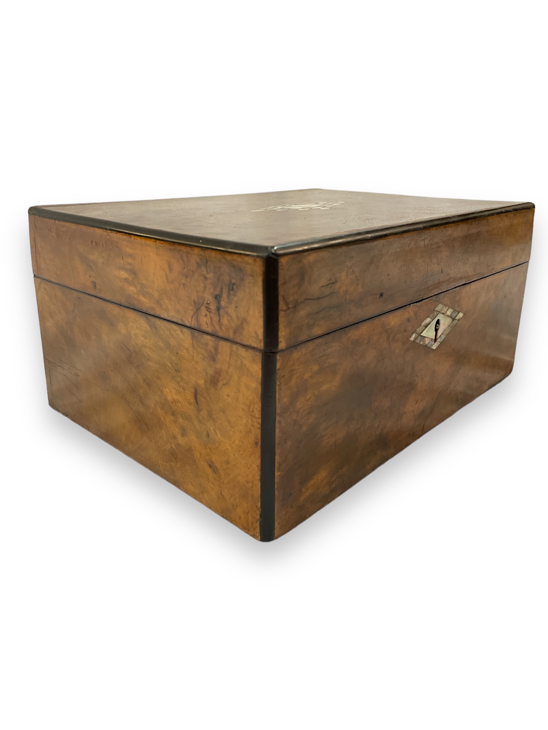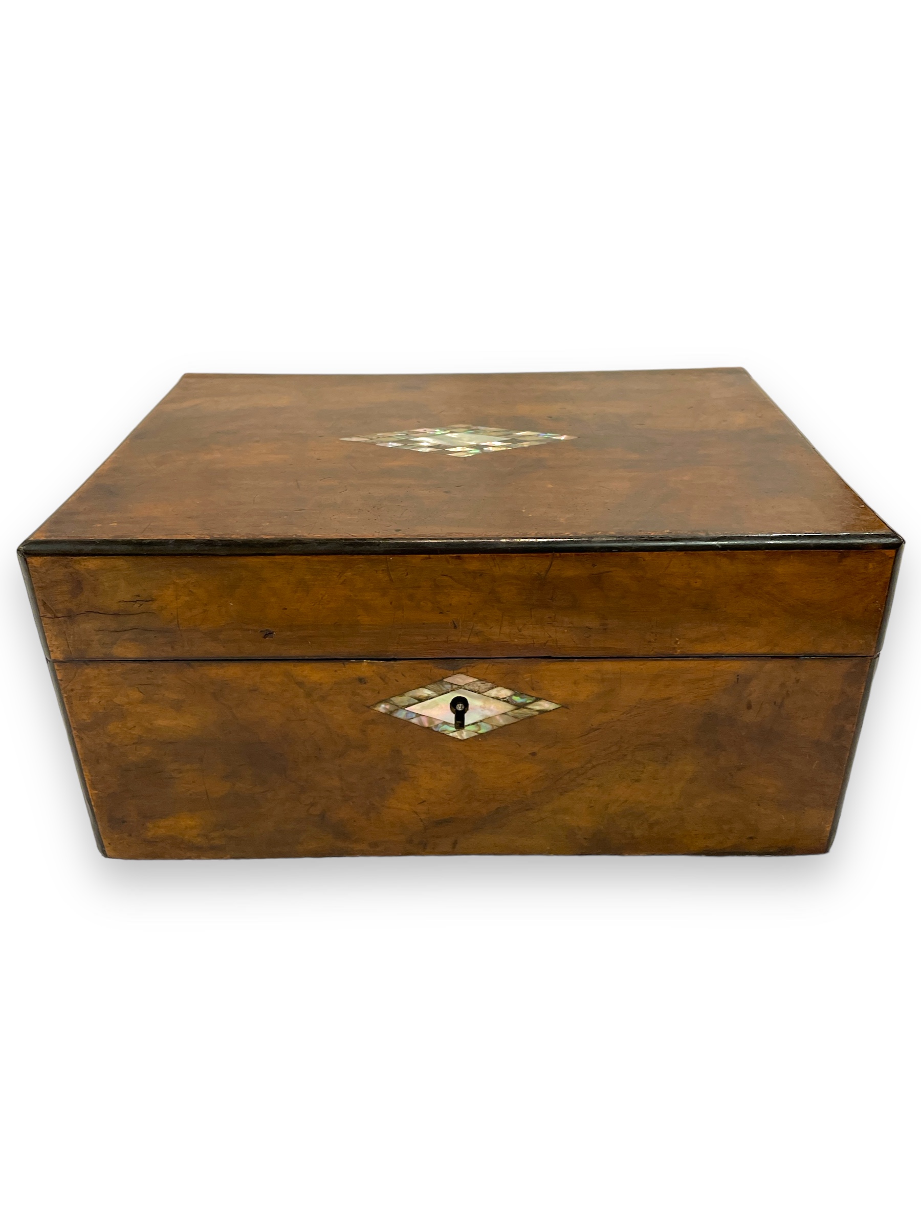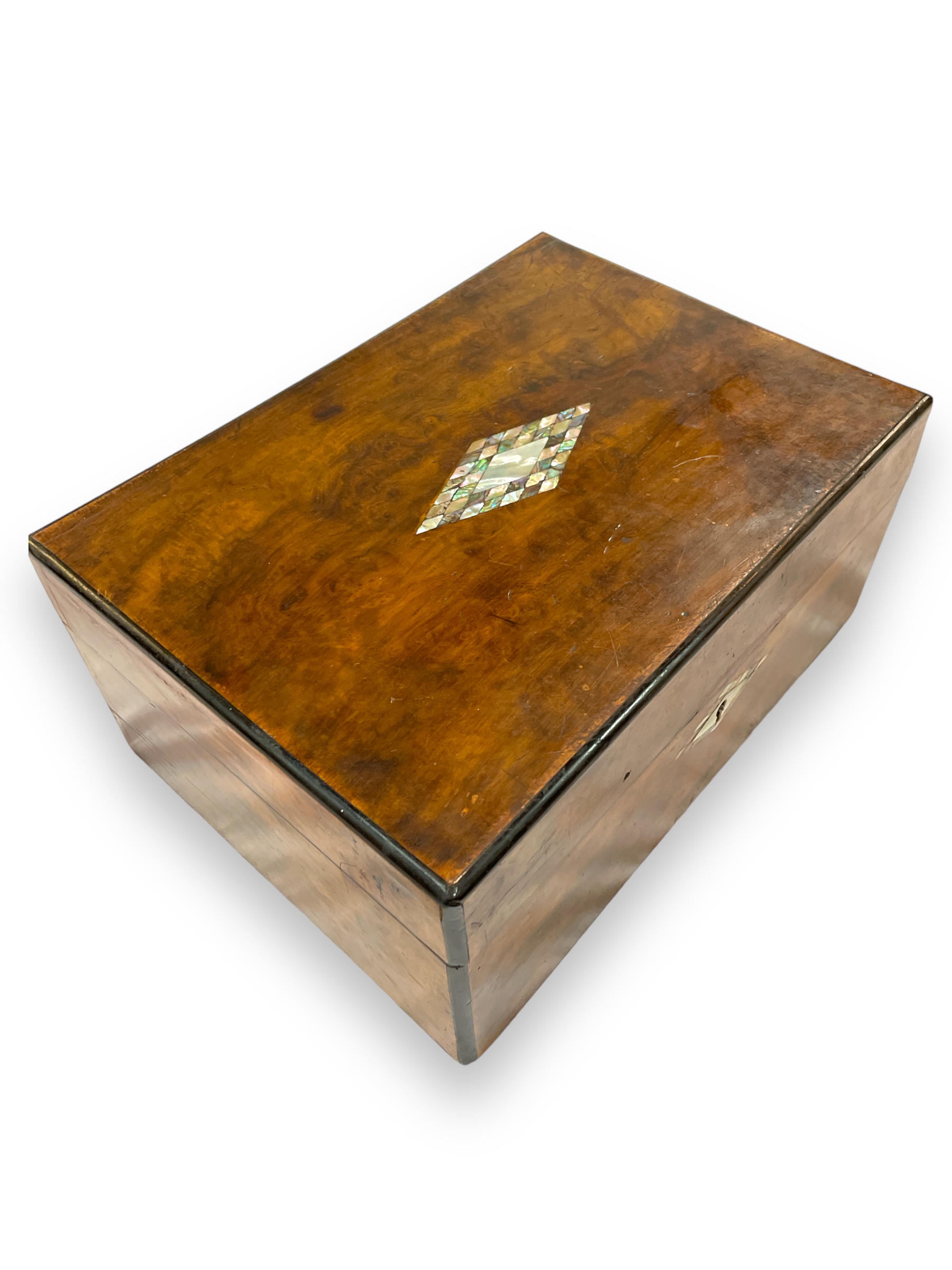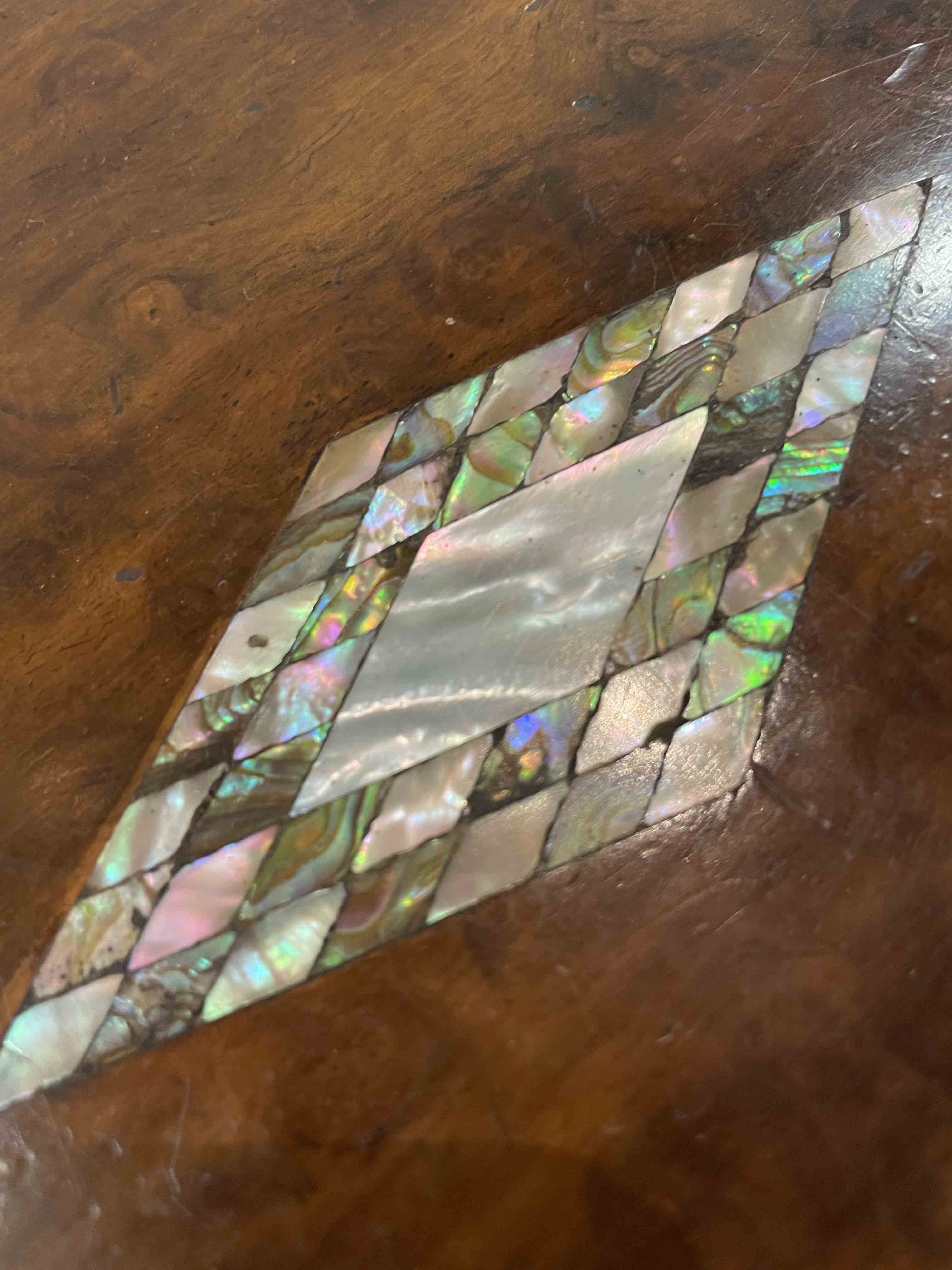 19th C English wooden box w/ abalone diamond design inset.
