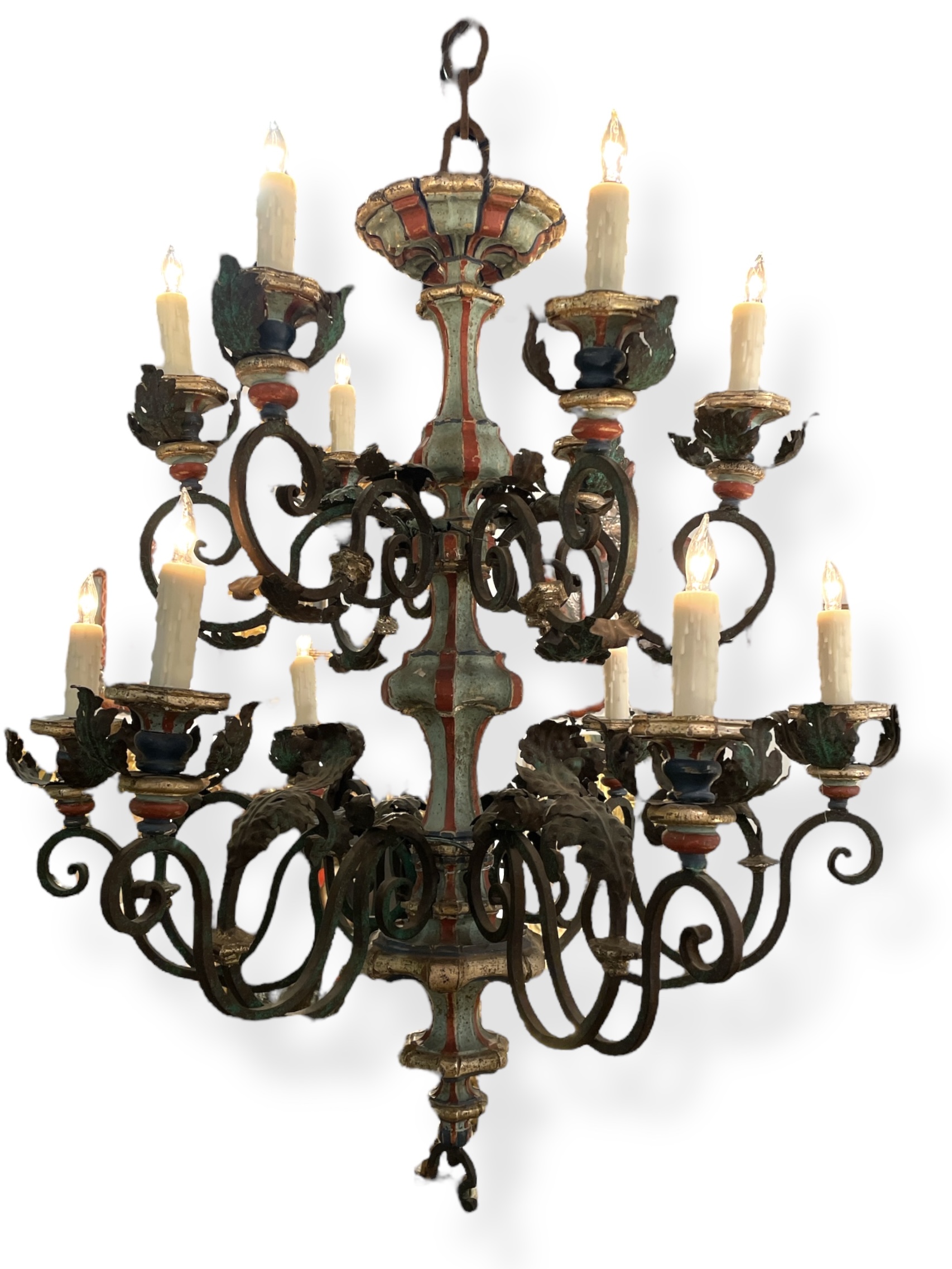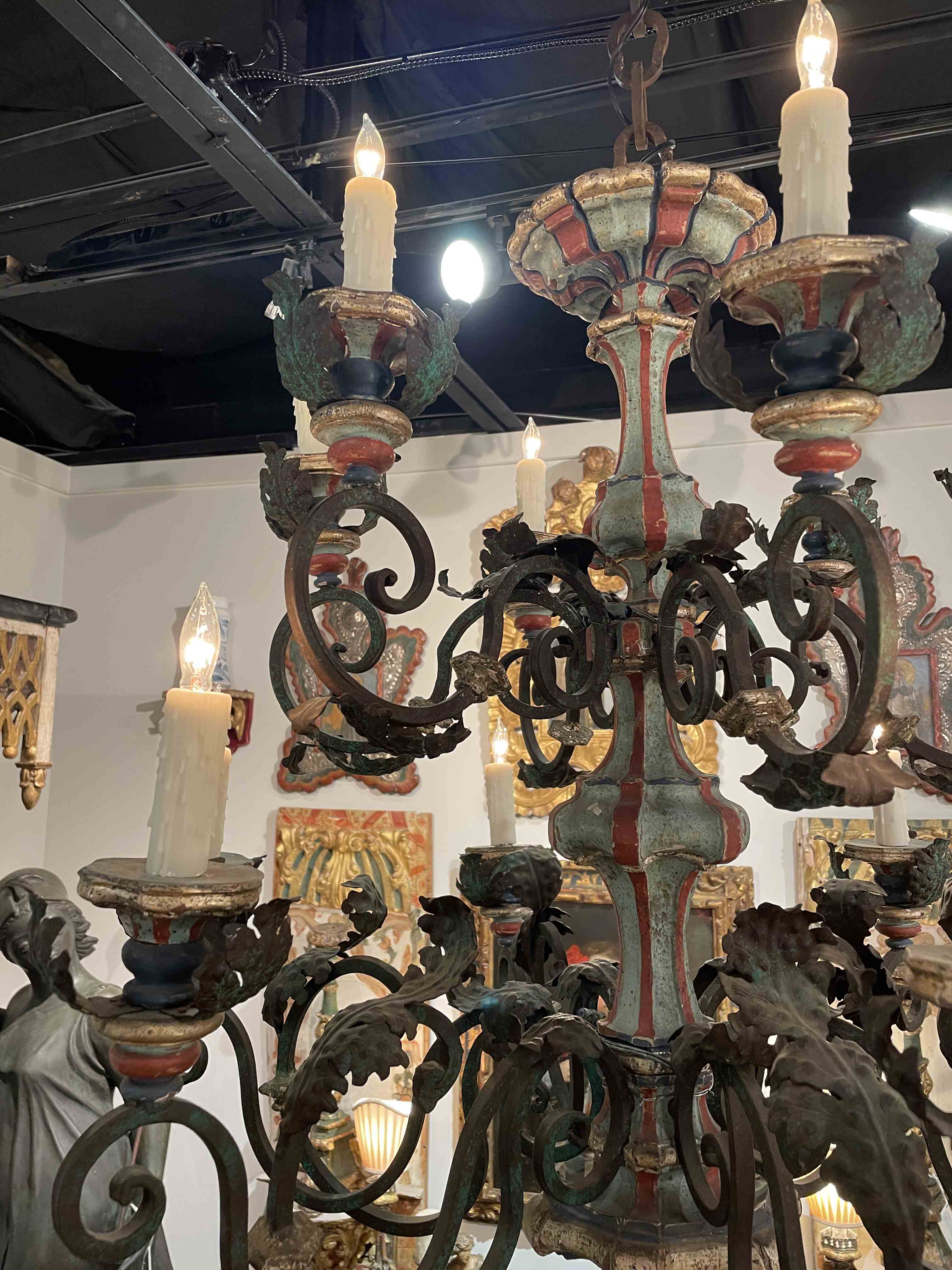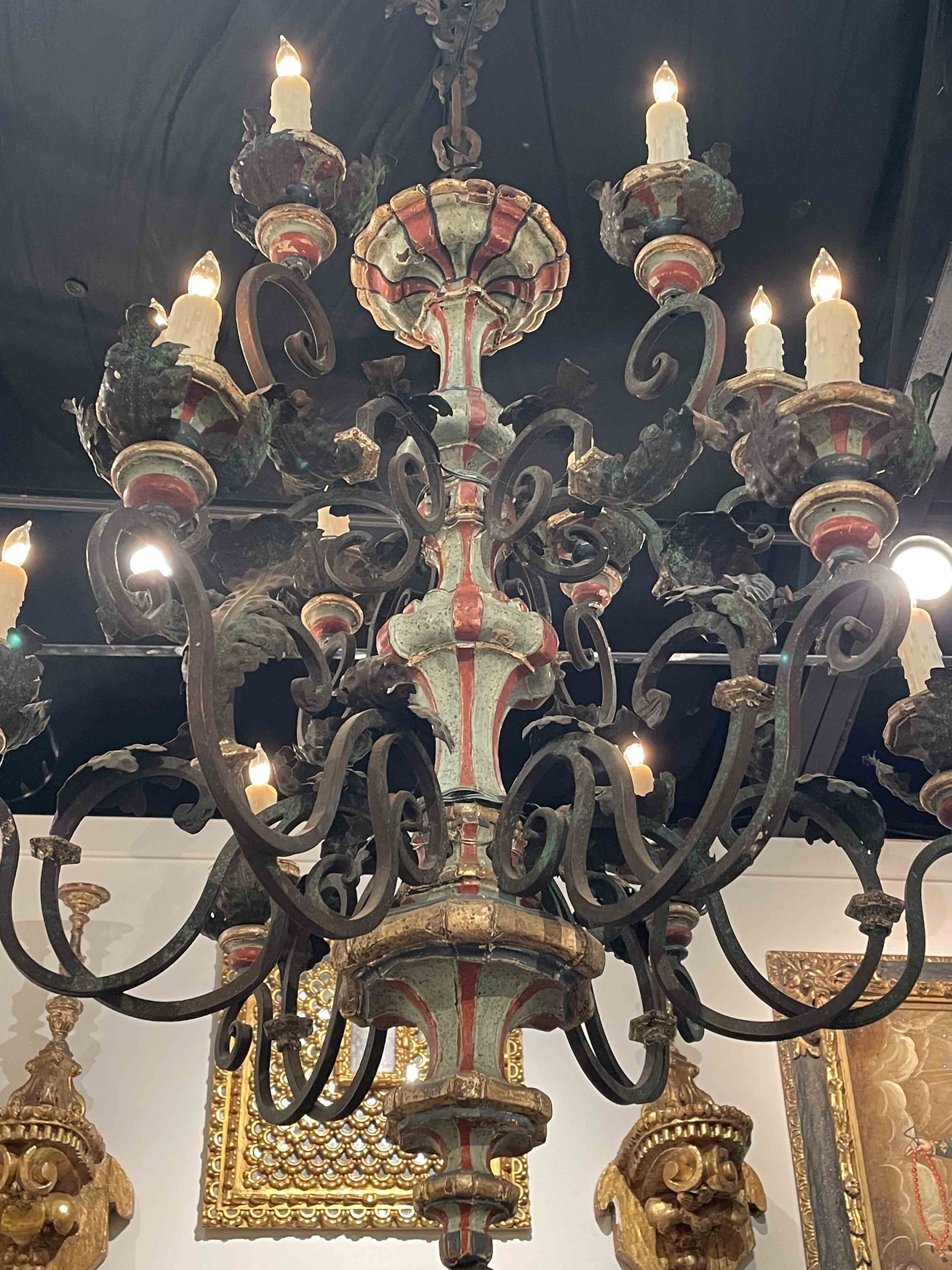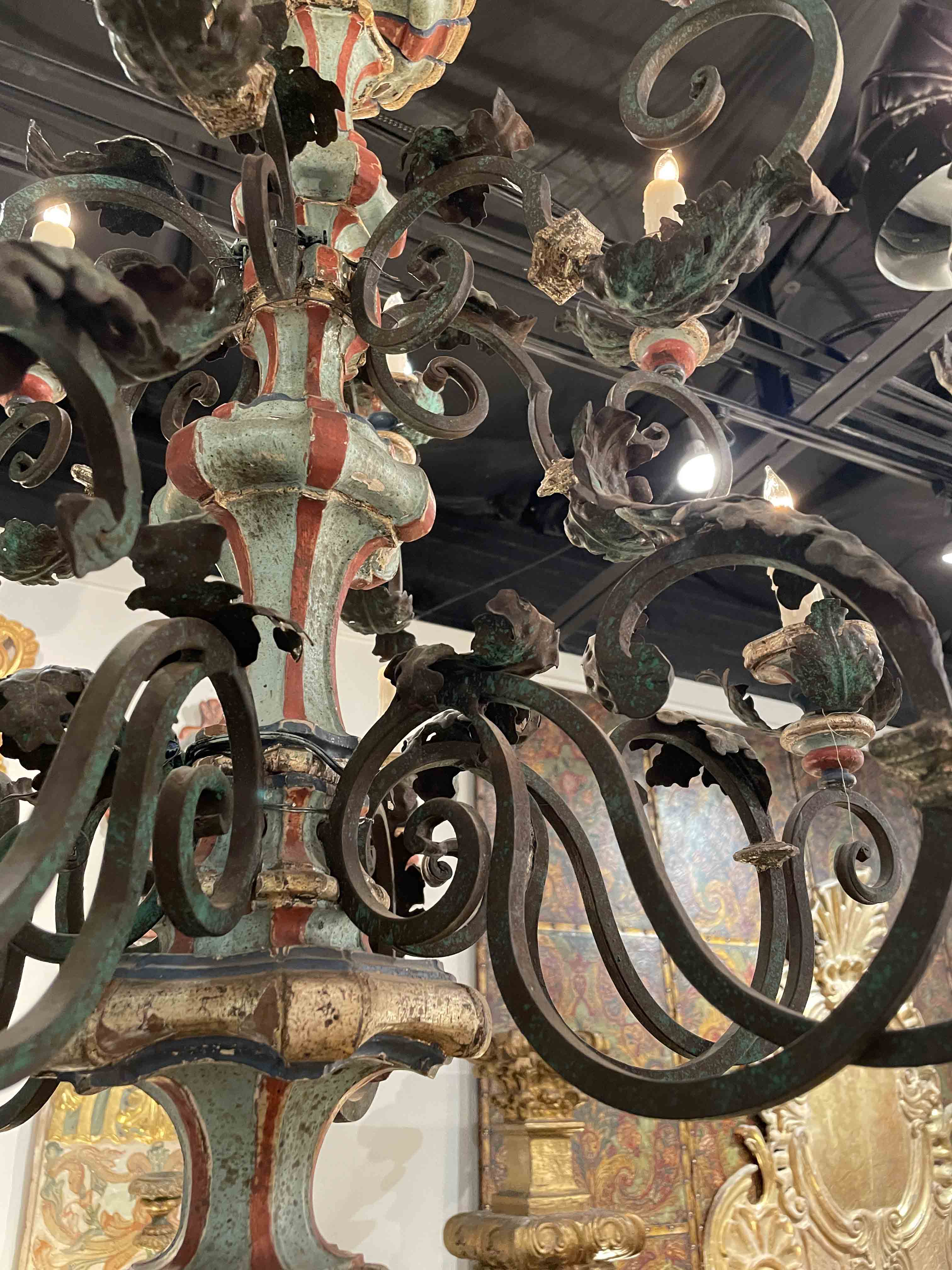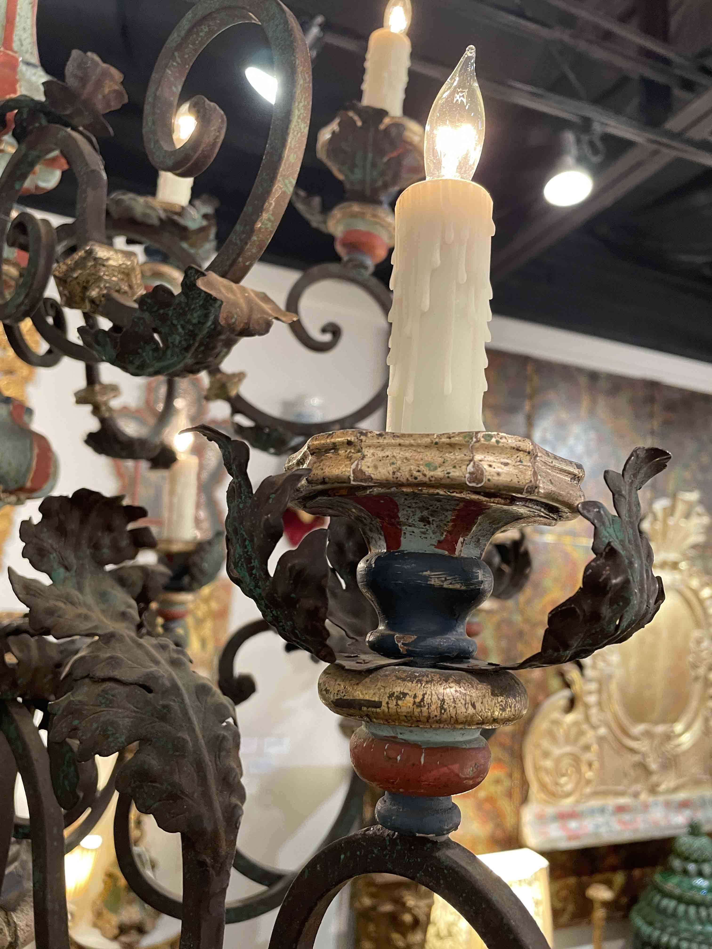 Early 20th C painted (striped) wood & iron Tuscan chandelier, rewired for USA current.