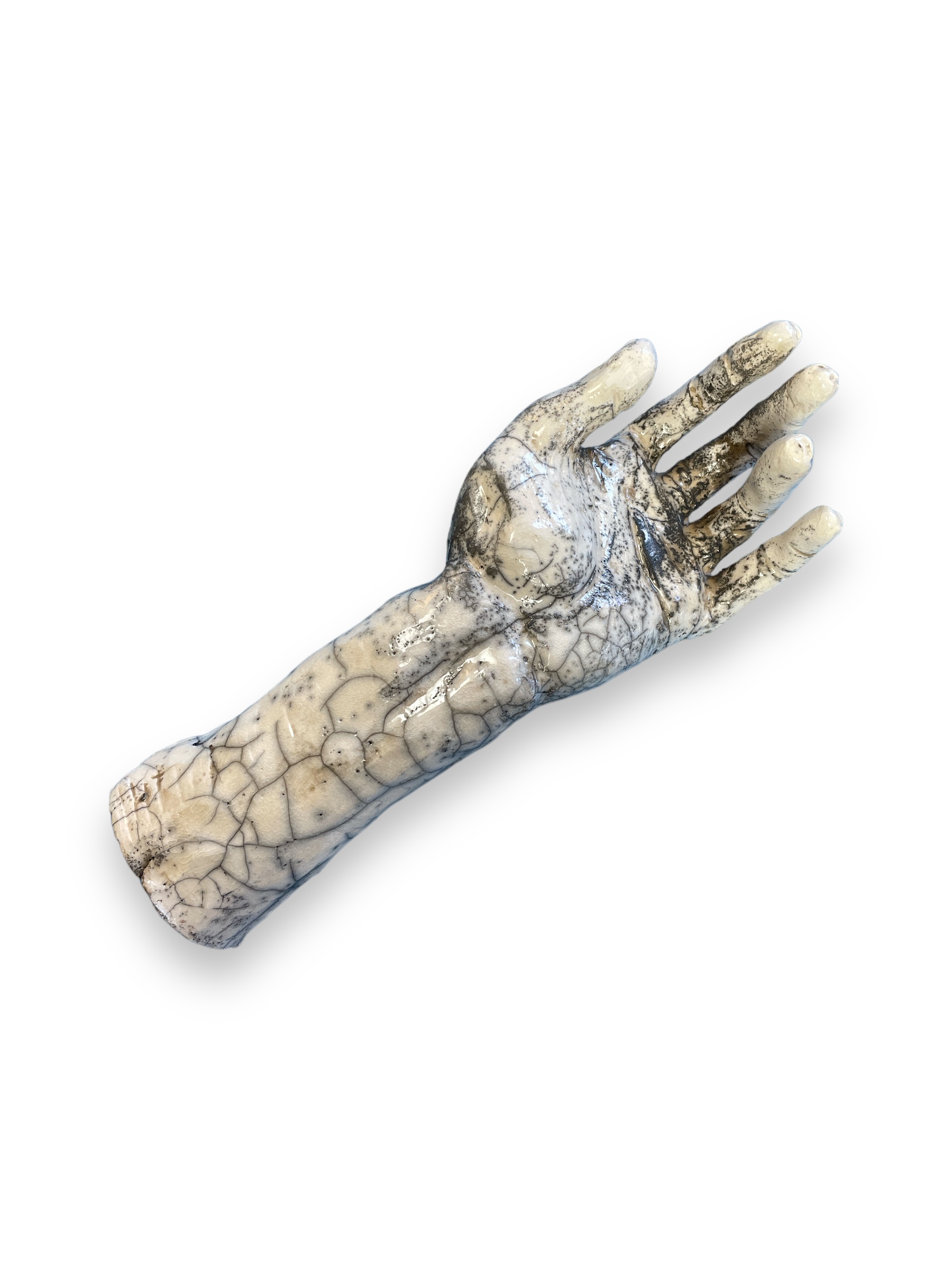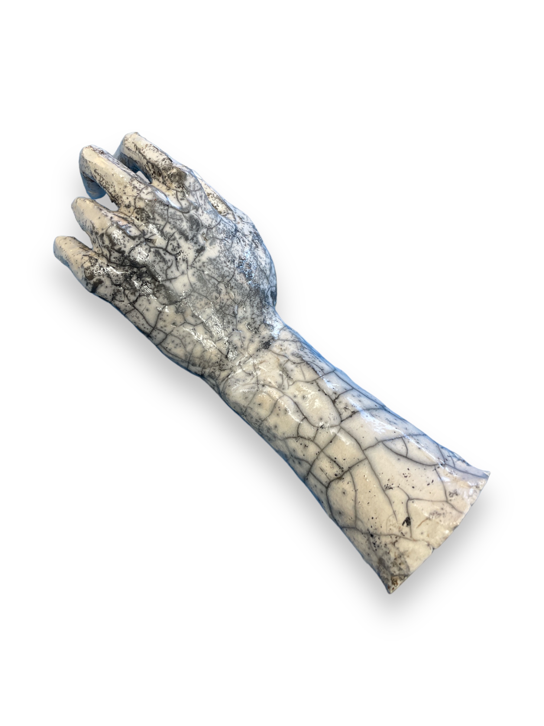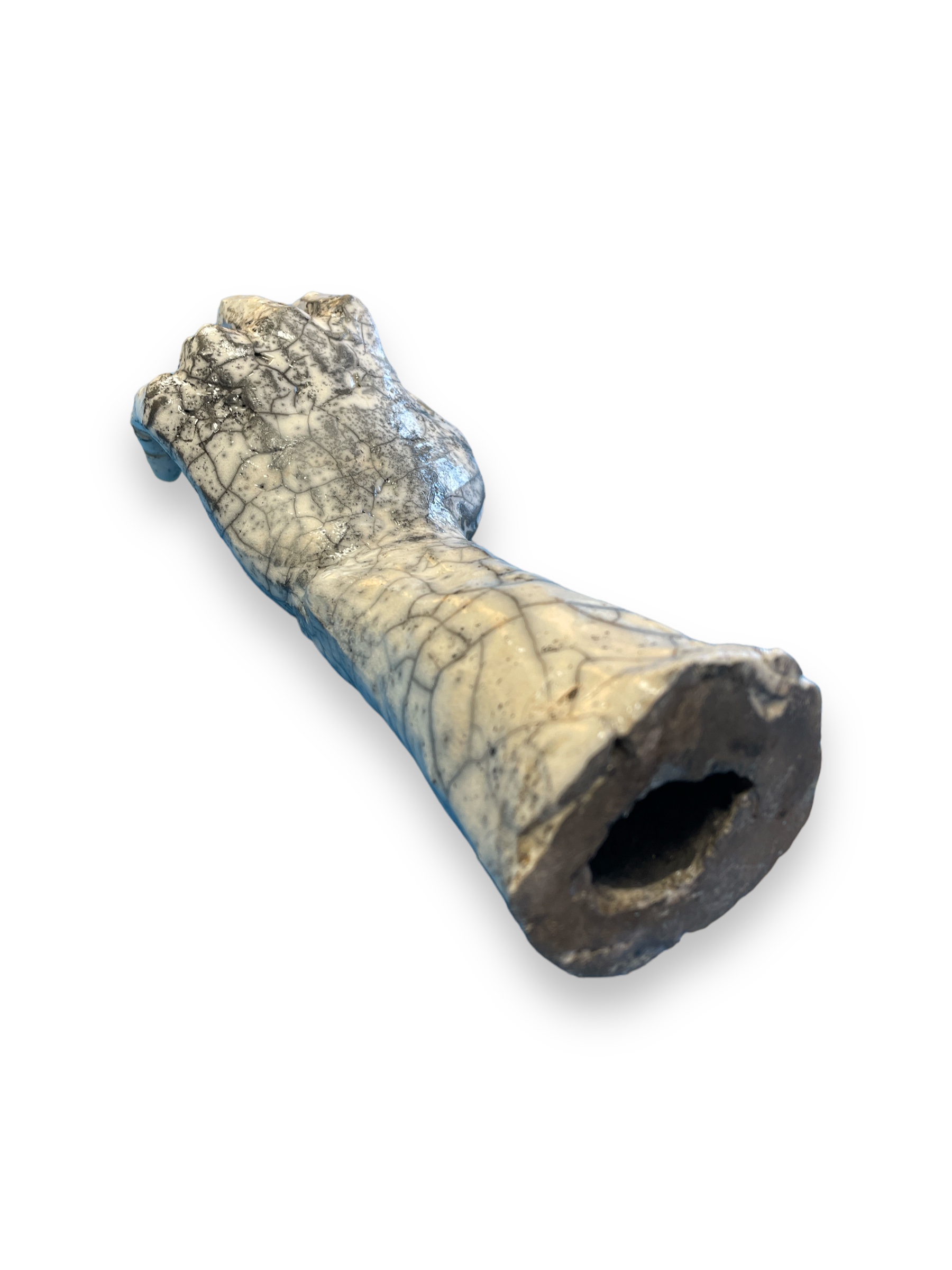 Italian 20th C Raku sculpture of a hand and forearm by artist, Marche Refim.