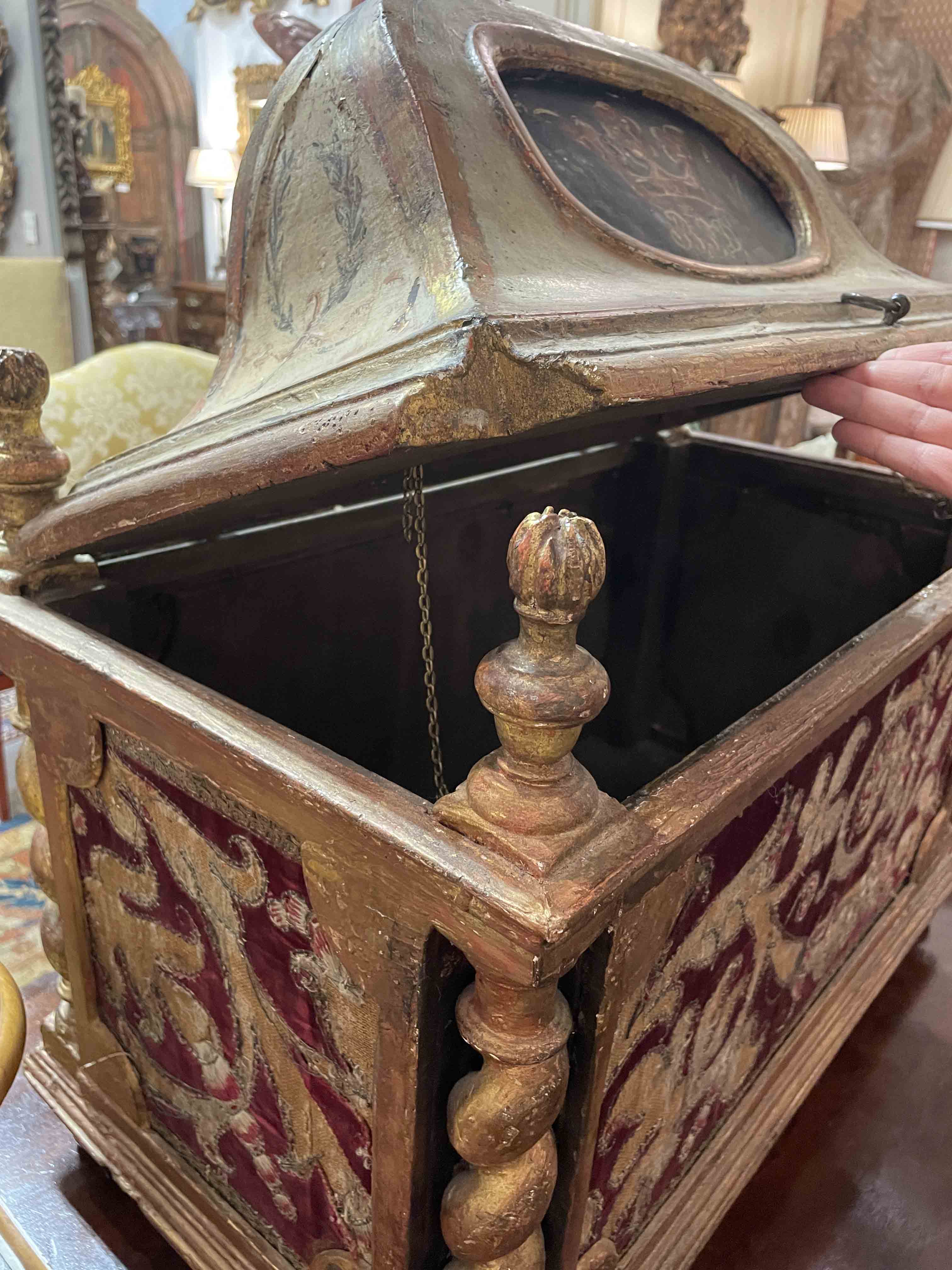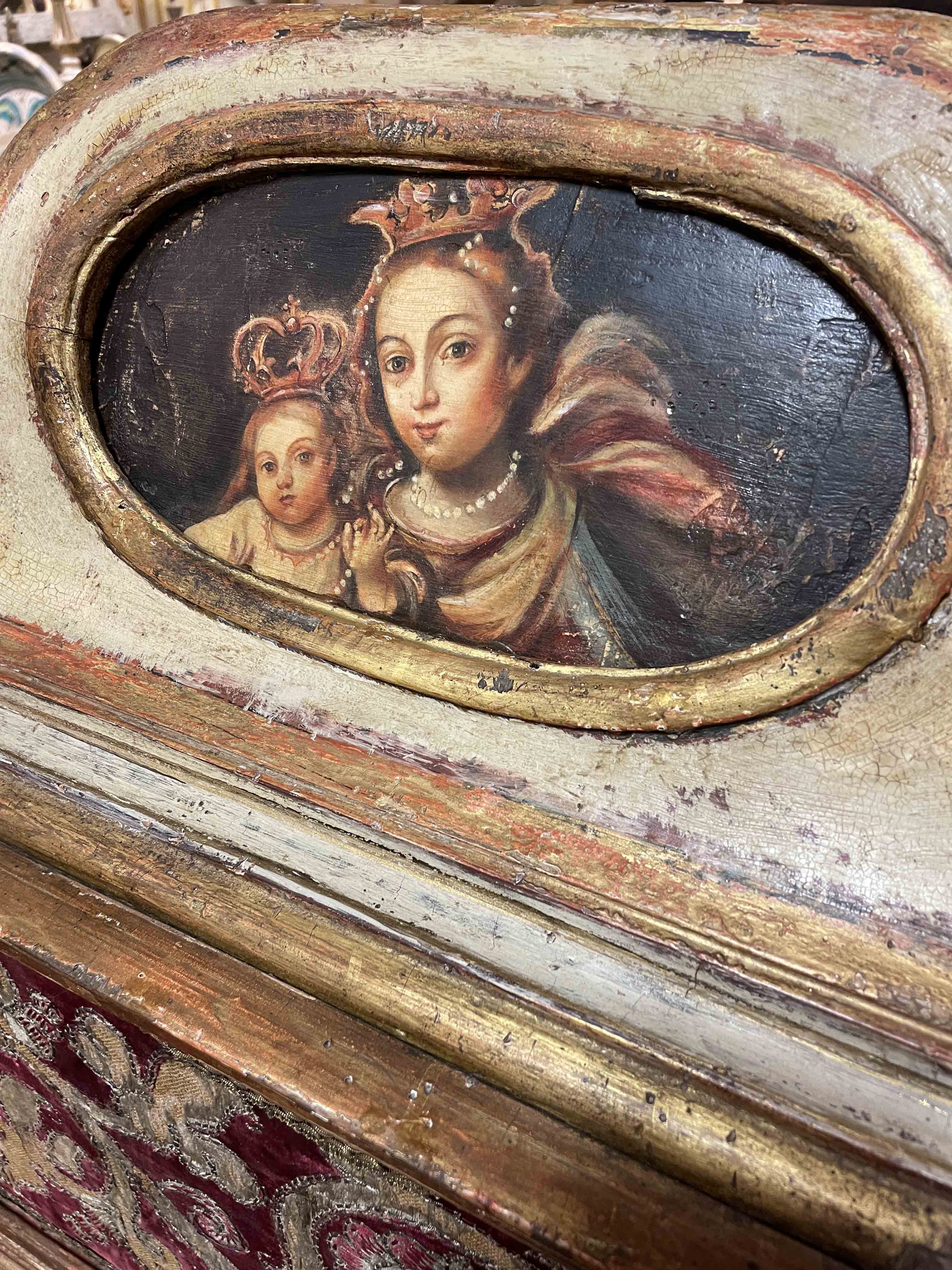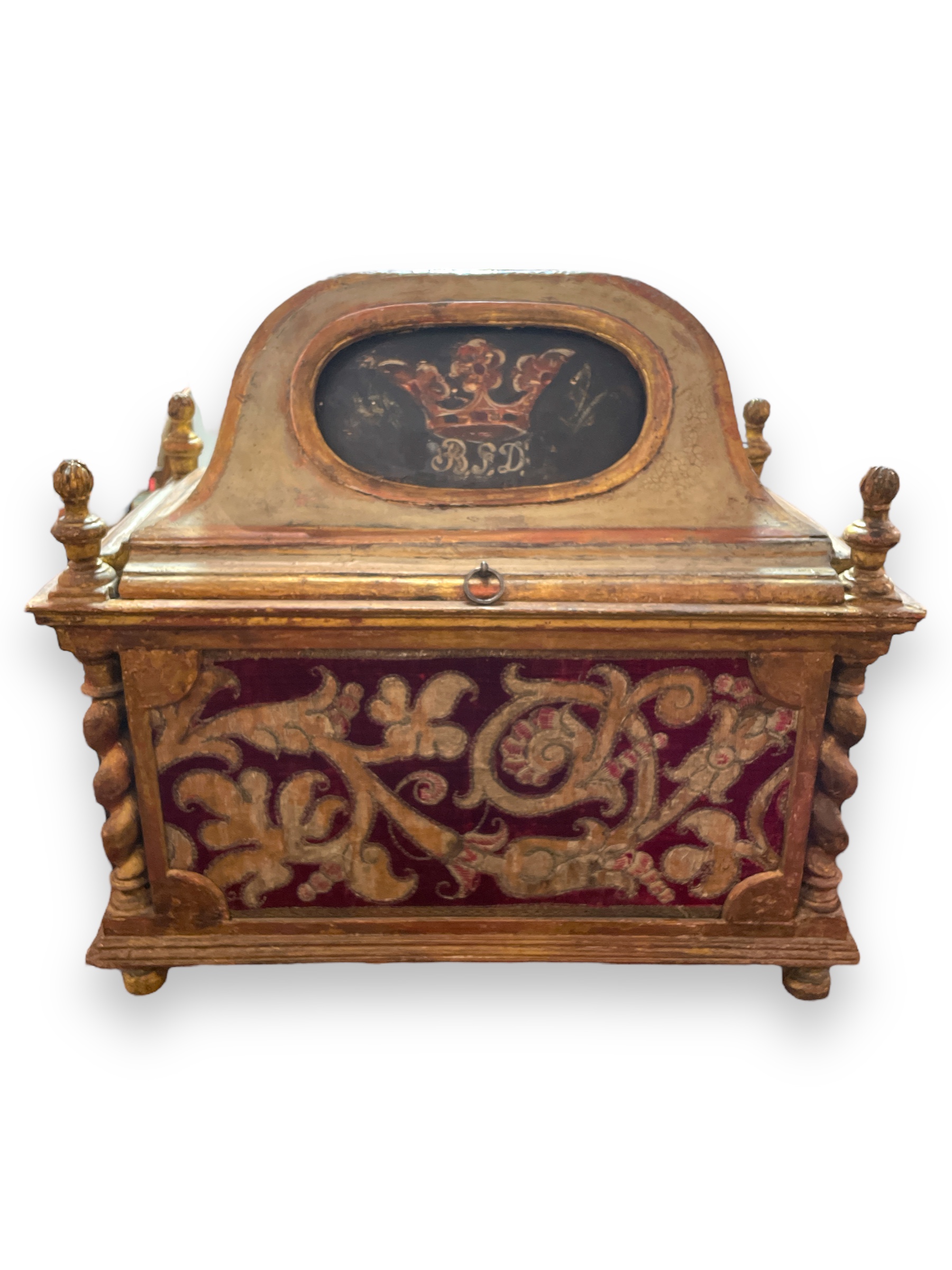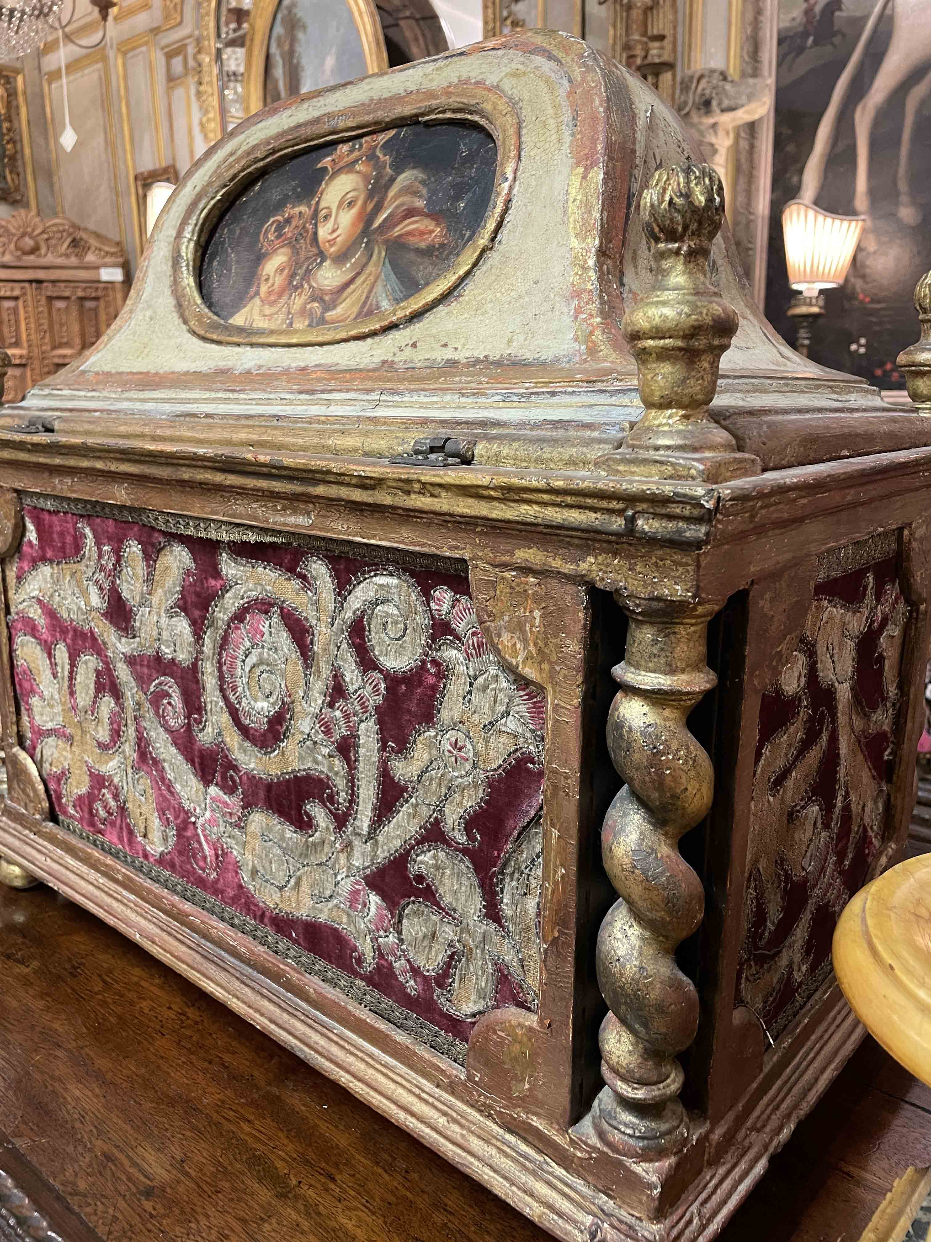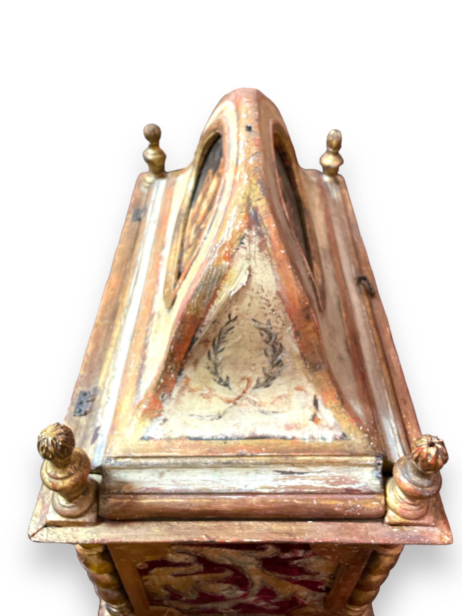 18th C large Italian polychrome reliquary w/ red velvet embroidered panels & painted cartouches.