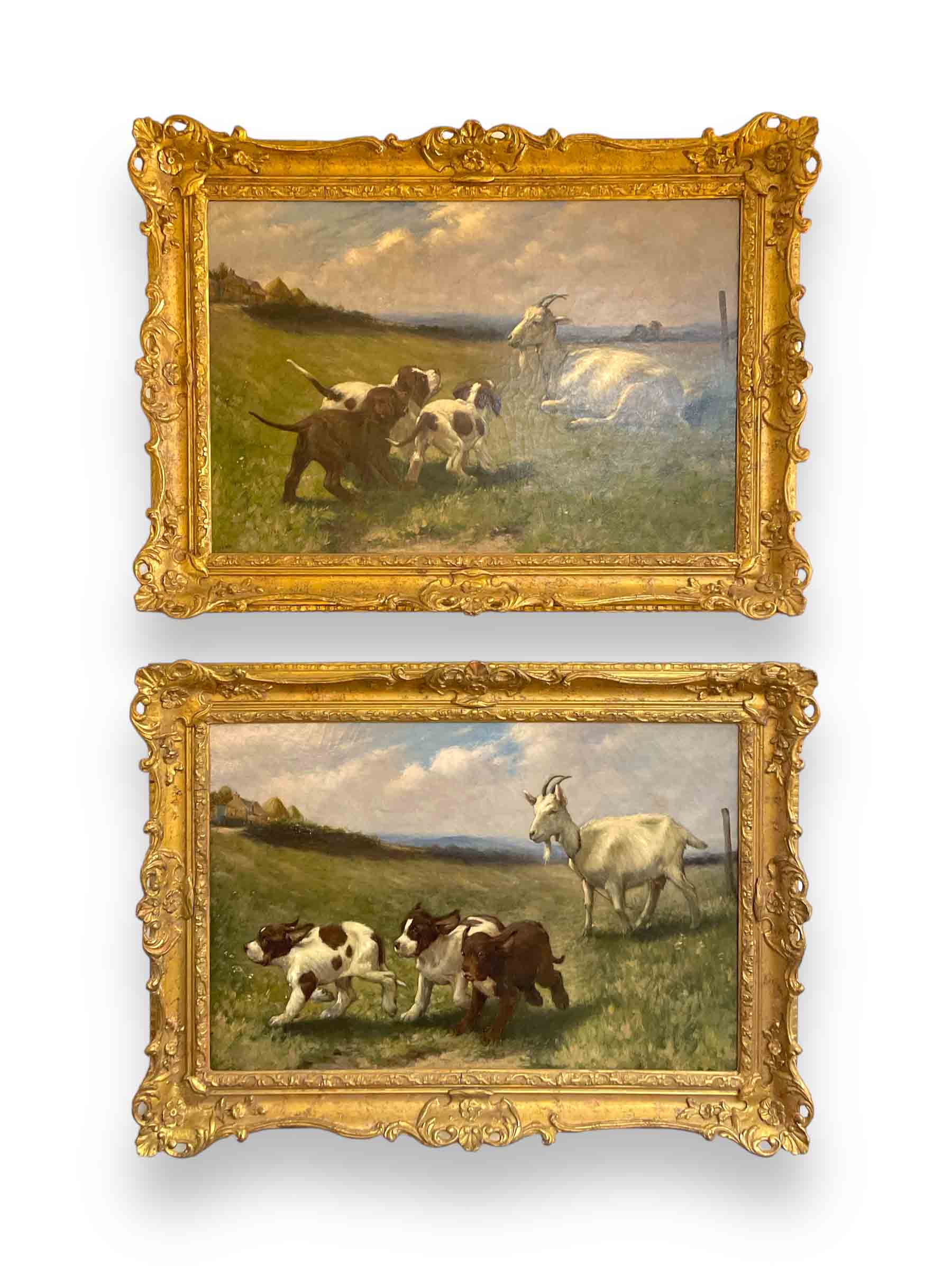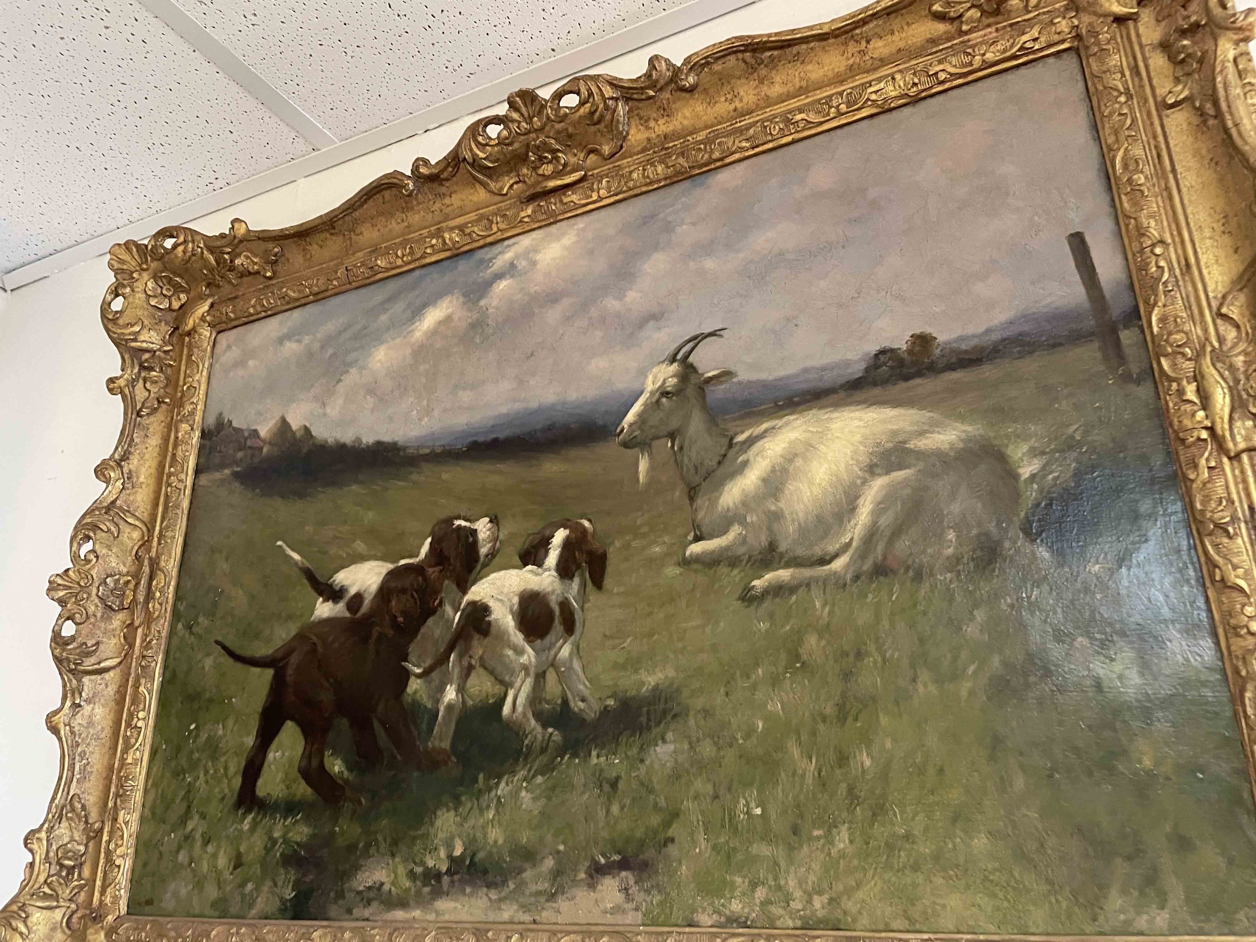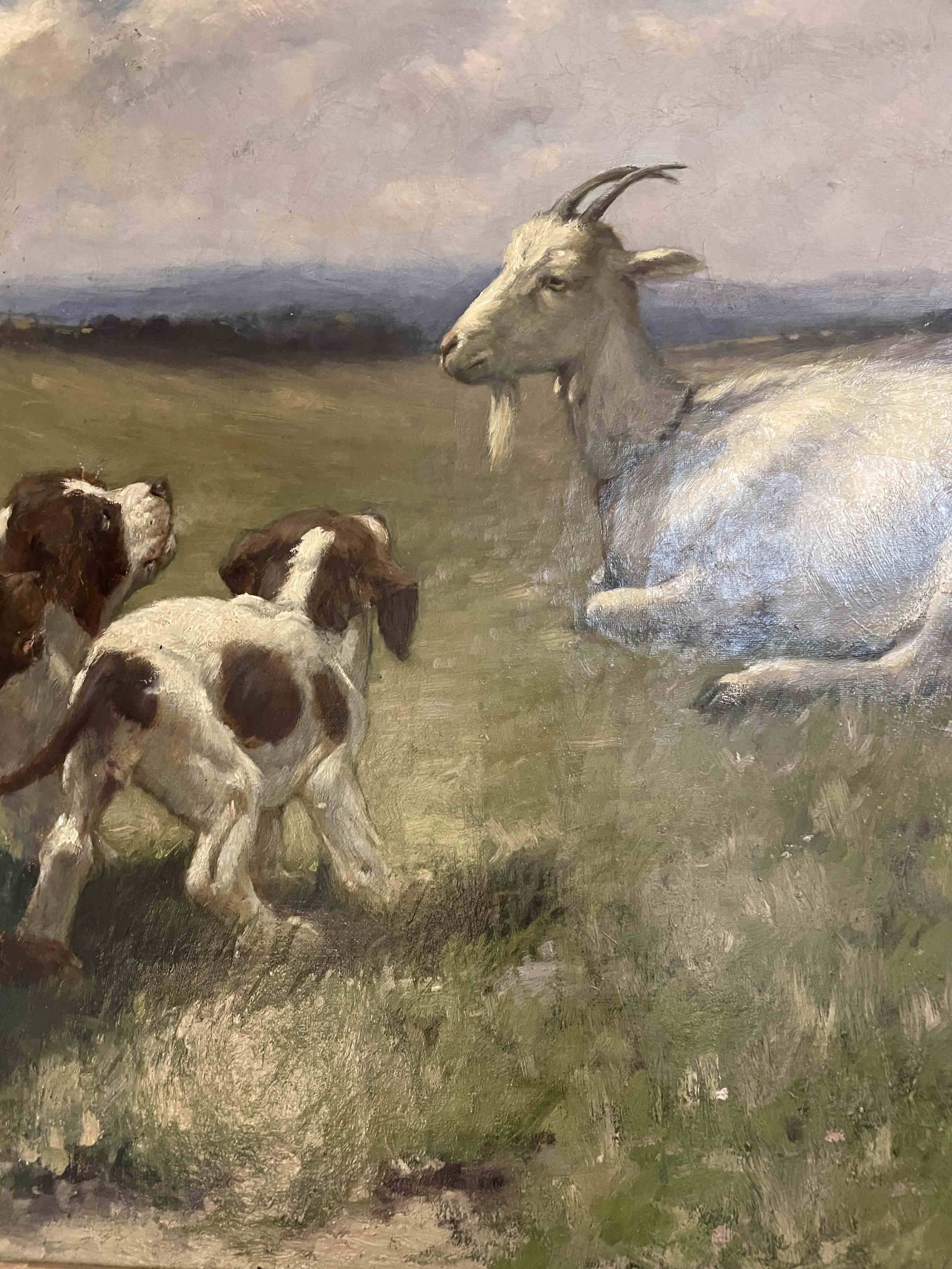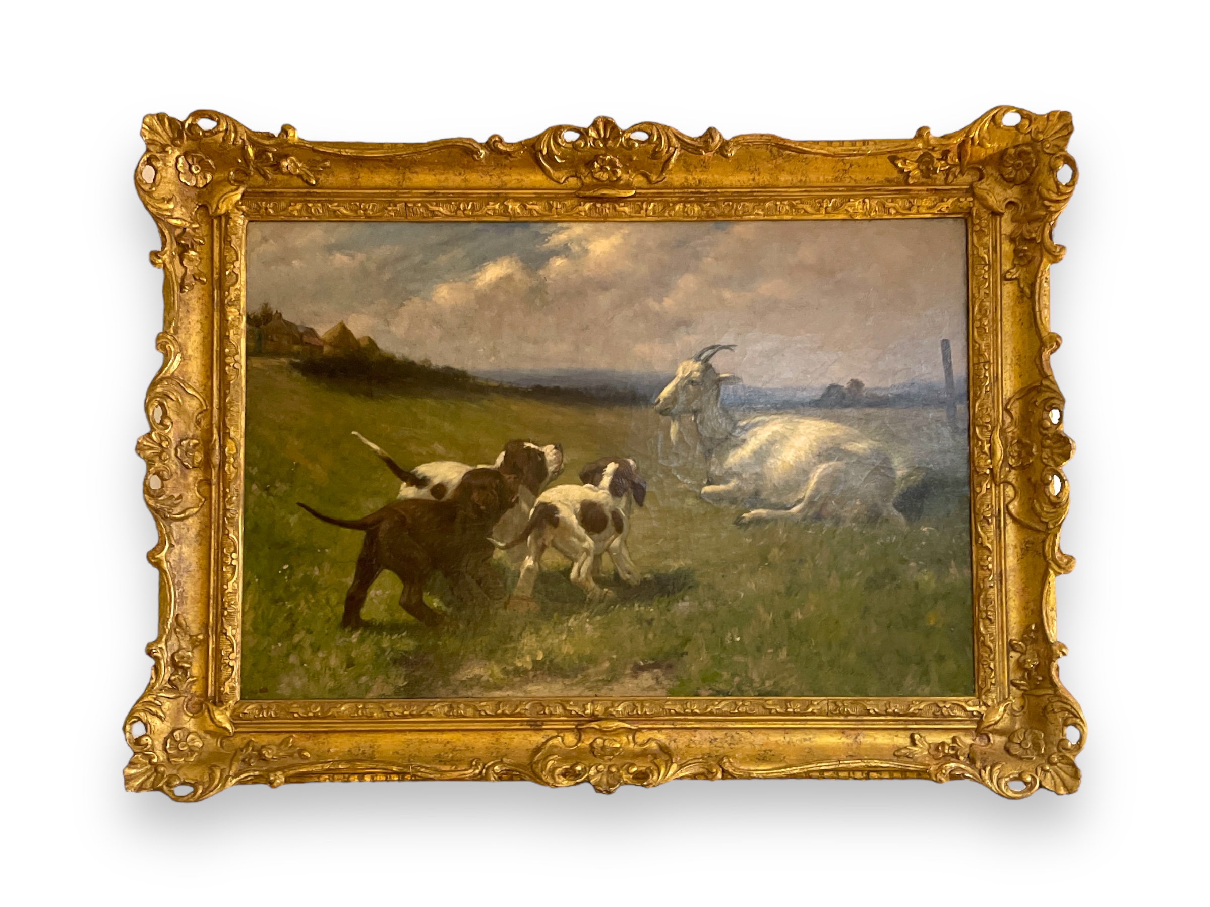 19th C oil on canvas painting of three puppies barking at a goat by William Grant Stevenson R.S.A. (British 1849-1919).