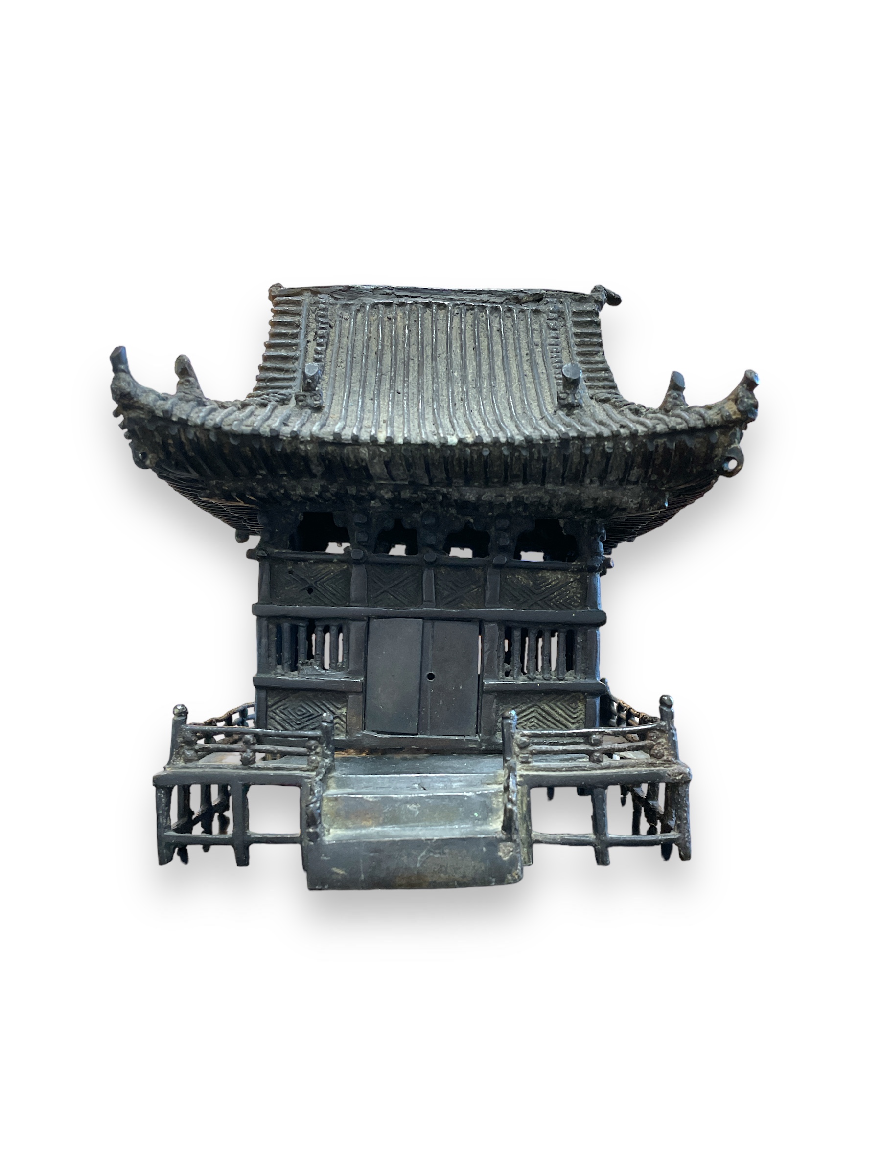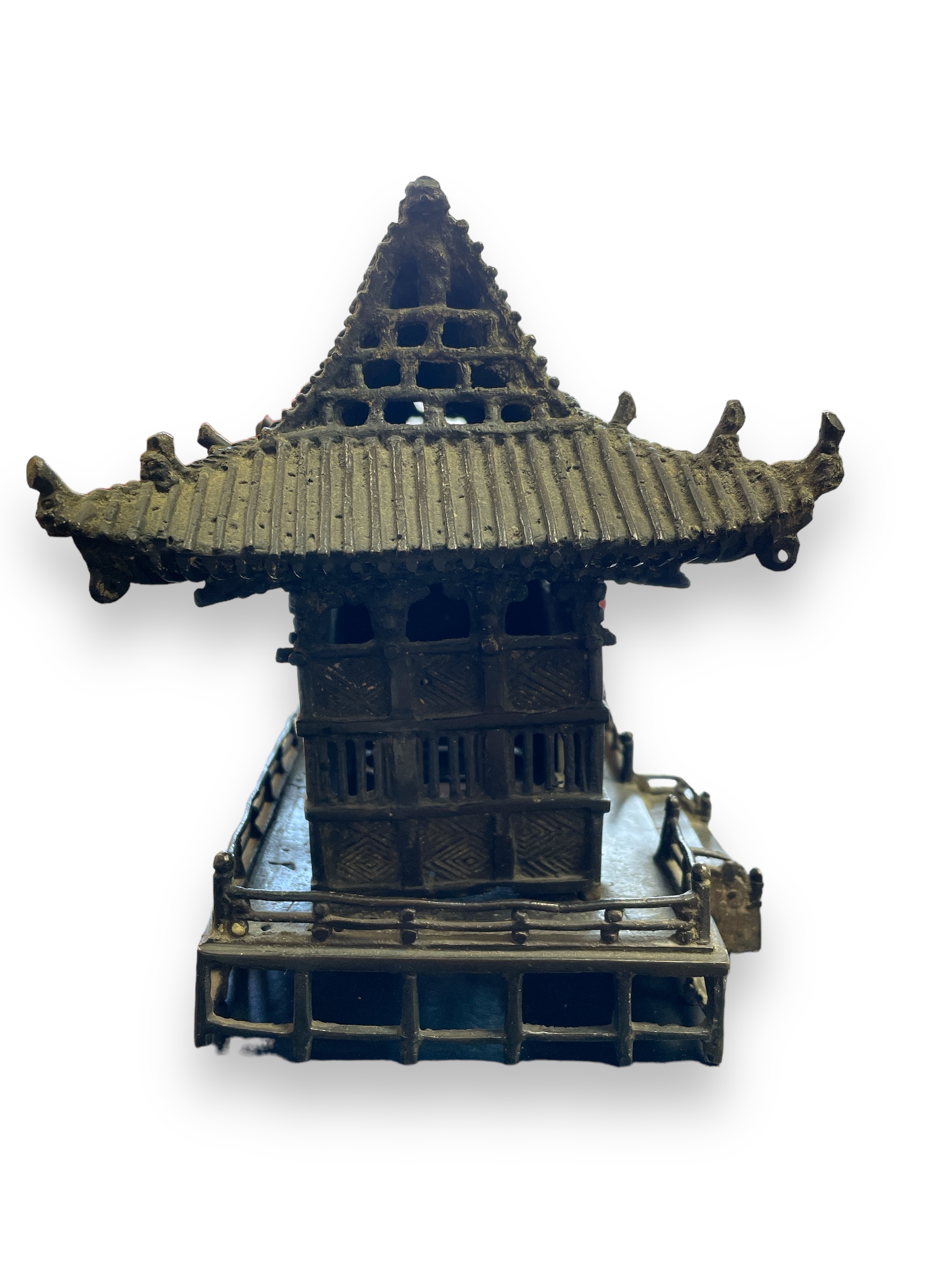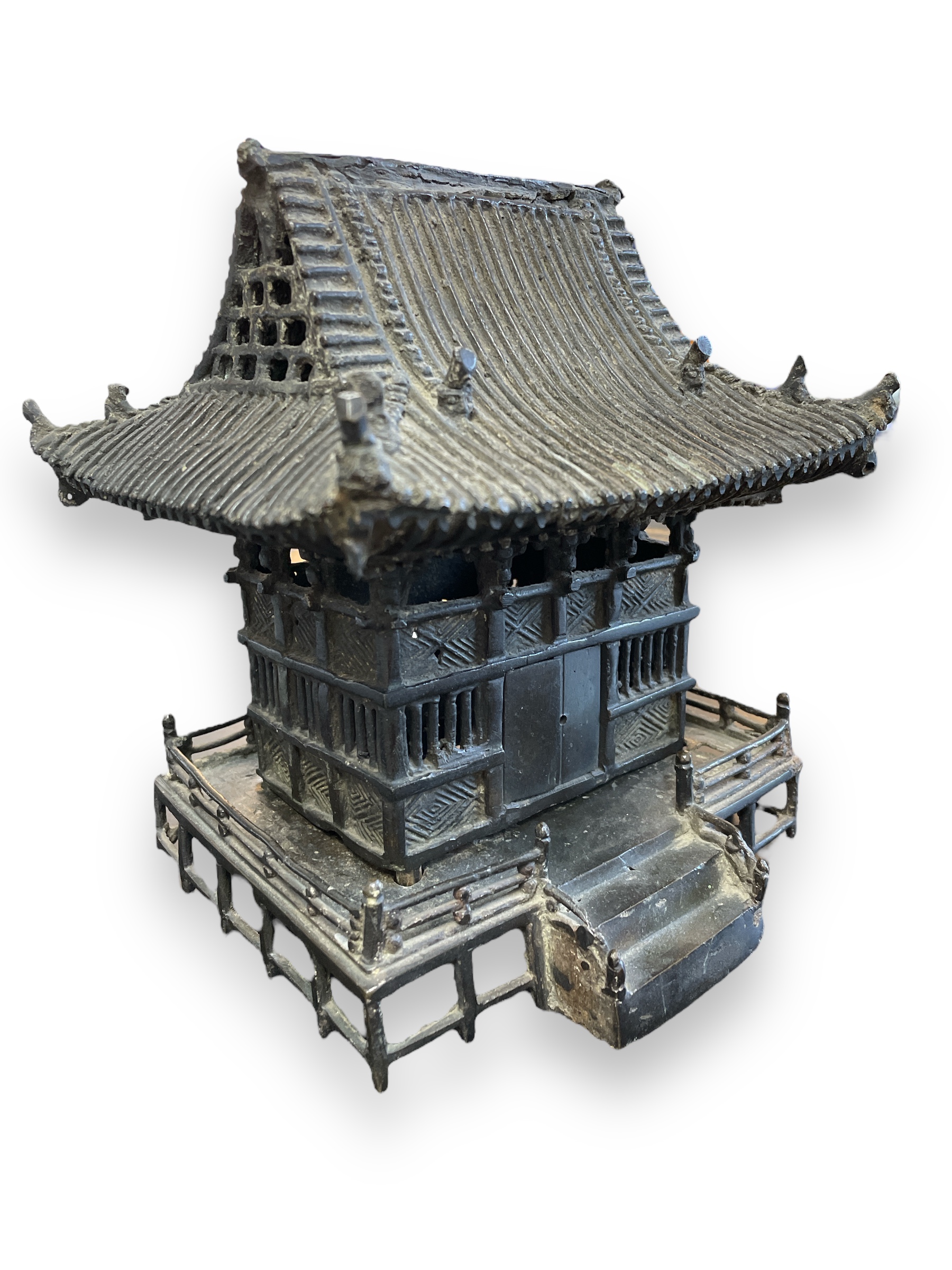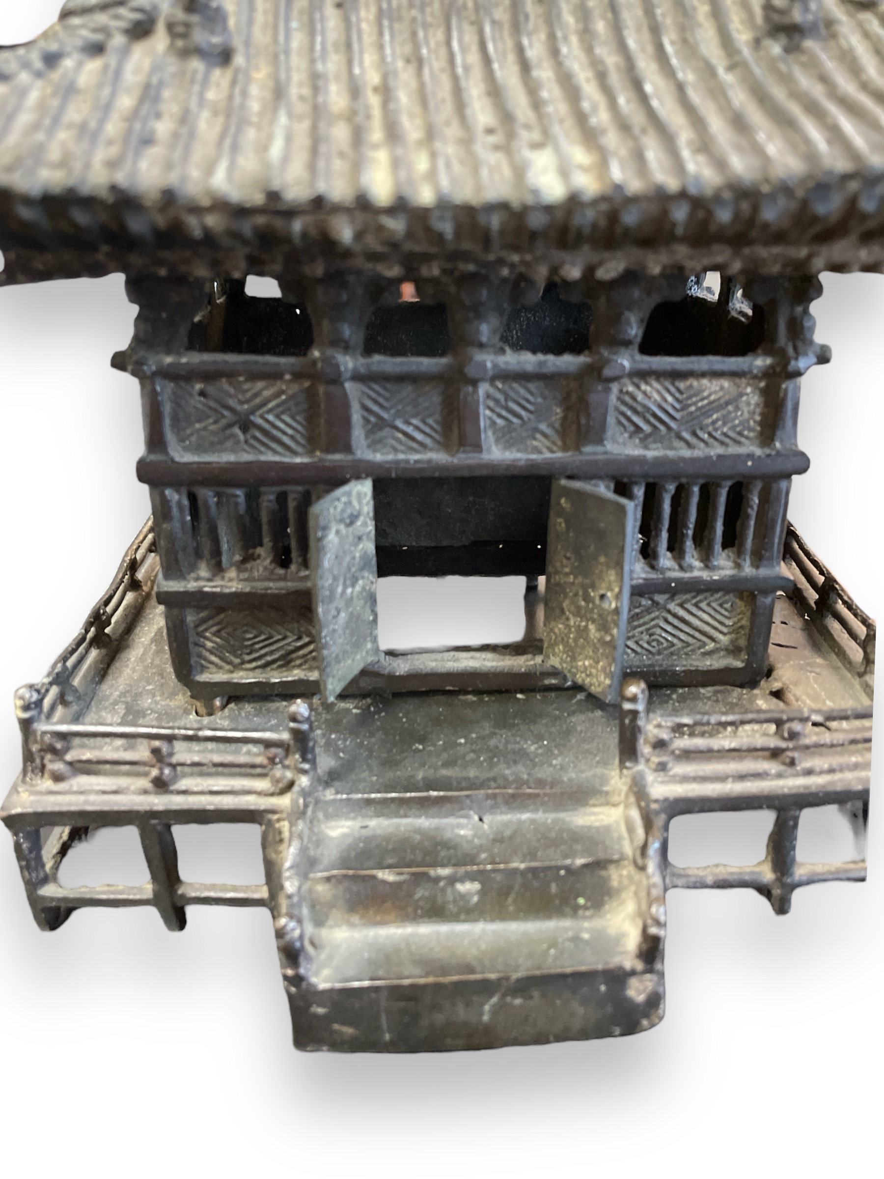 19th C cast bronze censer in the form of a pagoda (incense holder). With doors that open/close.