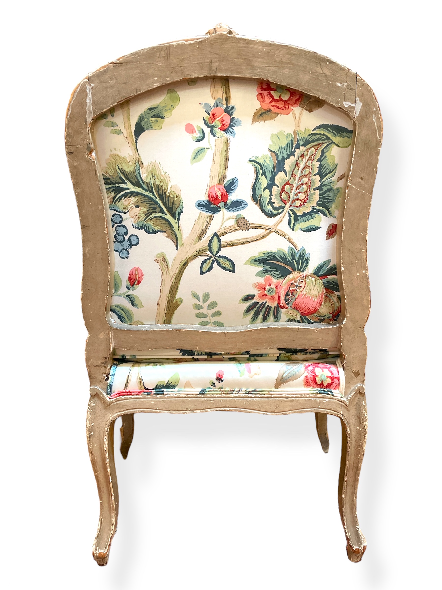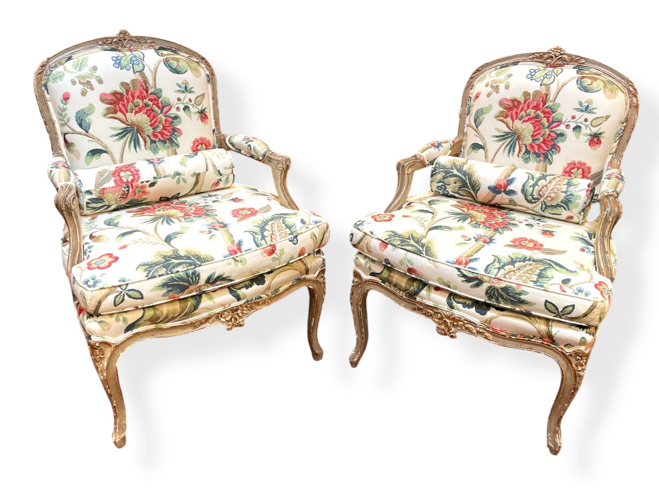 Pair of painted French fauteuils upholstered in floral fabric w/ rolled pillows.