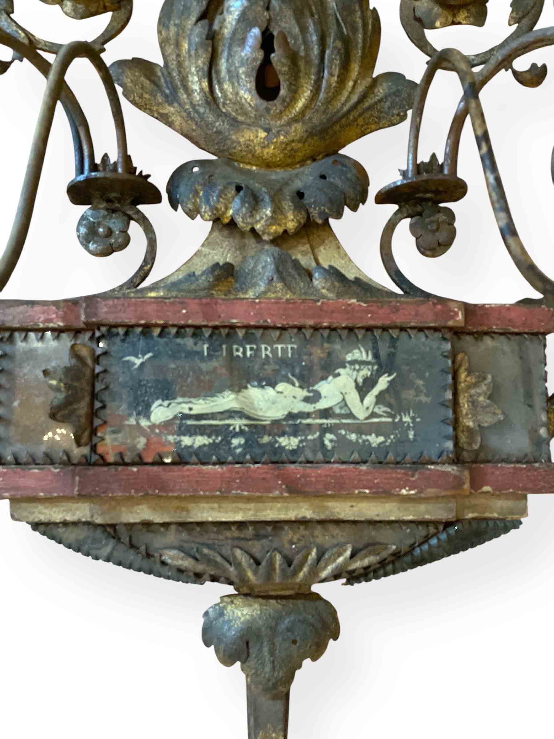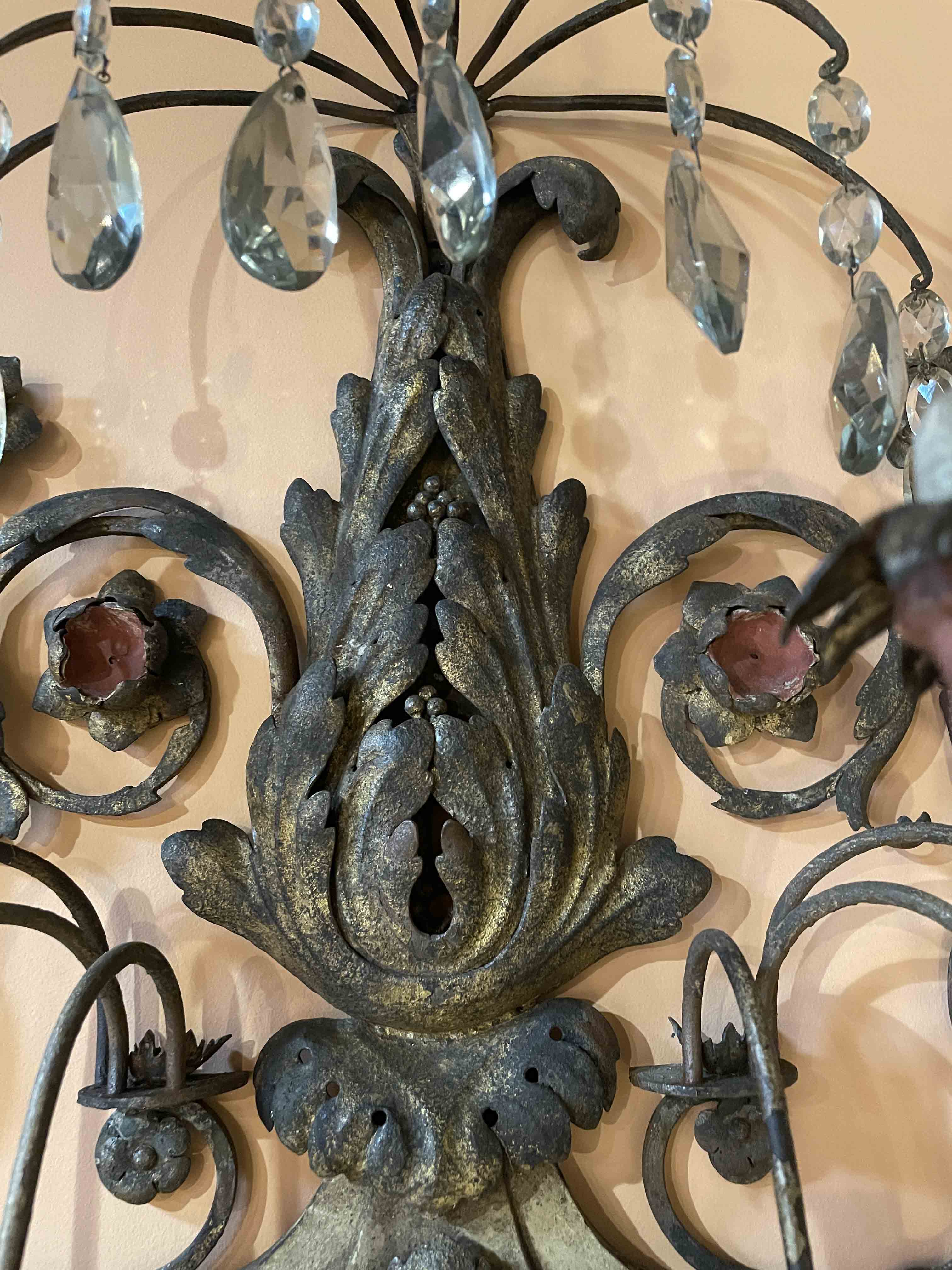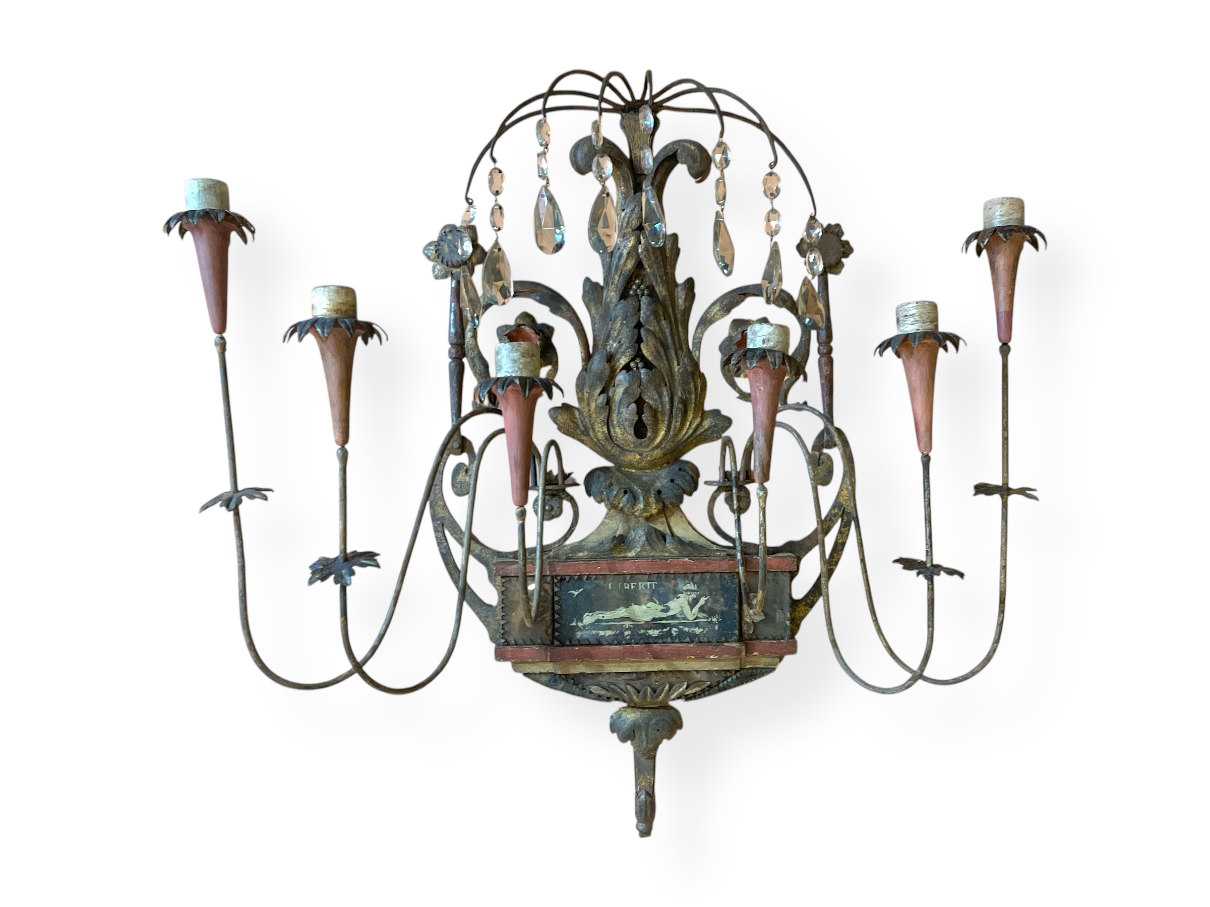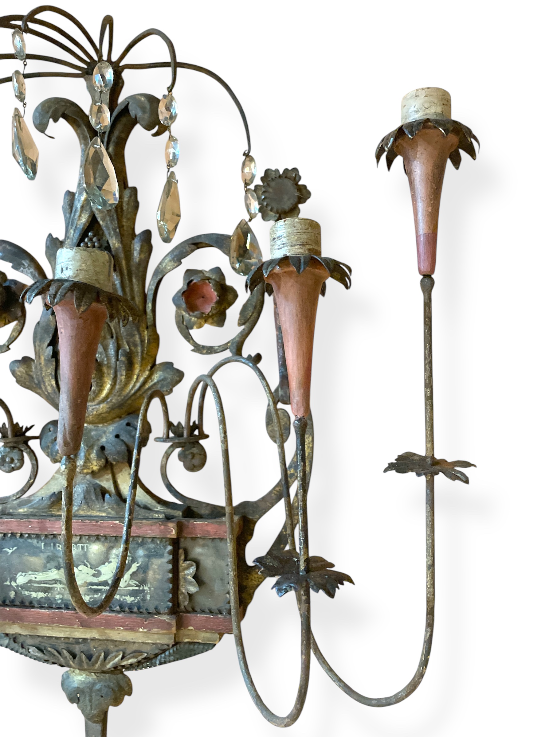 Italian wood and tole wall sconce w/ egolimize panel & crystal drops.