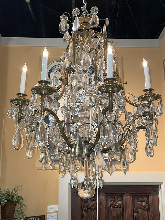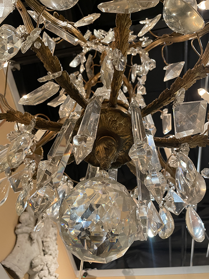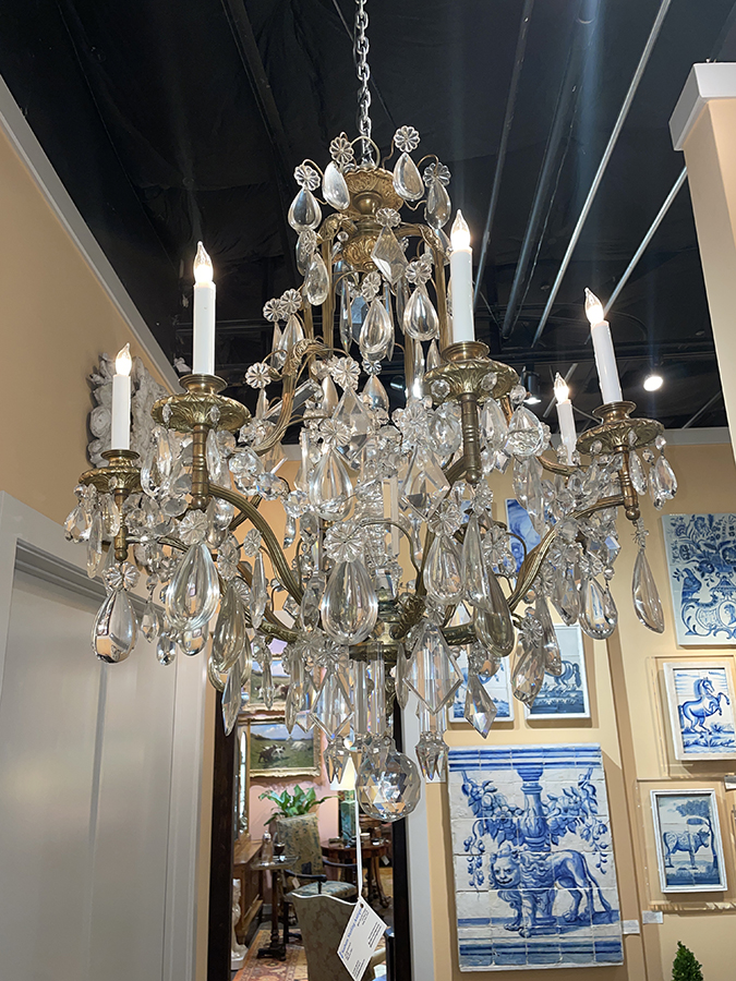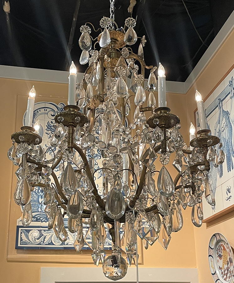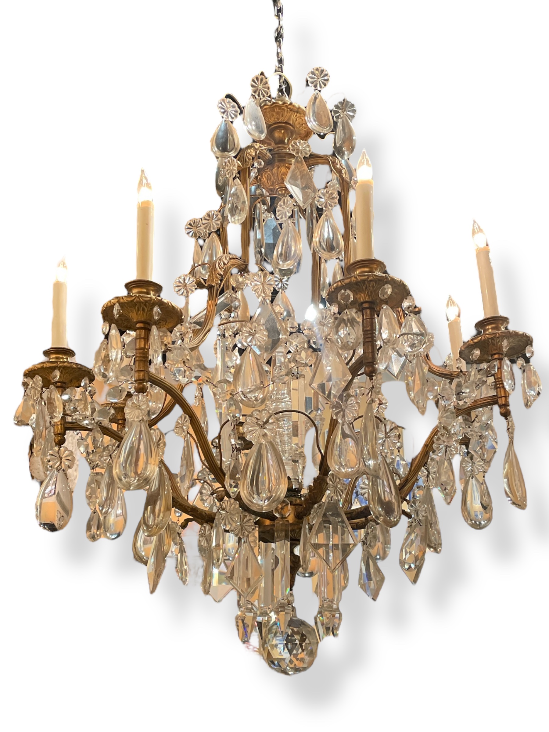 Gilt bronze chandelier w/ large Baccarat crystal drops and internal prism.