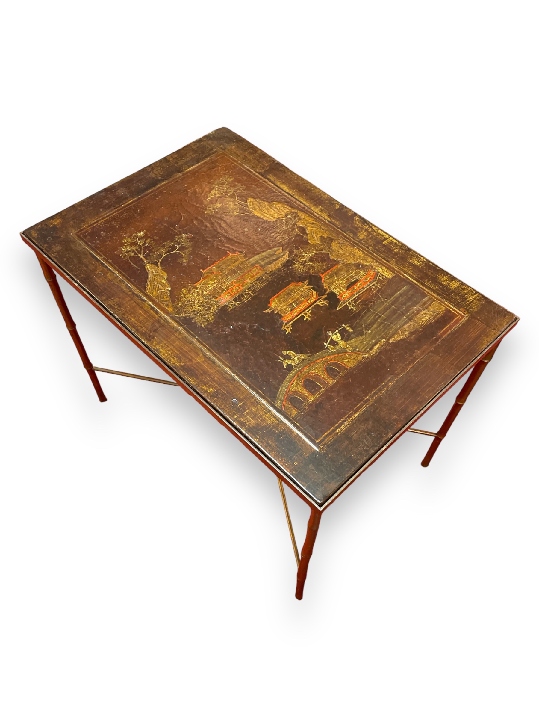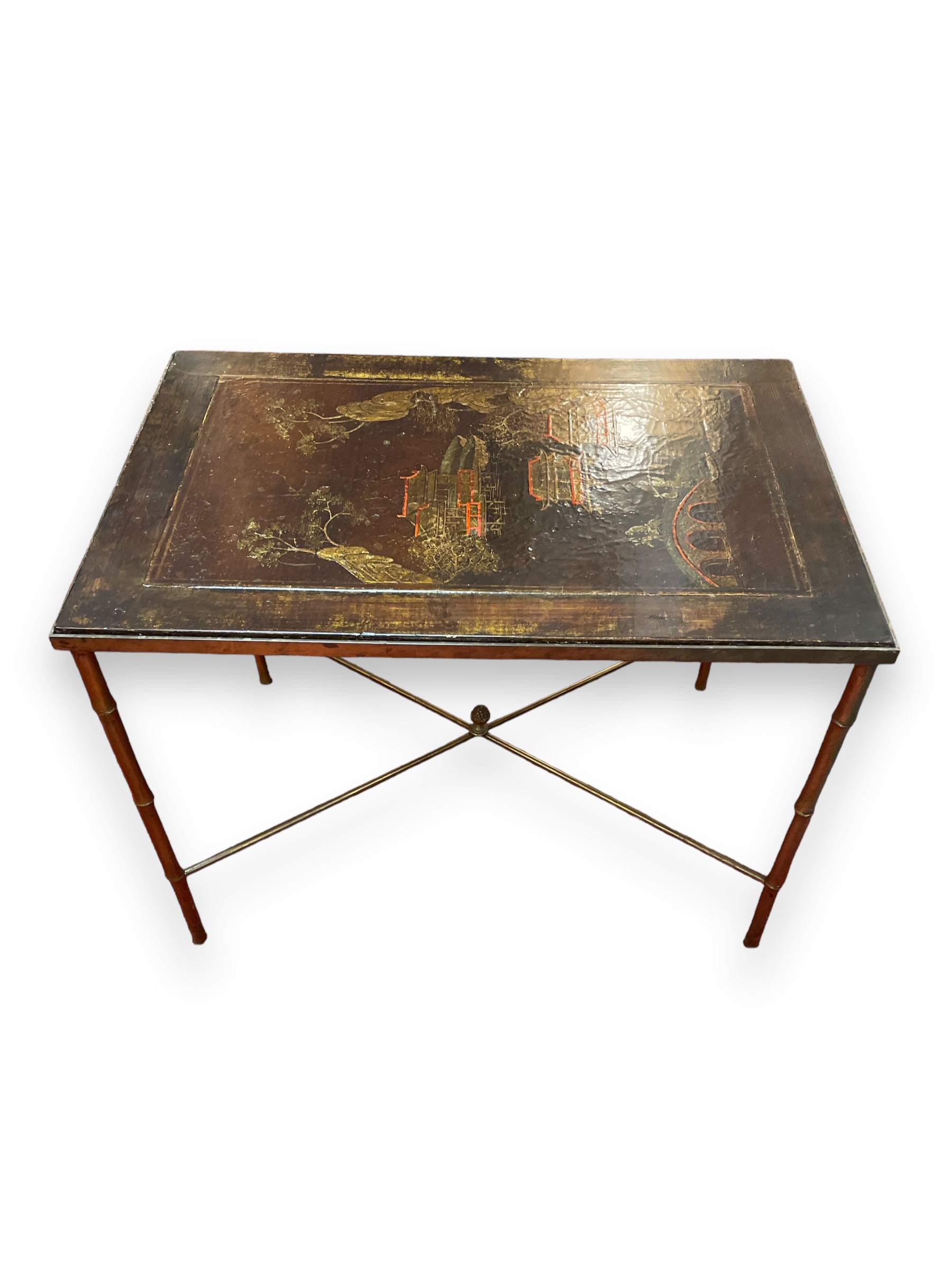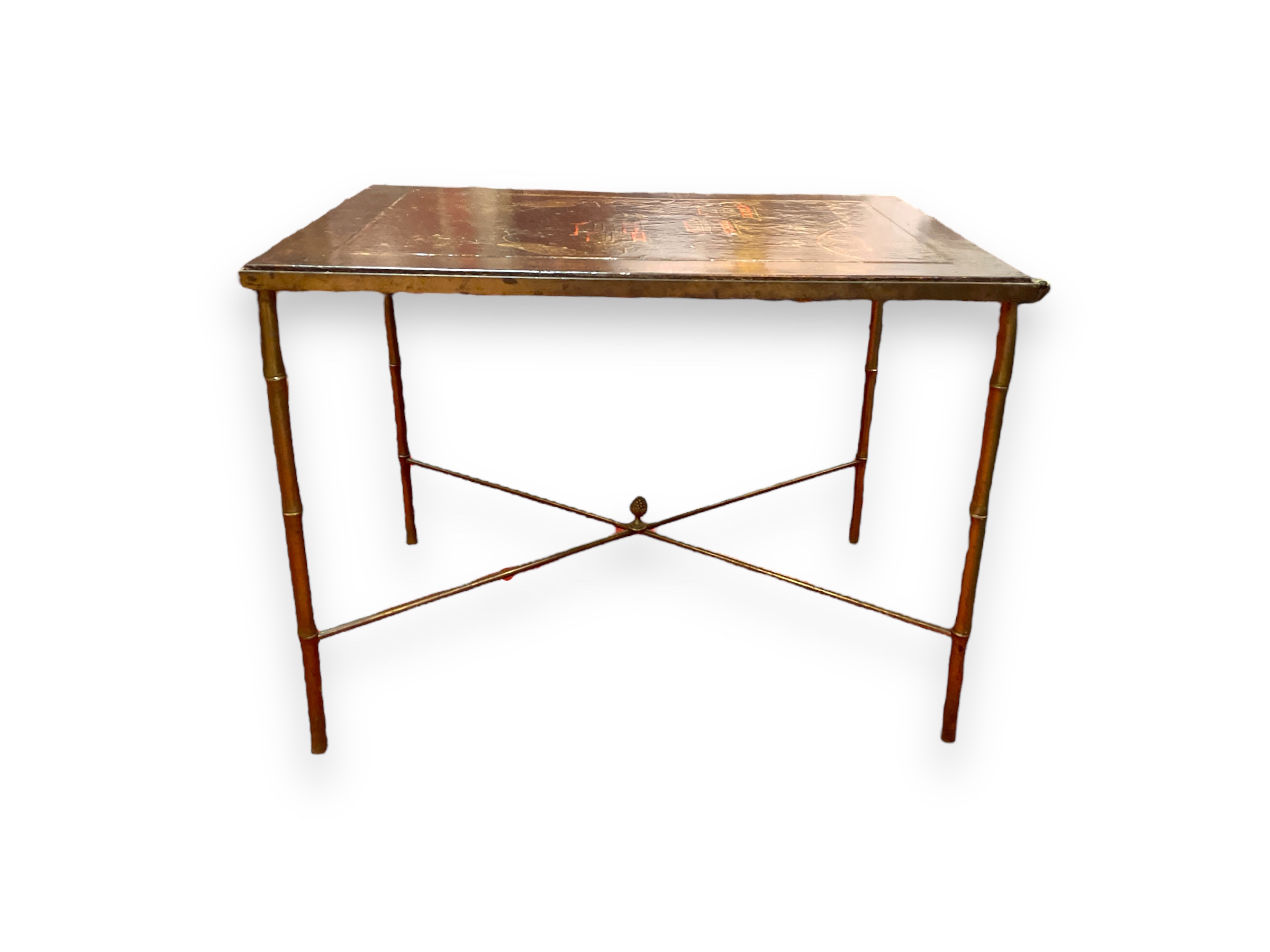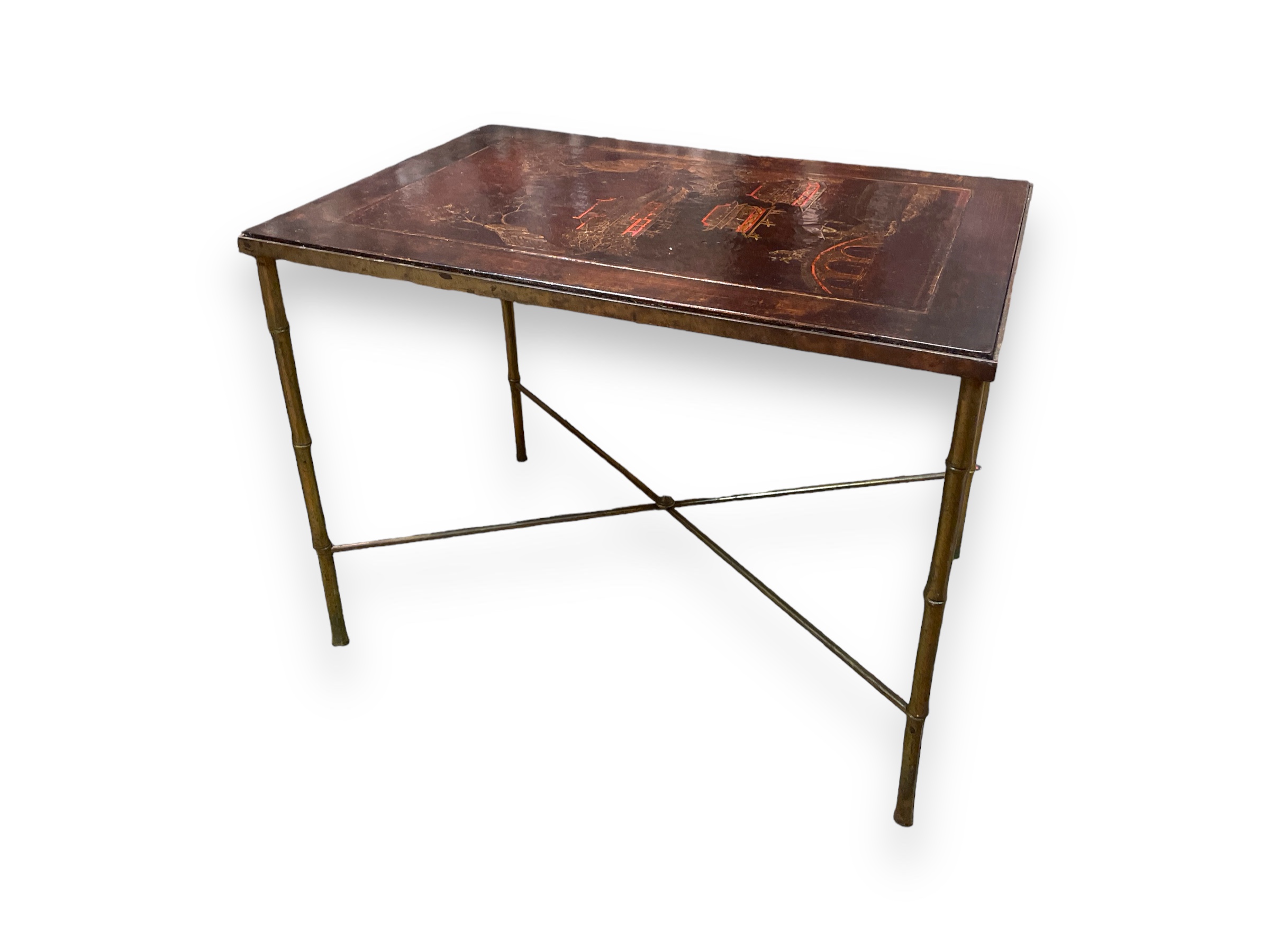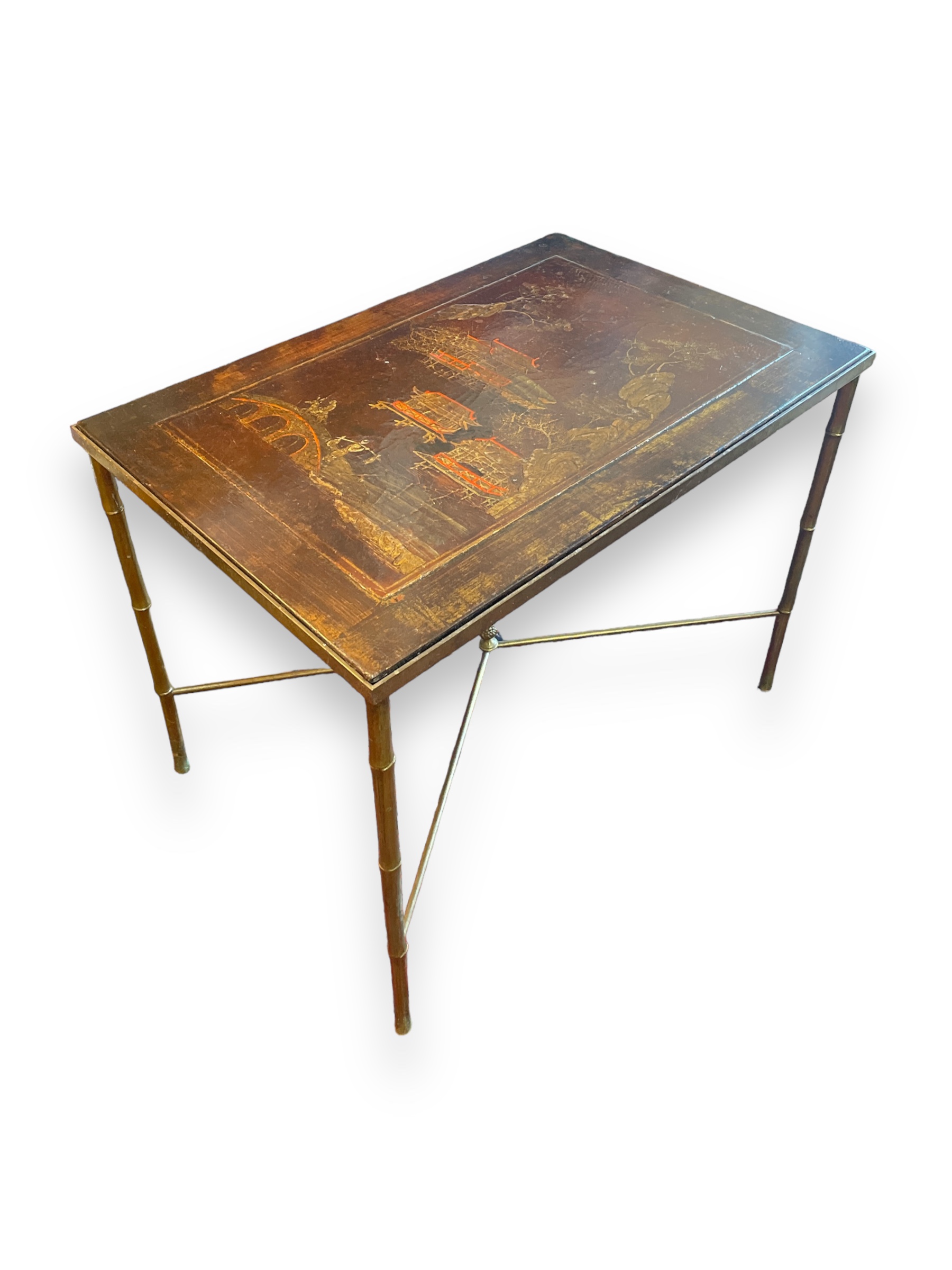 Chinoiserie lacquered top side table over brass faux bamboo legs.