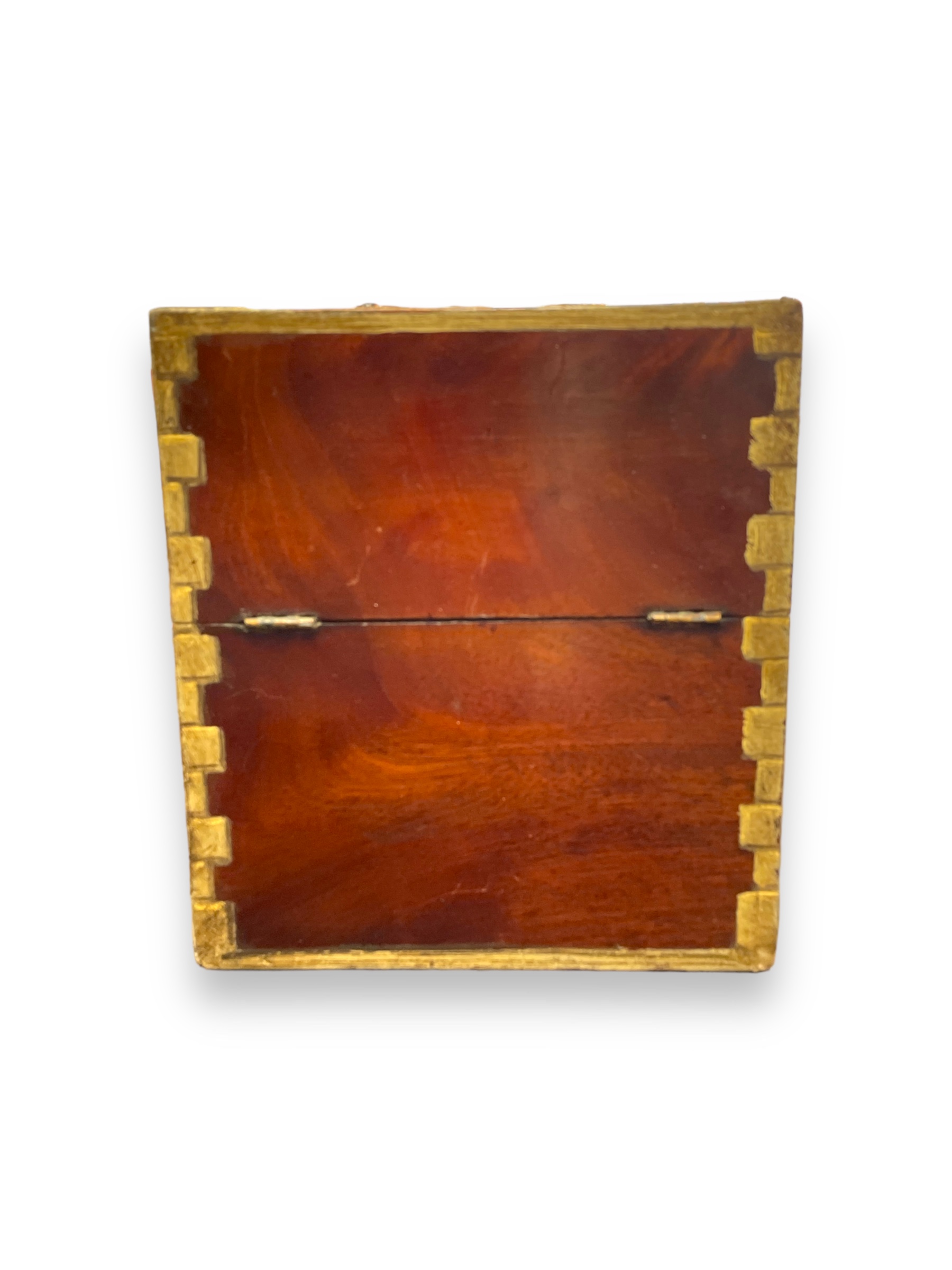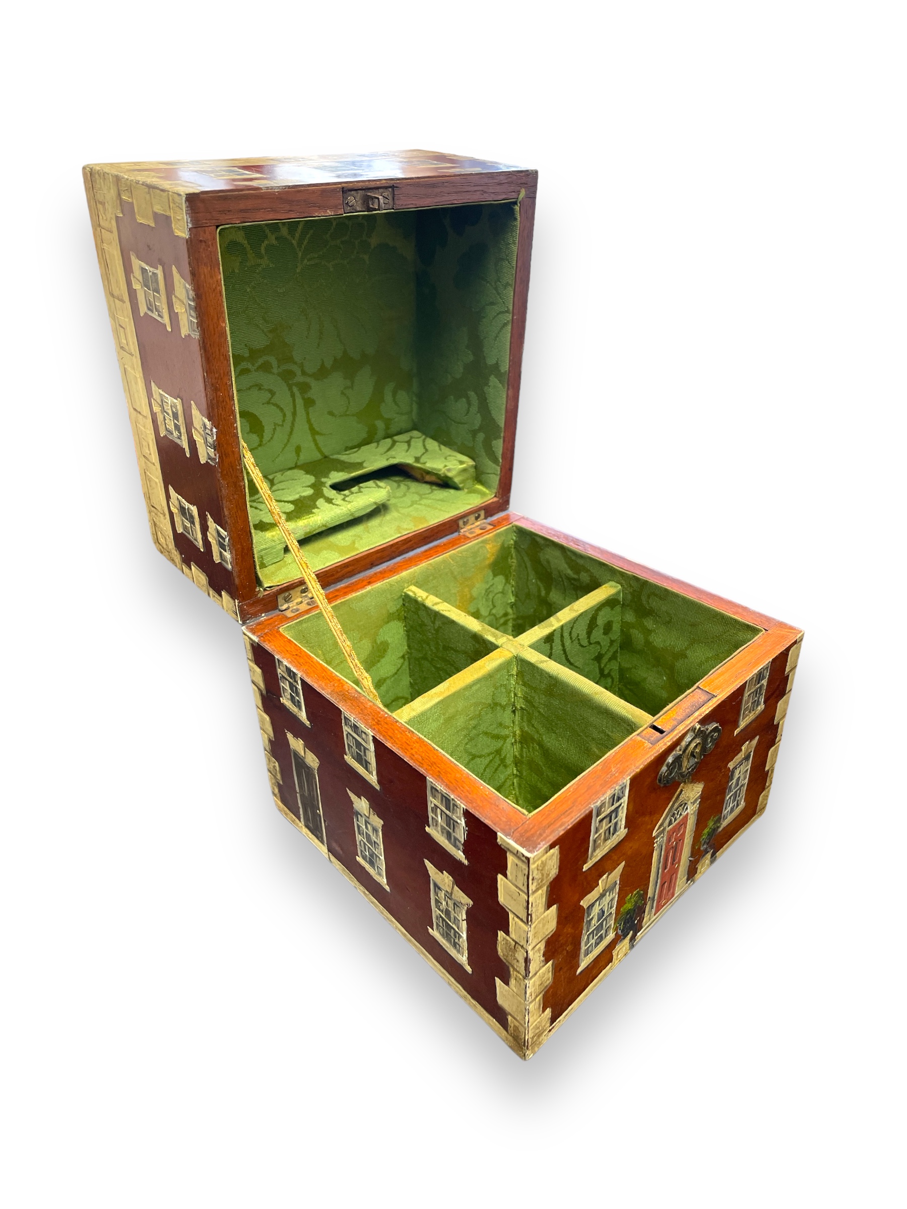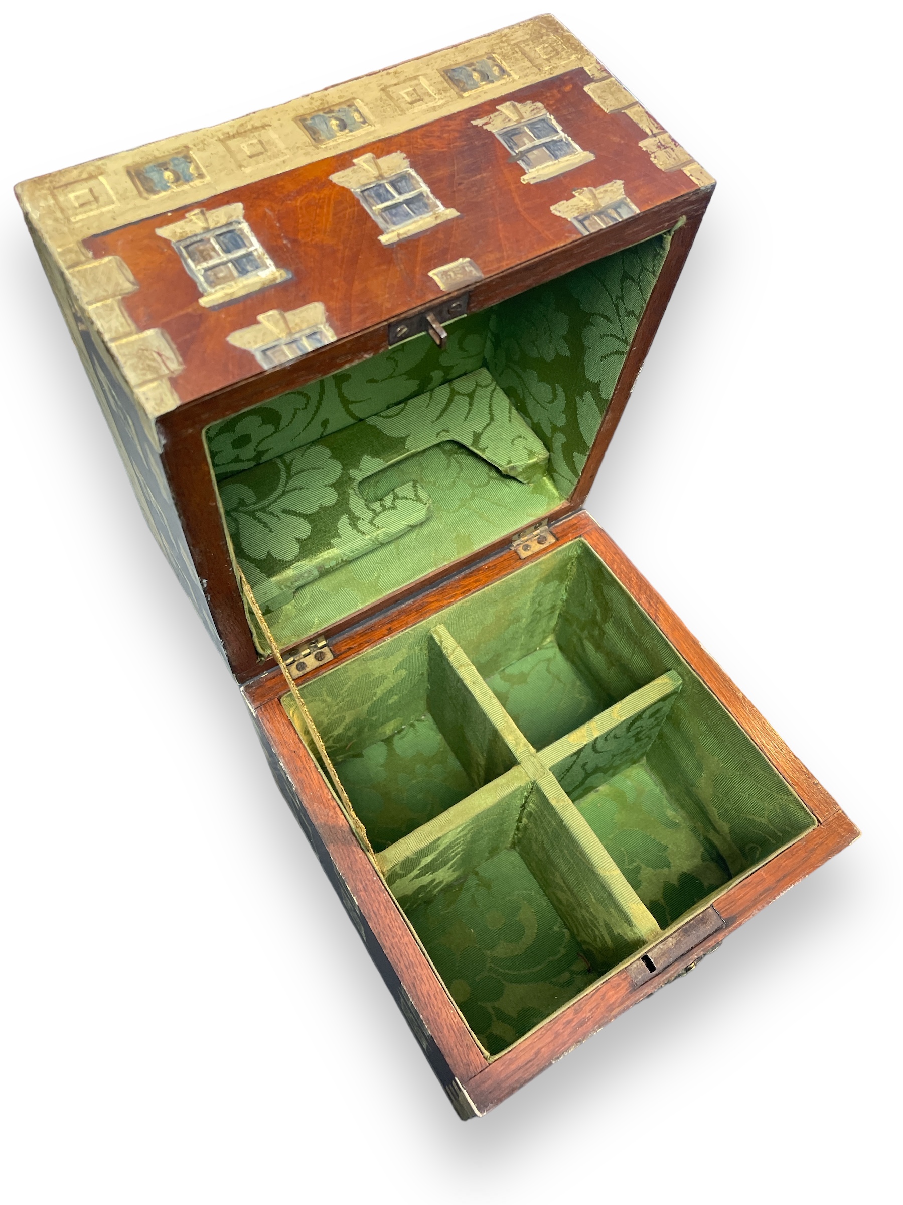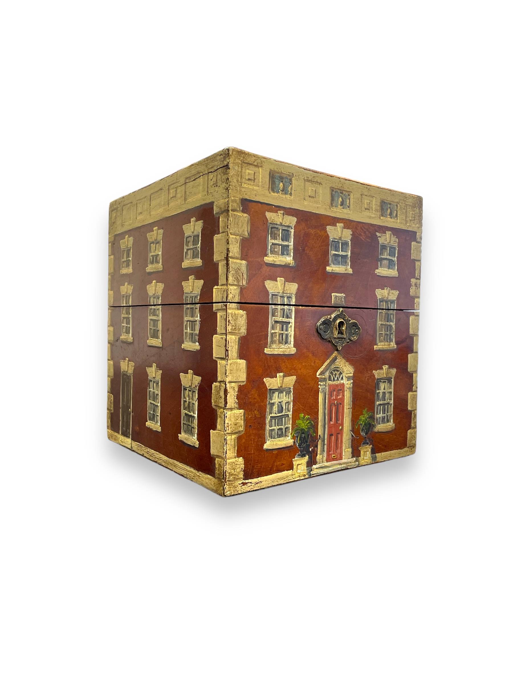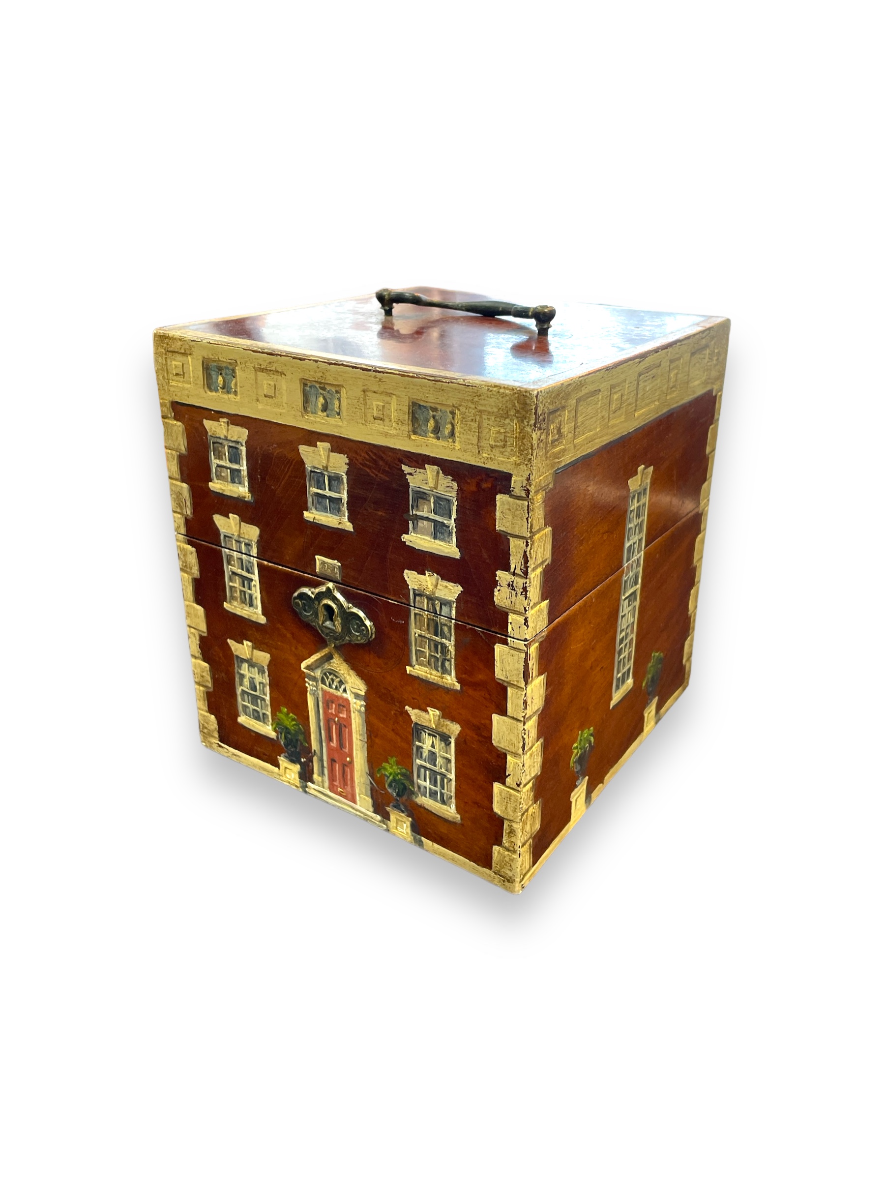 Early 19th C English toiletry box painted to look like a Georgian building facade with hinged lid and handle.