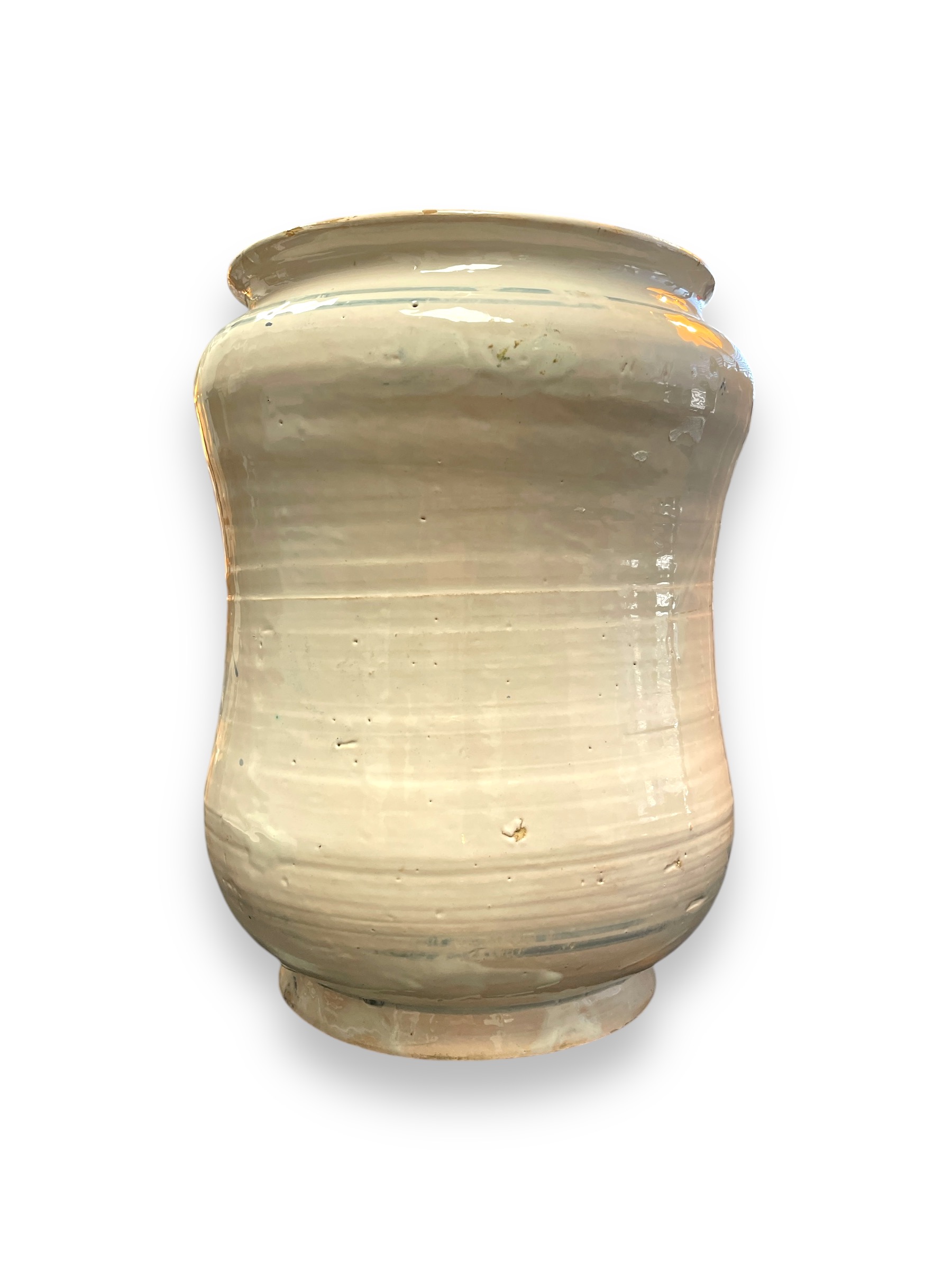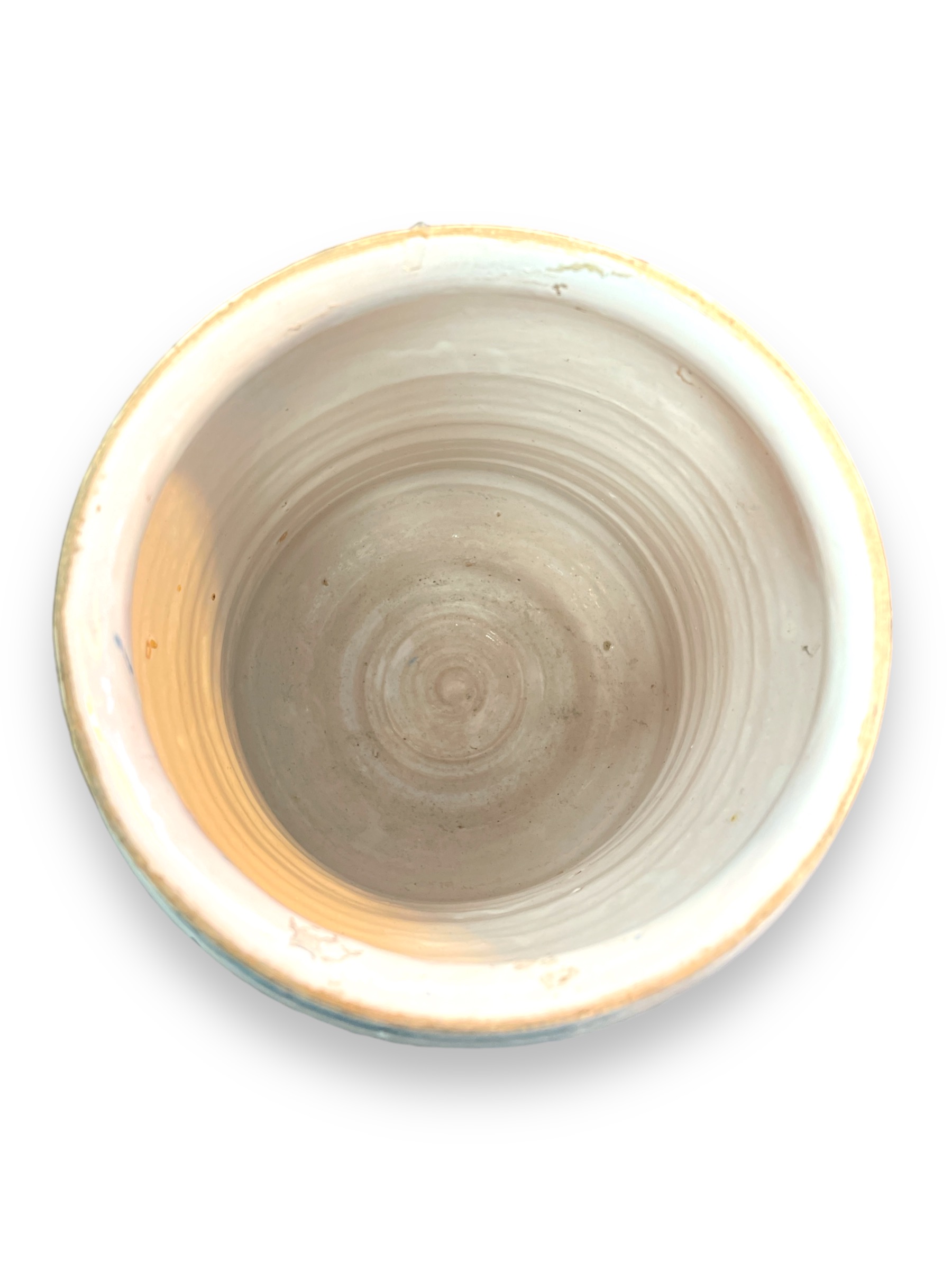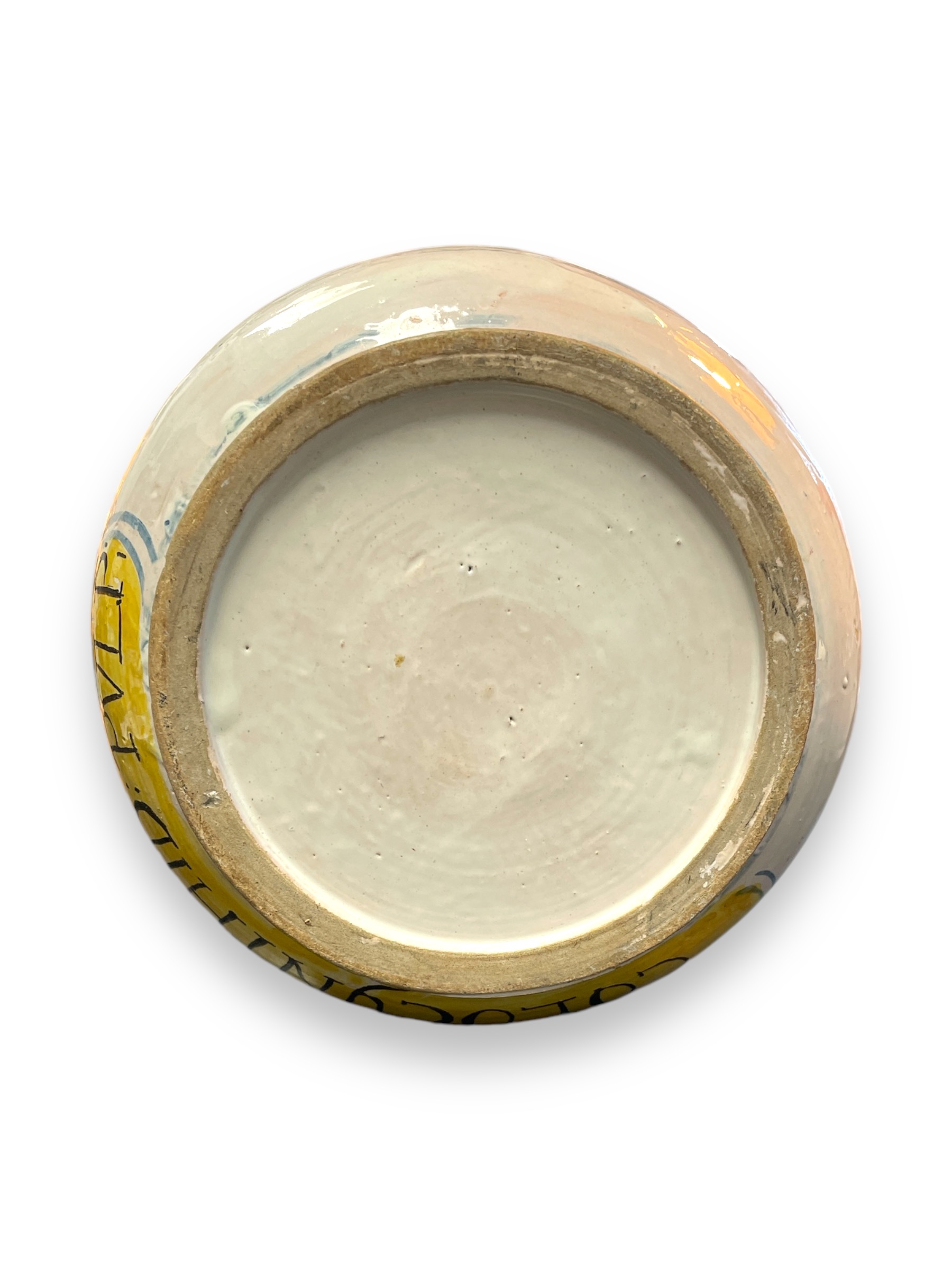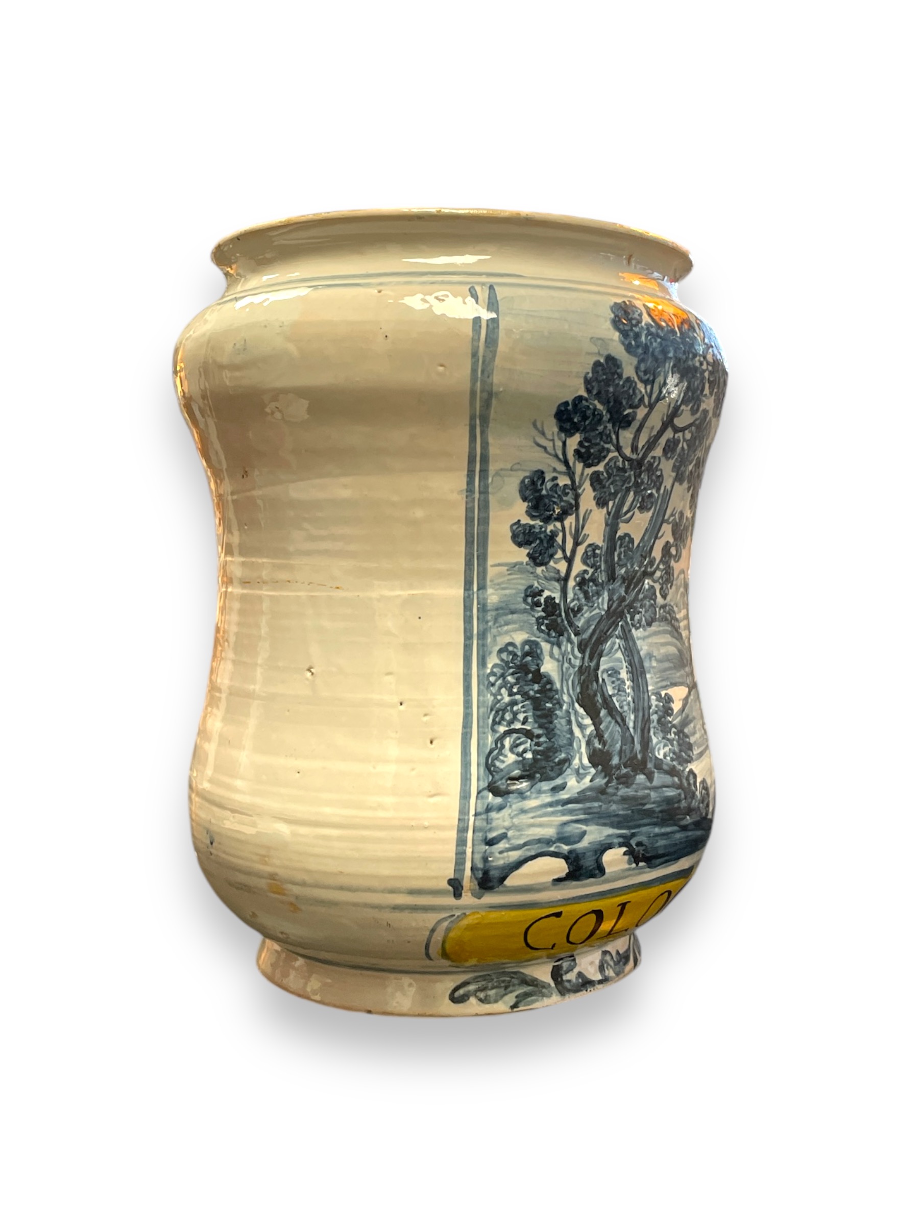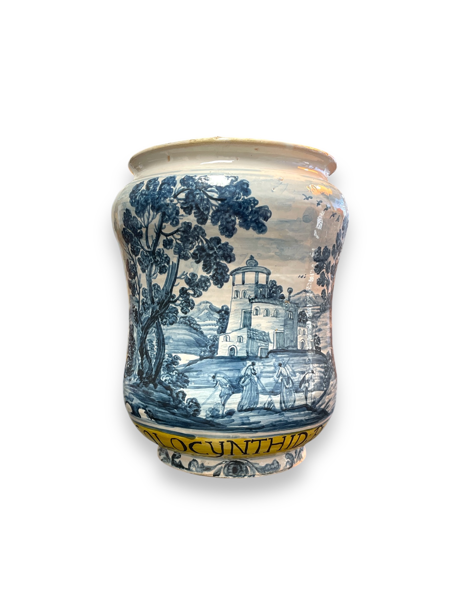 Large Italian majolica pharmacy albarello with blue landscape design. " COLOCYNTHID: PVLP:"