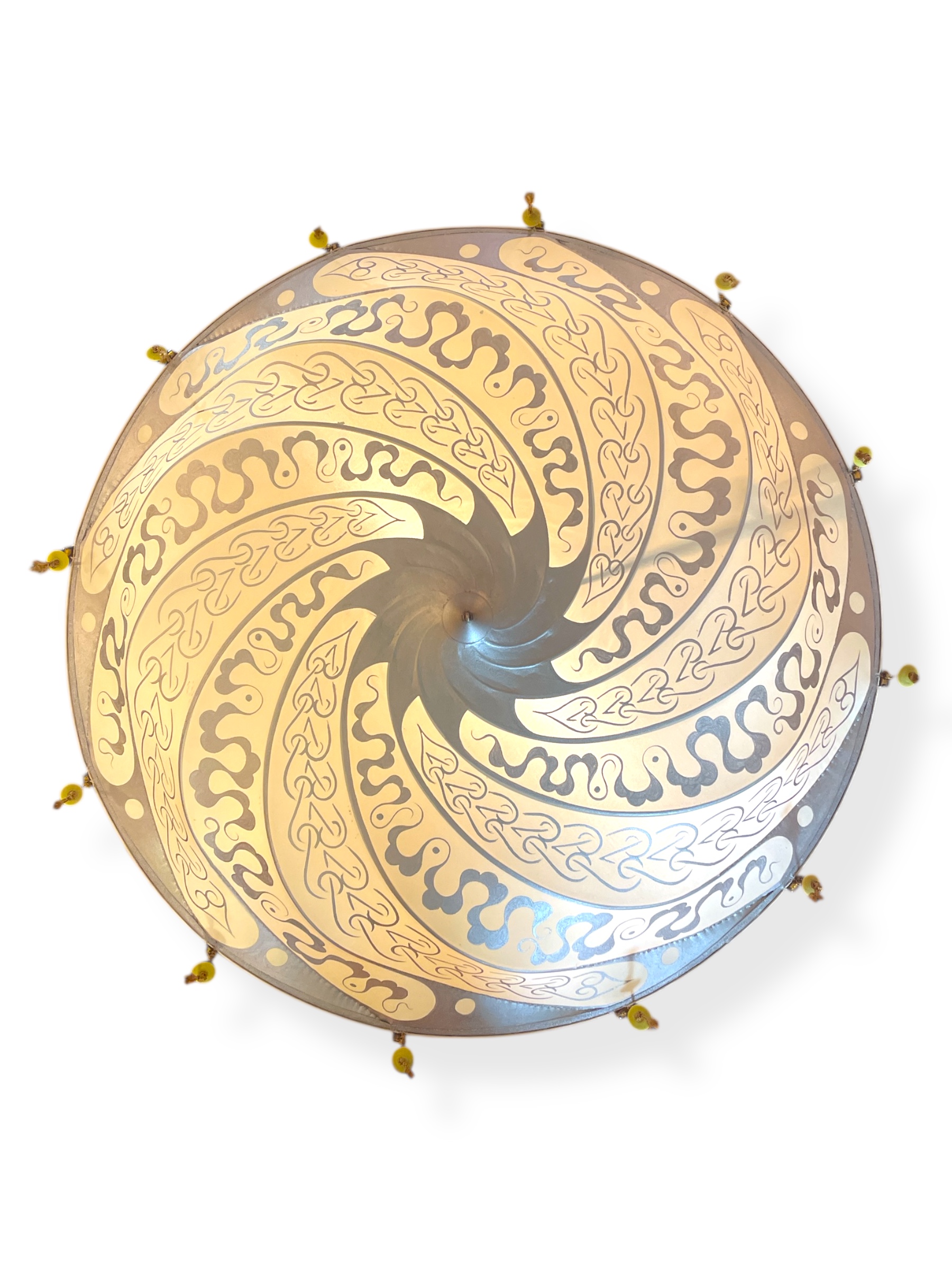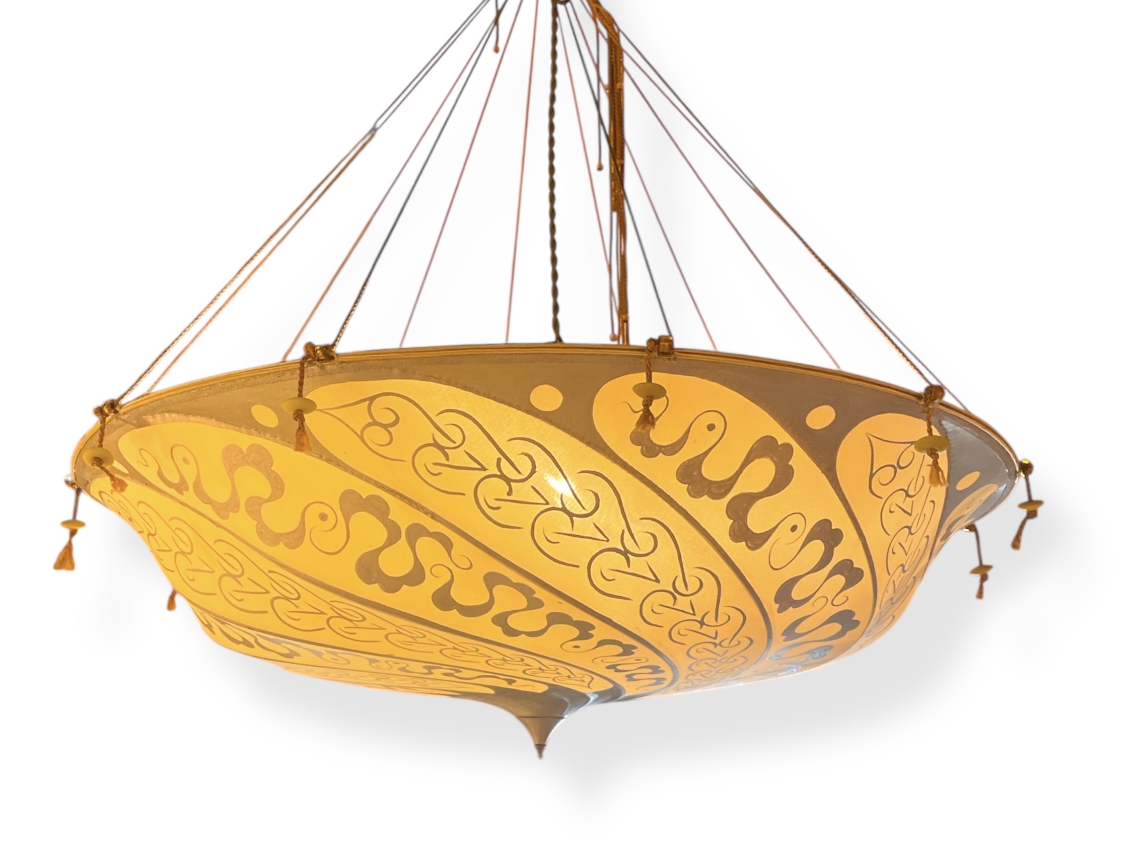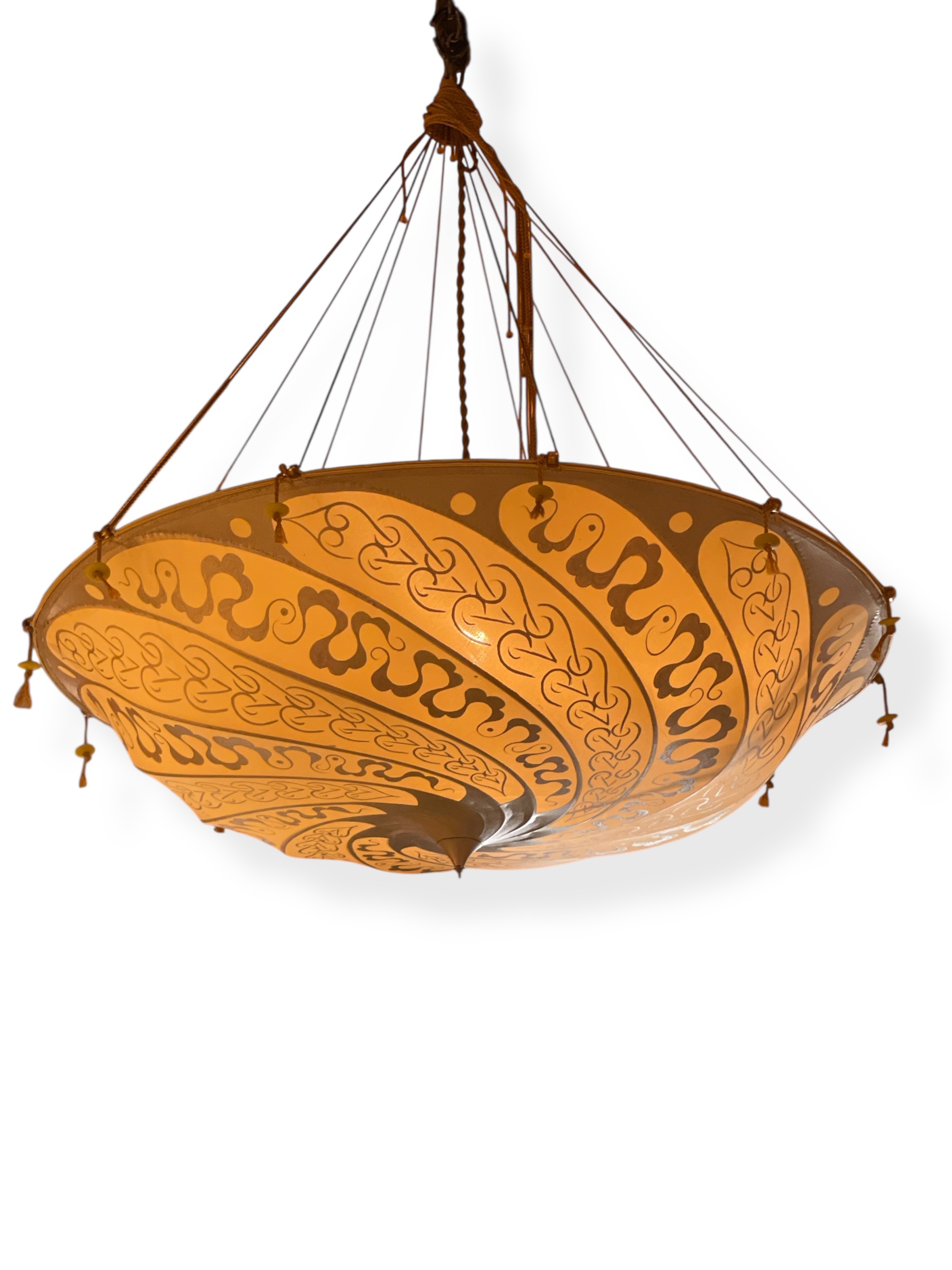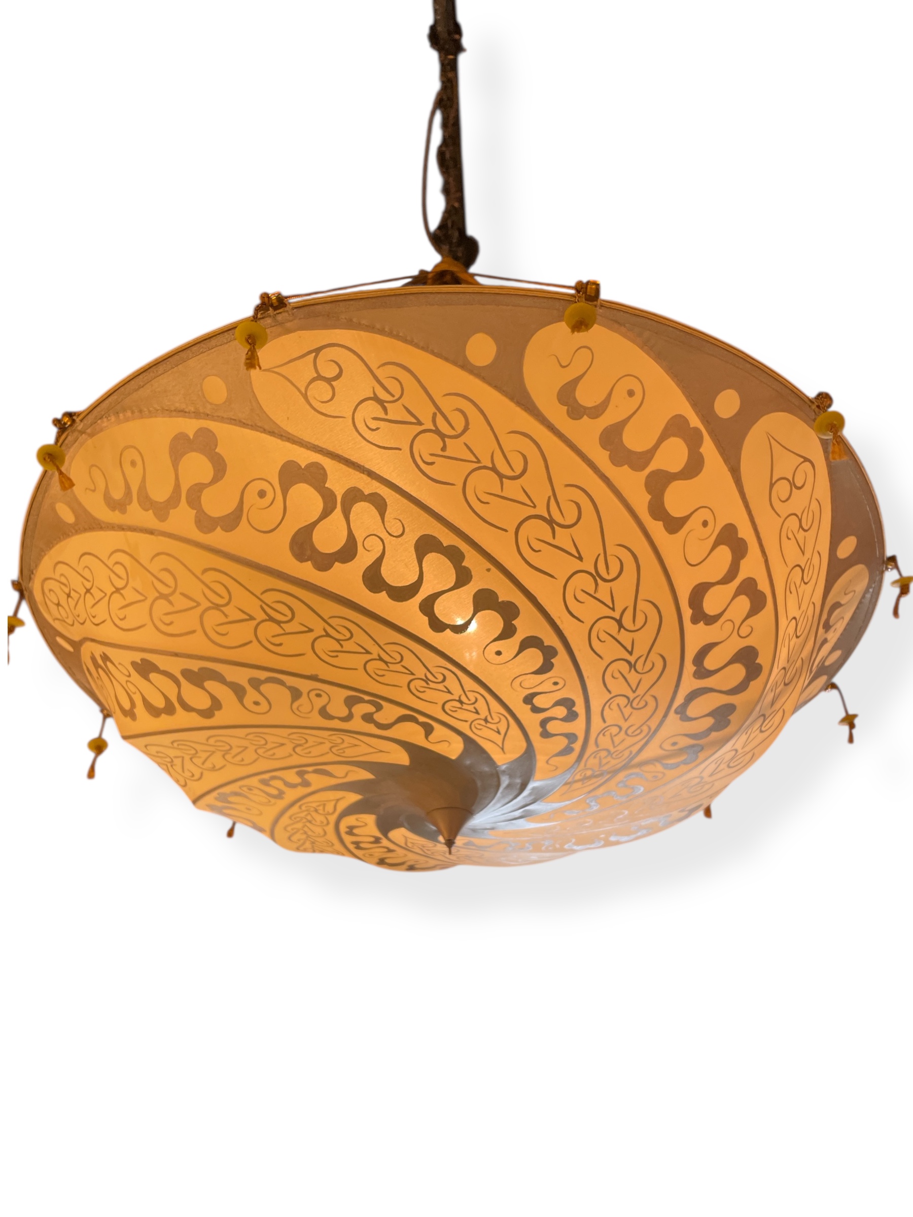 Vintage Italian Fortuny Scudo Saraceno decorated silk chandelier. (Missing bead drop.)