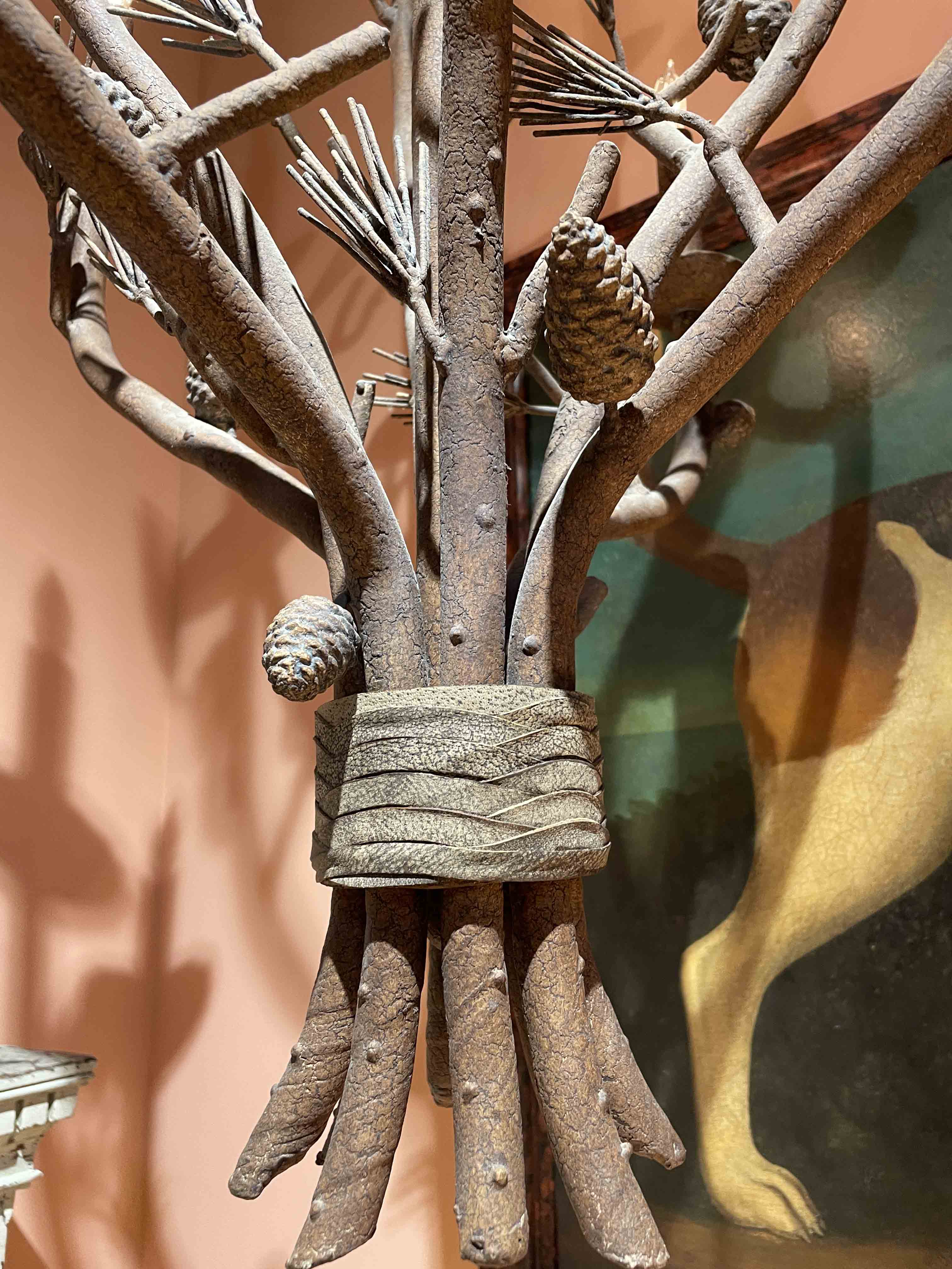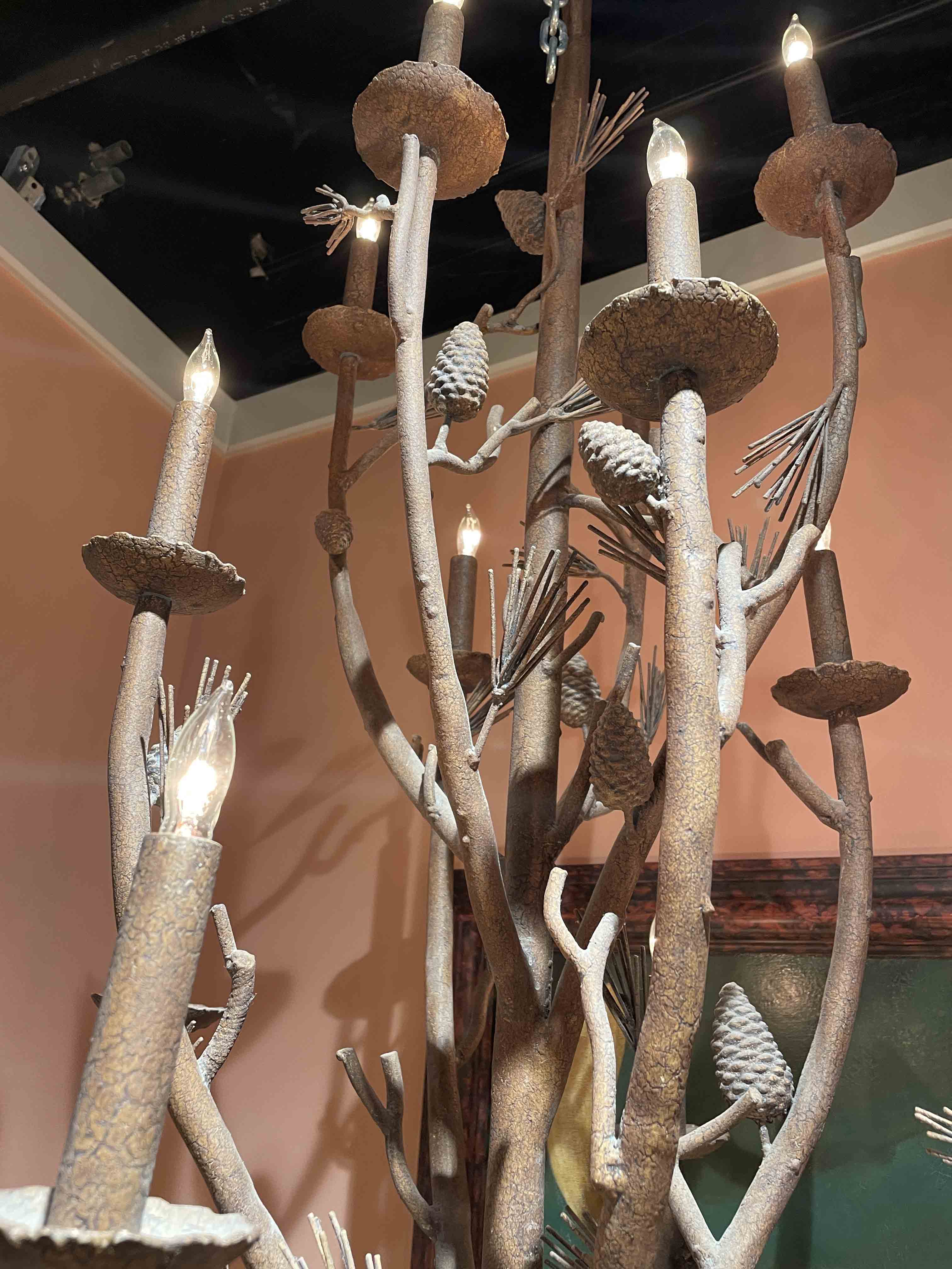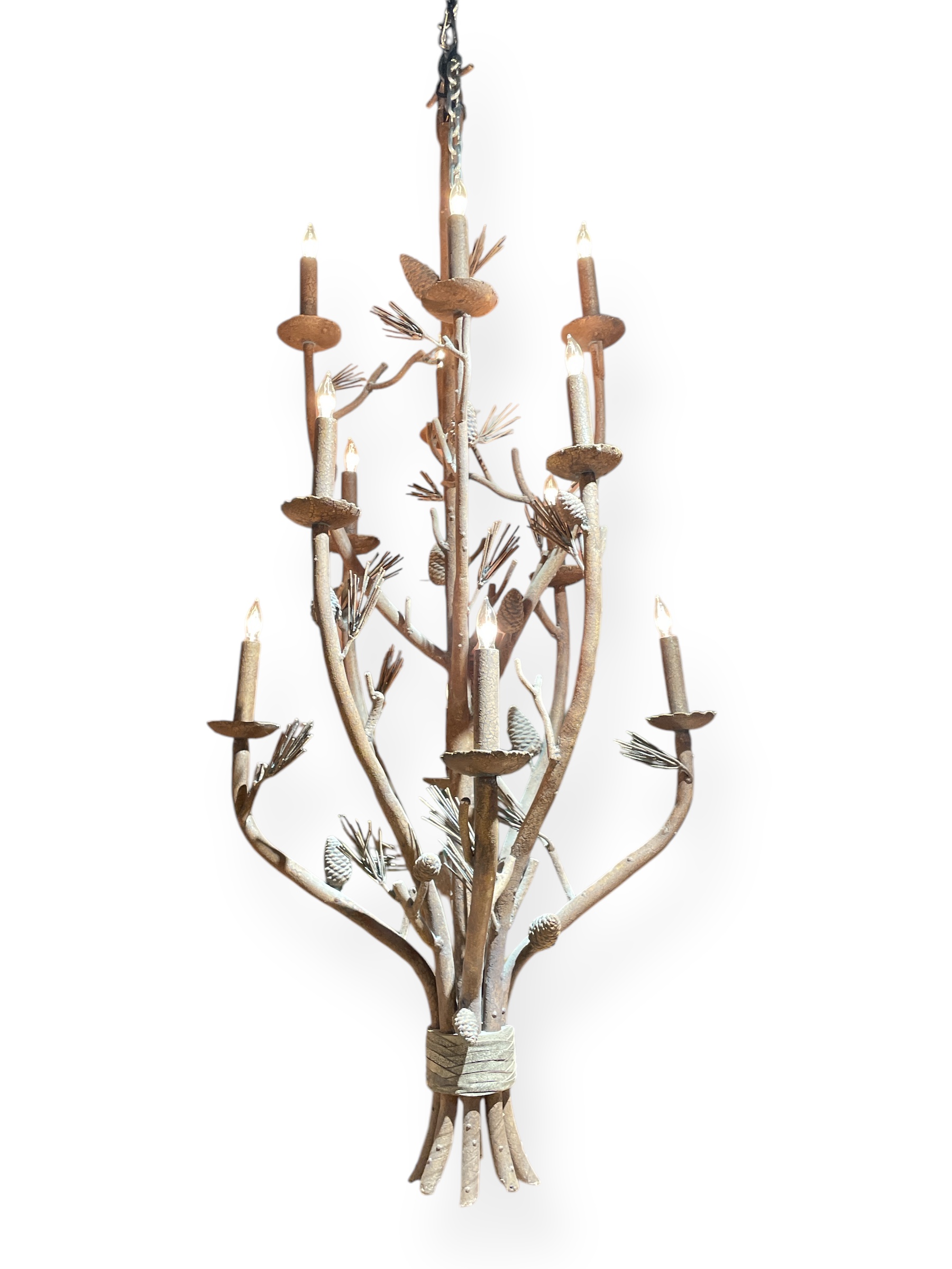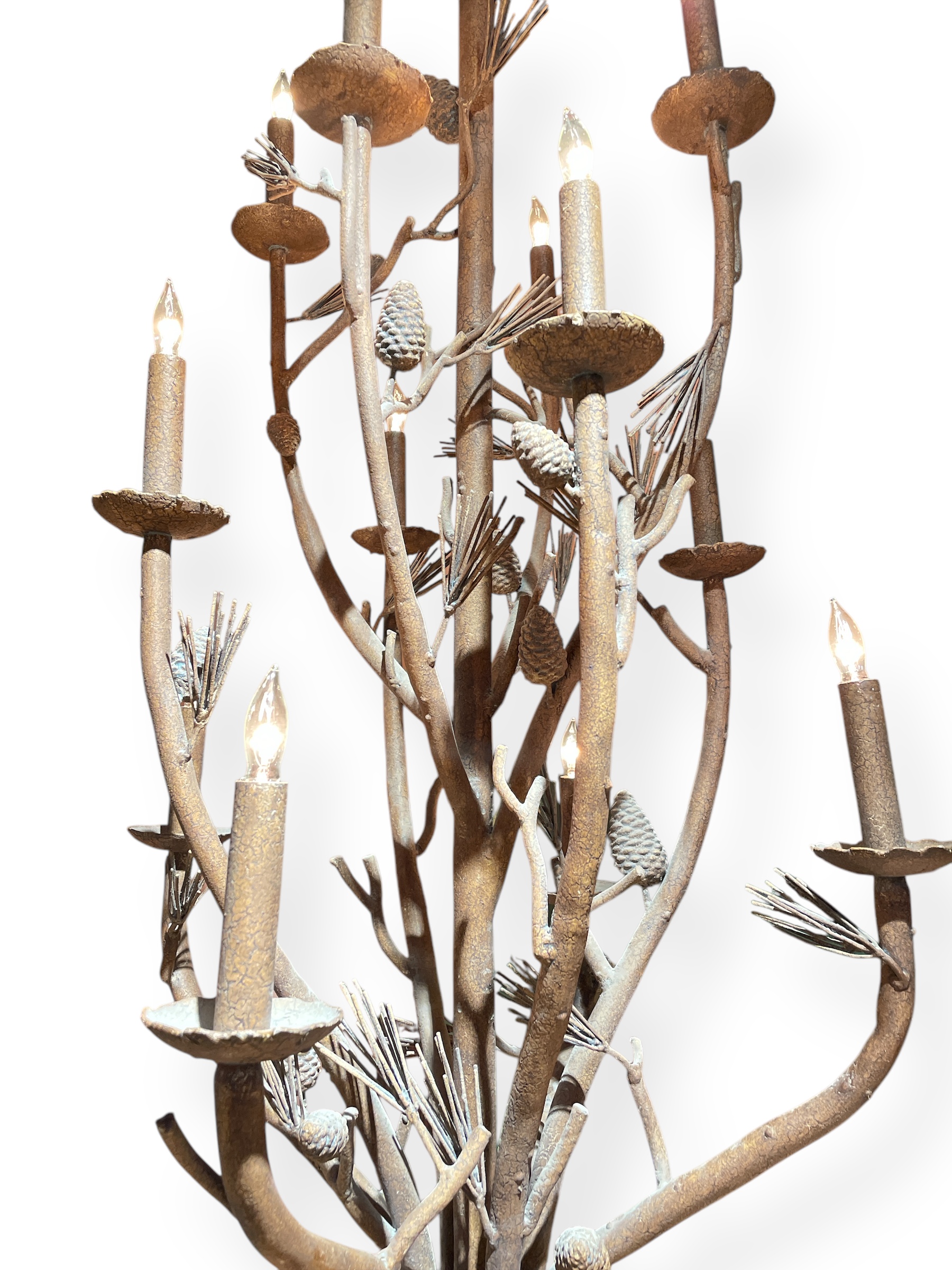 Vintage patinaed metal chandelier formed as a gathering of pine branches with pine cones.
