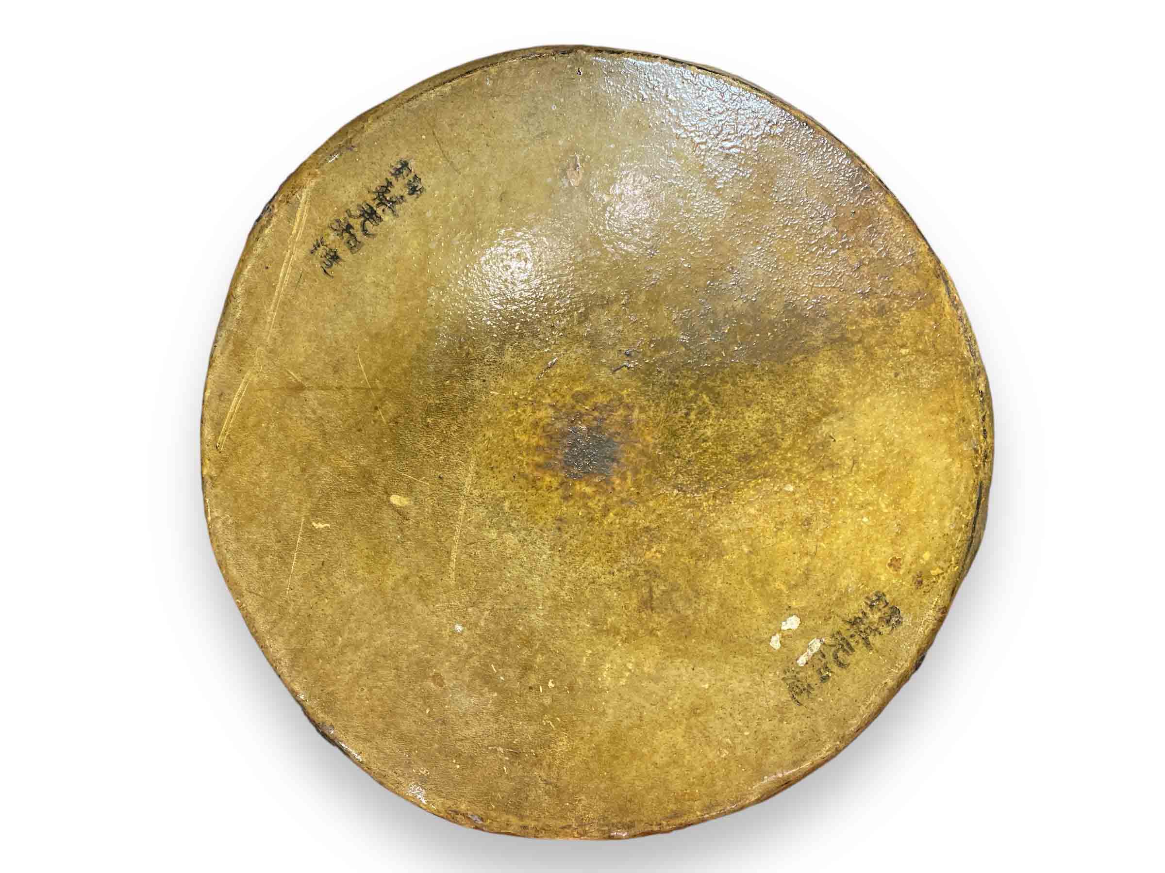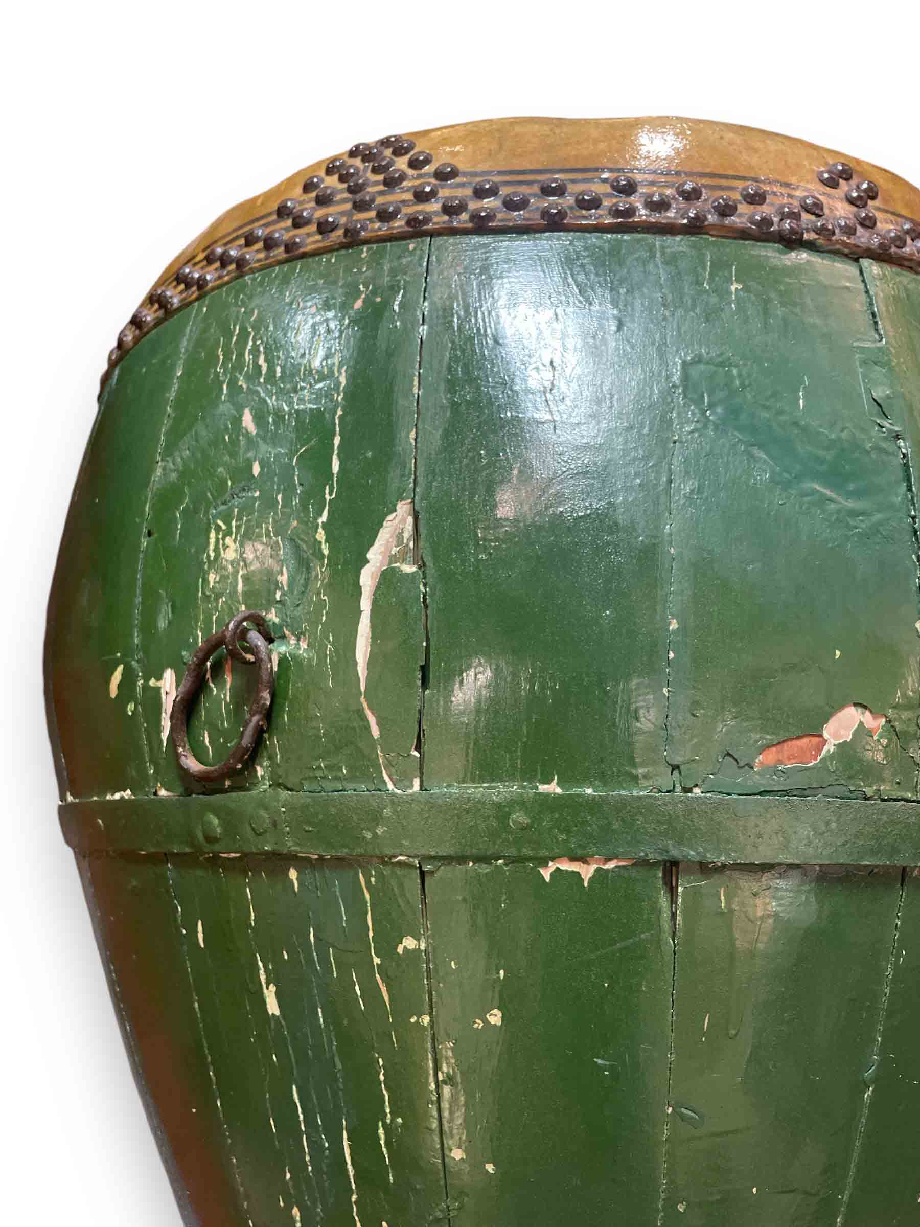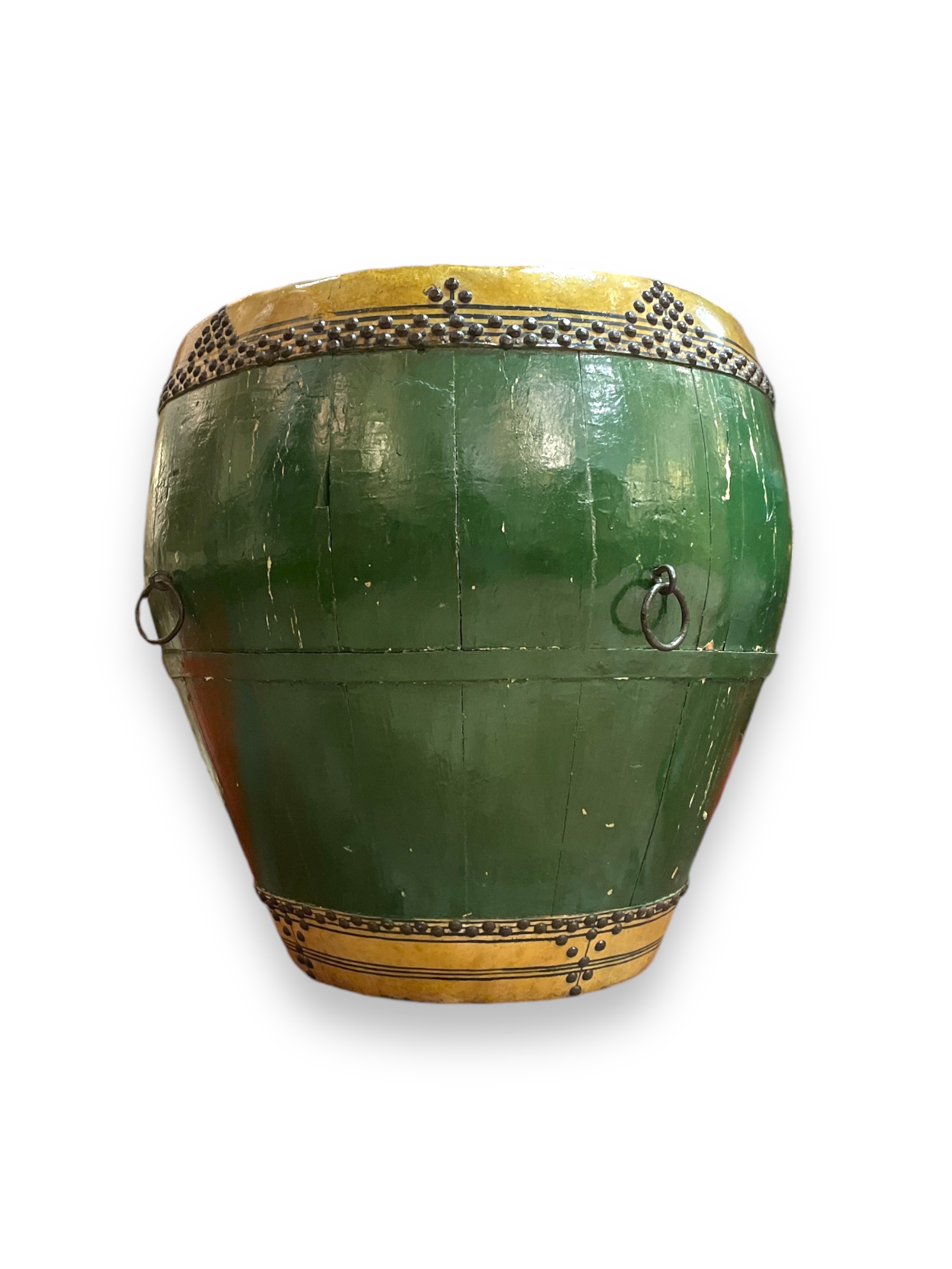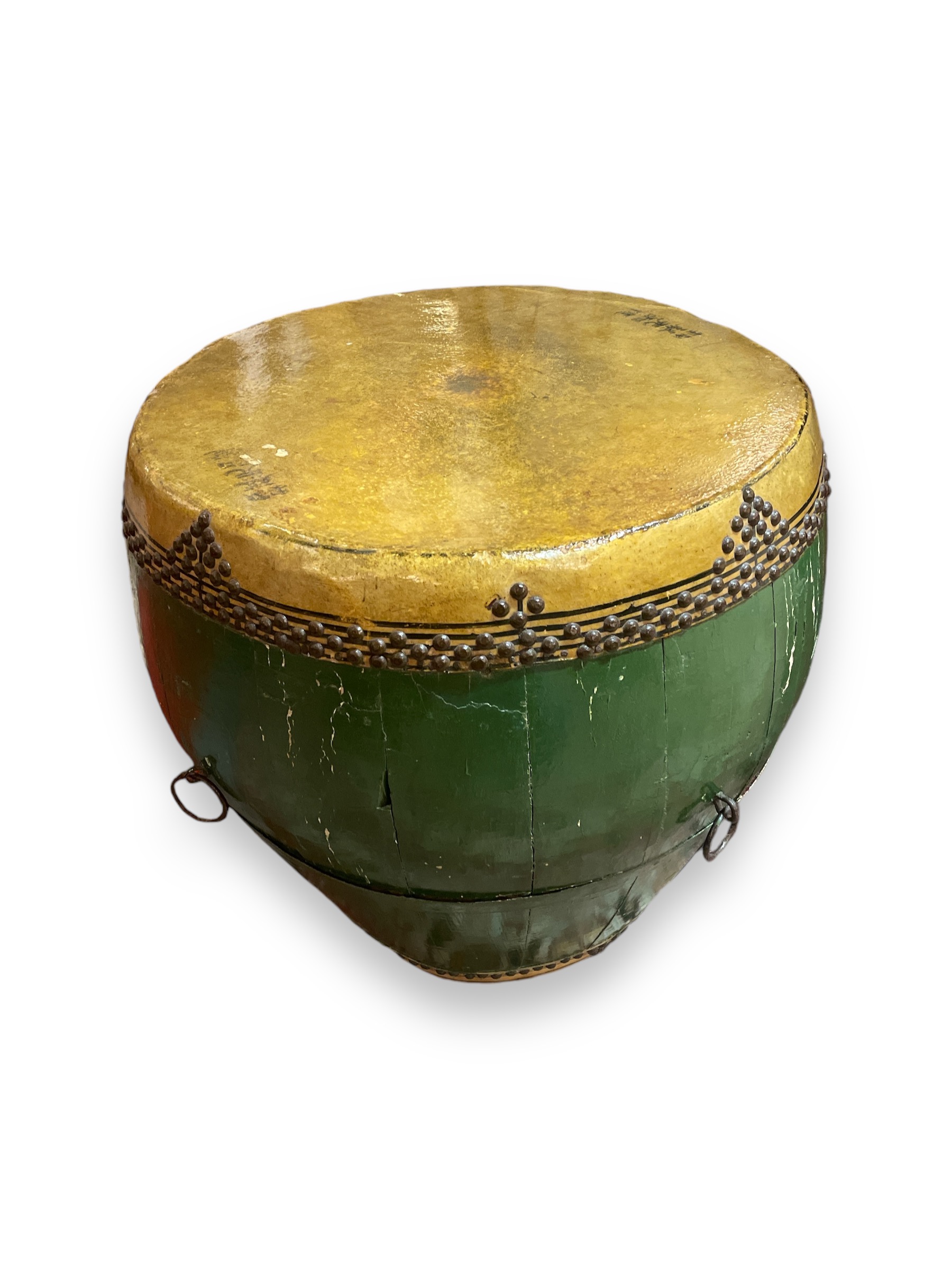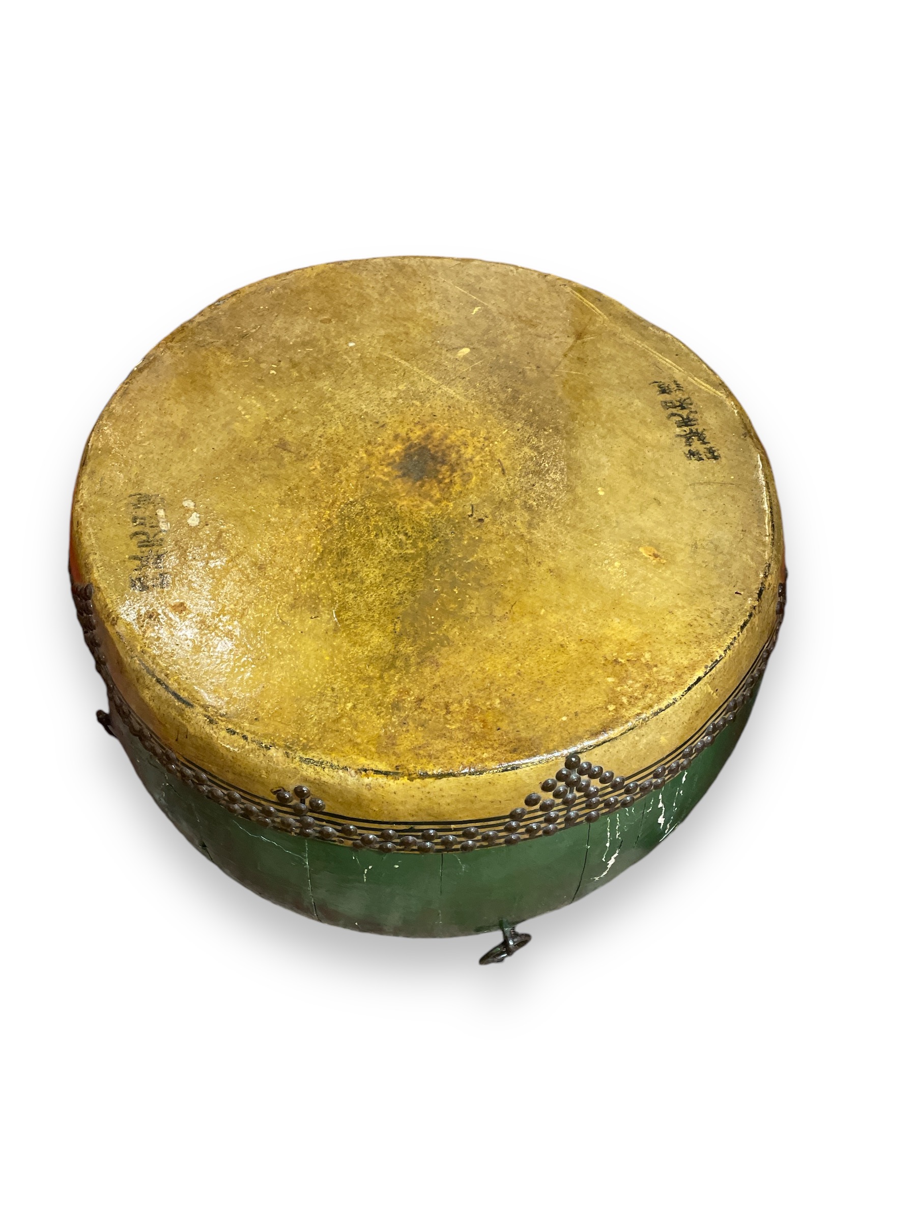 Asian antique table drum painted with leather top and bottom, 19th C.