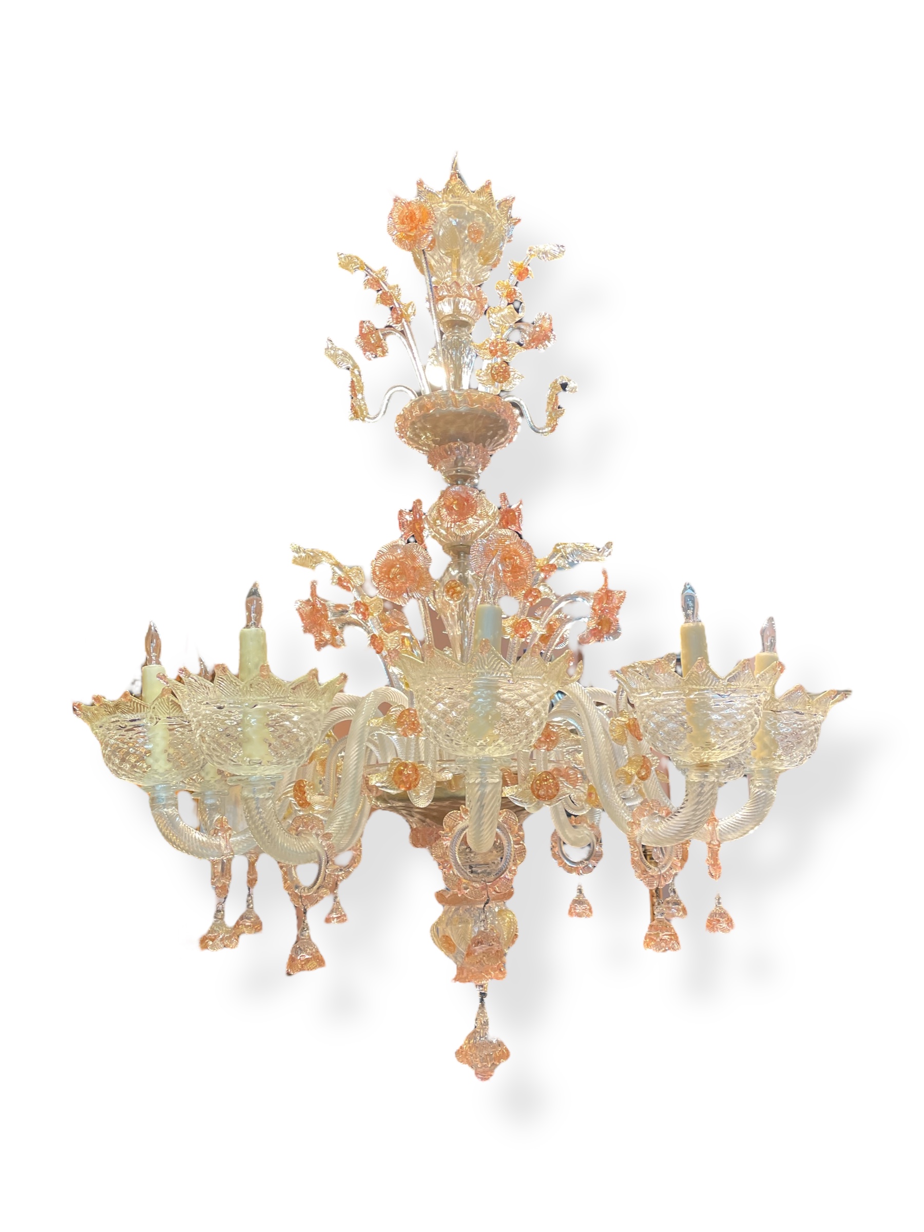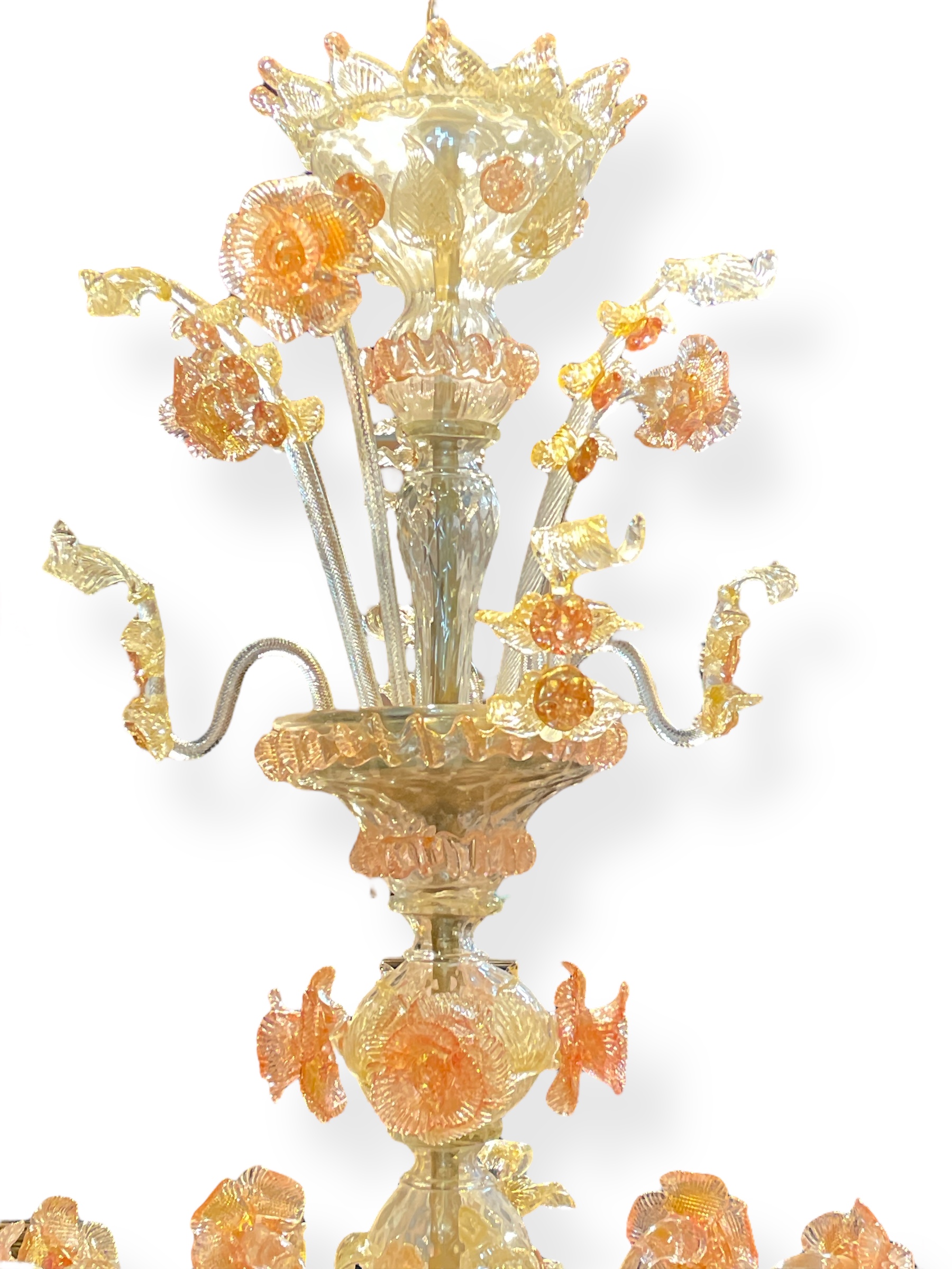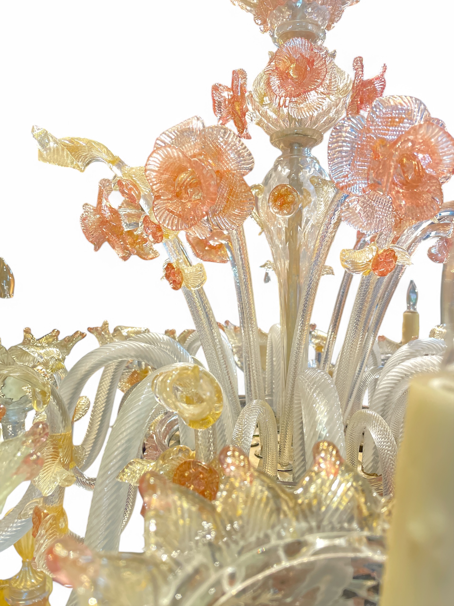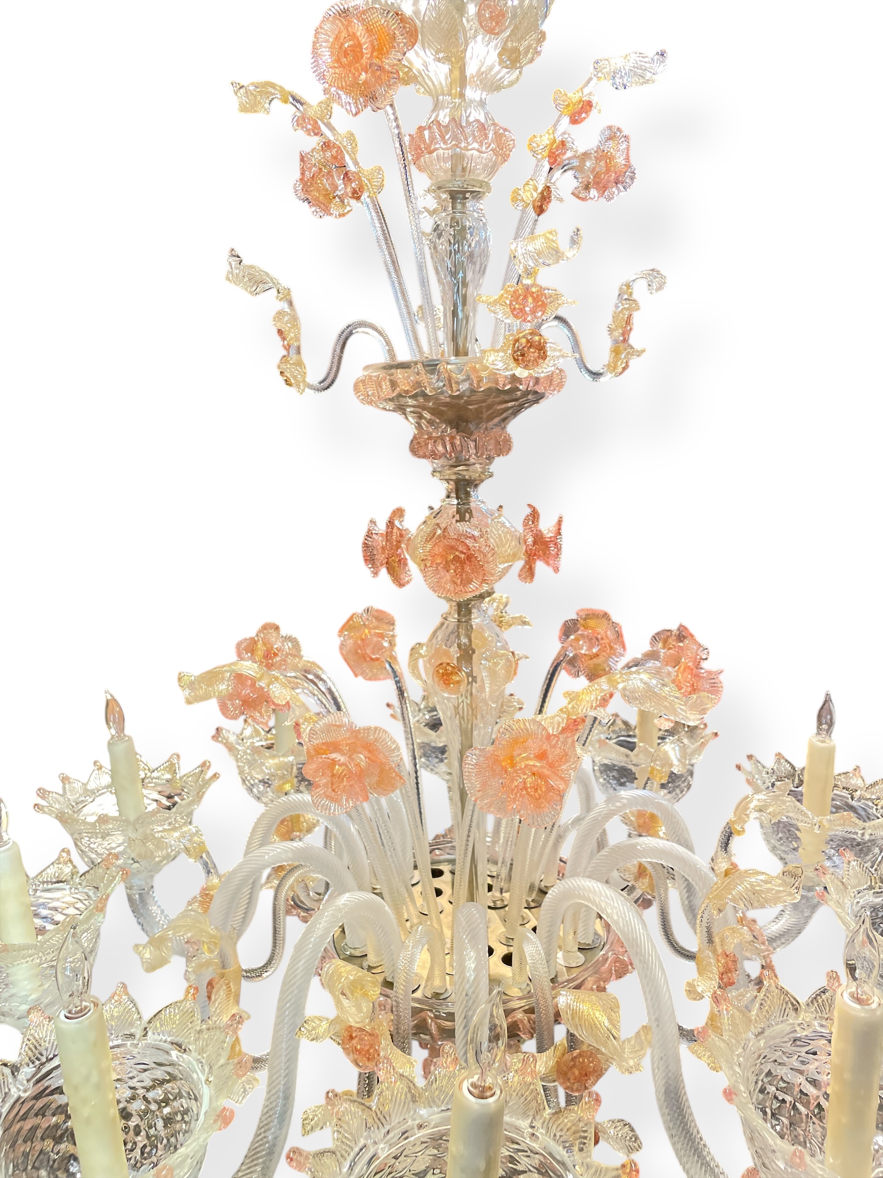 Venetian 1950's Murano 10-arm chandelier w/ floral decoration in Rococo style in hand cut glass. (Missing 13 pieces from the middle. Center bowl is cracked. One leaf of a flower is cracked.)
