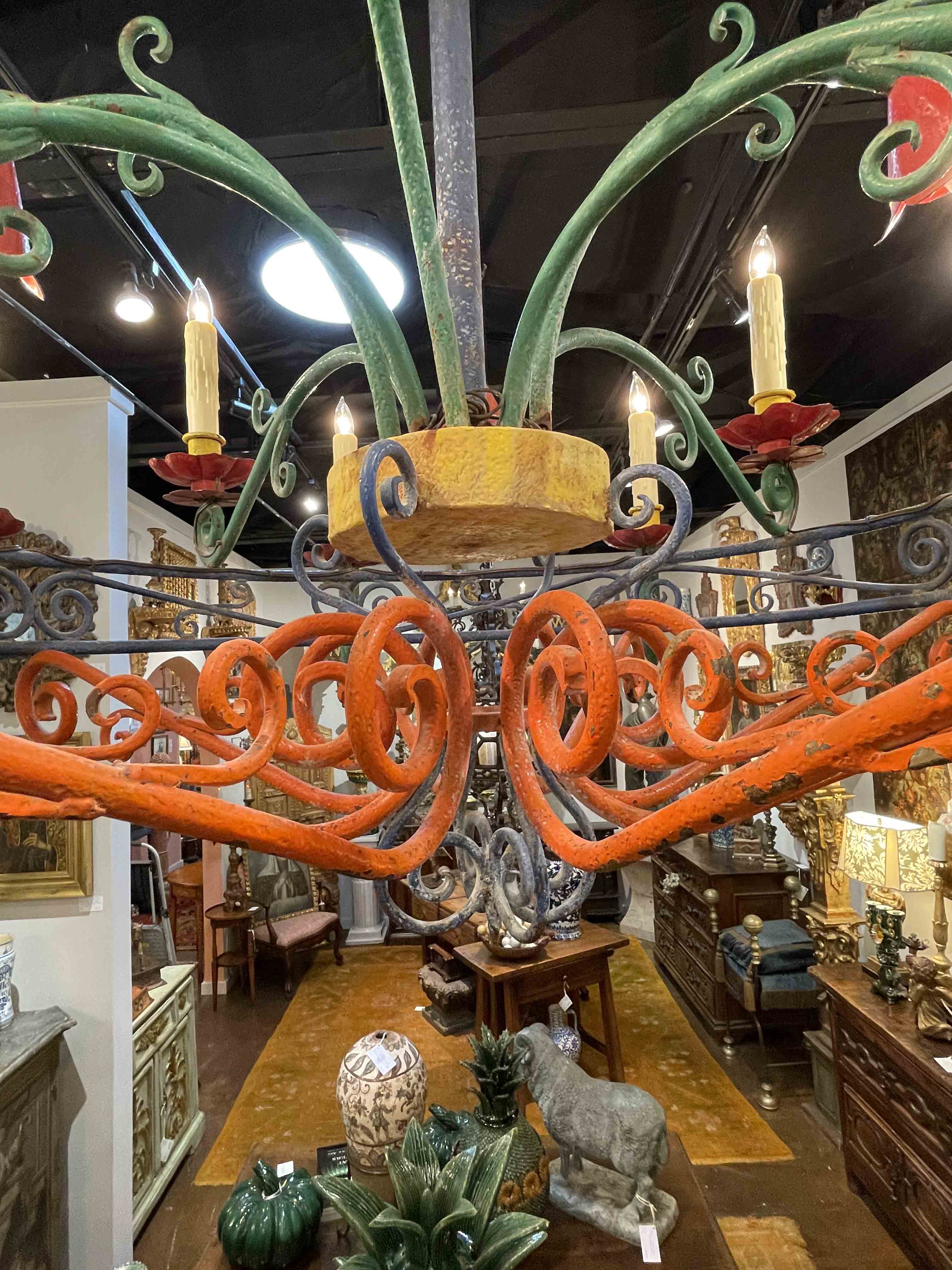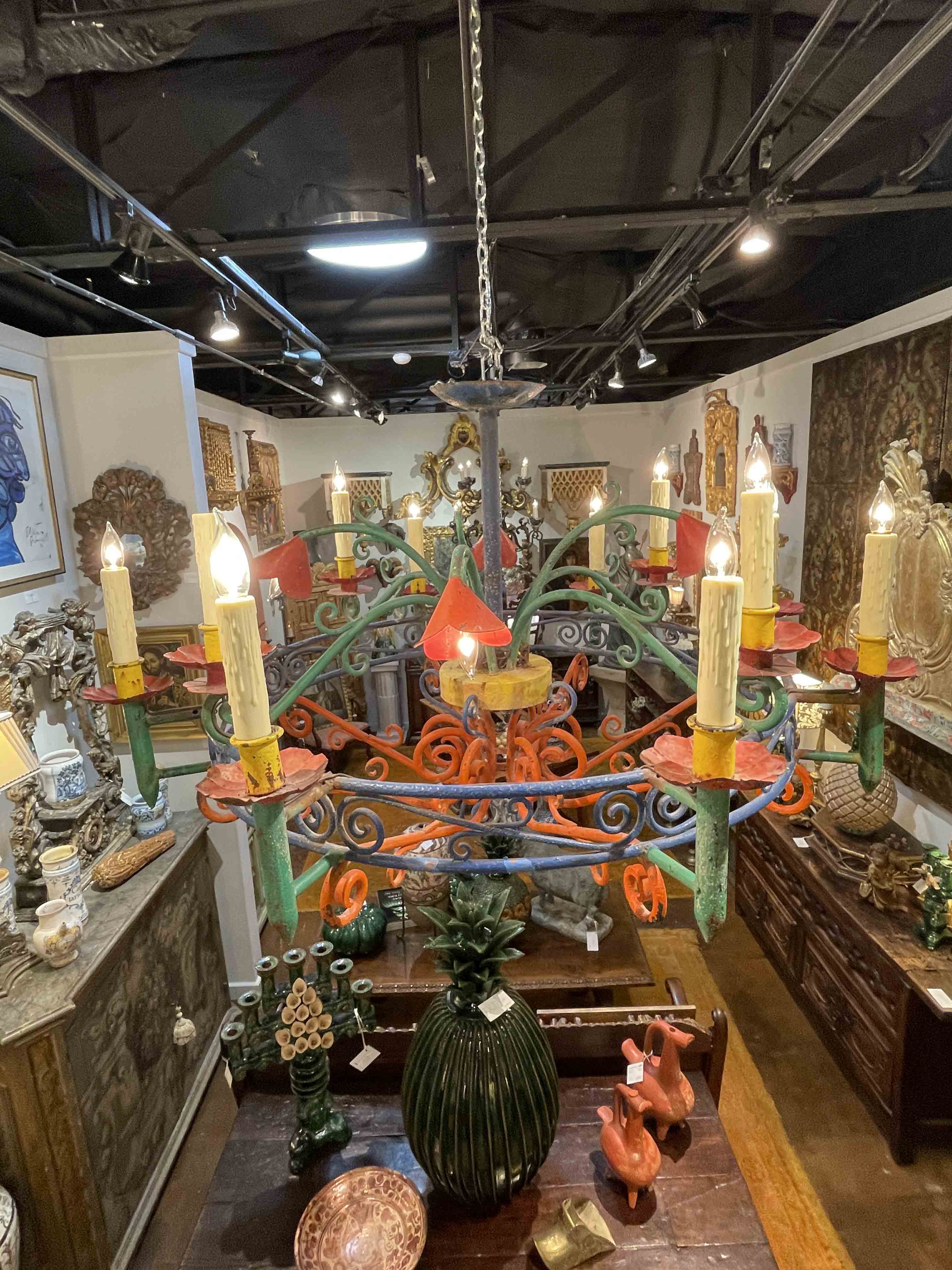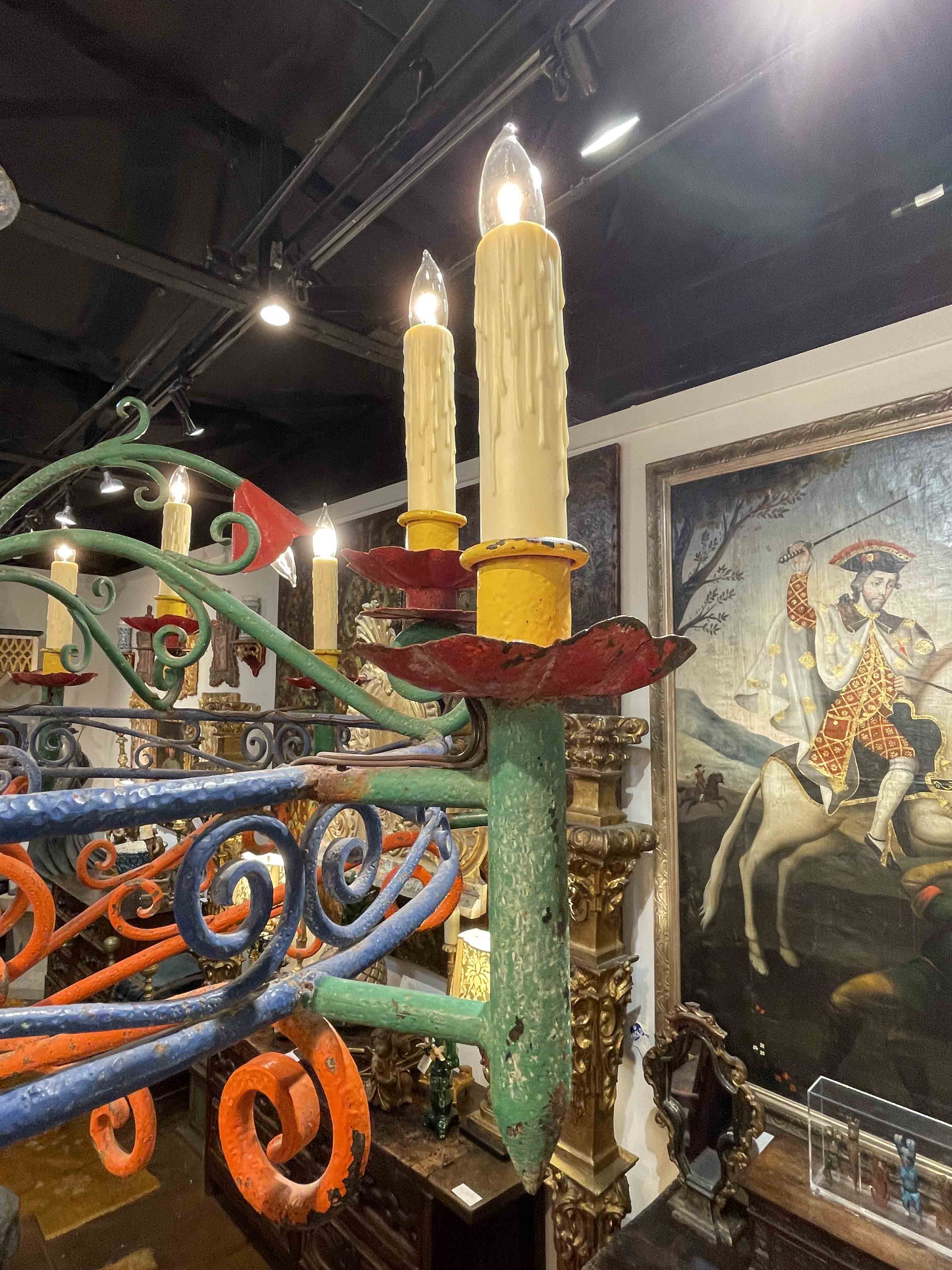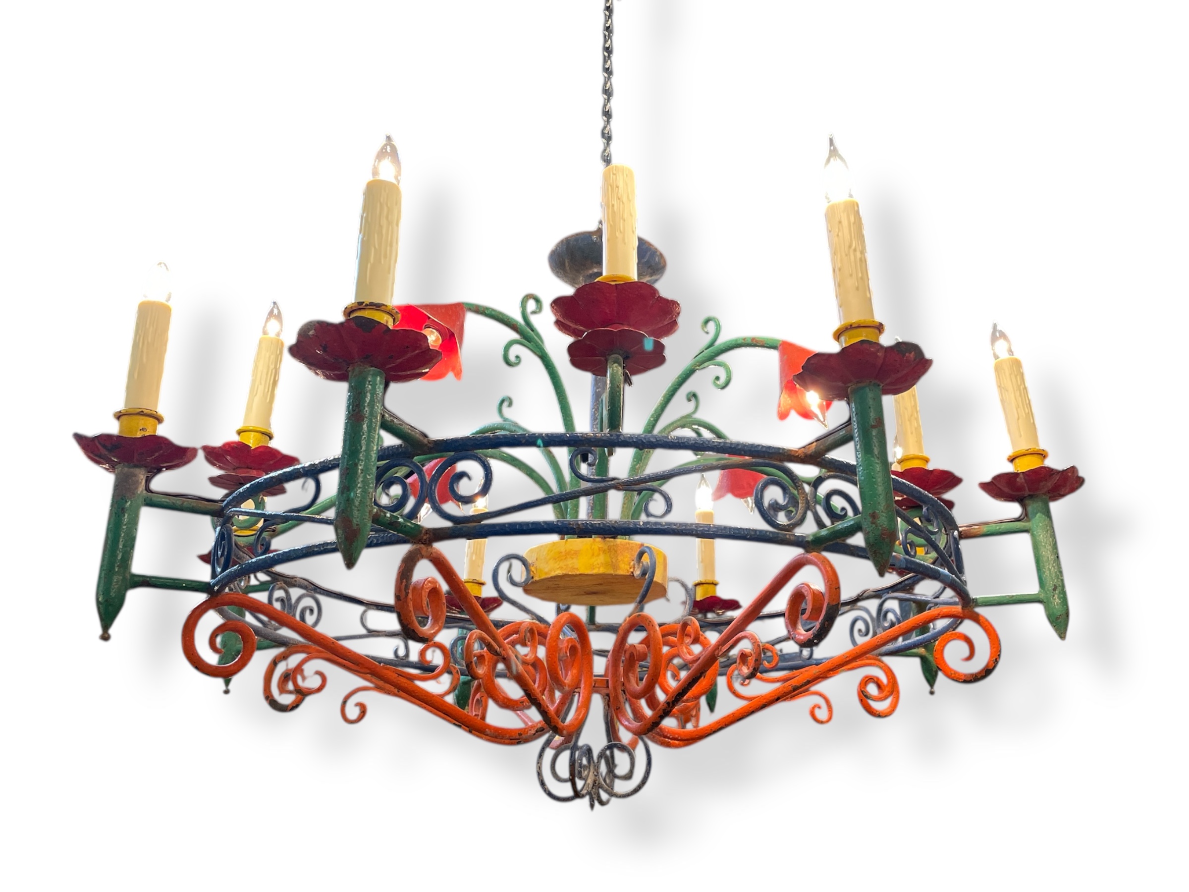 Mexican hand wrought painted iron chandelier with flowers; cleaned and rewired.