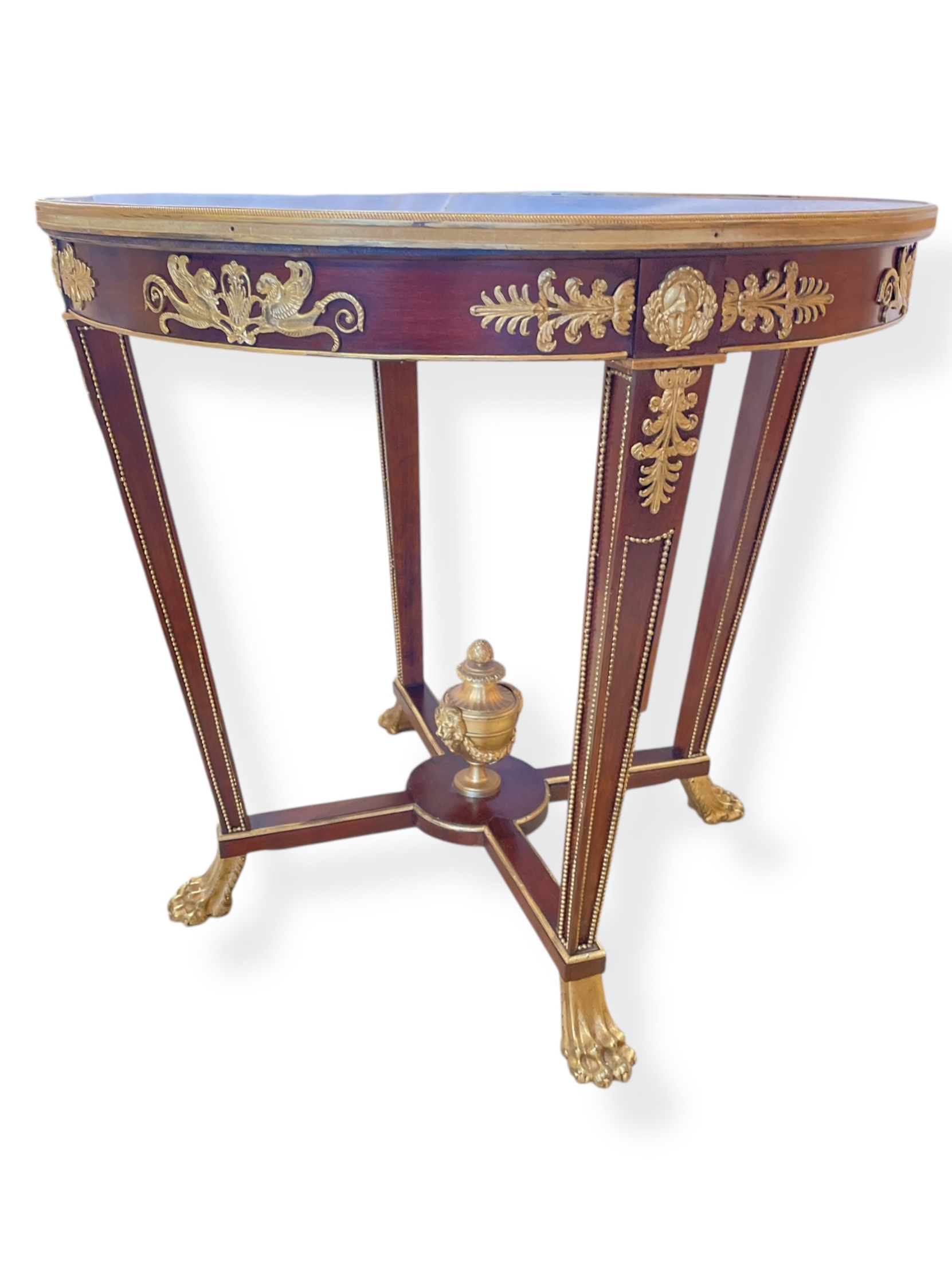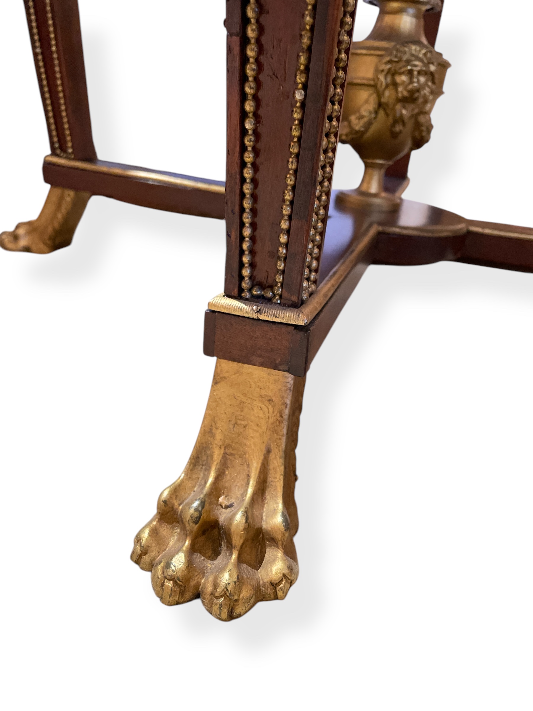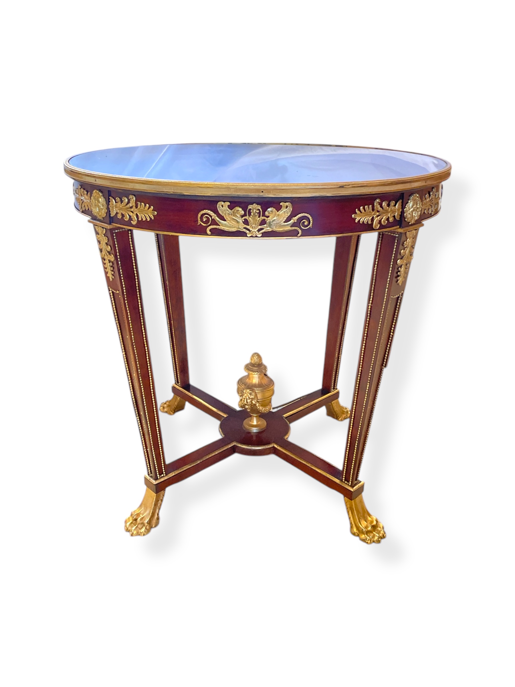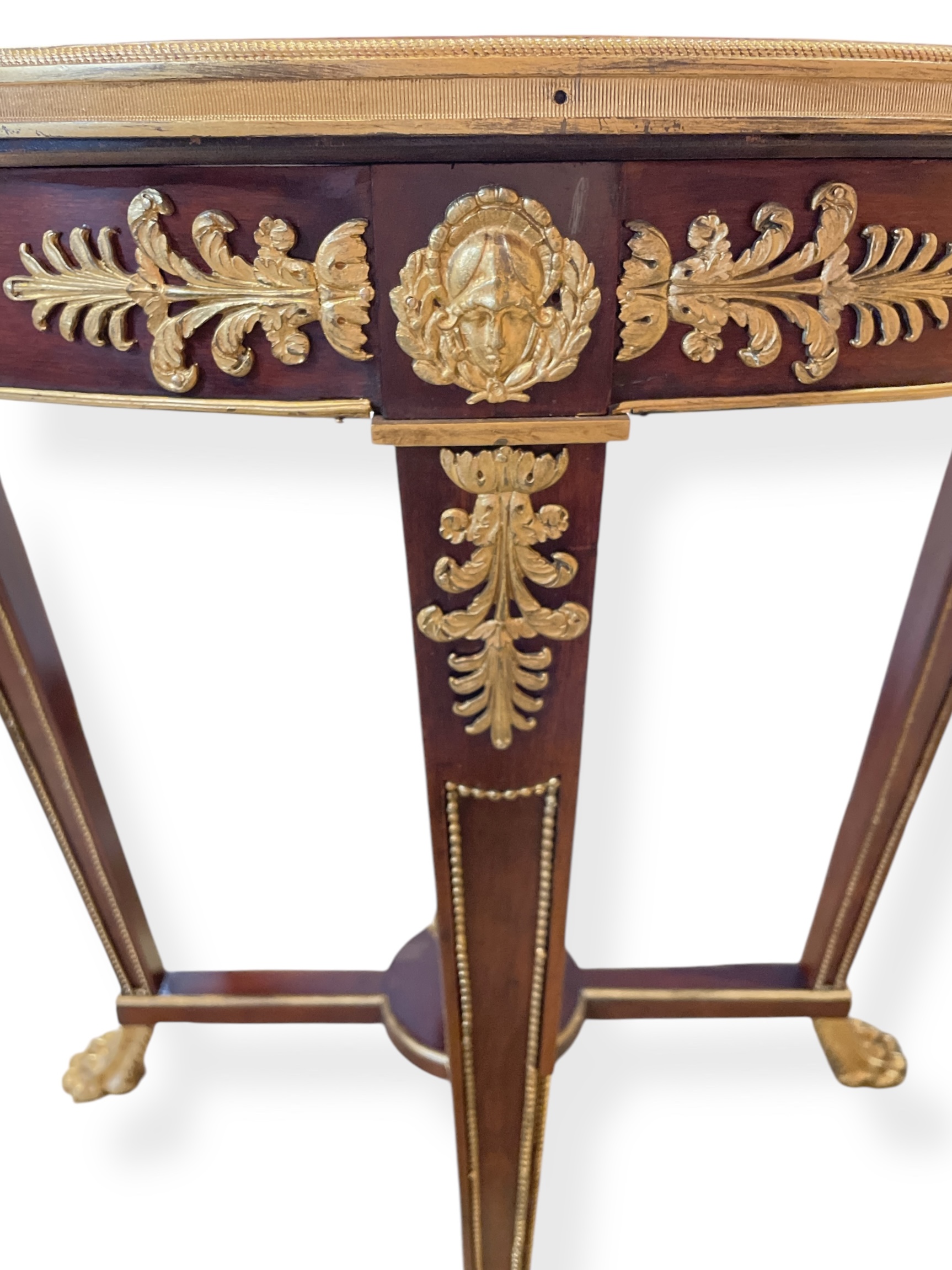 19th C French Louis XVI style mahogany gueridon with gilt bronze mounts; glass top added for protection.