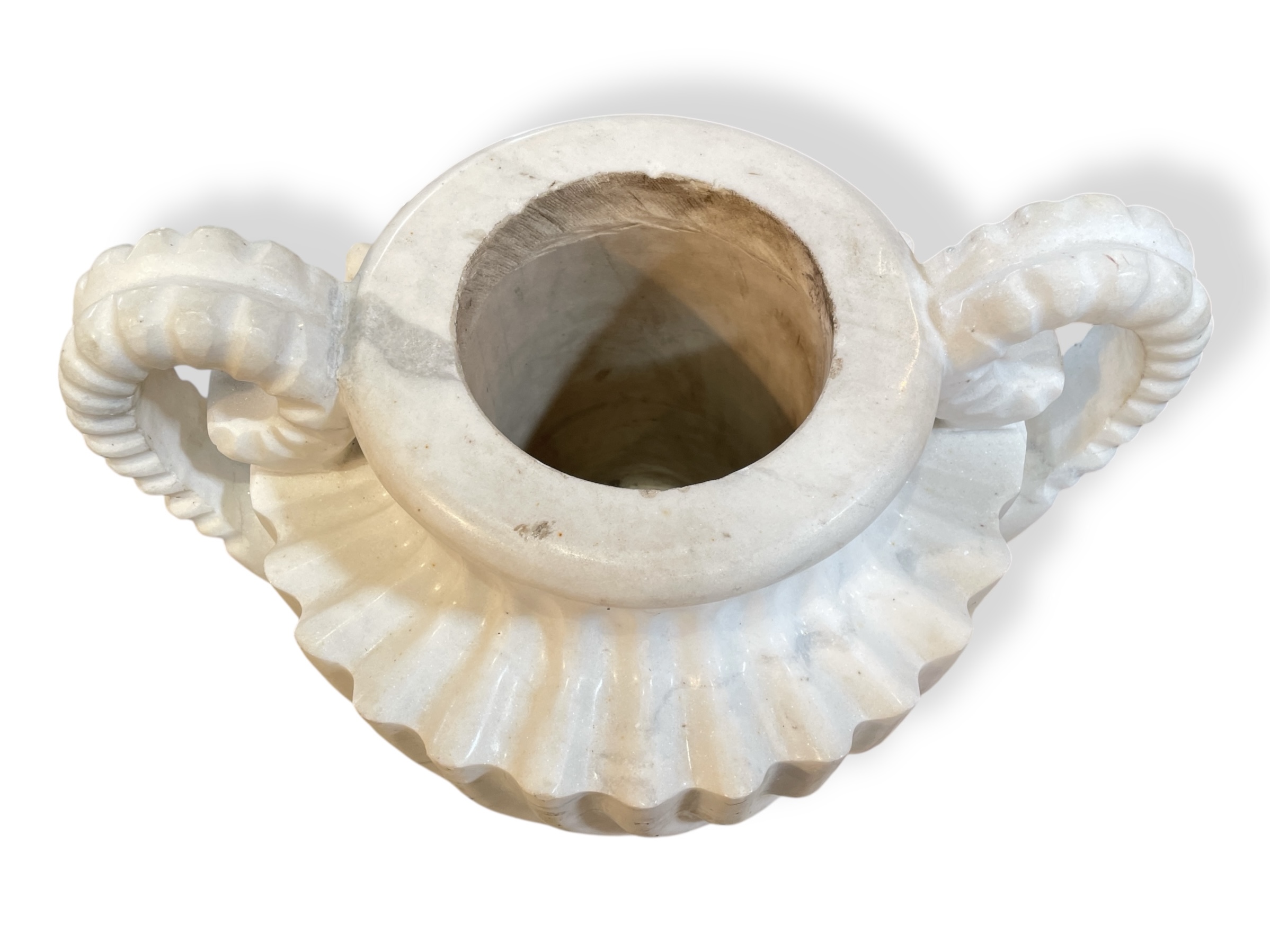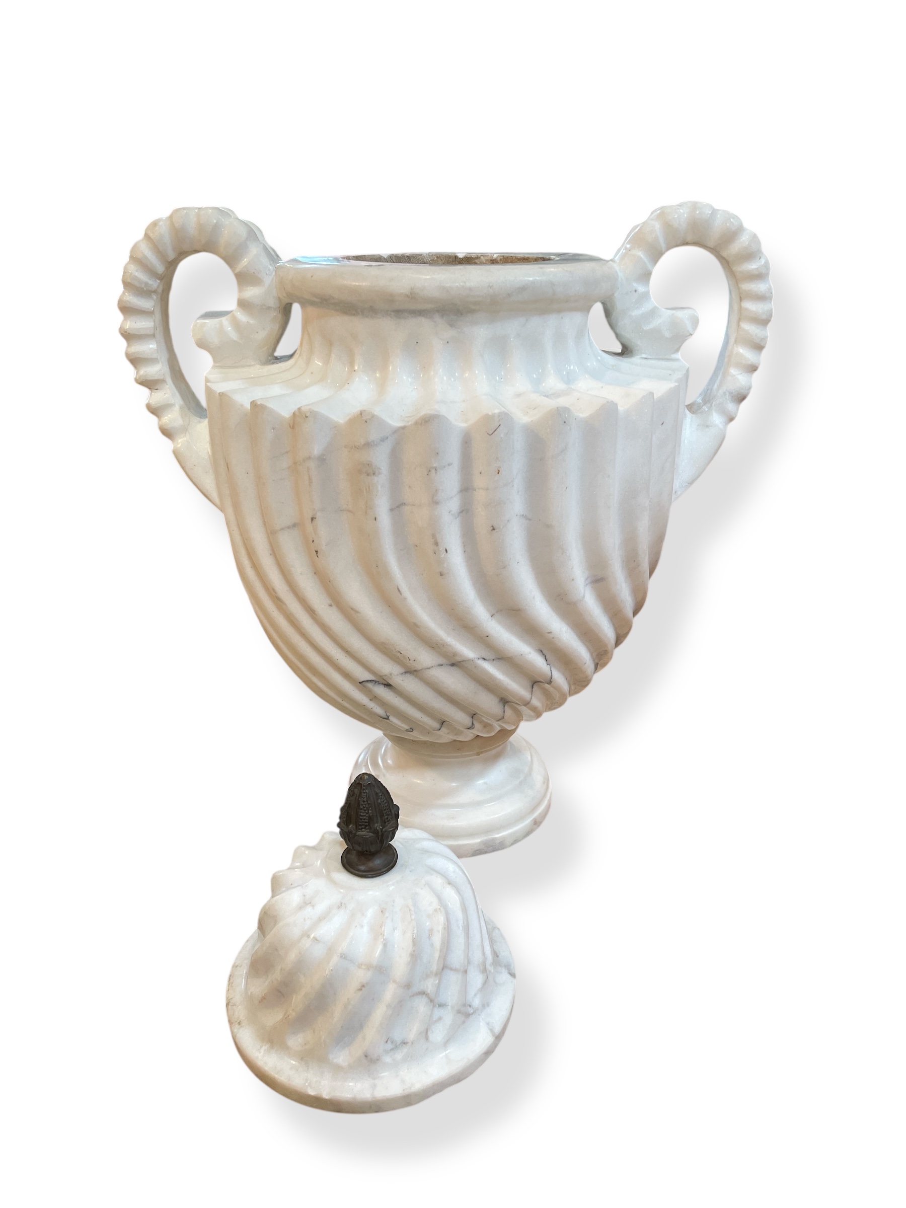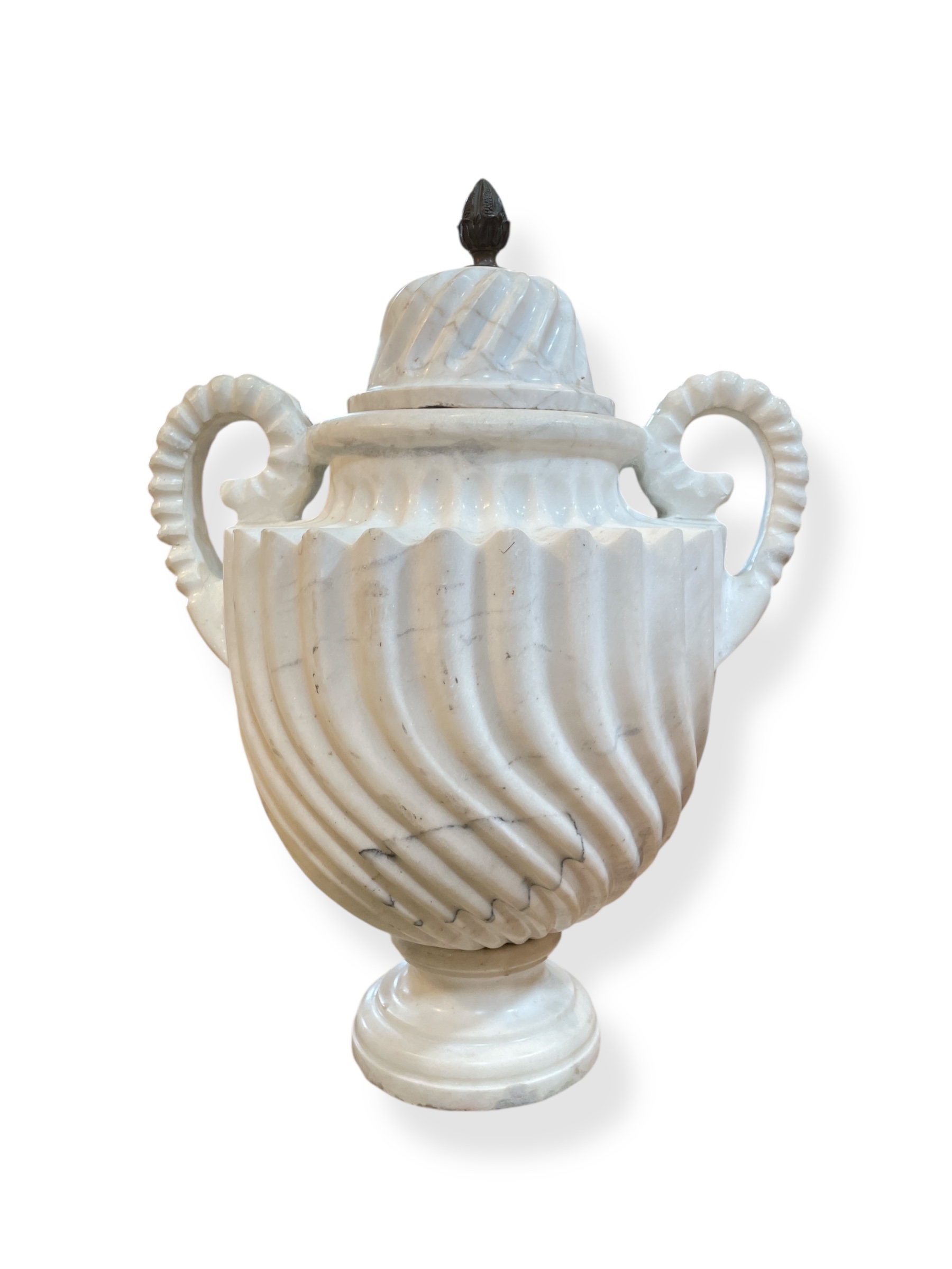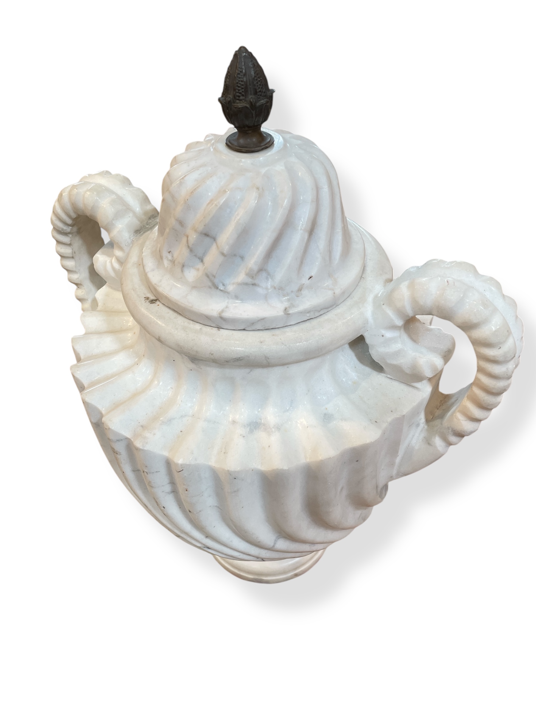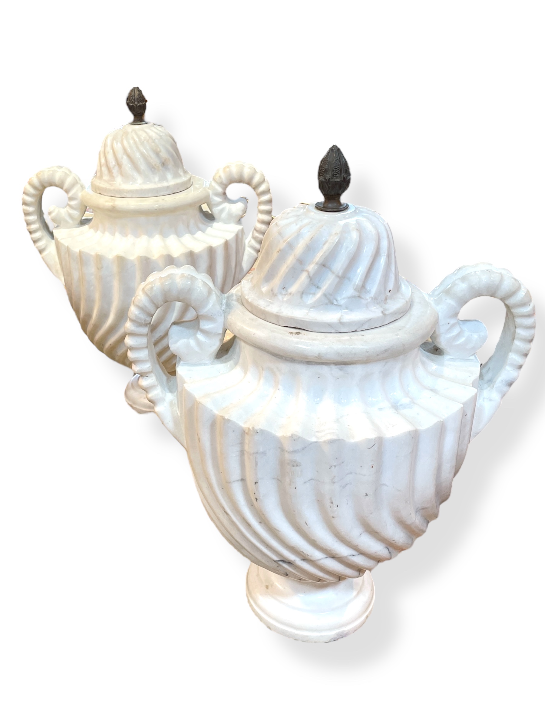 A pair of large neoclassical-style Carrara marble lidded urns with carved swirls.