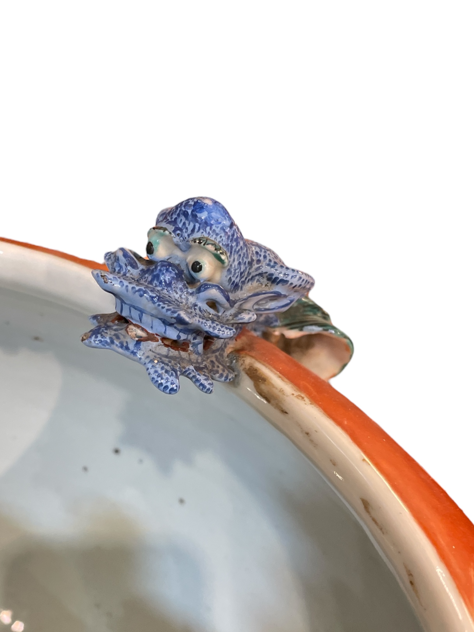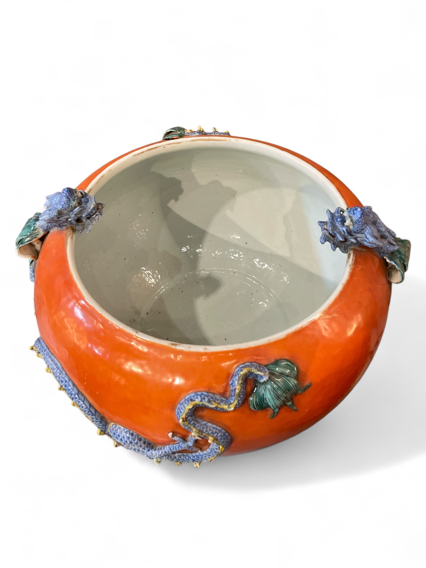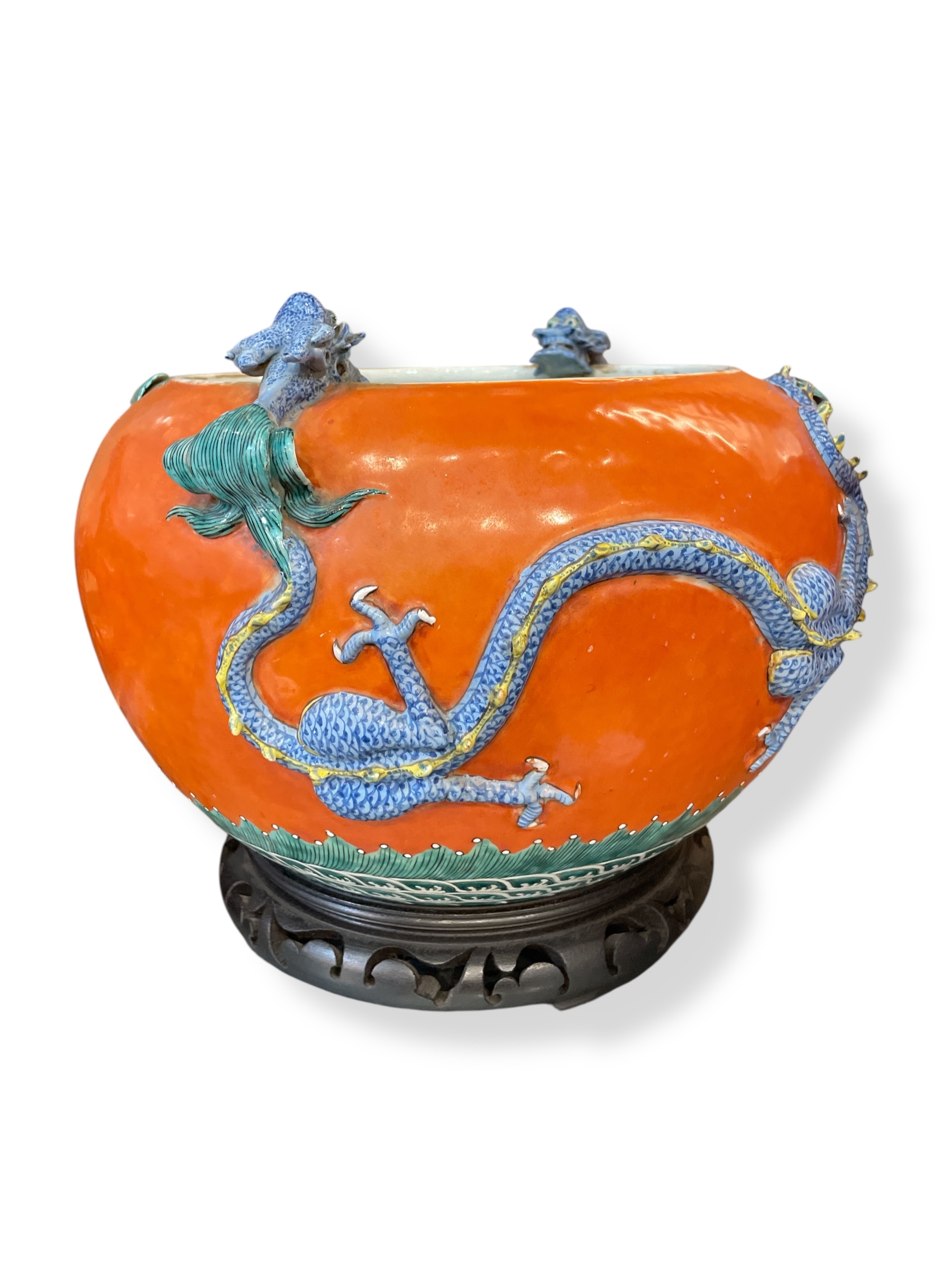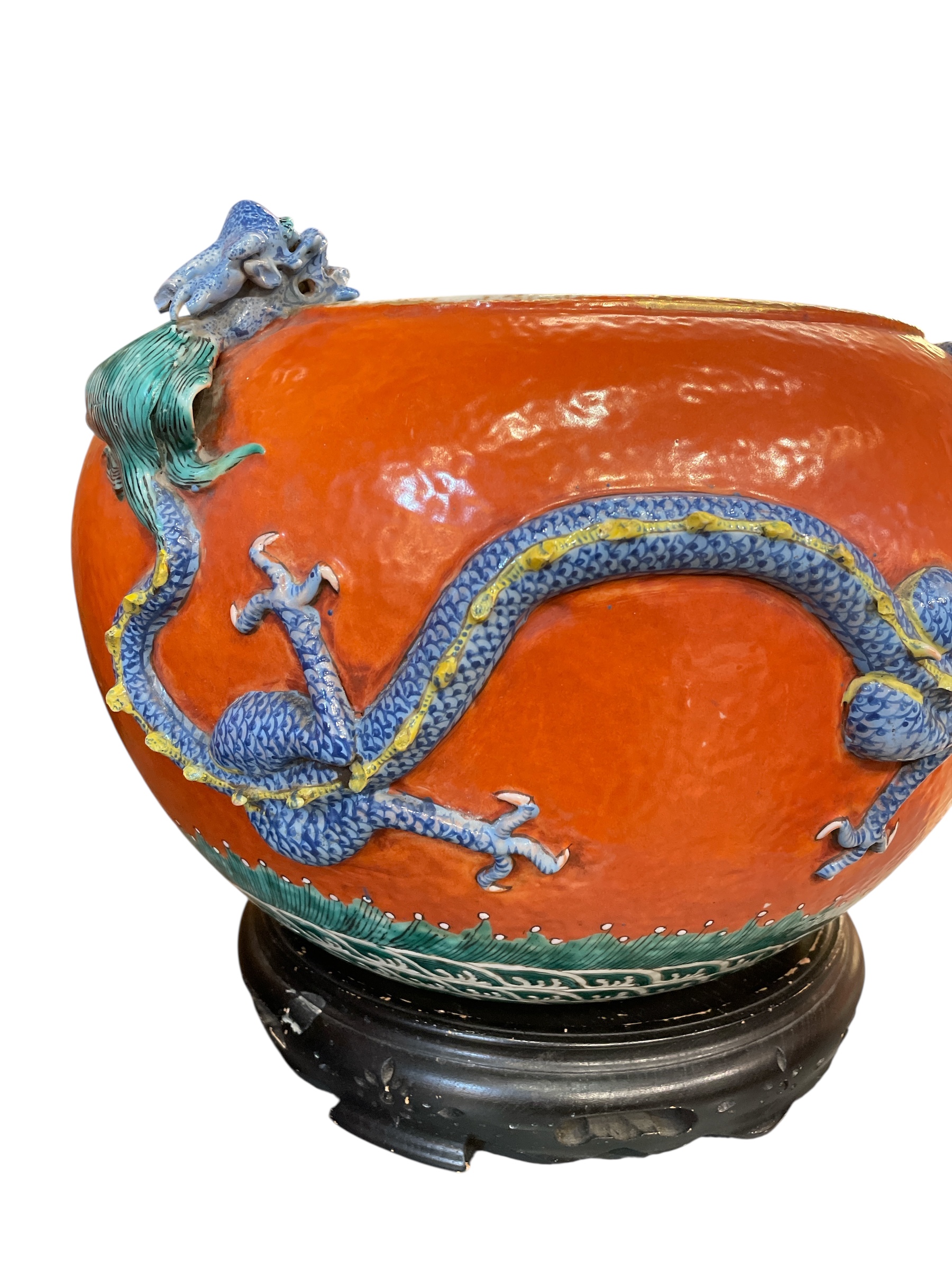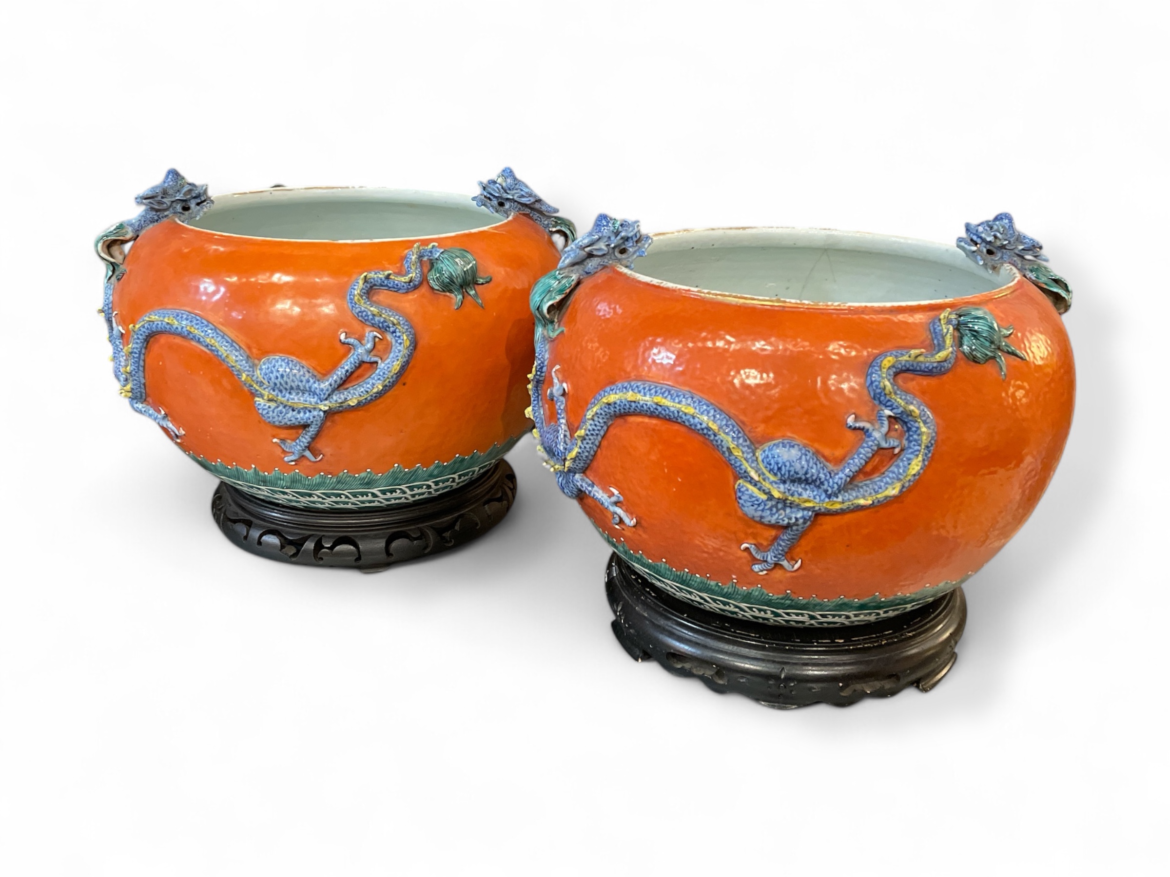 Pair of Chinese polychrome enameled porcelain jardinieres w/ applied dragons above enameled waves, on stands. Late 19th C. (Professional repairs)