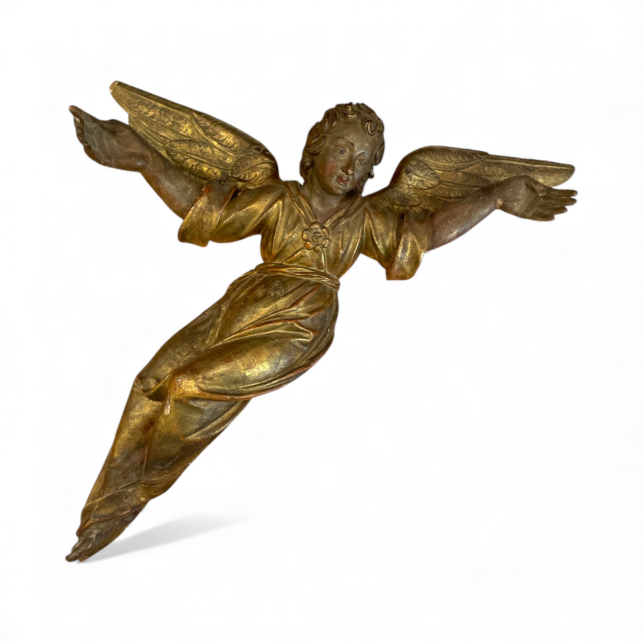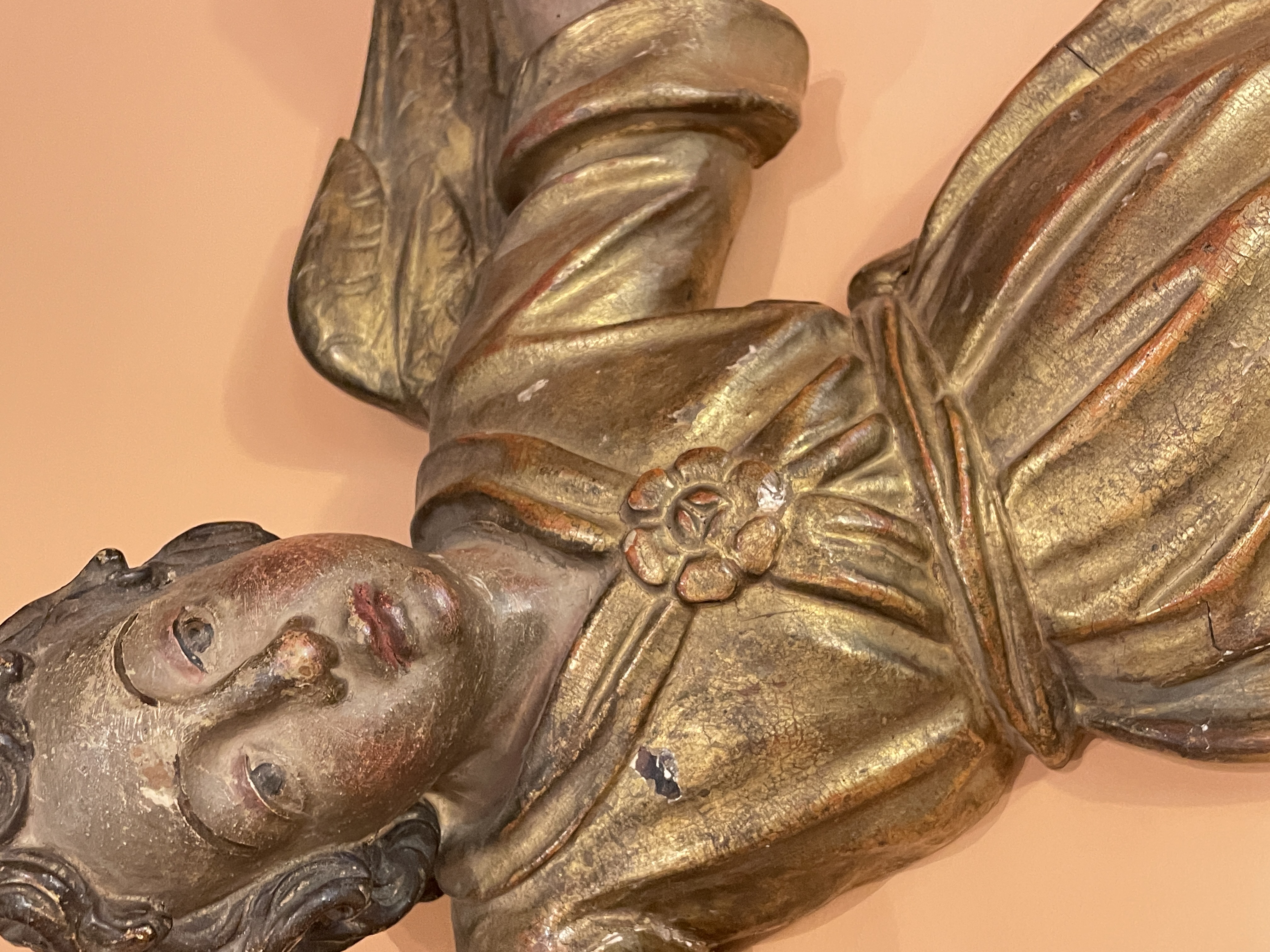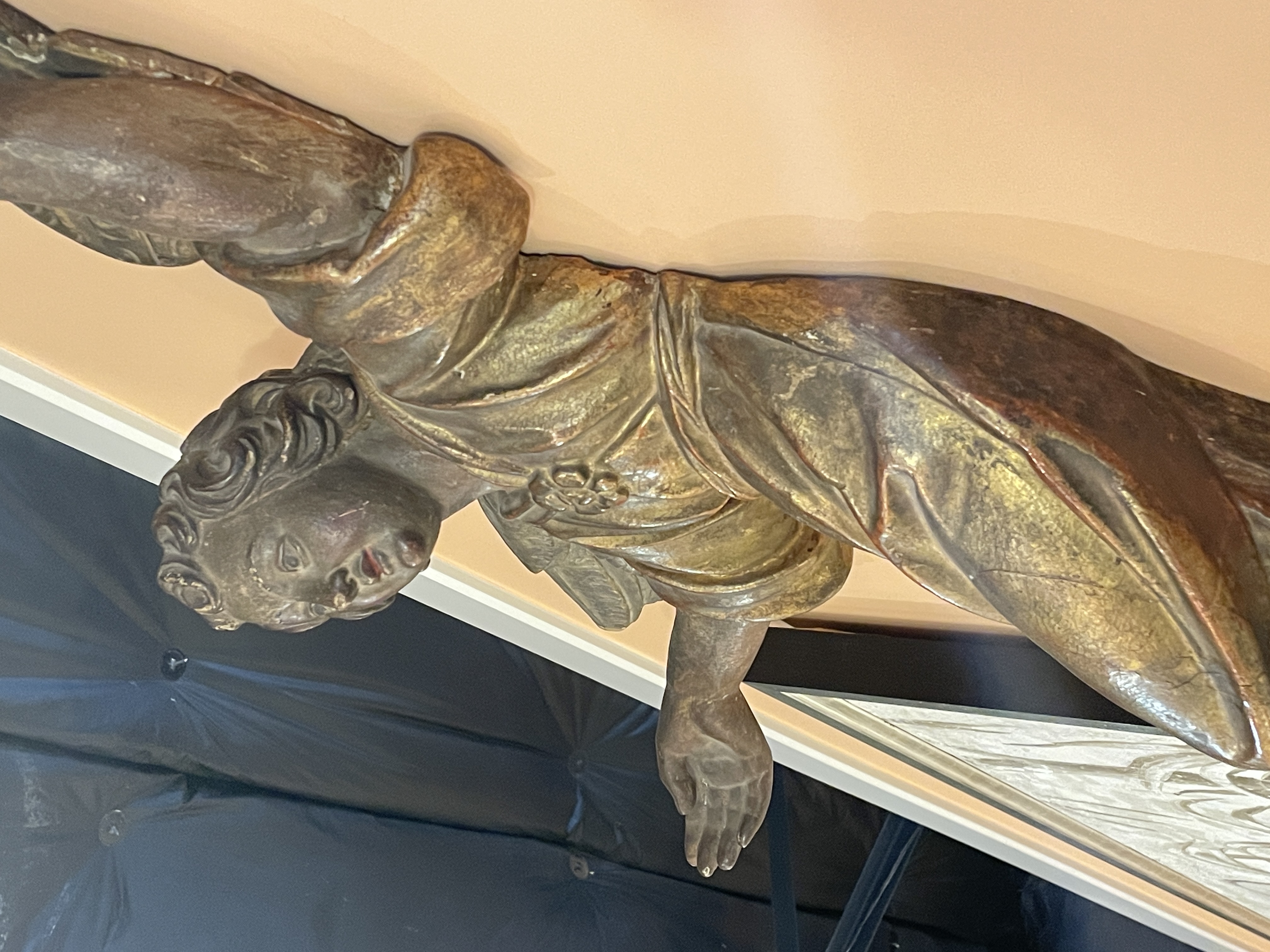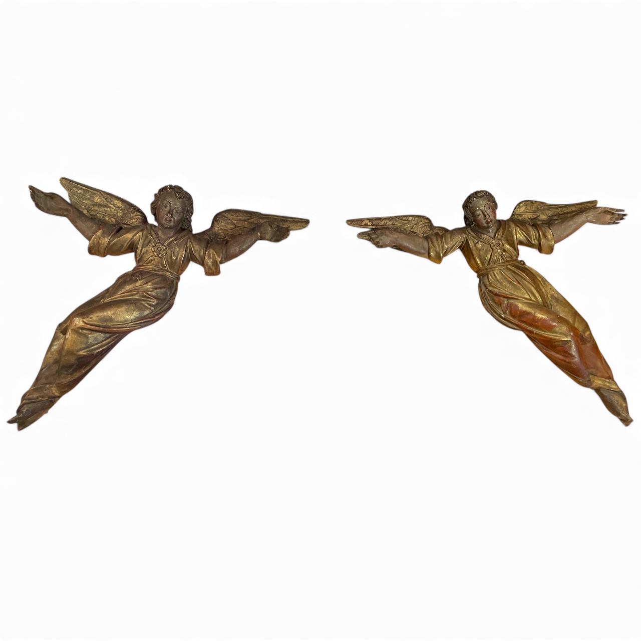 Pair of Italian (Tuscan) carved polychrome and parcel gilt angels c.1620 made to hang on wall.