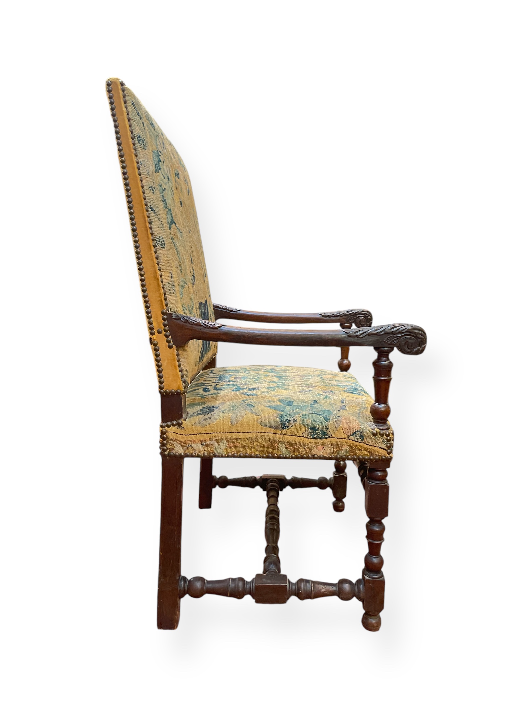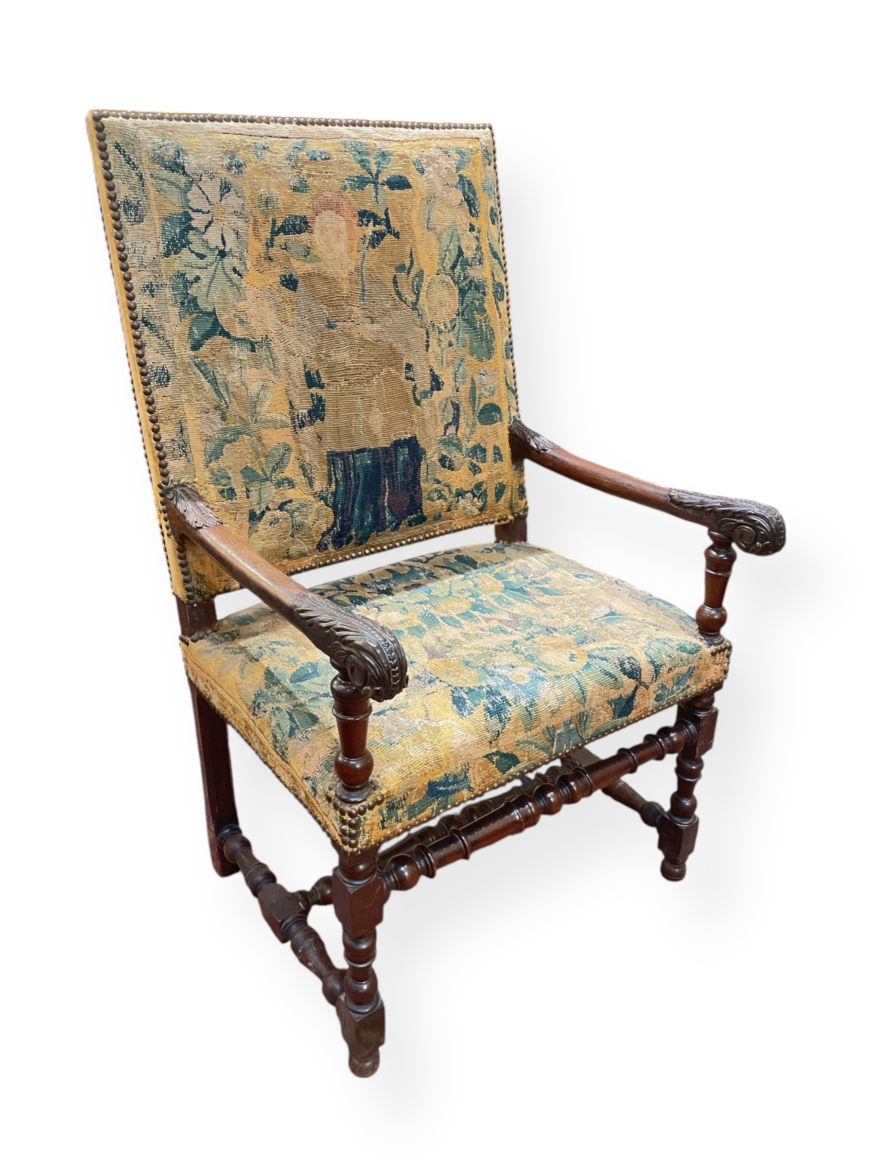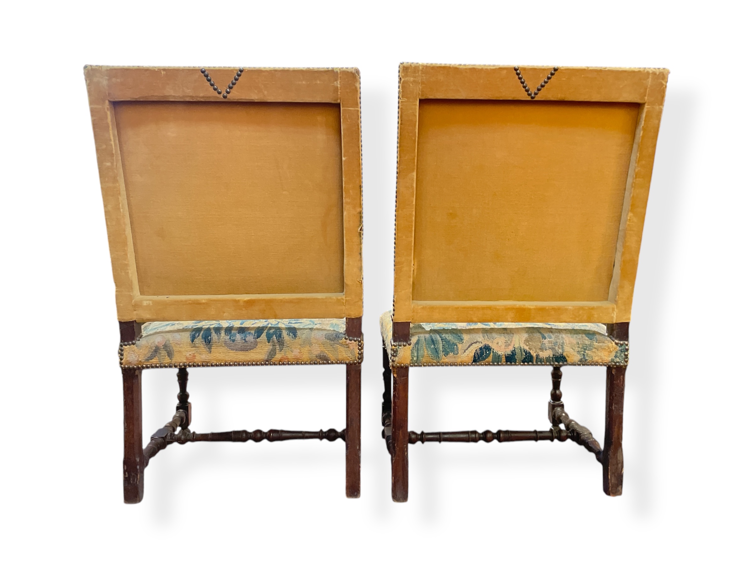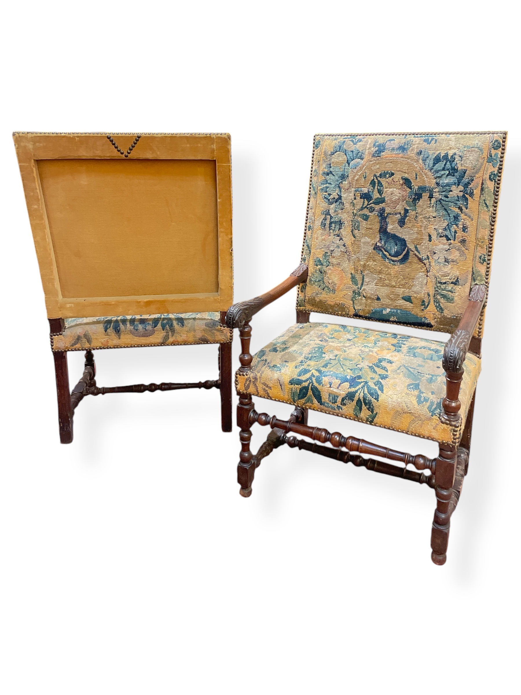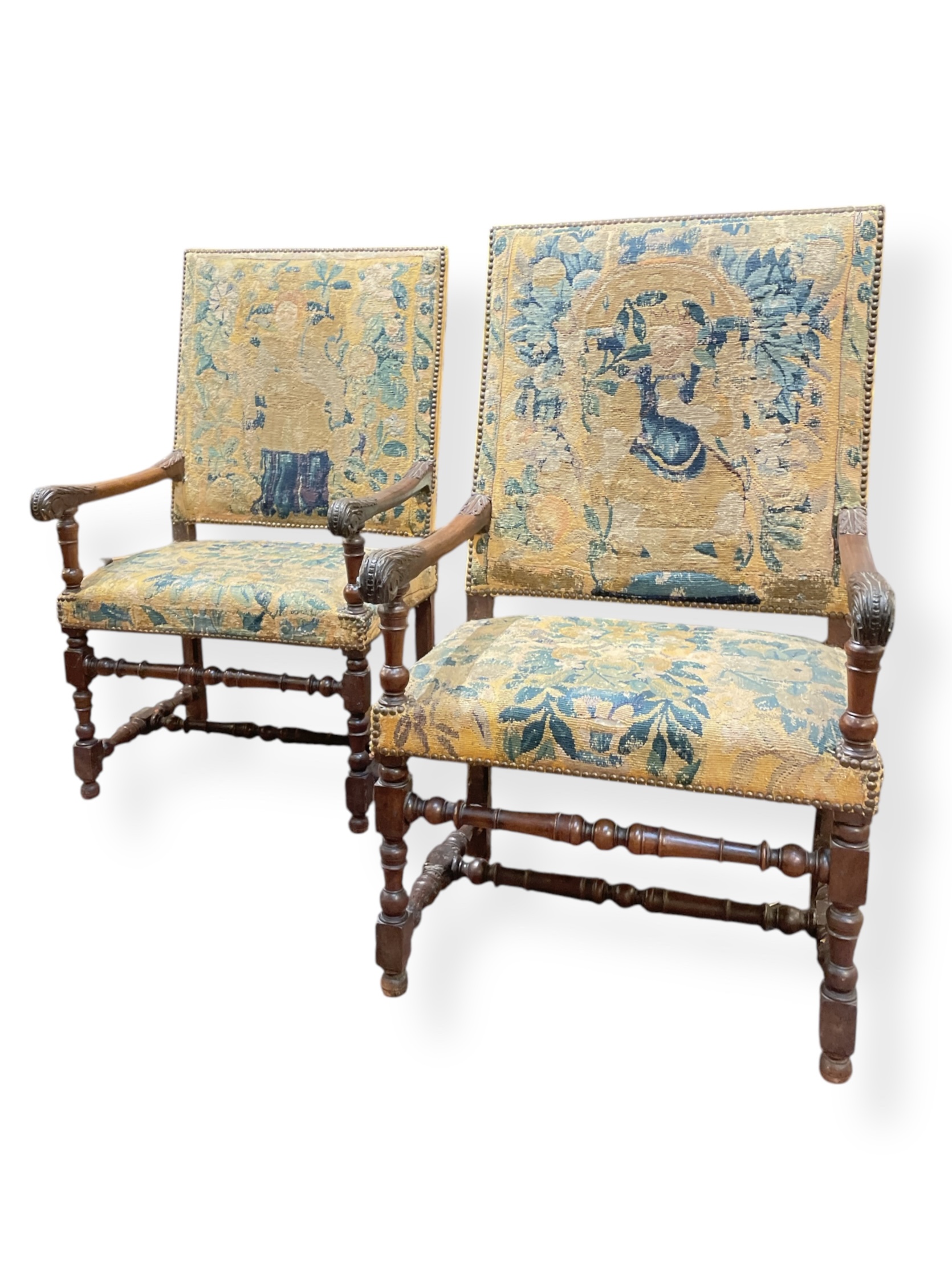 Pair of 18th C French carved oak chairs w/ exquisite 17th C tapestry and antique velvet upholstery.