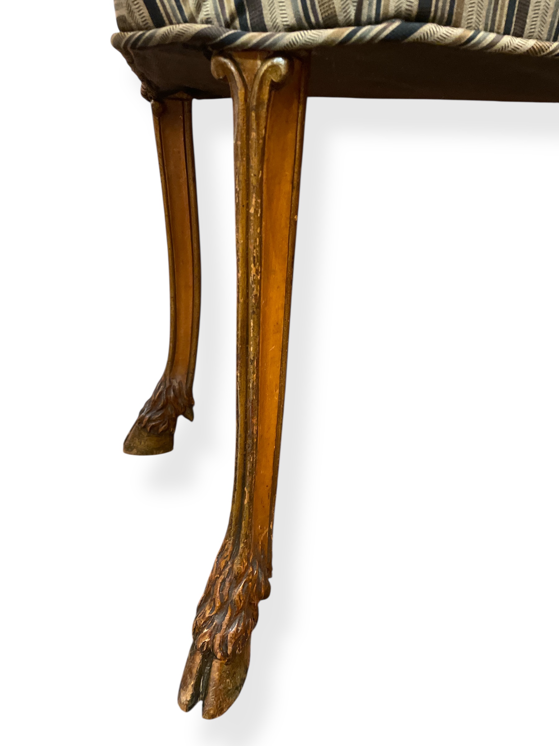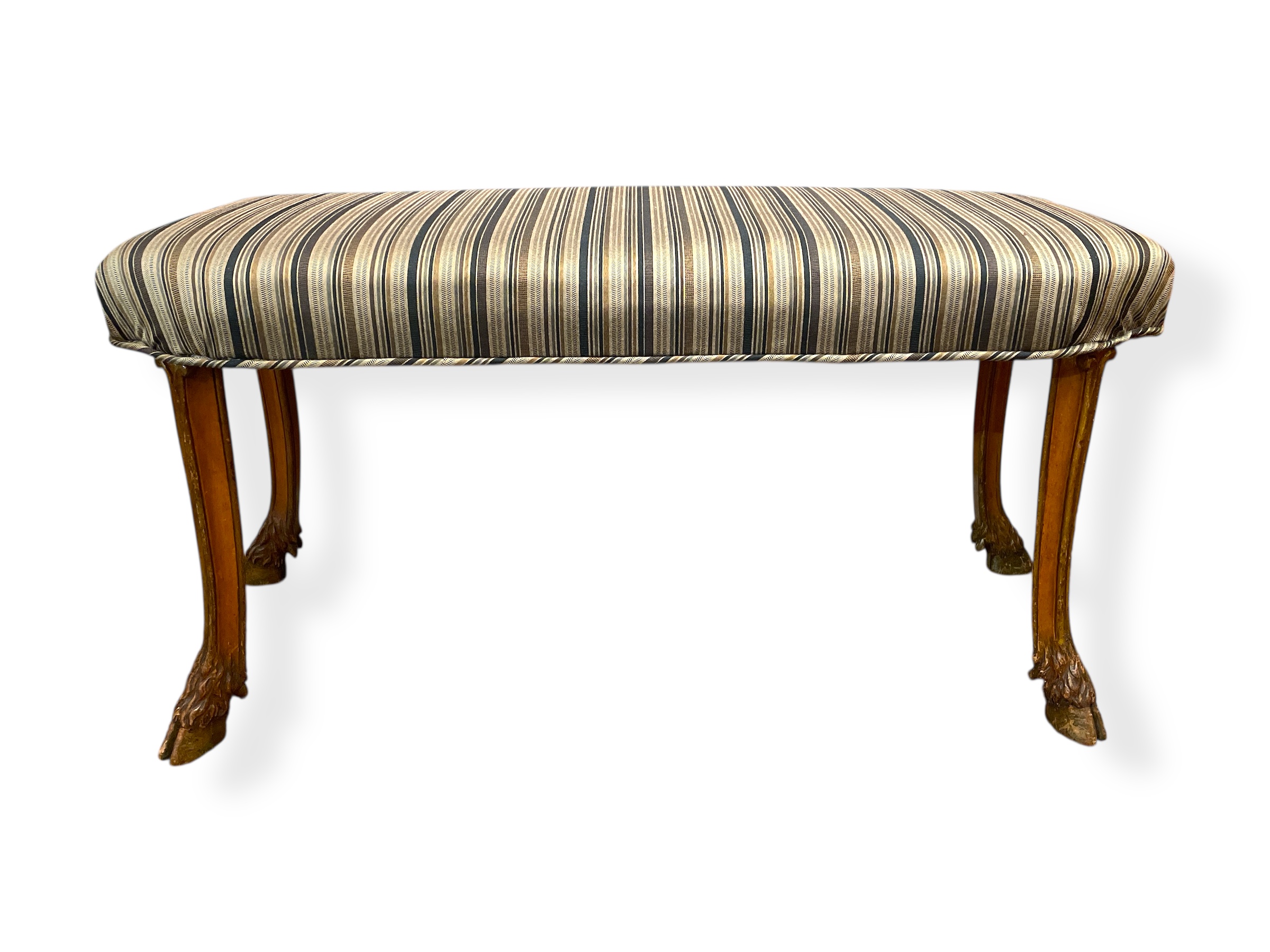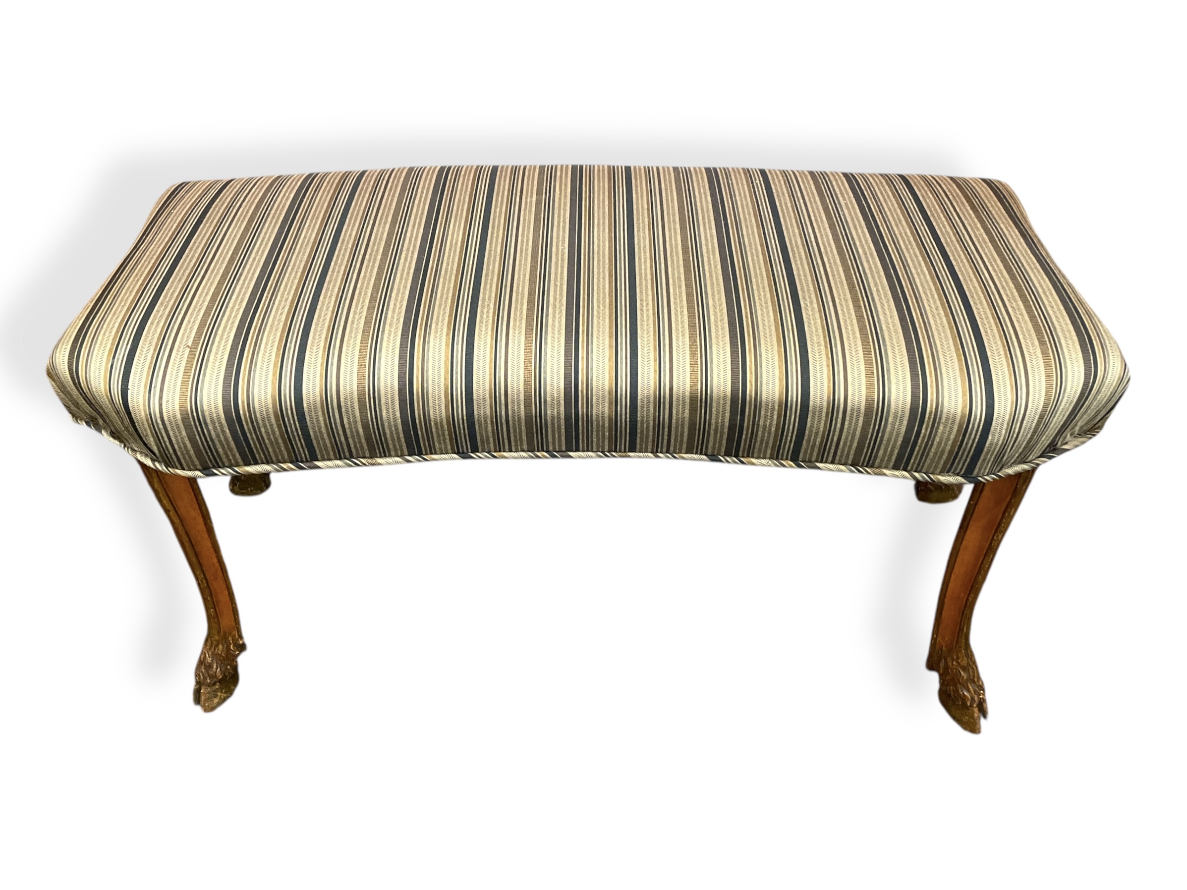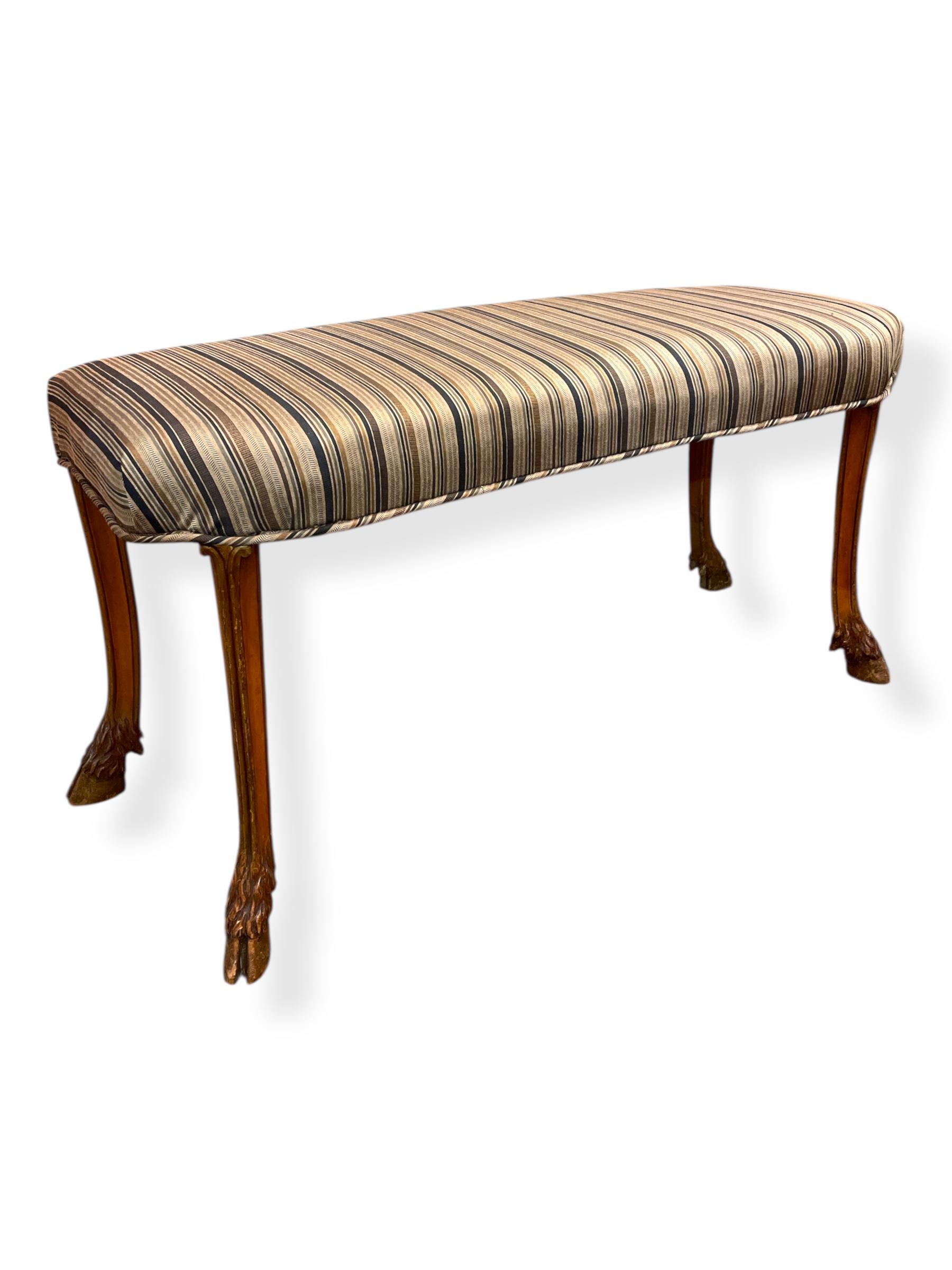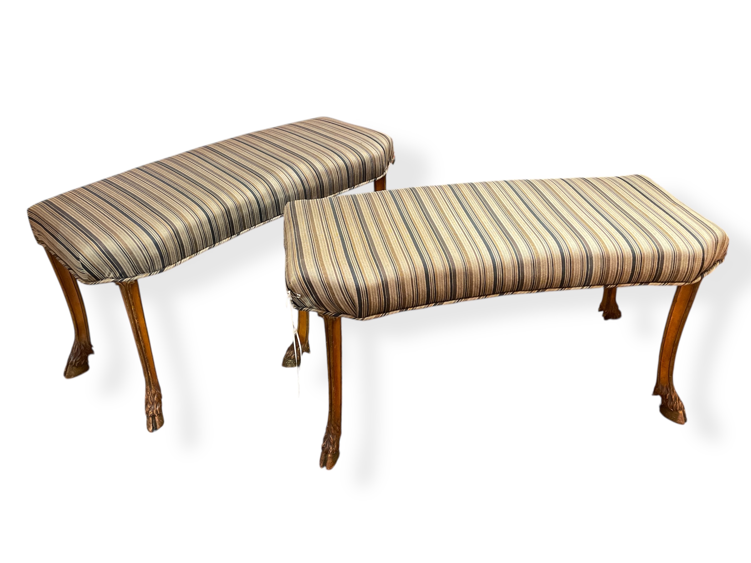 Pair of Italian kidney-shaped upholstered stools w/ carved hoof legs.
