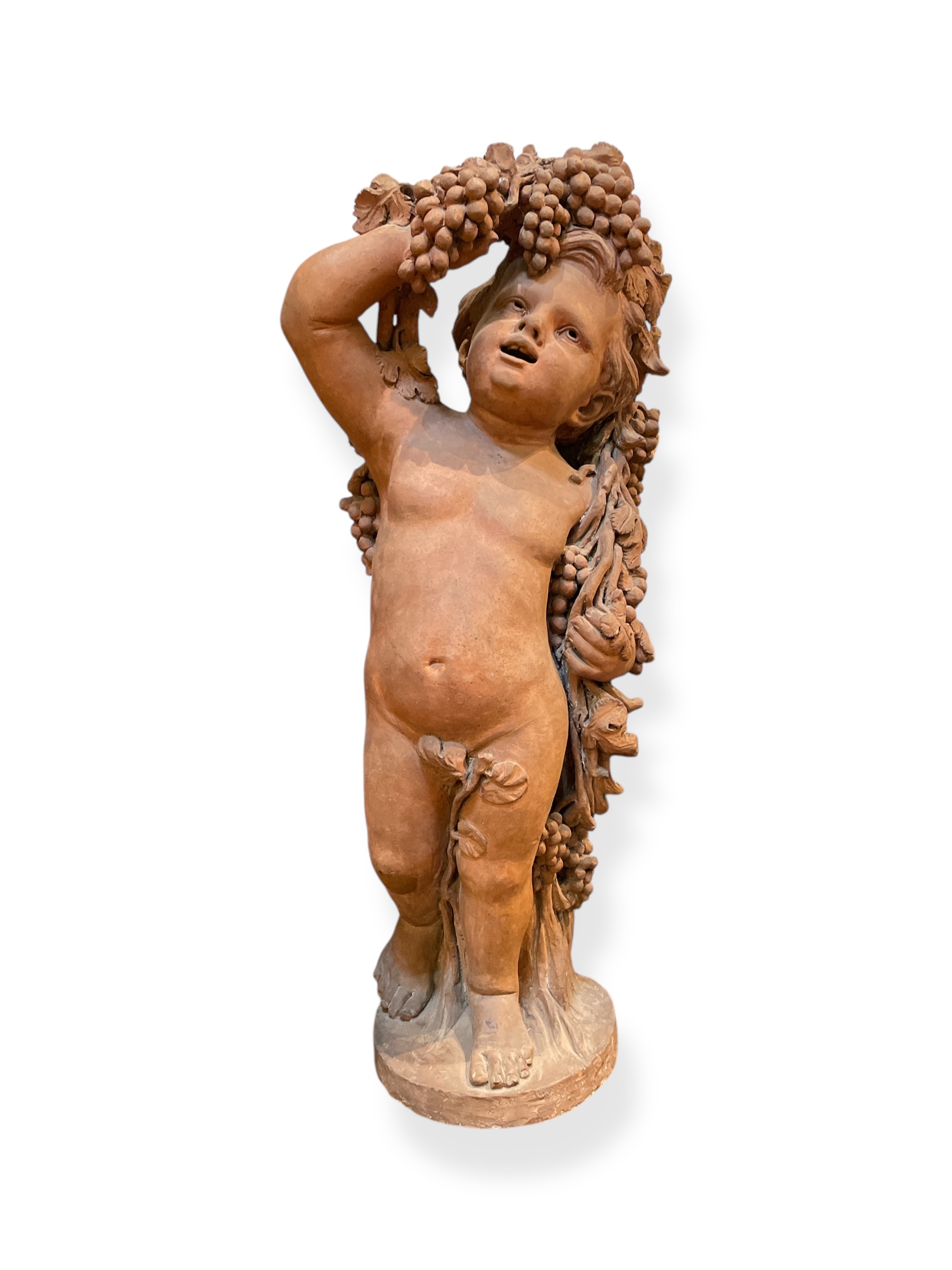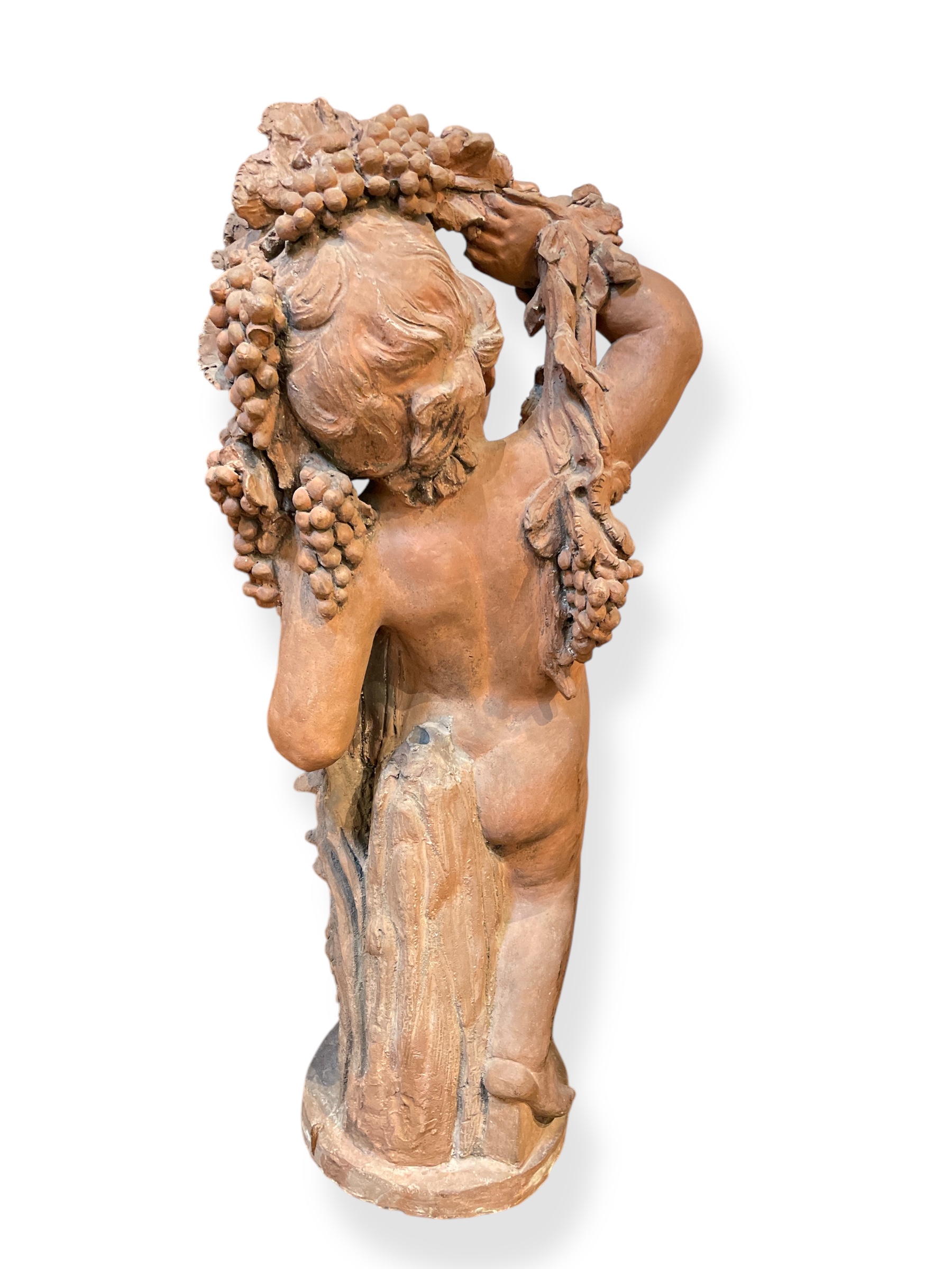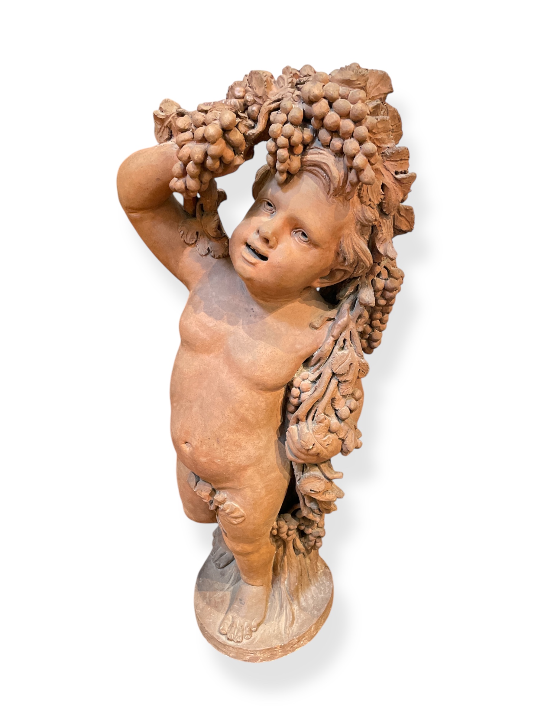 18th C Italian terra cotta putto fountain w/ hand-applied detailing (grapes) from a palazzo in Empoli, Italy.