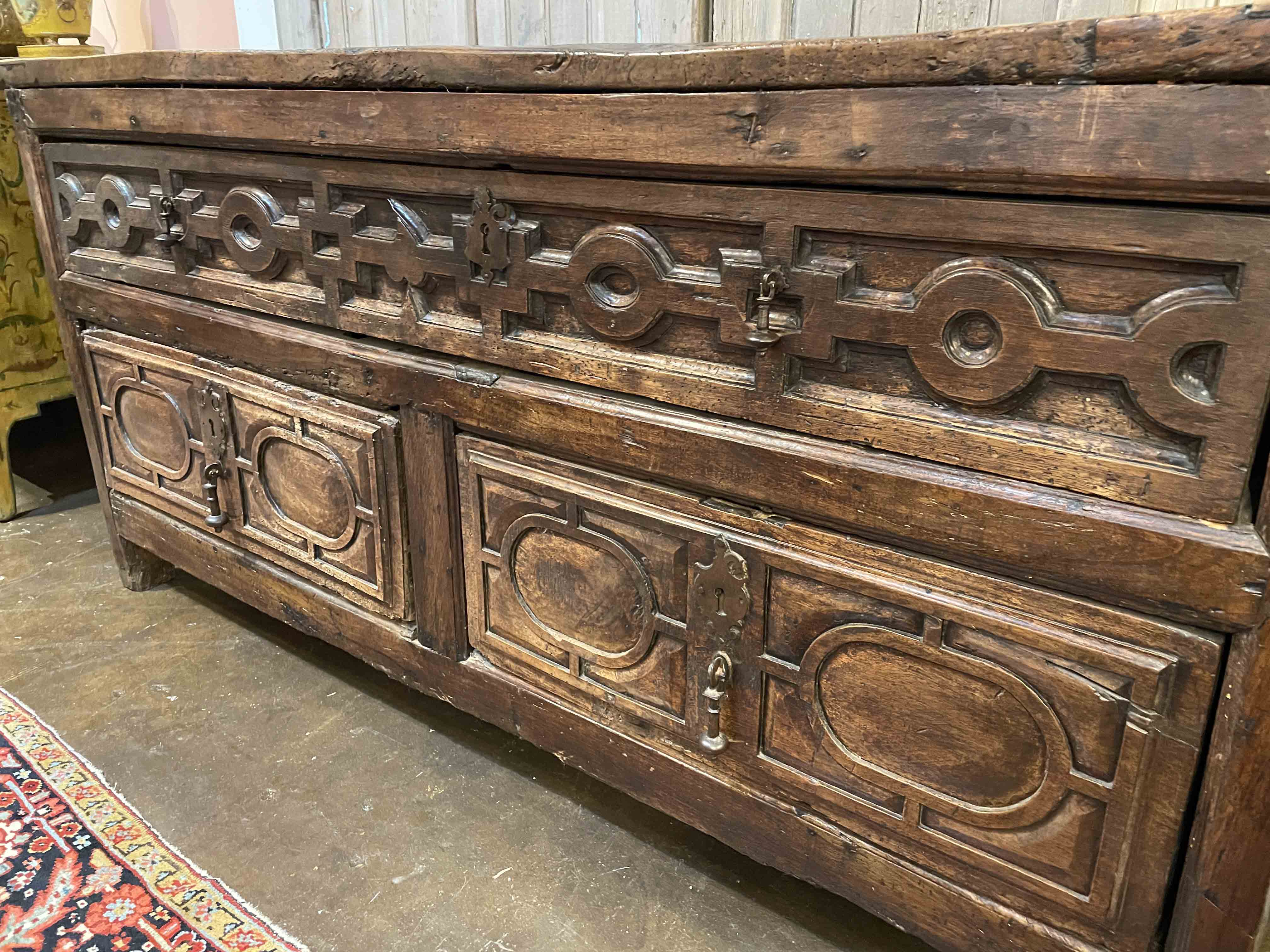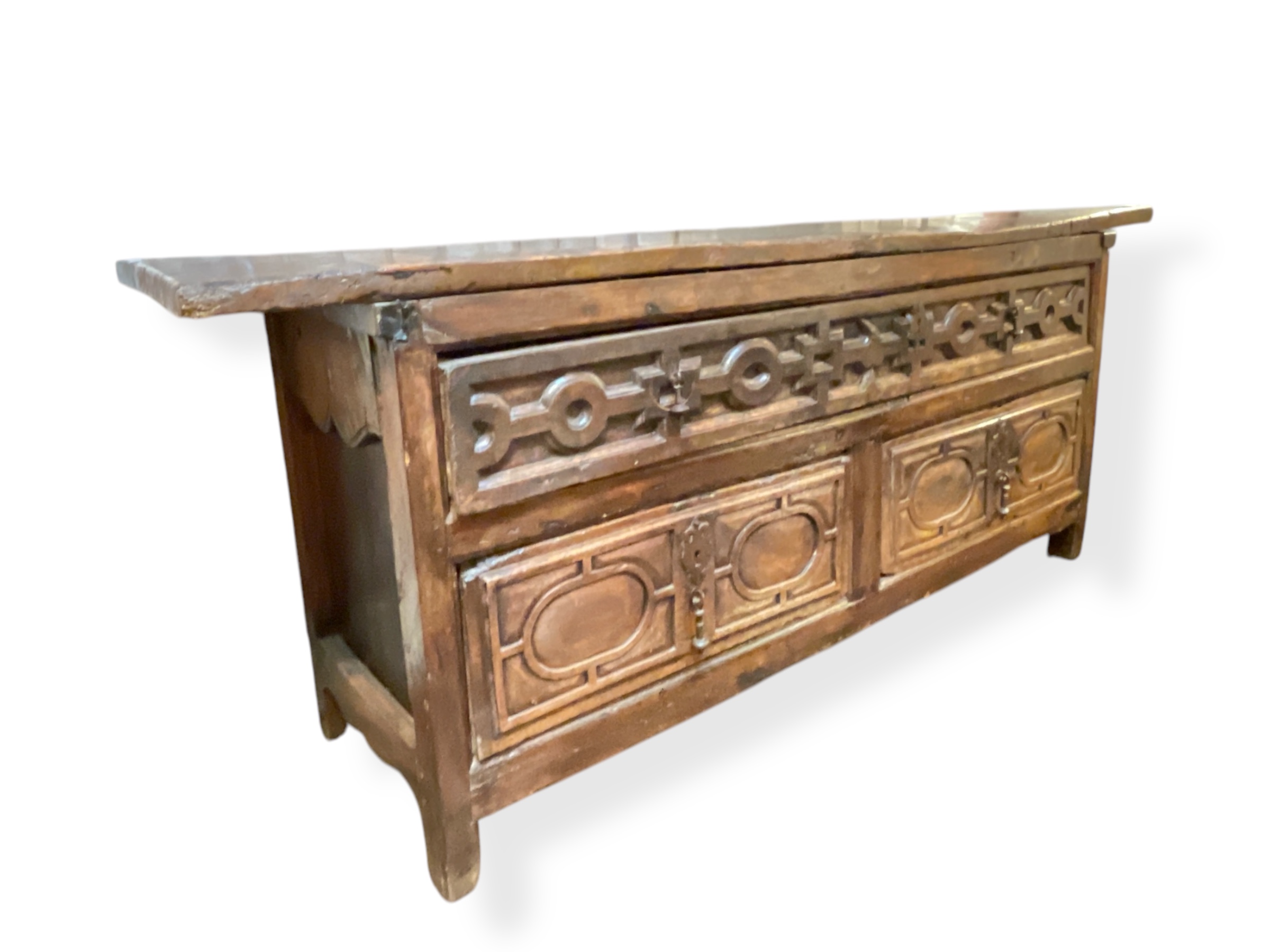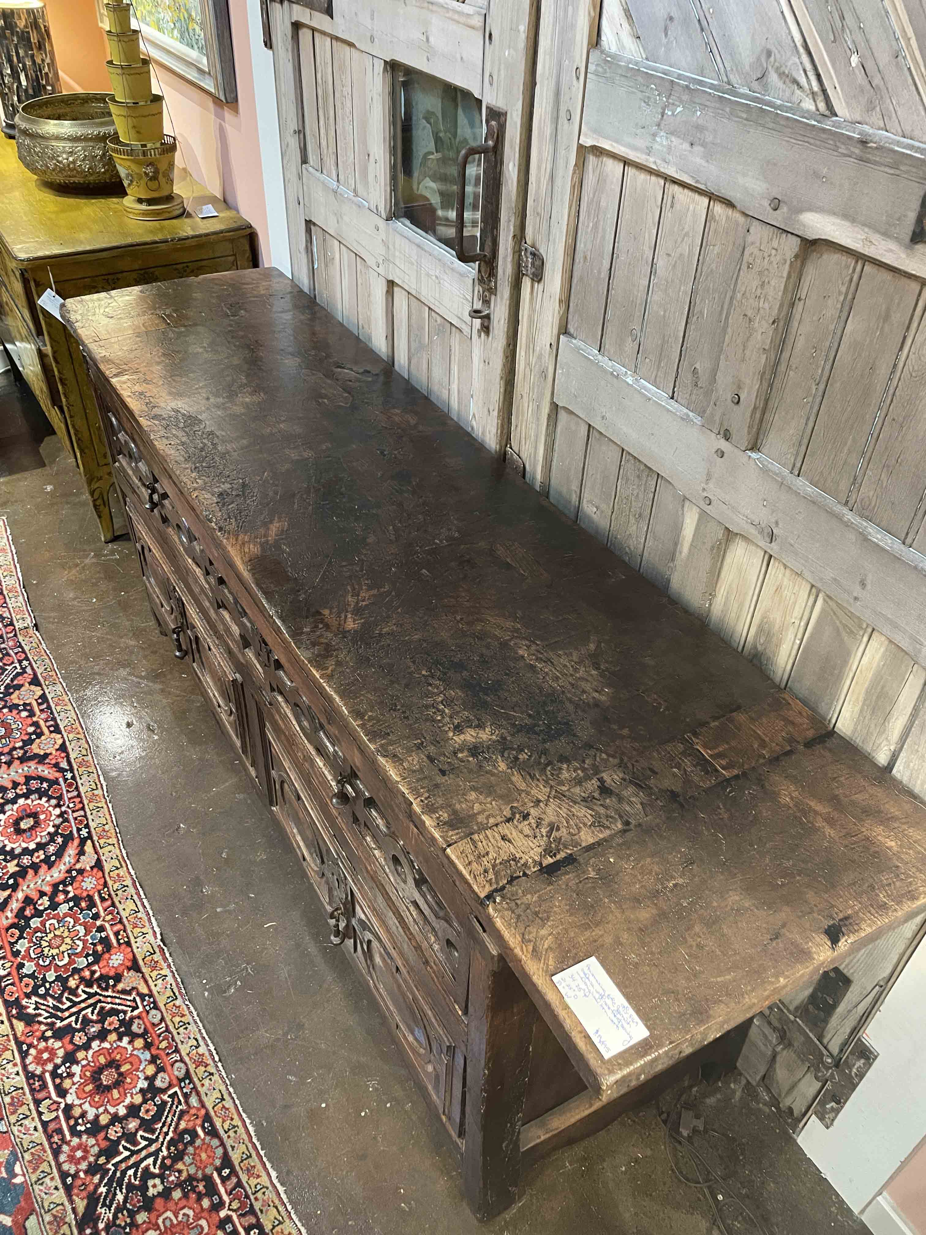 An amazing 16th C Spanish credenza (exceptional) w/ rare front carving and original iron work.