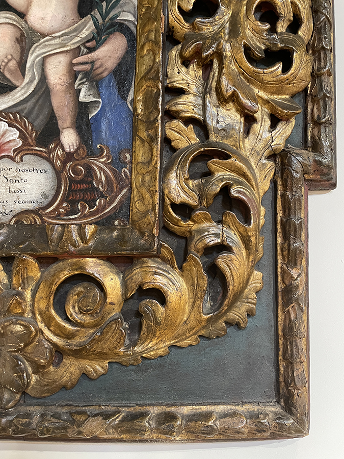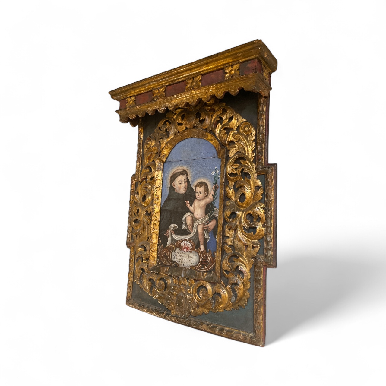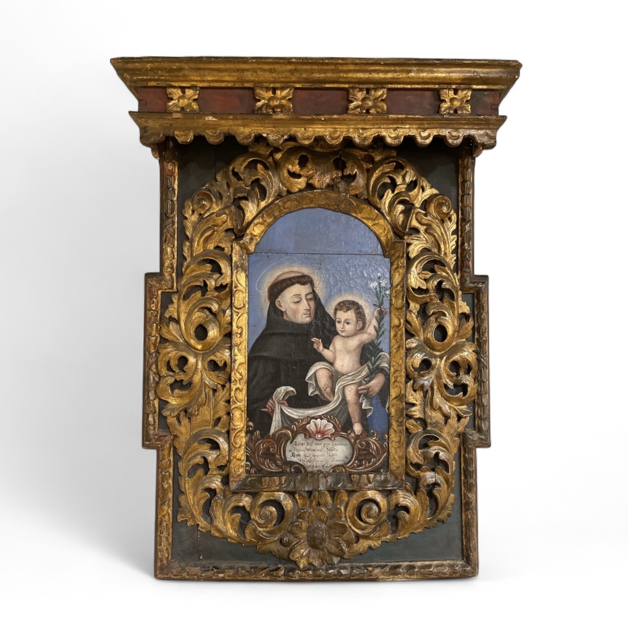 18th C oil on canvas Cuzco School painting of Saint Anthony. Saint Anthony's symbolism is holding the Christ Child and white Lilly among other symbols. It is accompanied by an 18th C carved & parcel gilt Italian frame.