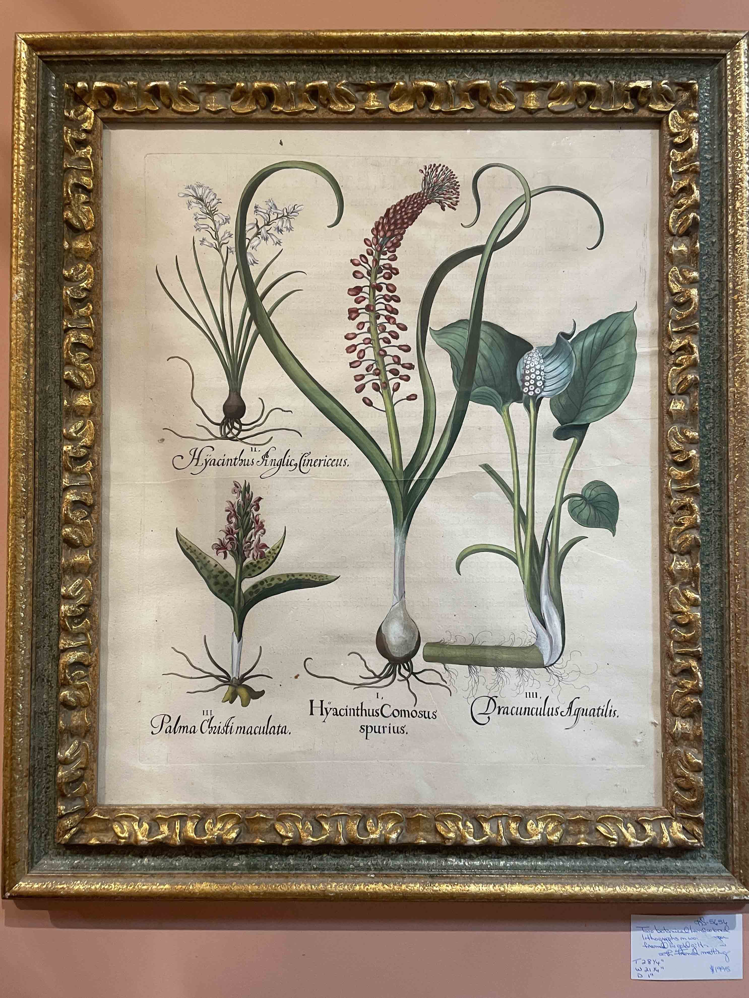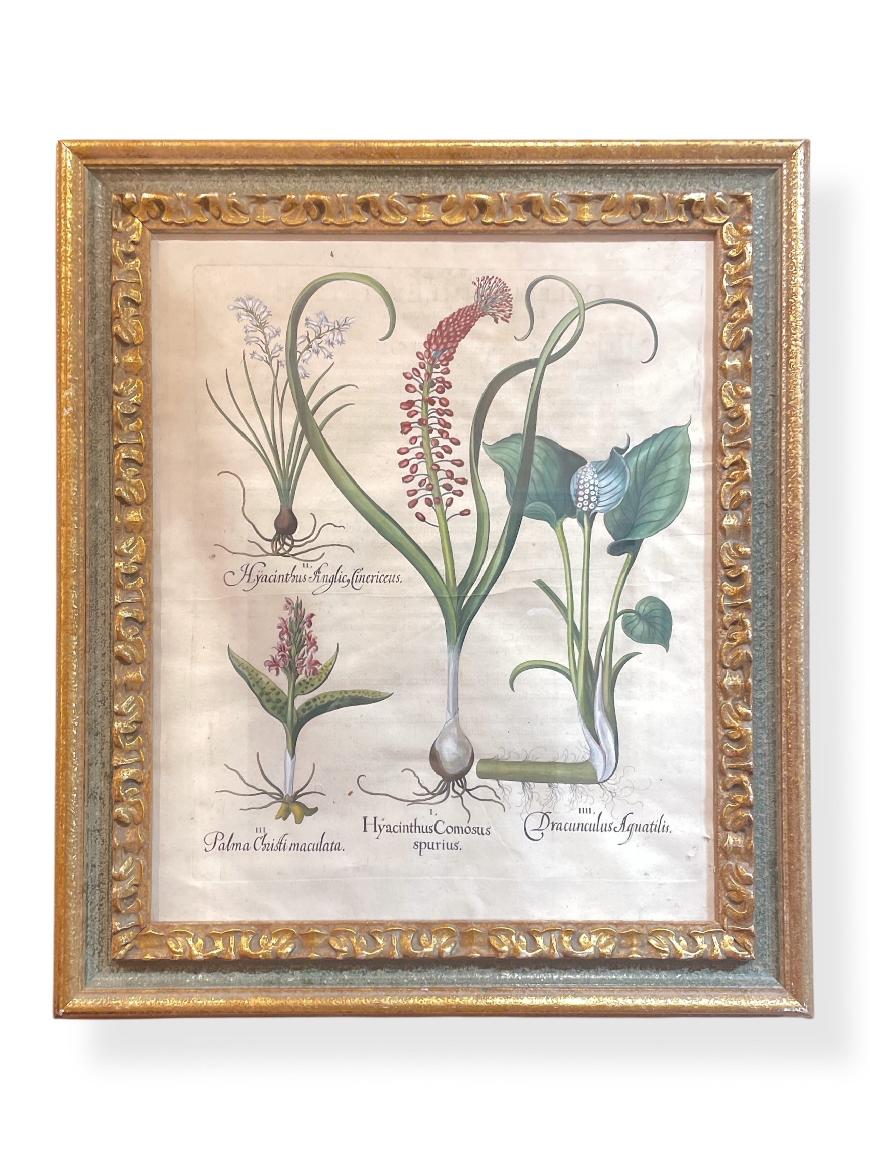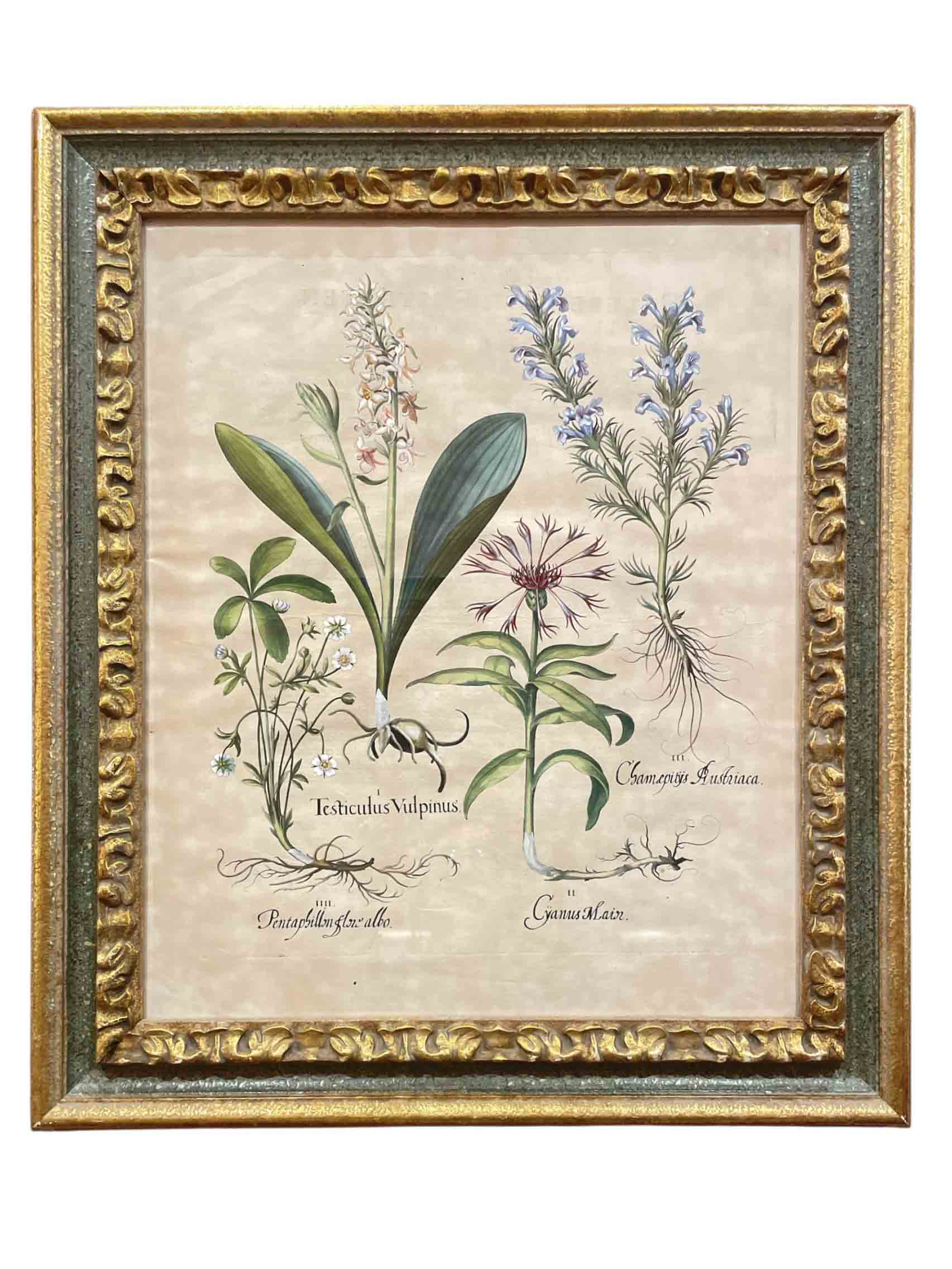 Pair of hand colored botanical engravings from Basilius Besler (1516-1629), "Hortus Eystettensis" Garden of Eystettensis, Nuremberg, Germany 1613. Coloring is later. Engravings are on paper with text on reverse. (Green and gilt frames).