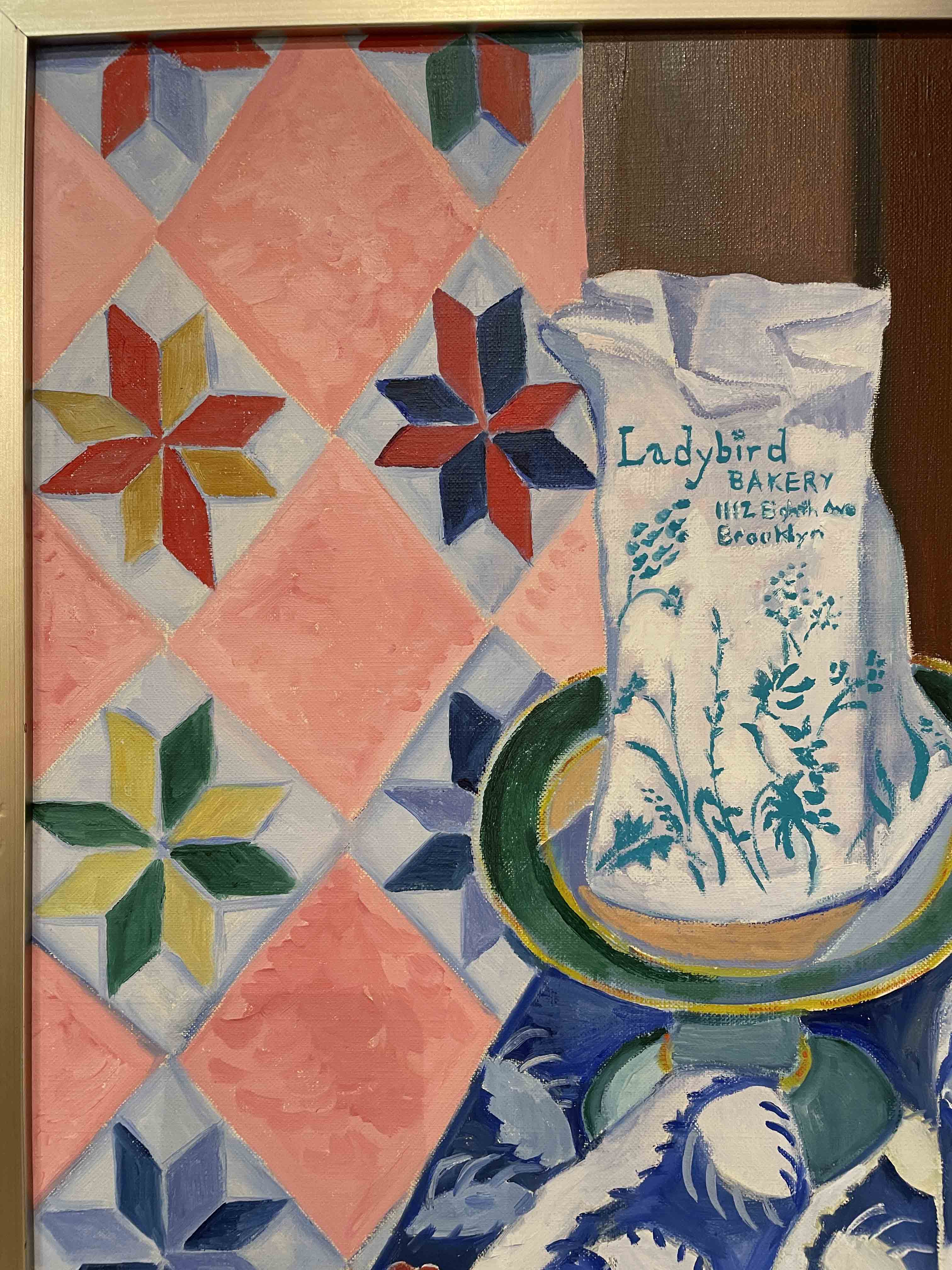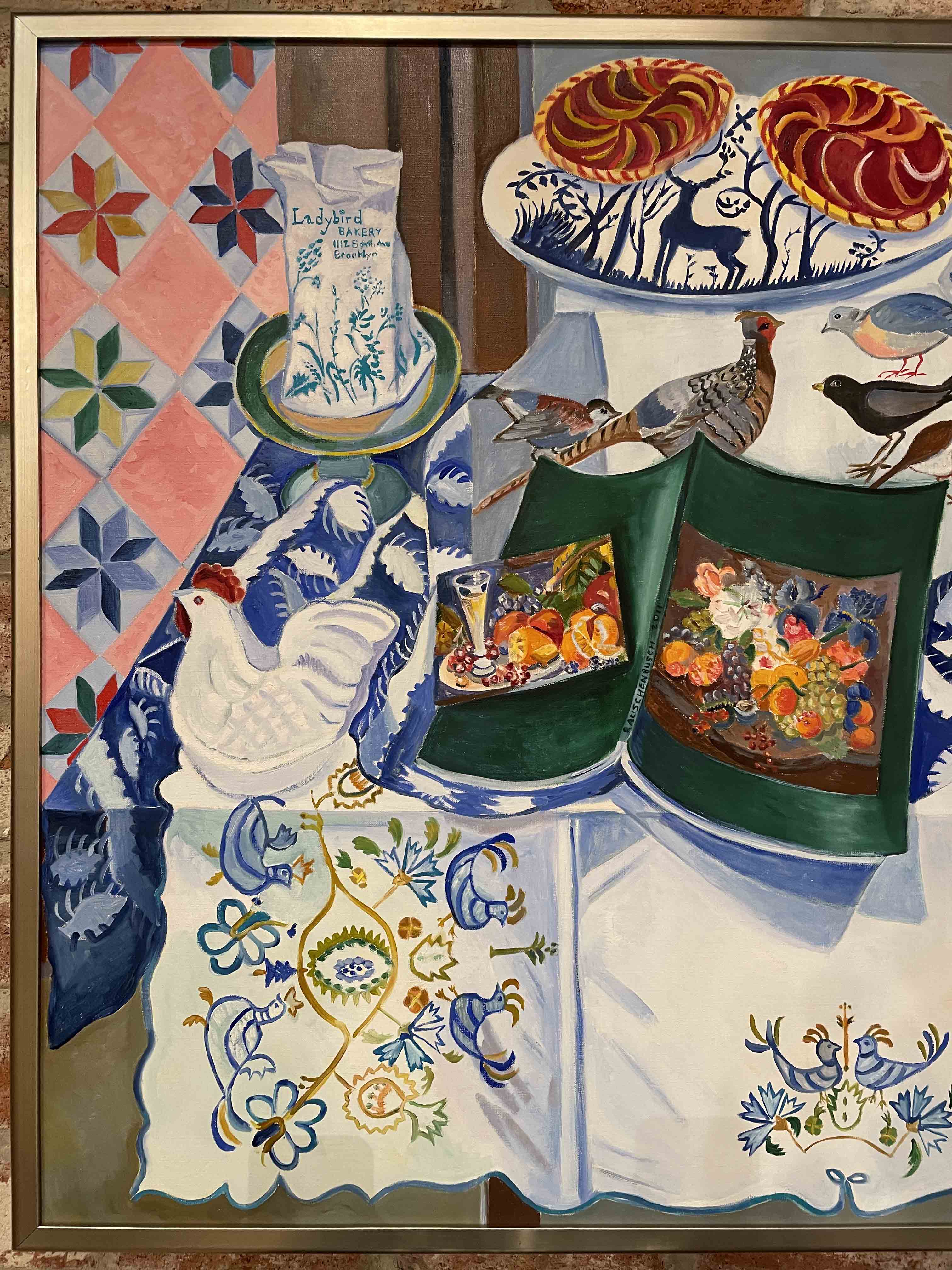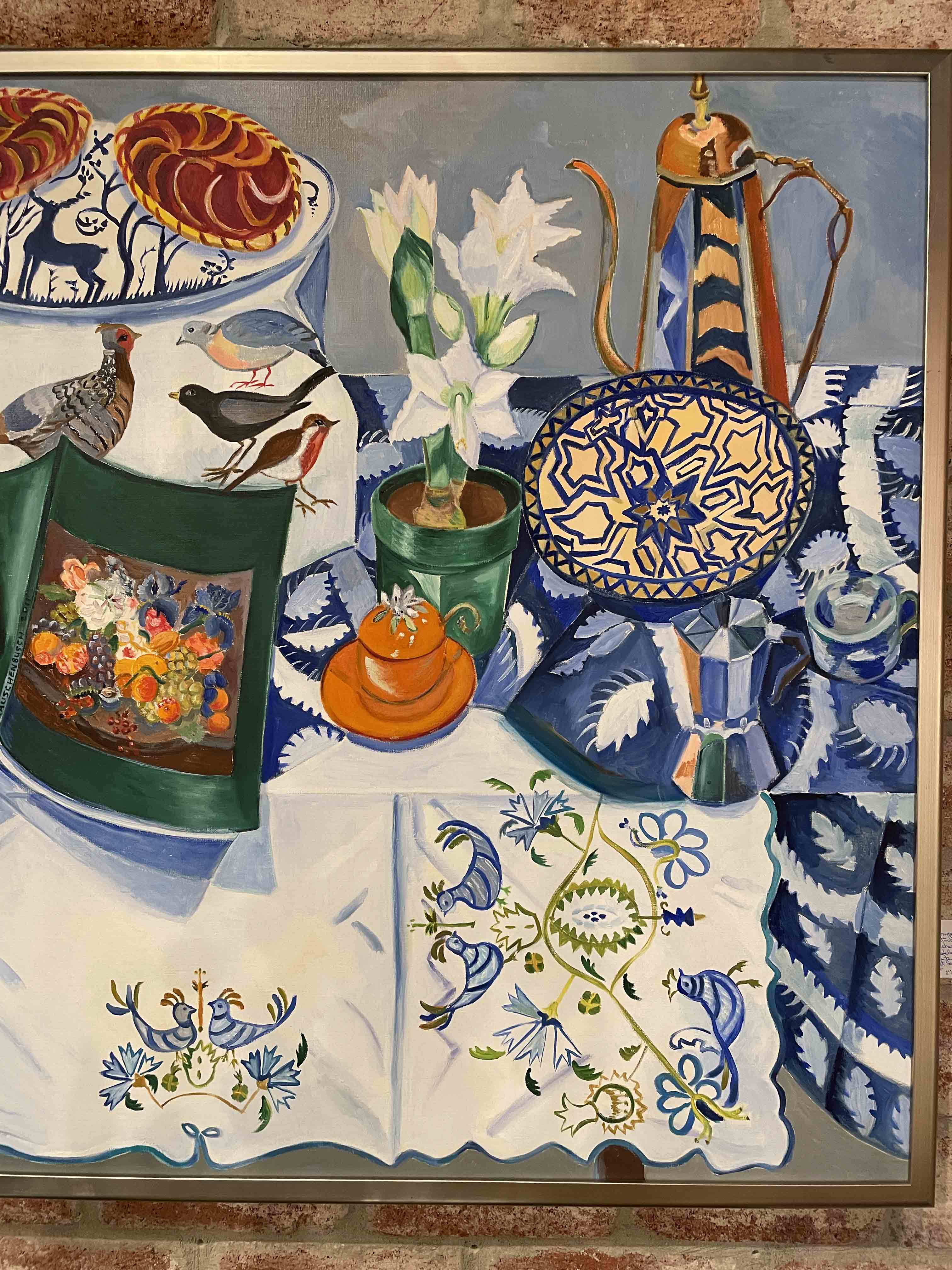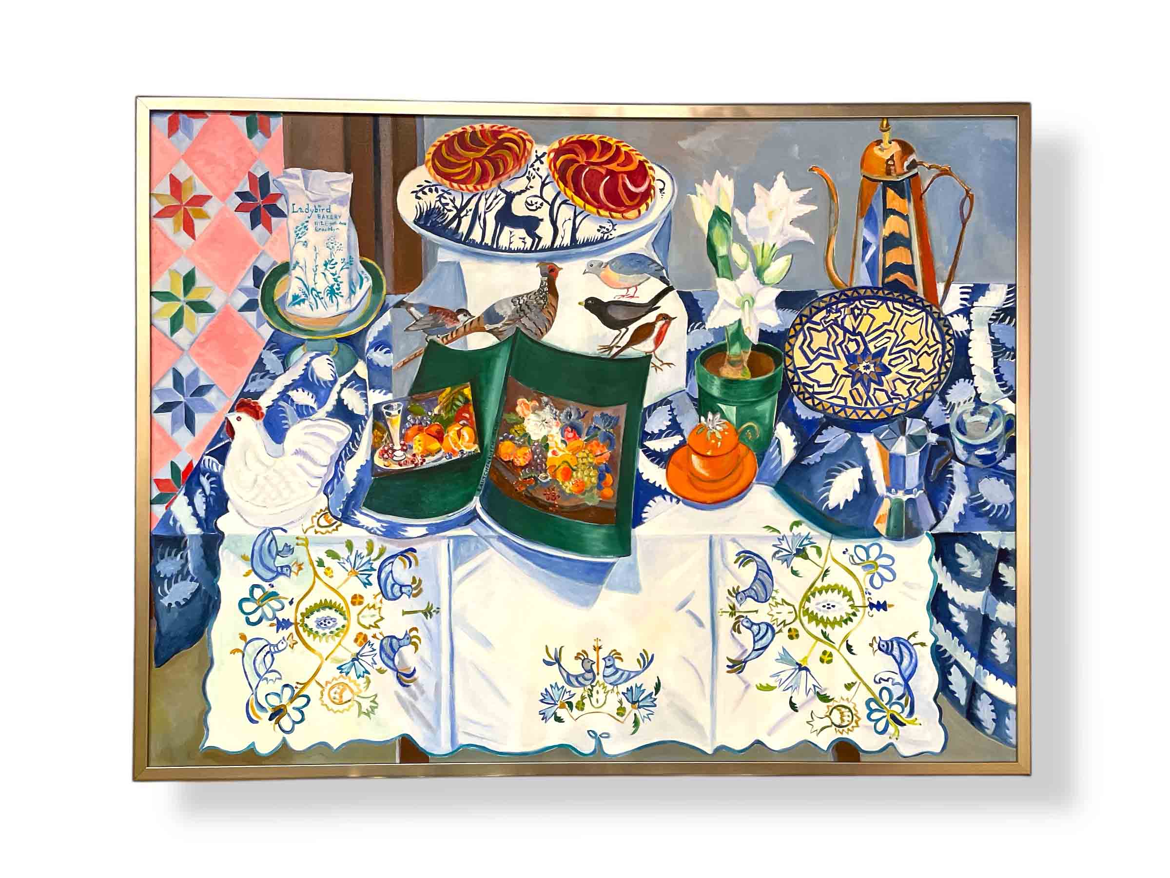 Oil on canvas painting by Stephanie Rauschenbush ( Contemporary, NY) entitled "Breakfast w/ Severin Roesen", a tribute to German/American artist Severin Roesen(1815-1872); framed.