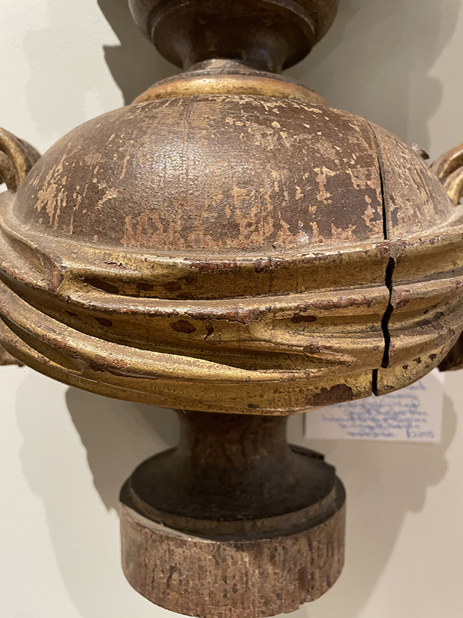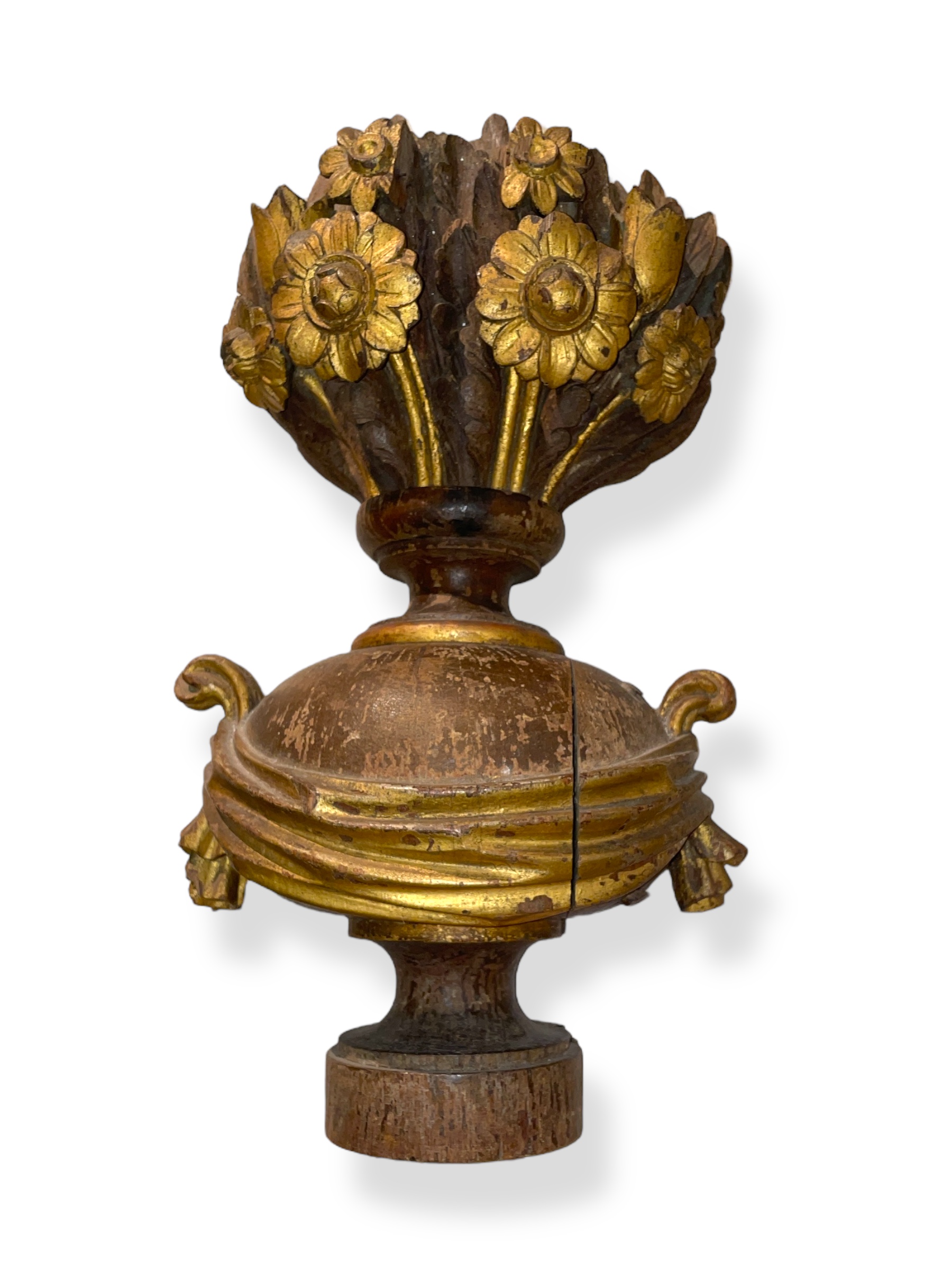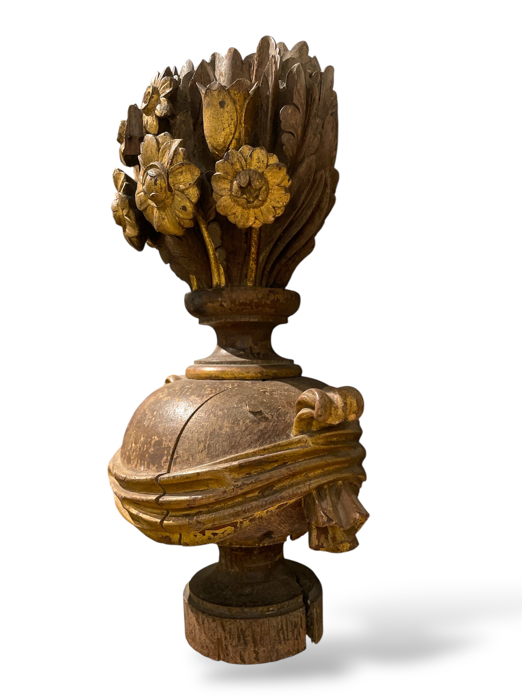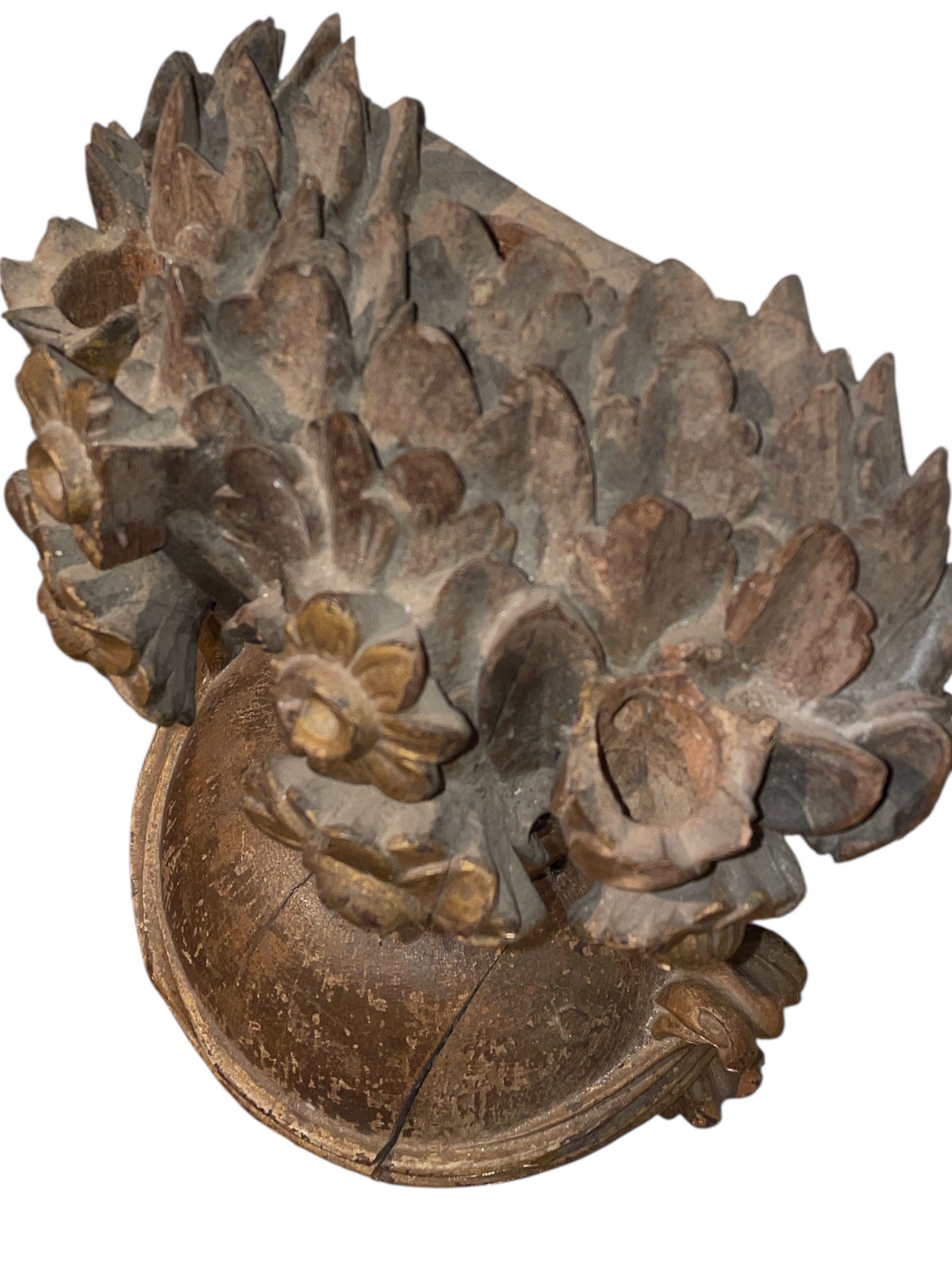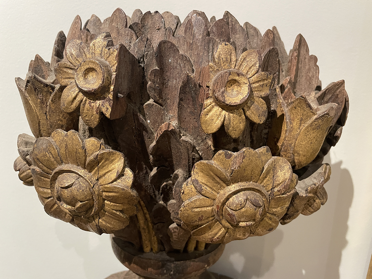 Wood carving of a bunch of flowers, parcel gilt and holes for candles.
