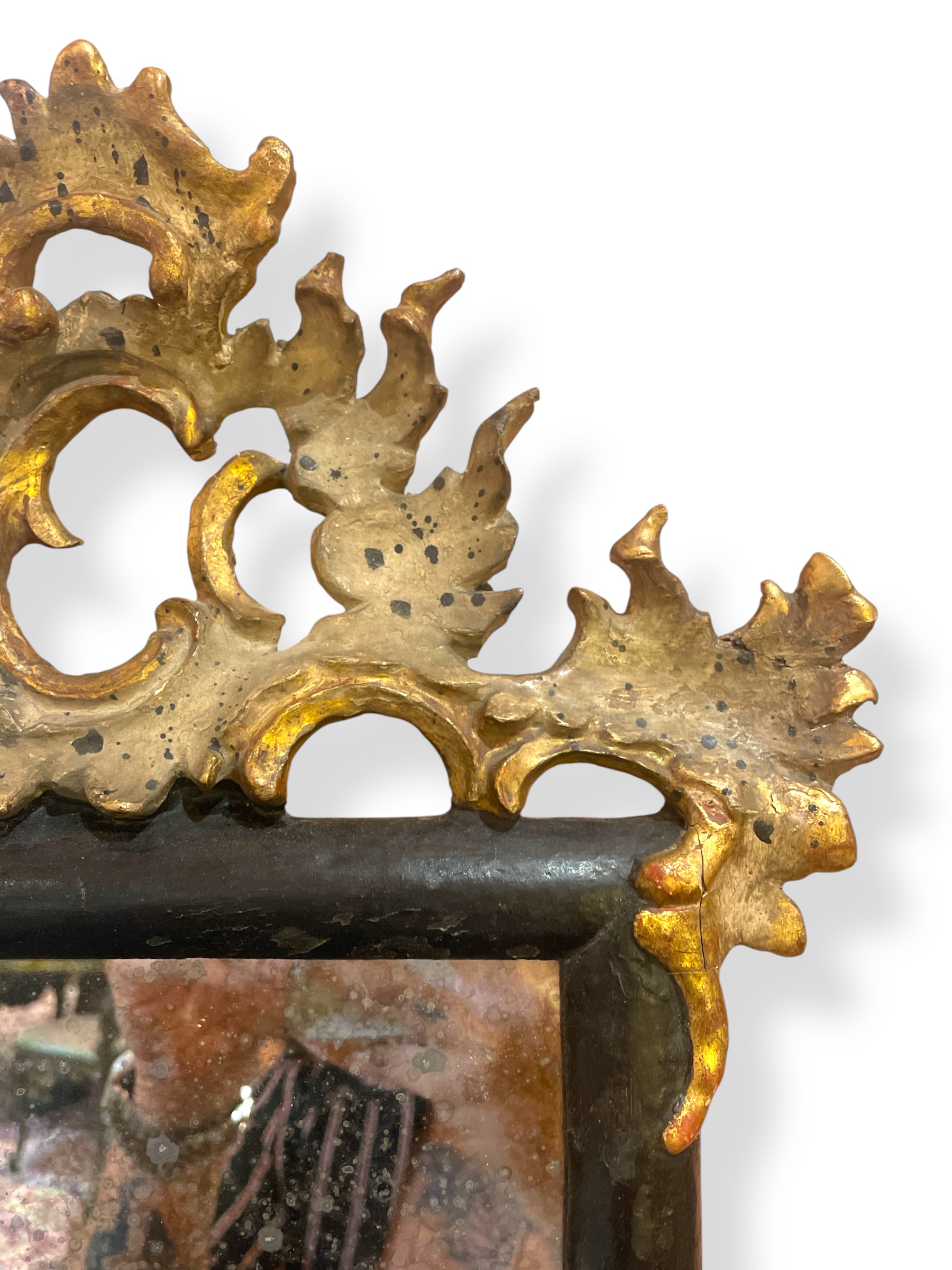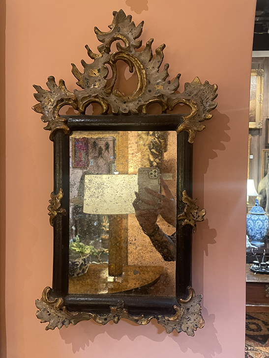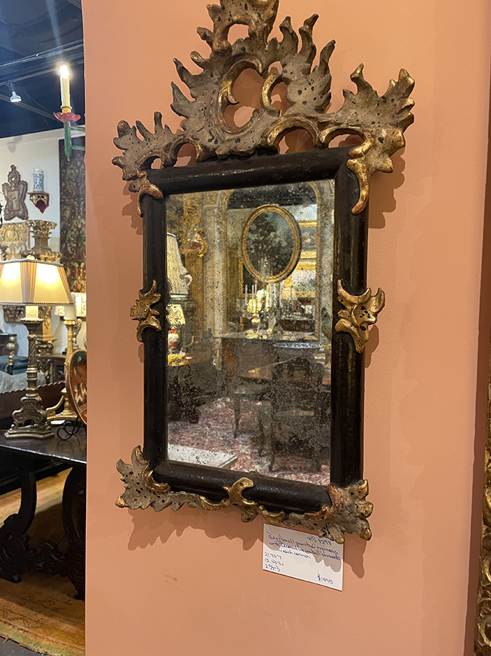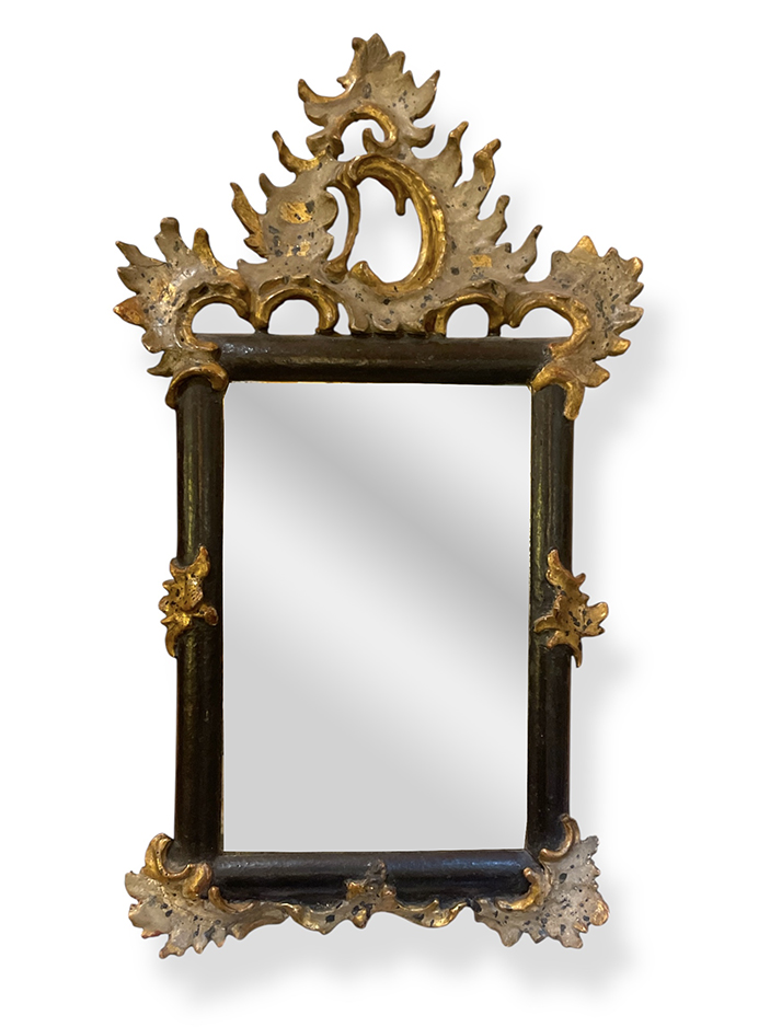 Pair of small black painted mirrors w/ decorative embellishments in each corner.