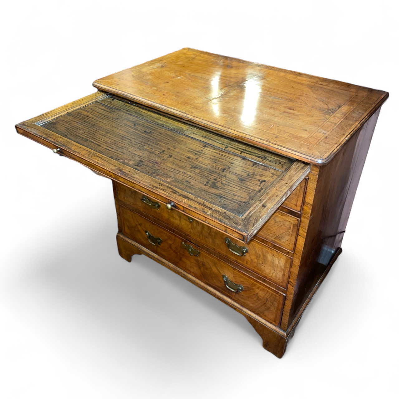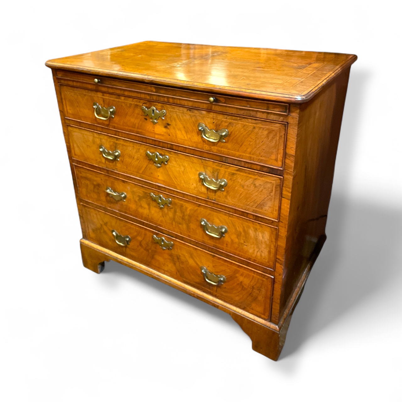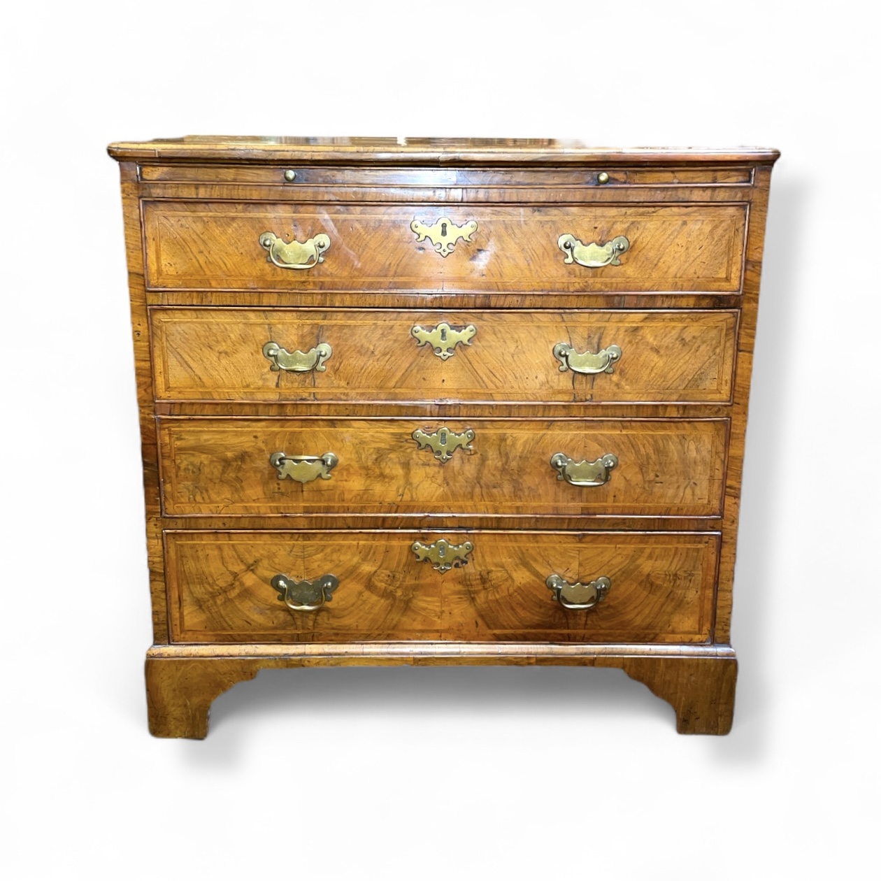 18th C English Georgian walnut four drawer chest w/ banding, c.1780.