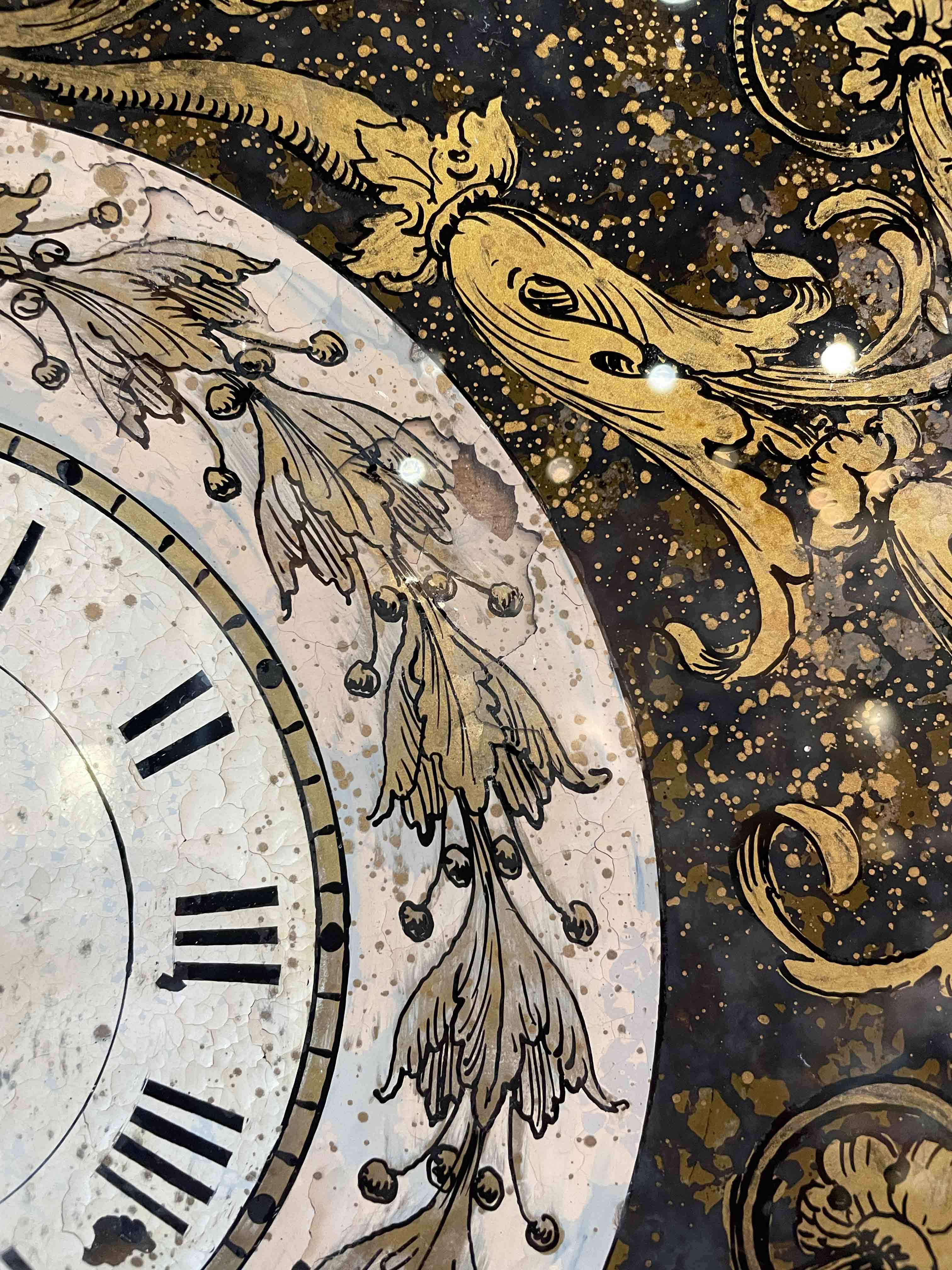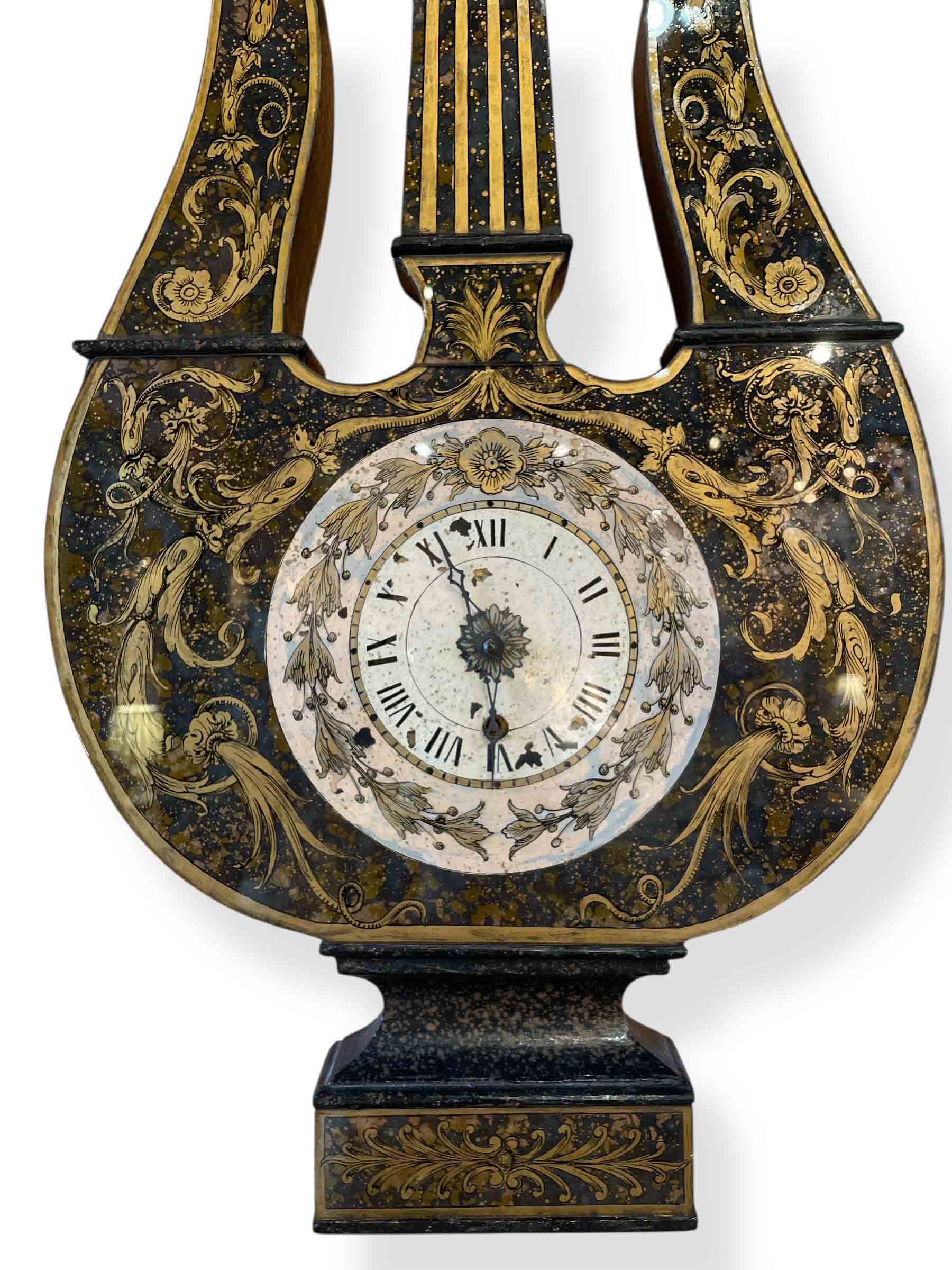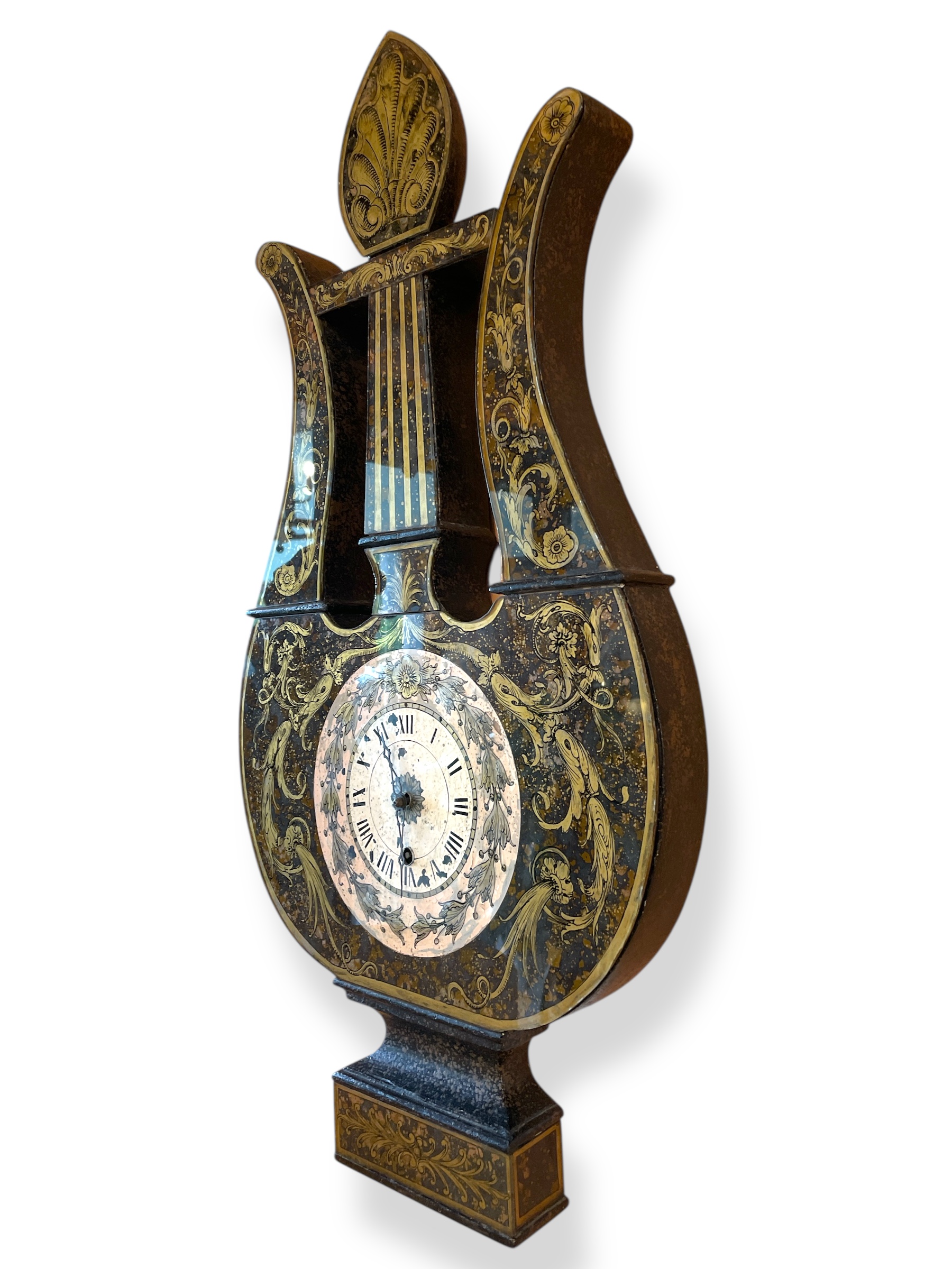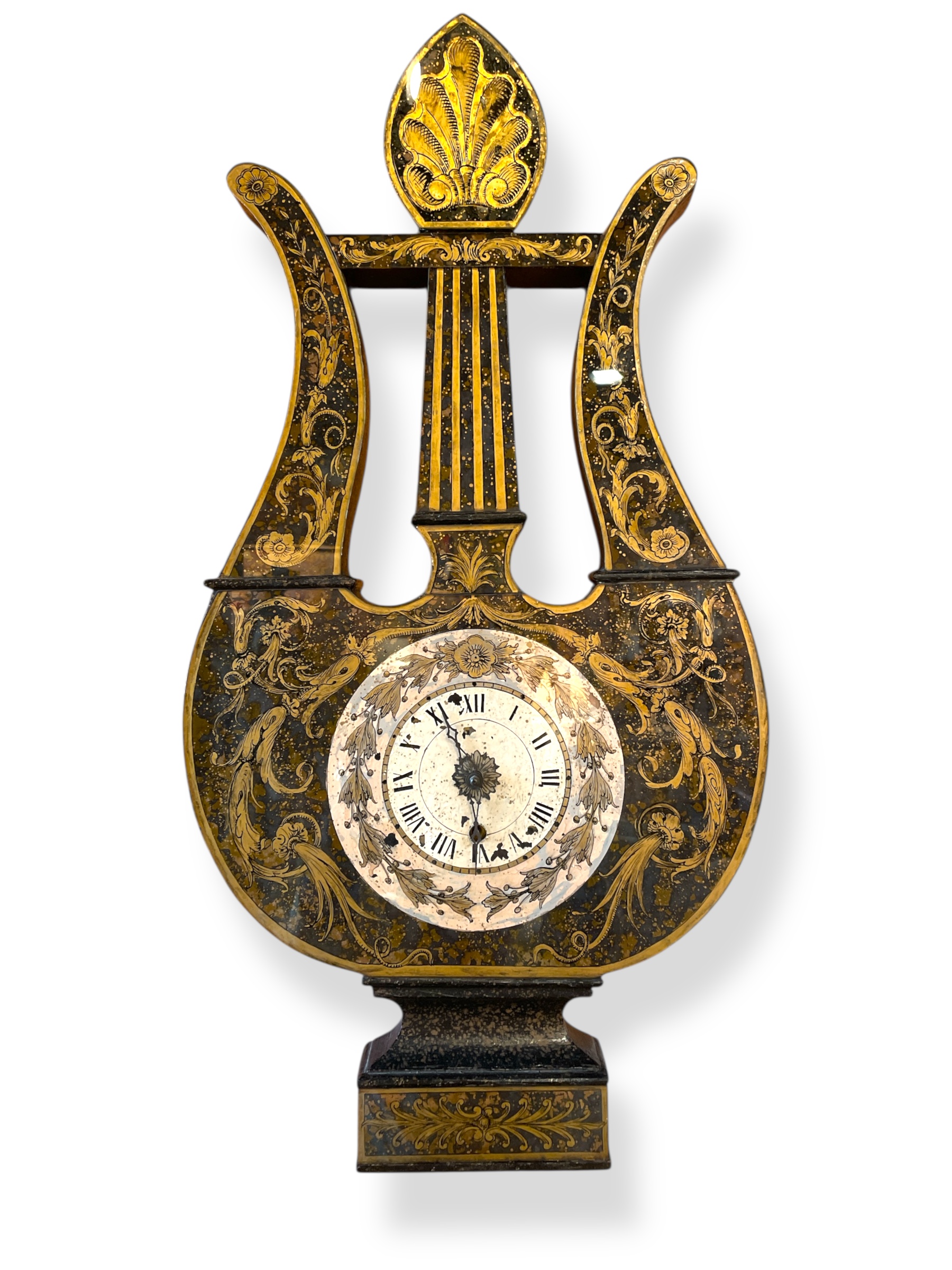 Early 19th C French eglomise lyre-shaped clock. (Not operable.)