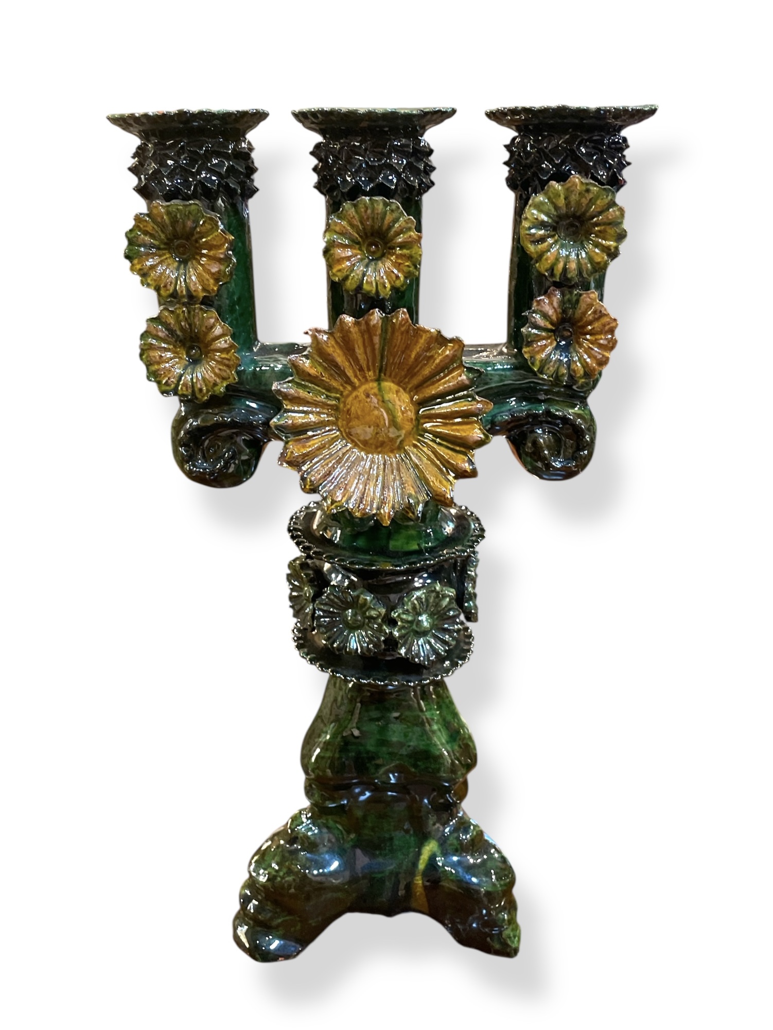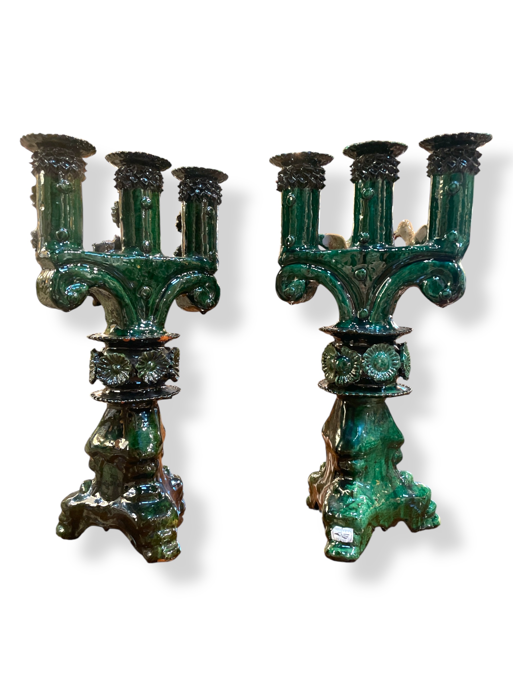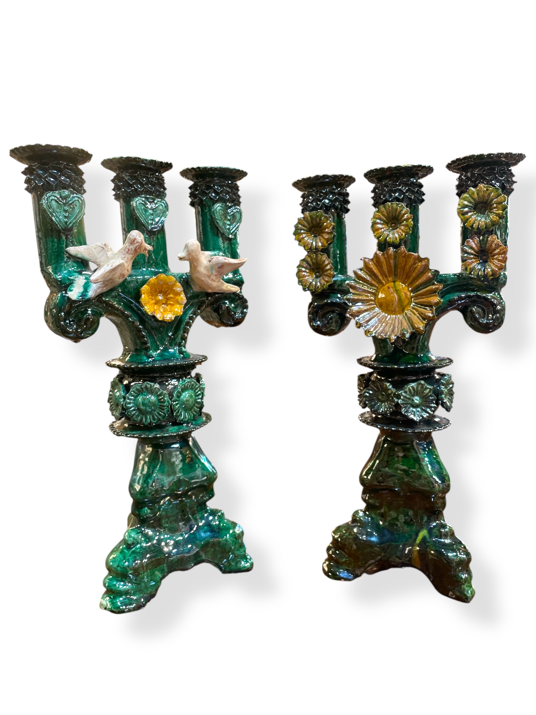 Two of green glazed Michoacan candlesticks w/ embellishments. (Small chips)