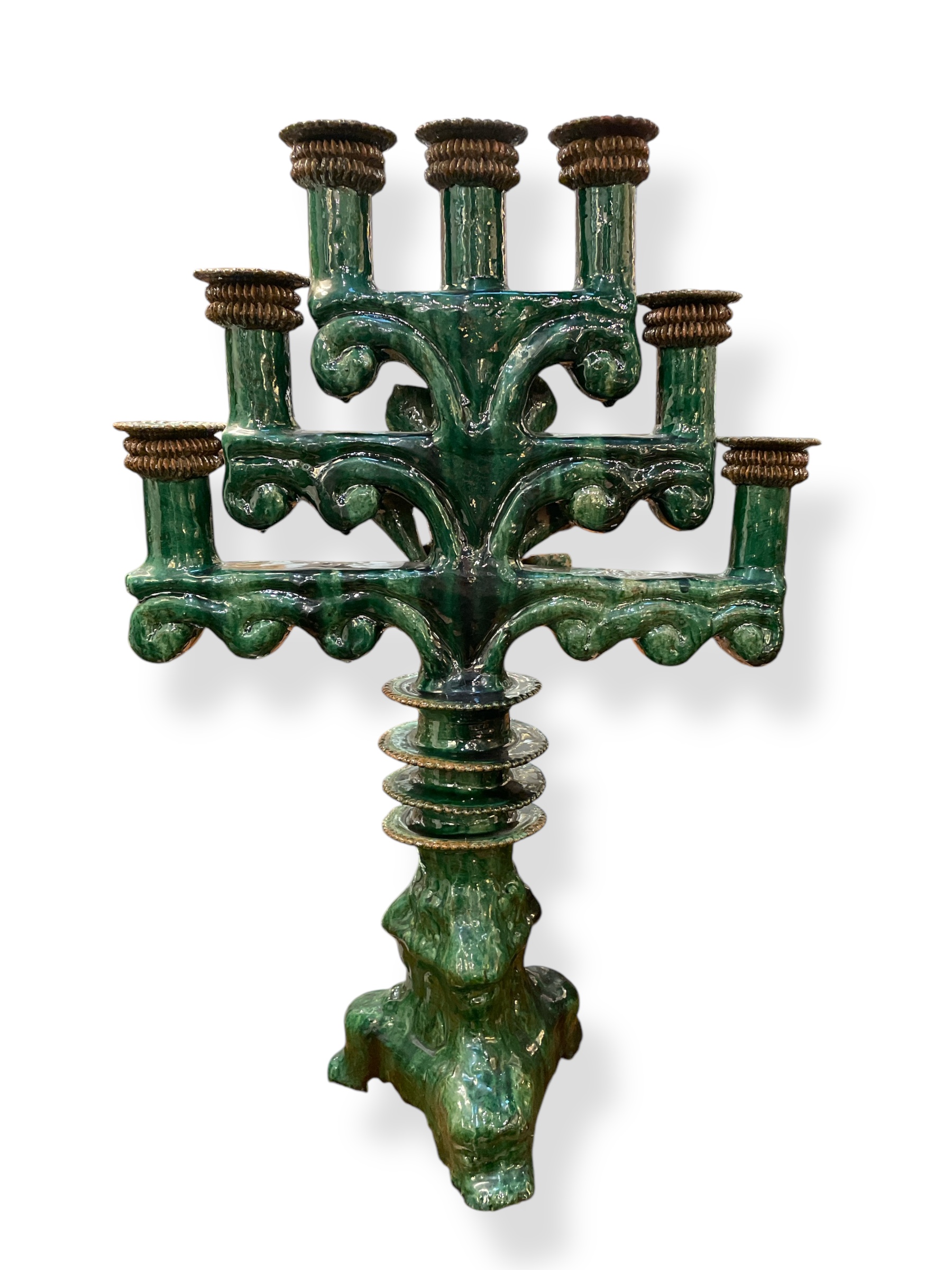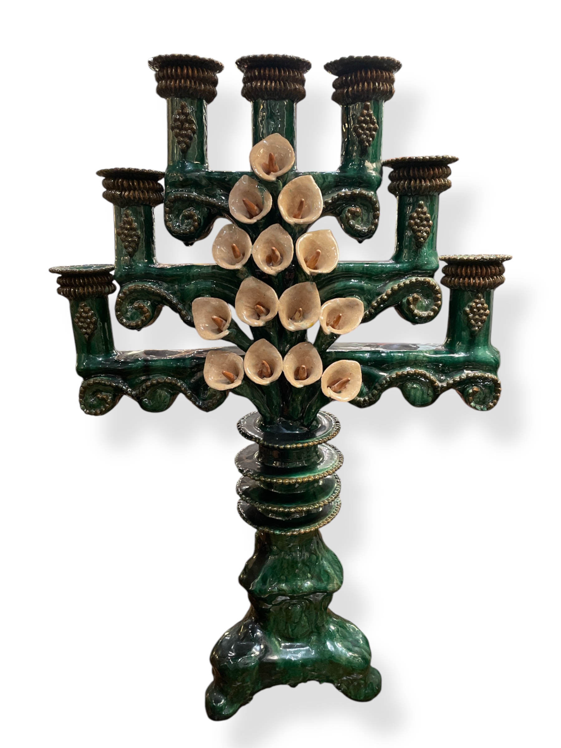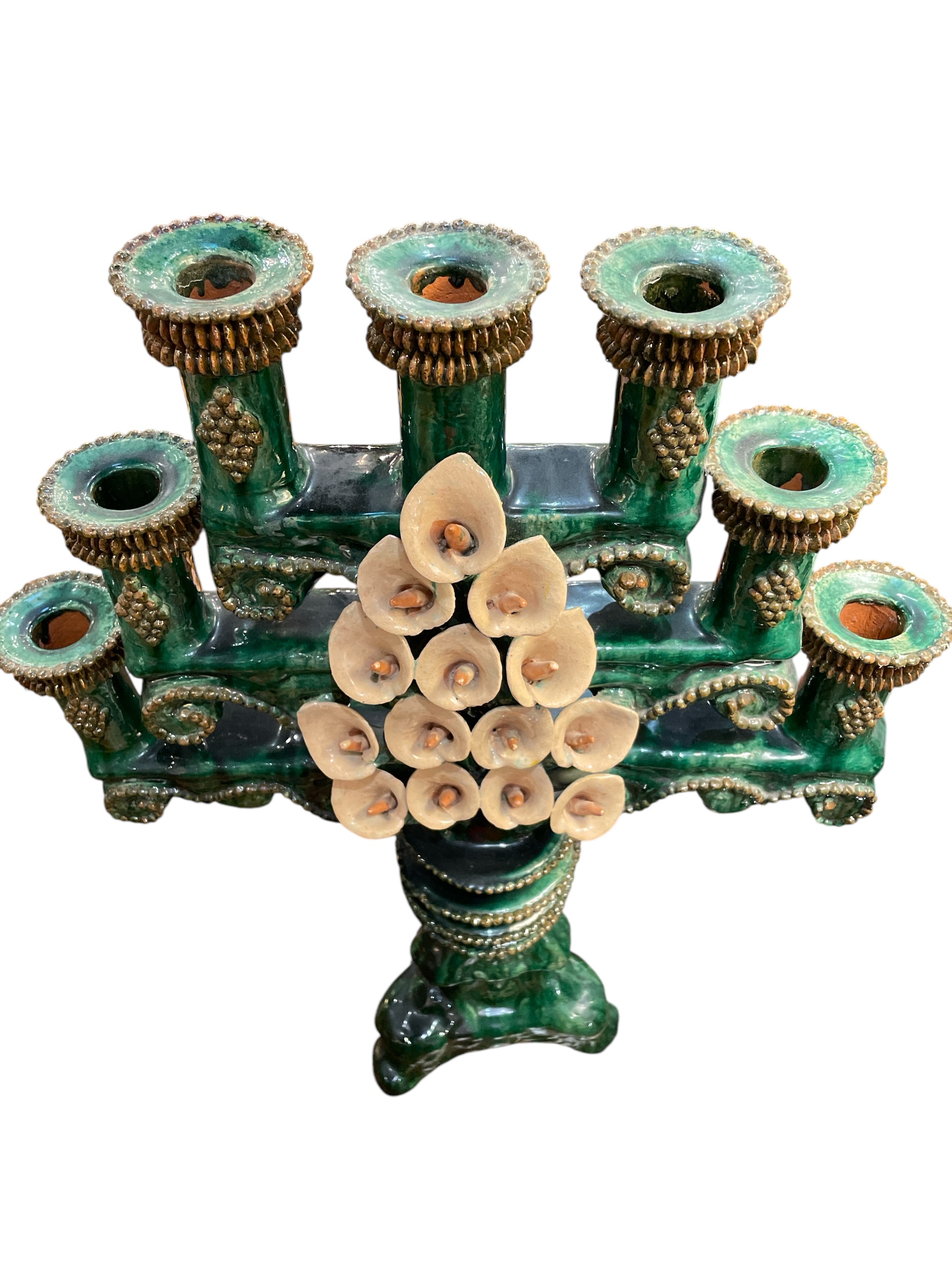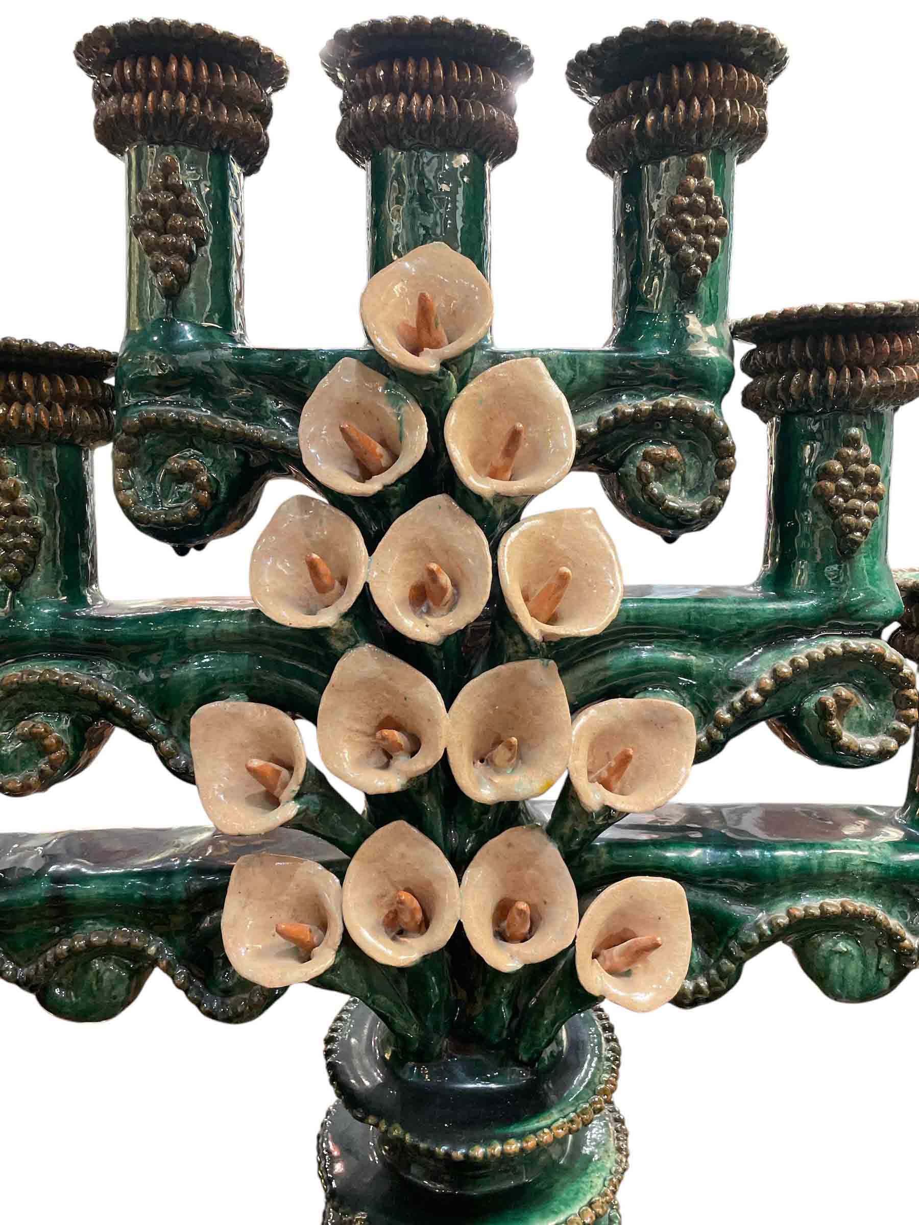 Extra large green glazed Michoacan candlestick w/ calla lilly decoration.