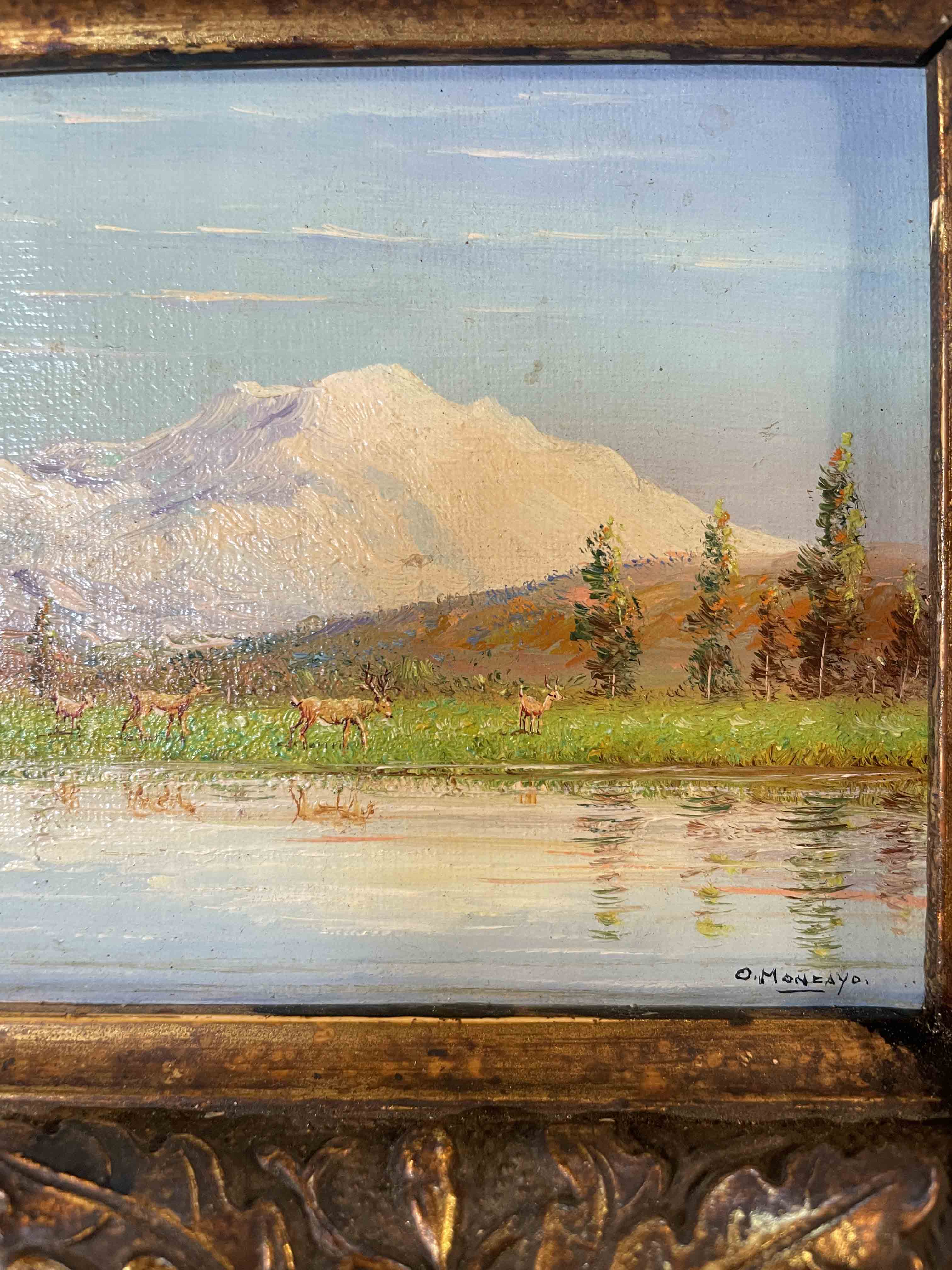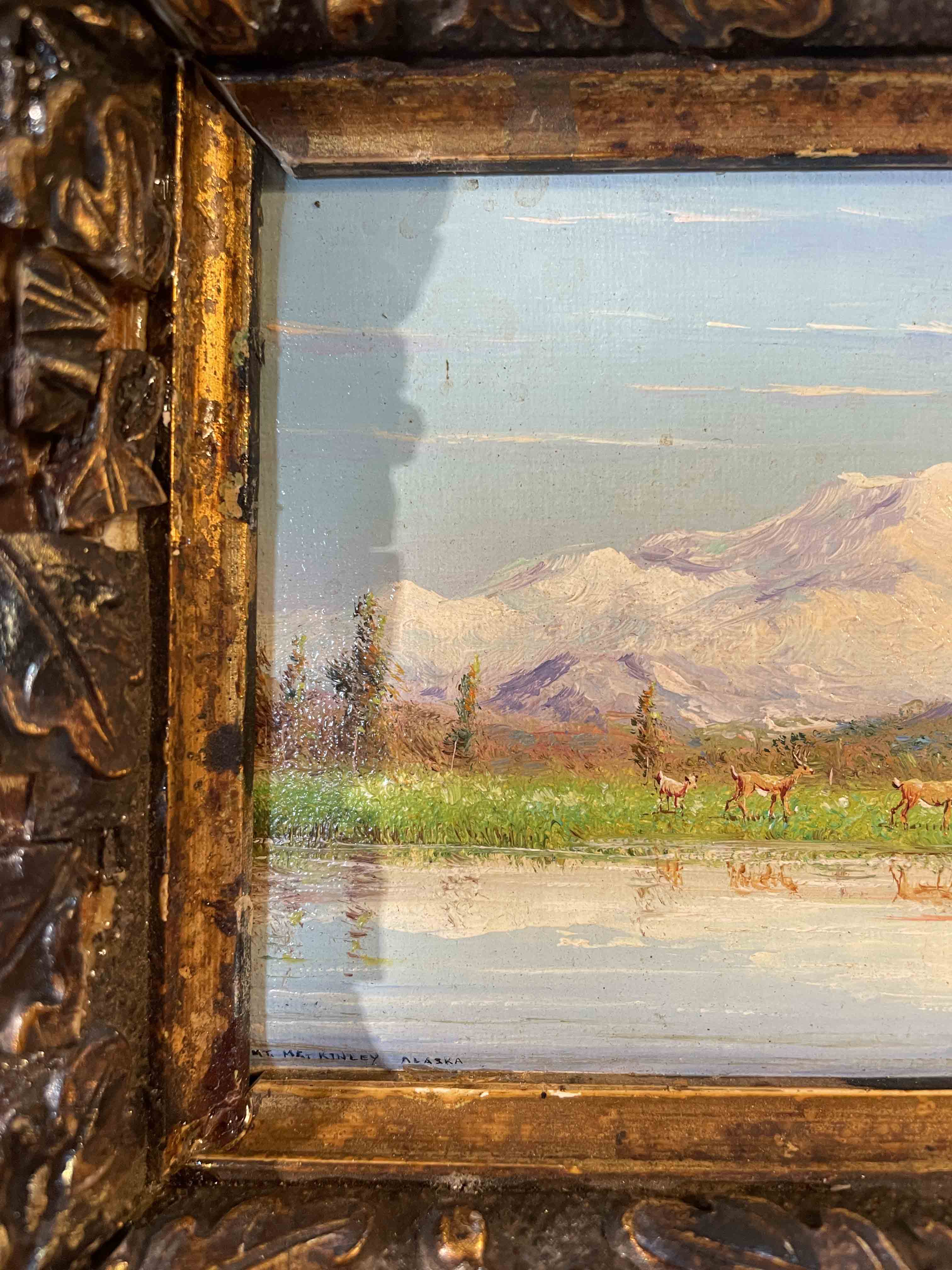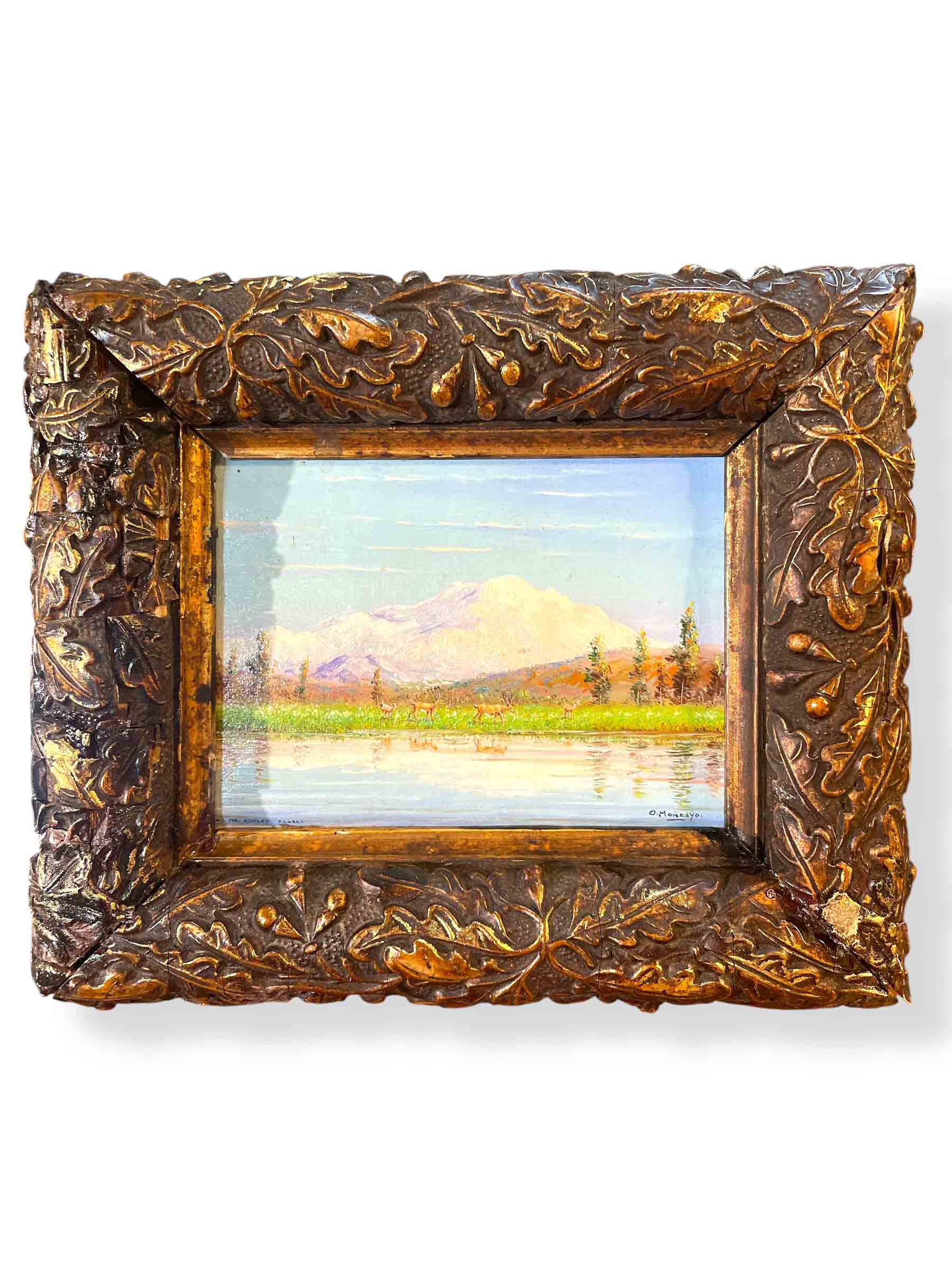 Miniature oil on canvas painting of "Mt. McKinley Alaska" by Oswaldo Moncayo in carved frame. (Small damage to frame on the lower right.)