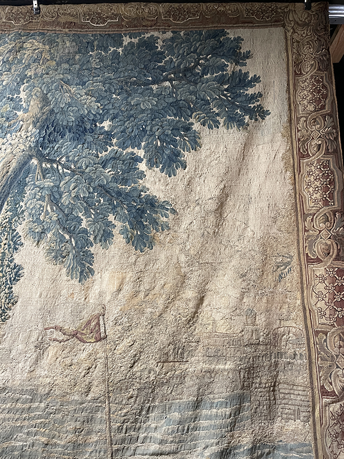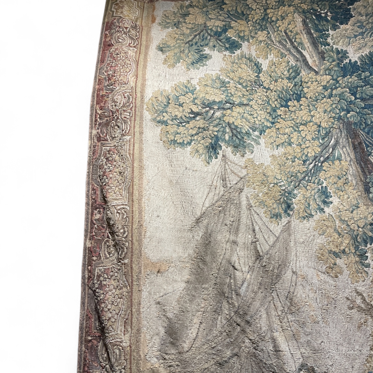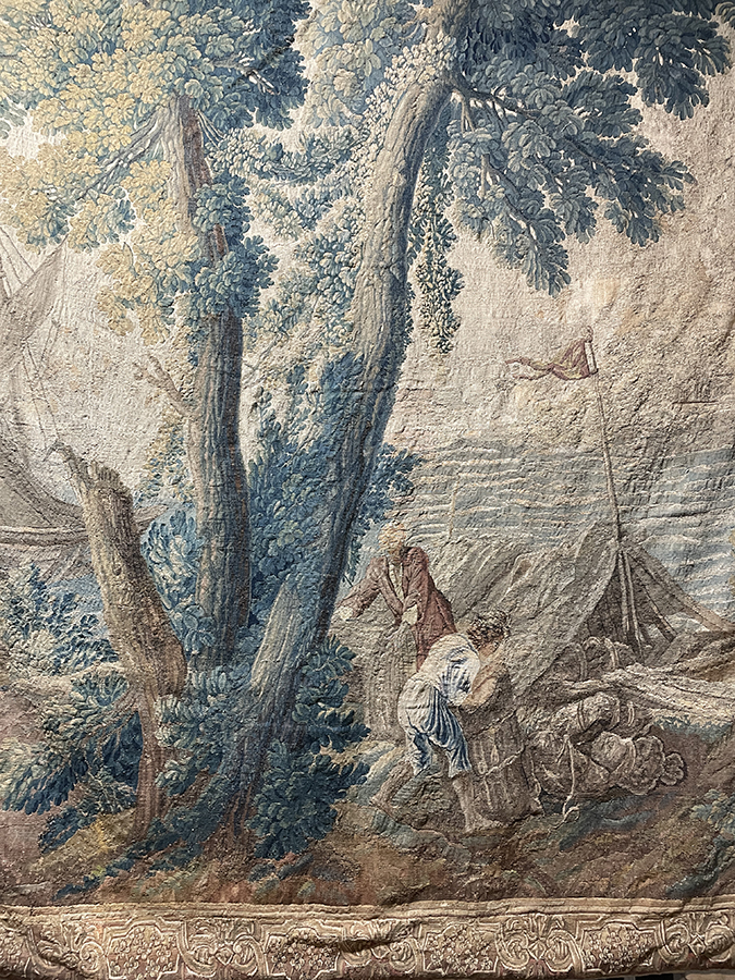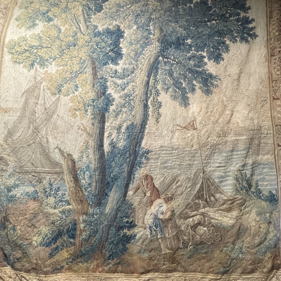 Late 17th C tapestry (either Belgian or Flemish) w/ serene ocean scene & a ship's sail in background and a large tree in foreground w/ figures near a tent (w/ a port city /harbor in the right hand top corner). Tapestry is in very good condition with exquisite original border. Comes with curved iron hanging rod.