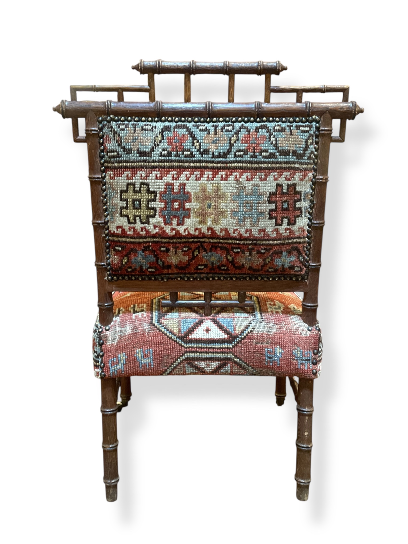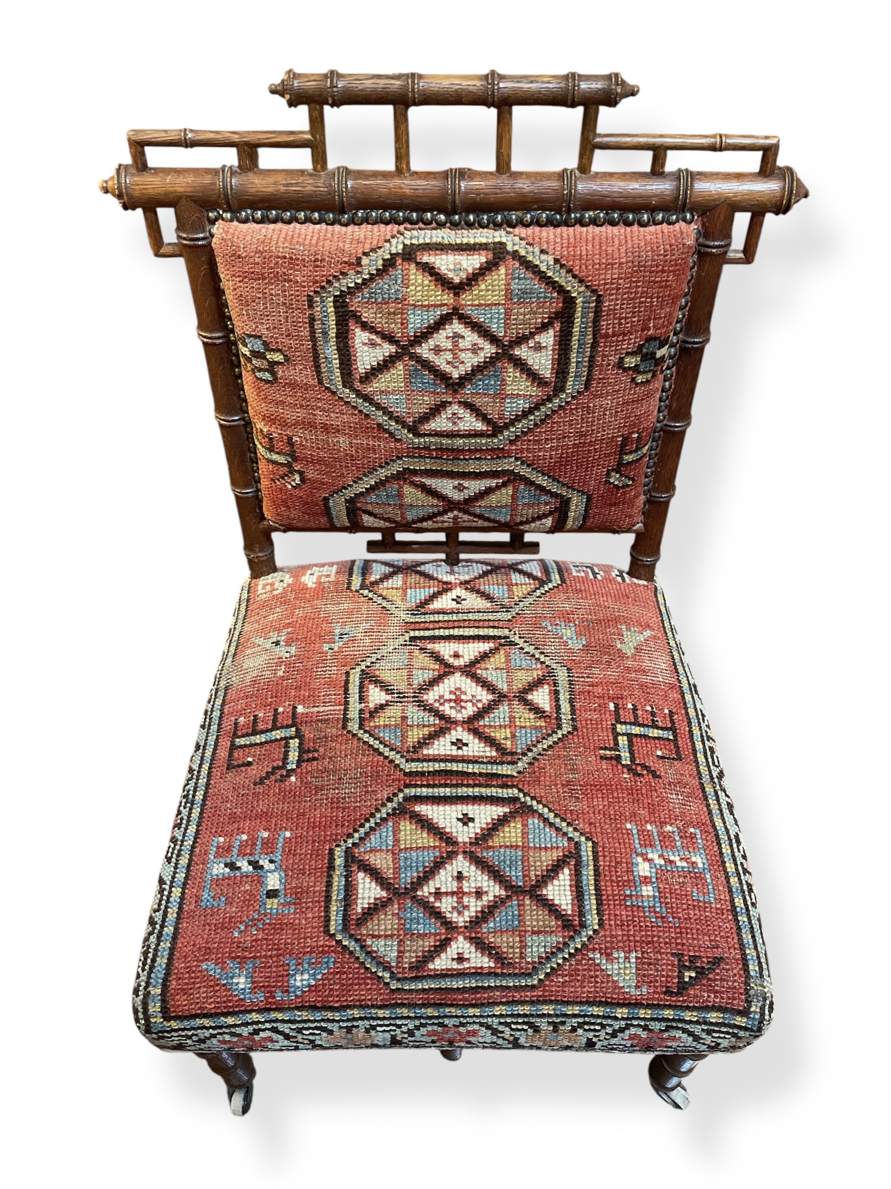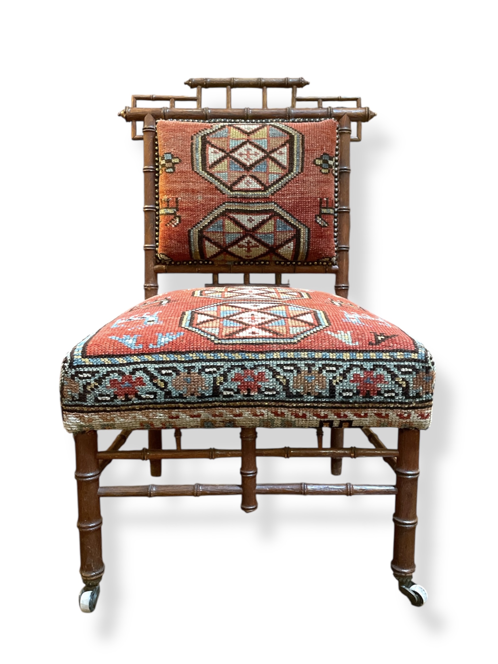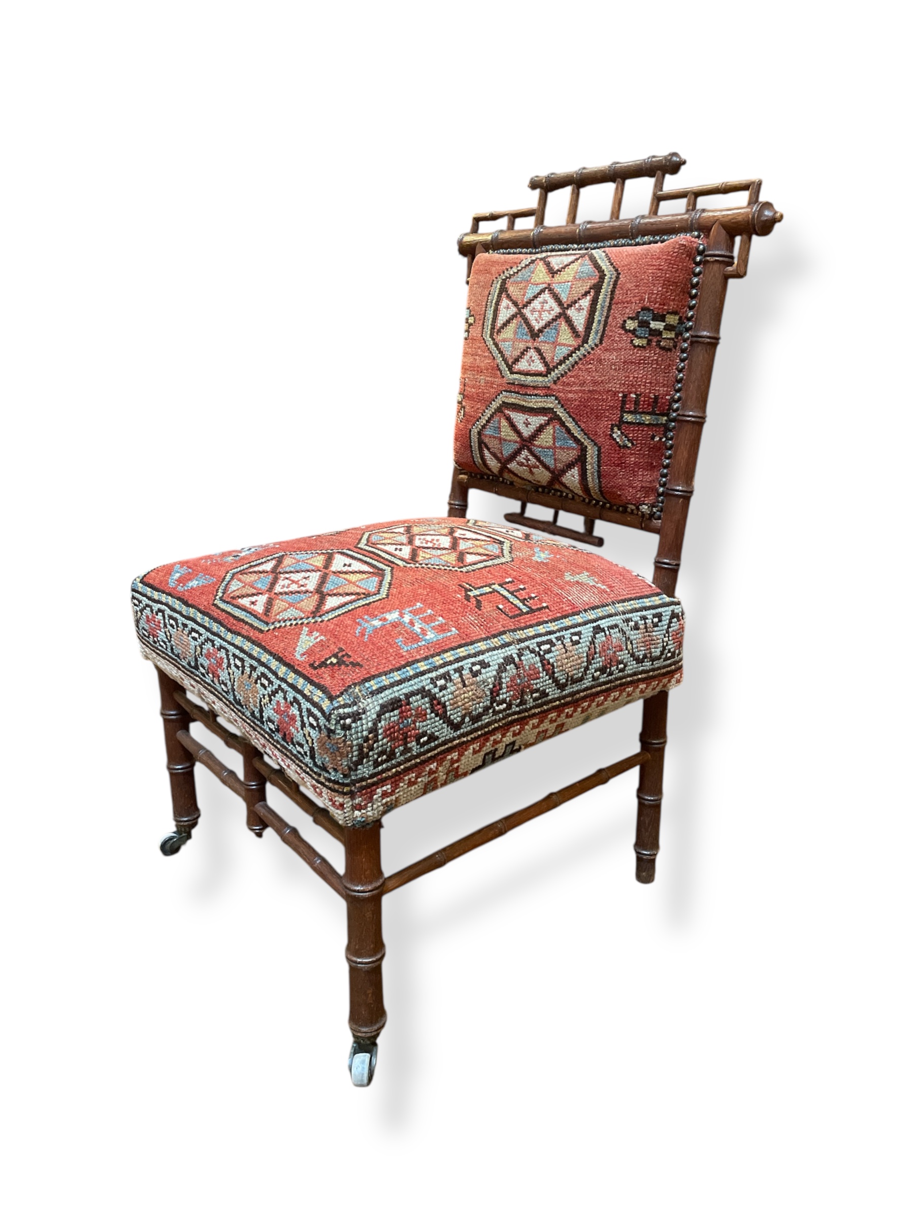 Fabulous 19th C faux bamboo side chair with original casters upholstered in vintage Persian rug fragments.