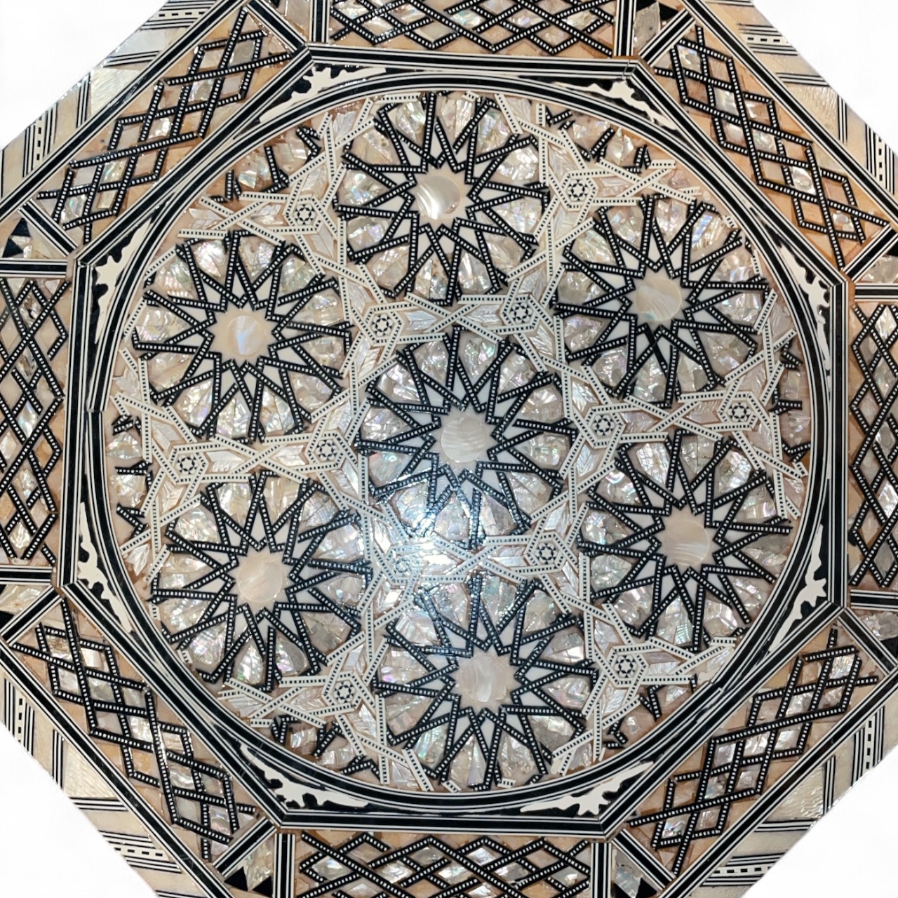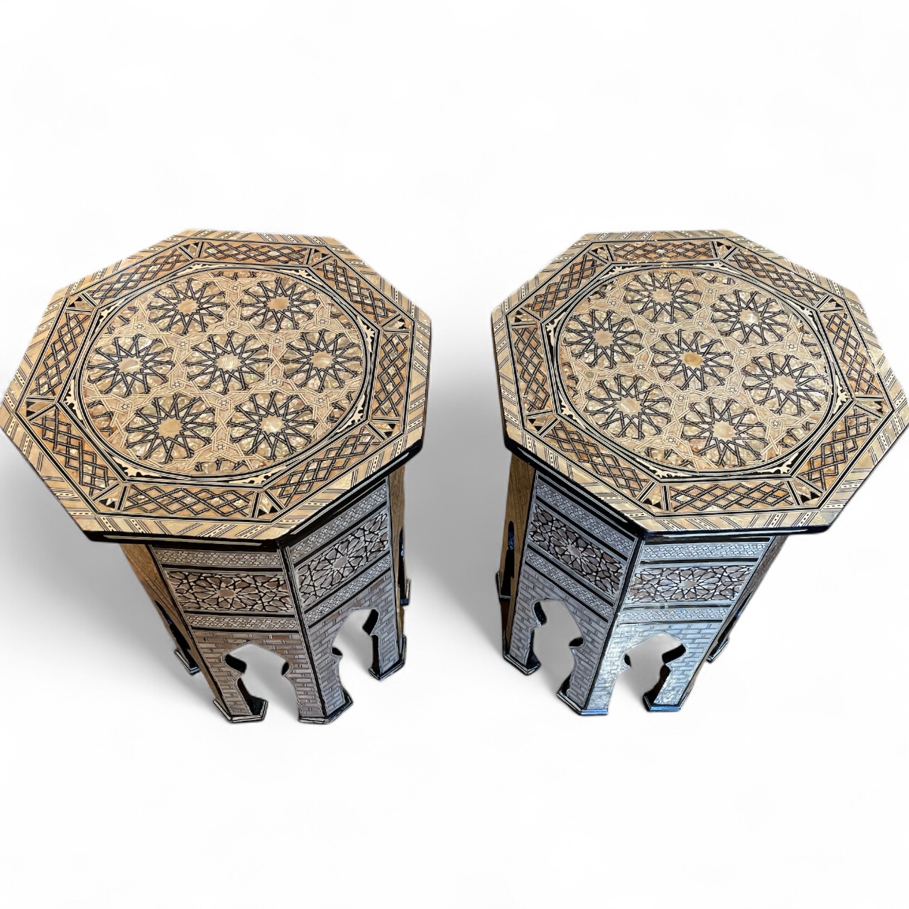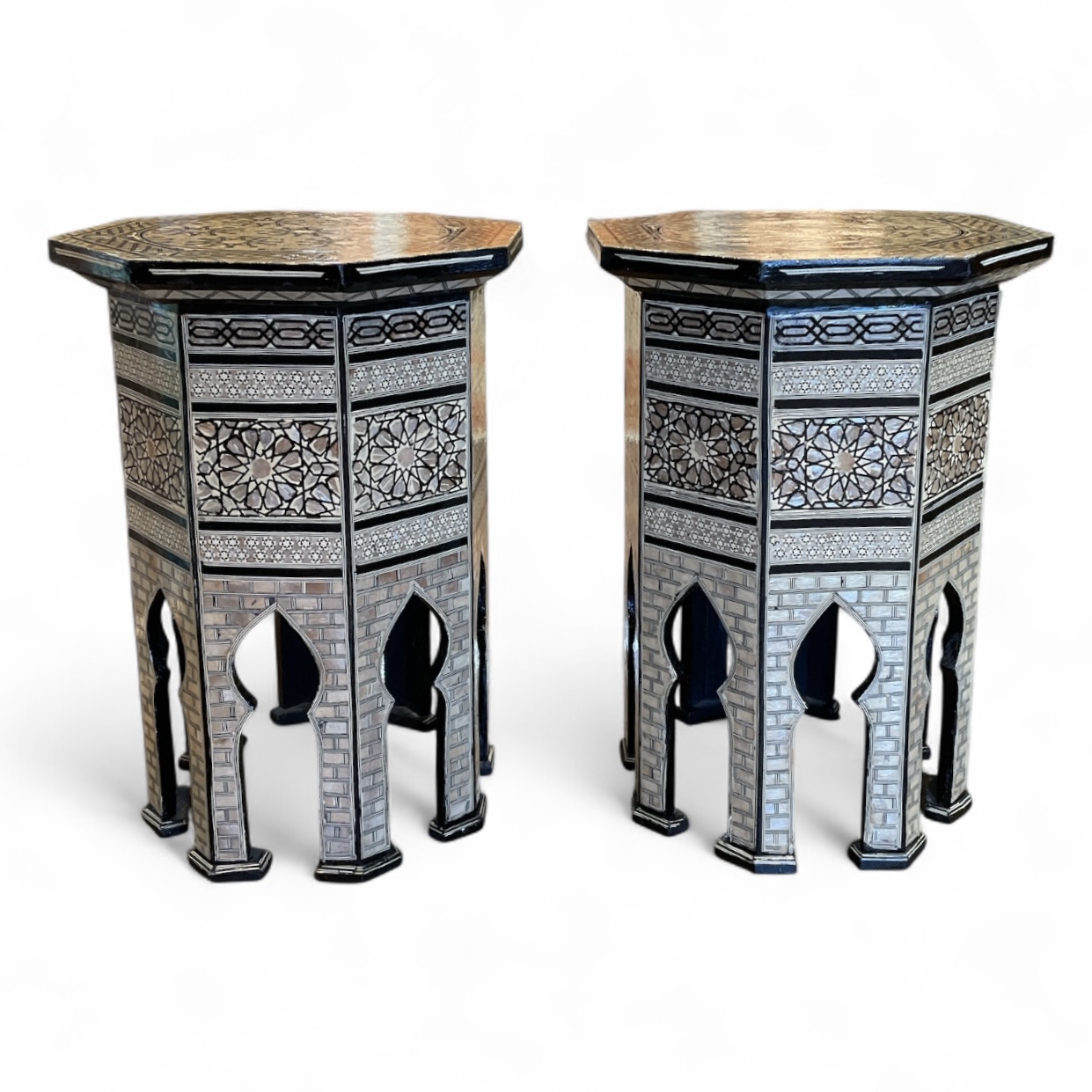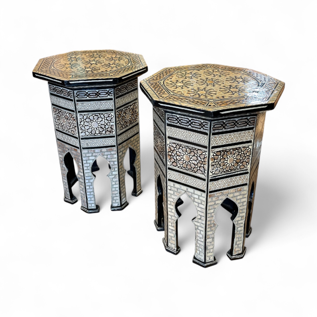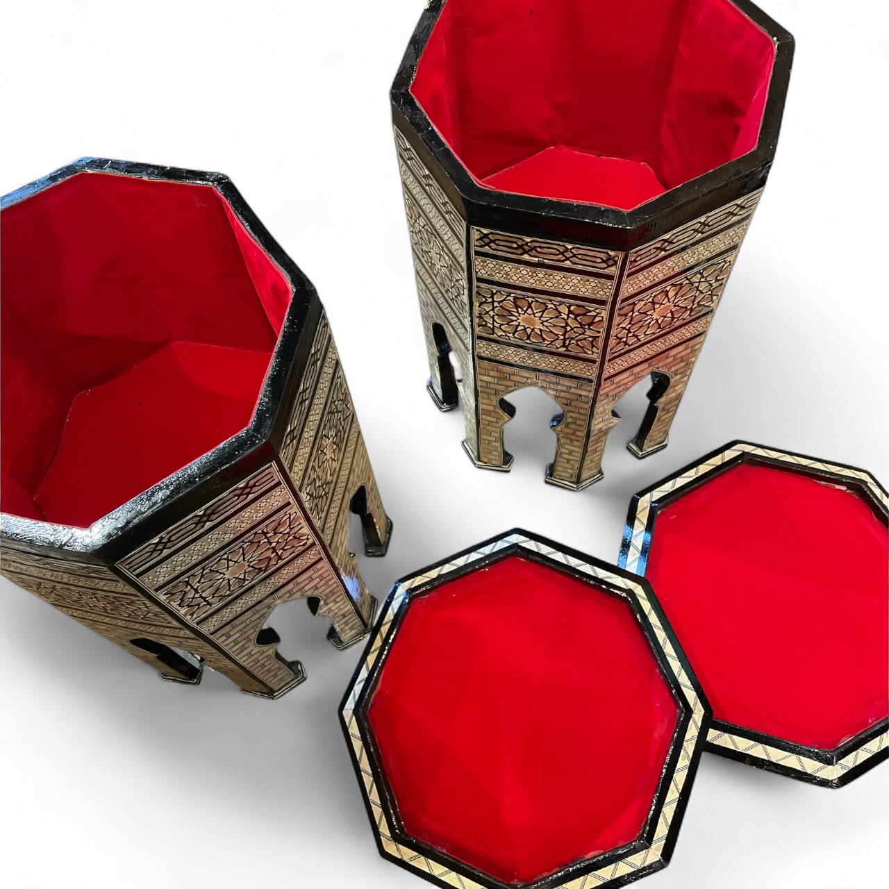 Pair of 20th C Moroccan pedestal tables with inlaid woods and mother-of-pearl. Tops lift off for internal storage.
