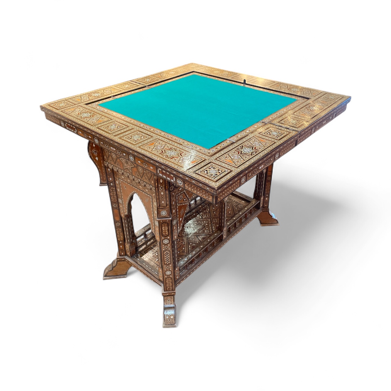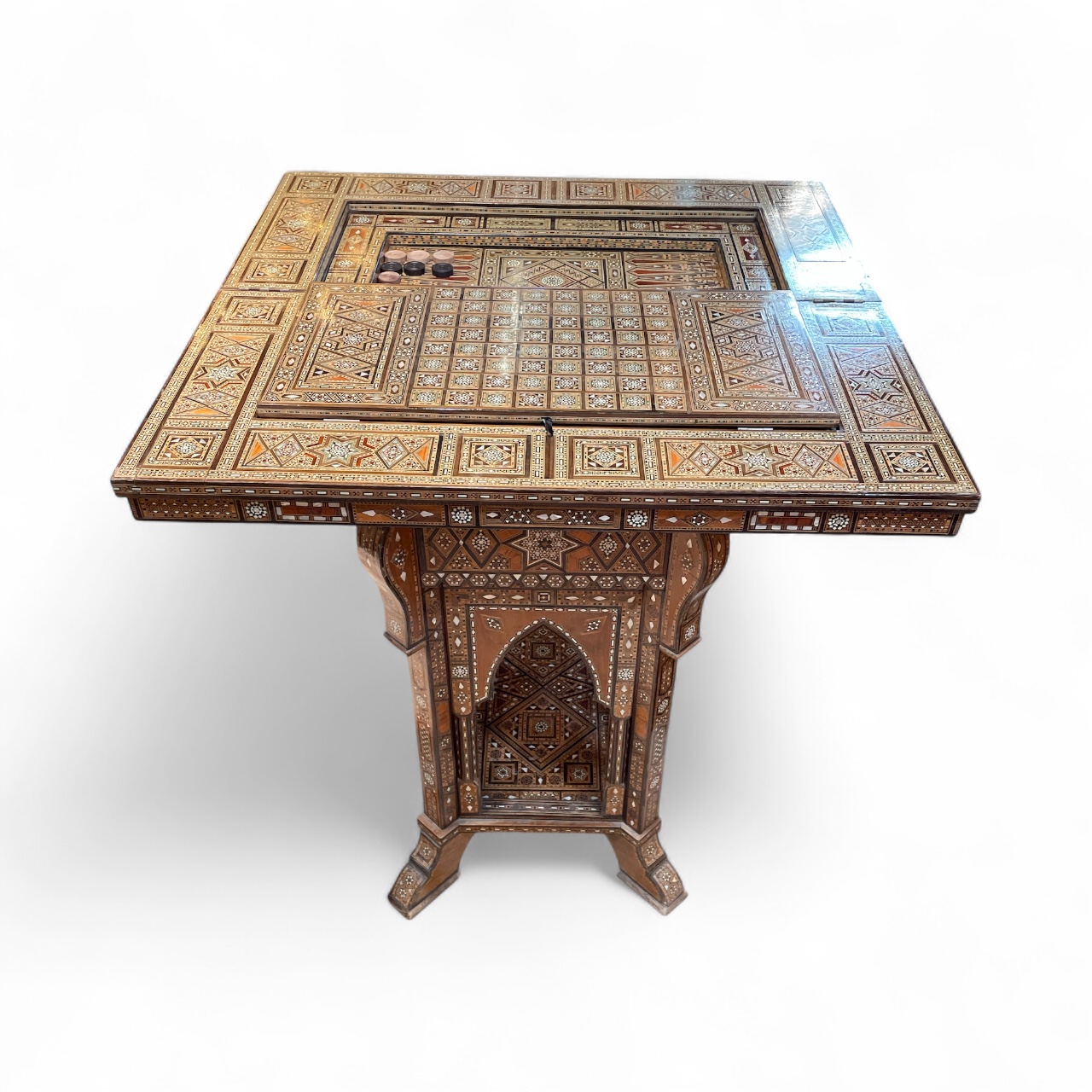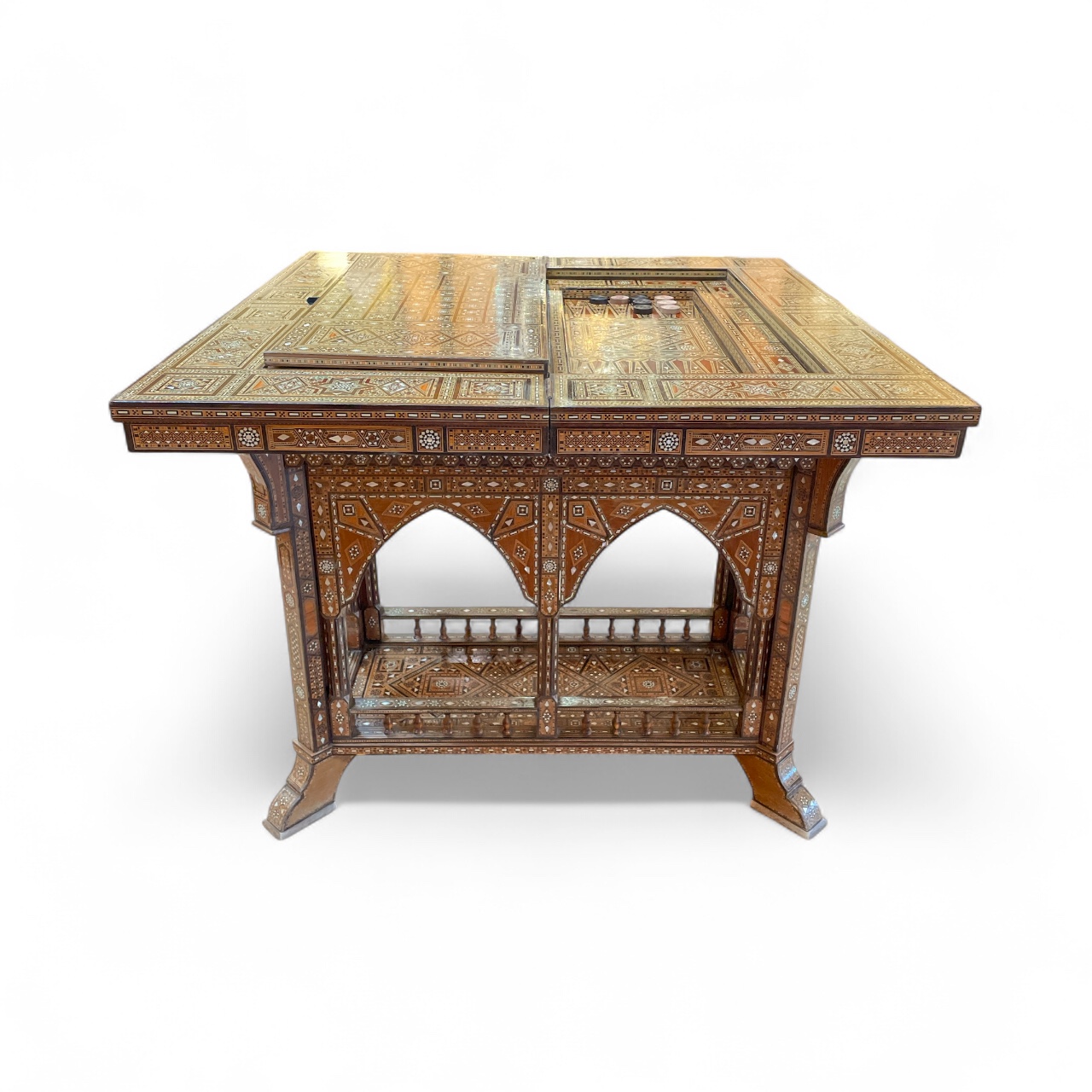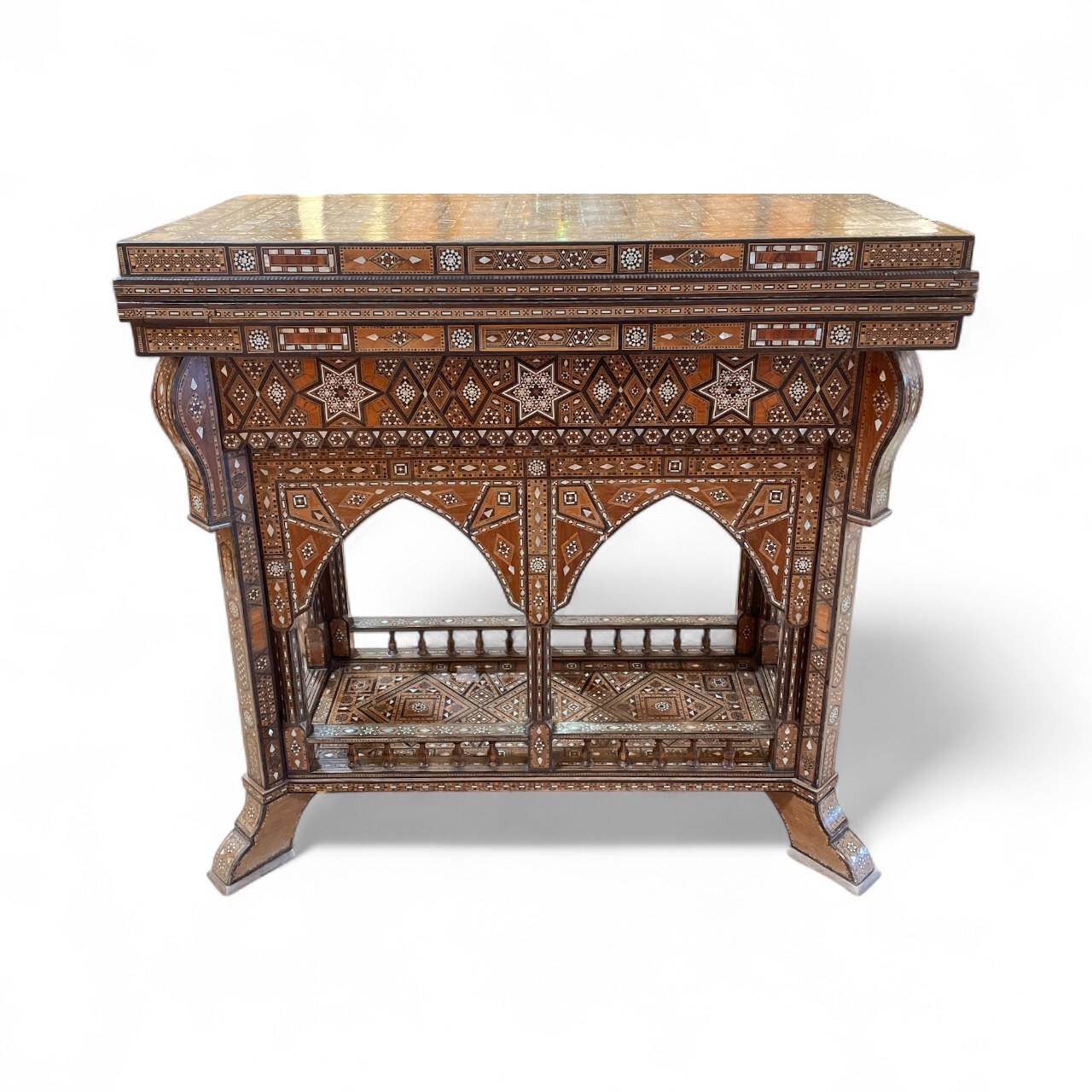 Early 20th C Syrian games table presented as a console table with intricate inlay of various woods and mother-of-pearl. The console folds out to create a chess board, backgammon table and general games board.